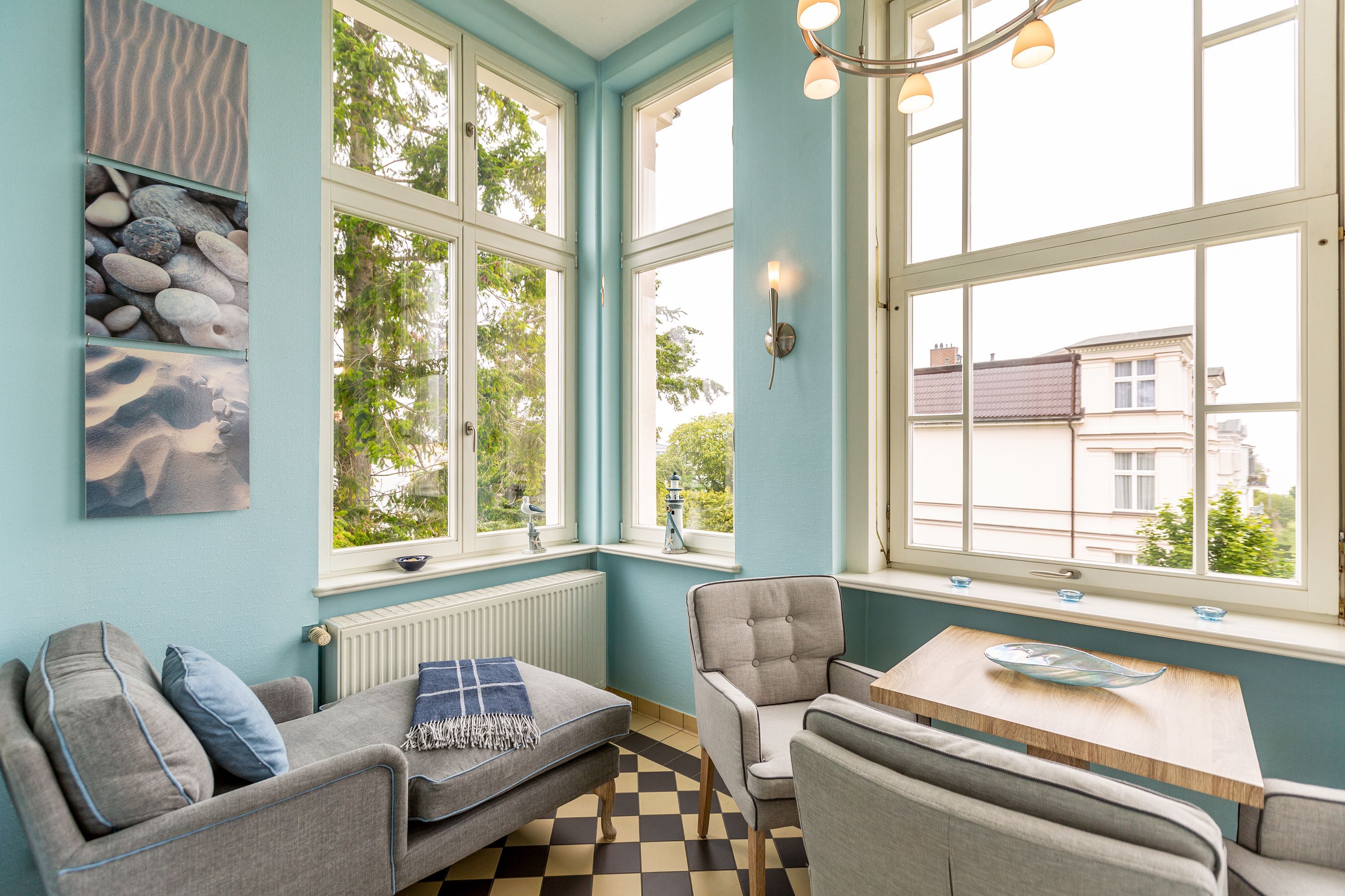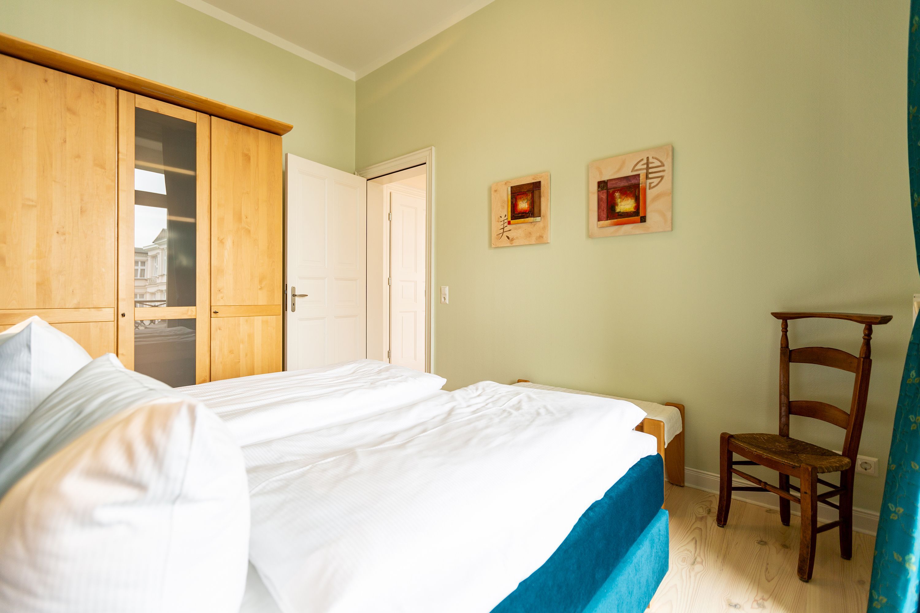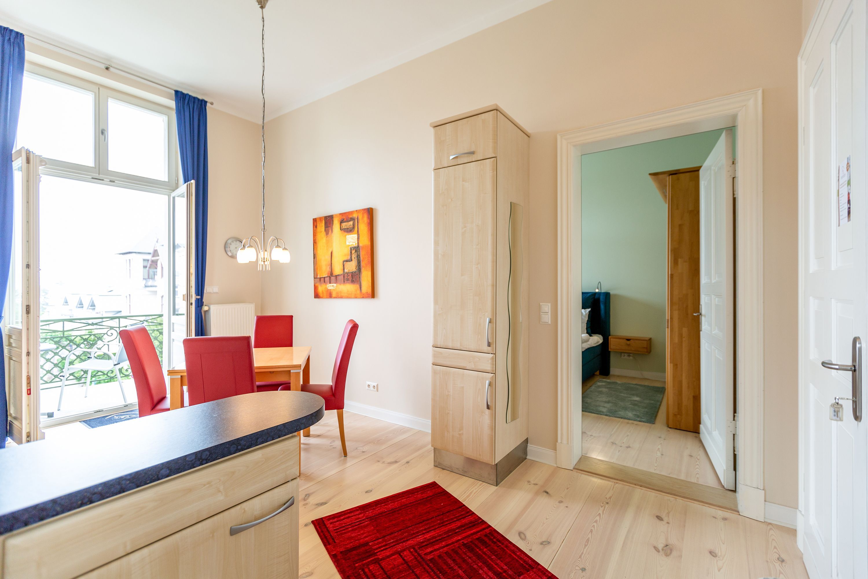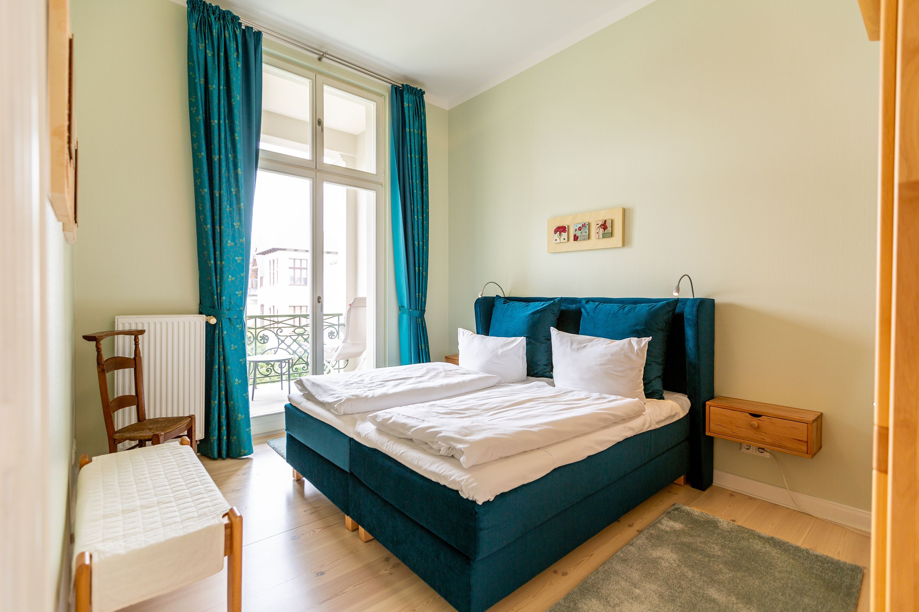 Ihre großzügige Ferienwohnung im 1. Obergeschoss der Villa verwöhnt sie mit moderner Möblierung und farblich gekonnt kombinierten Farben und Stoffen angelehnt an die Prinzipien von Feng Shui. Lichte hohe Räume, ein aufwendig sanierter Dielenboden und die geschmackvollen Dekorationen lassen keine Wünsche offen. Eine große Wohnküche, das Wohnzimmer mit bequemer Schlafcouch (1,20 m x 2,00m), die historische Veranda mit originalen Schiebefenstern, ein Schlafzimmer mit Doppelbett (1,80m x 2m) und zwei, zum Meer ausgerichtete Balkone bieten Platz für 3 Personen und 1 Kleinkind (bis 2 Jahre). Für Ihren Komfort sind die Betten bei der Anreise bezogen und Handtücher liegen bereit. Auf Wunsch stellen wir für unsere kleinen Gäste ein Kinderreisebett und einen Kinderhochstuhl ( gegen einen Aufpreis) zur Verfügung. Ein Pkw-Stellplatz steht am Haus unter dem Carport zur Verfügung.