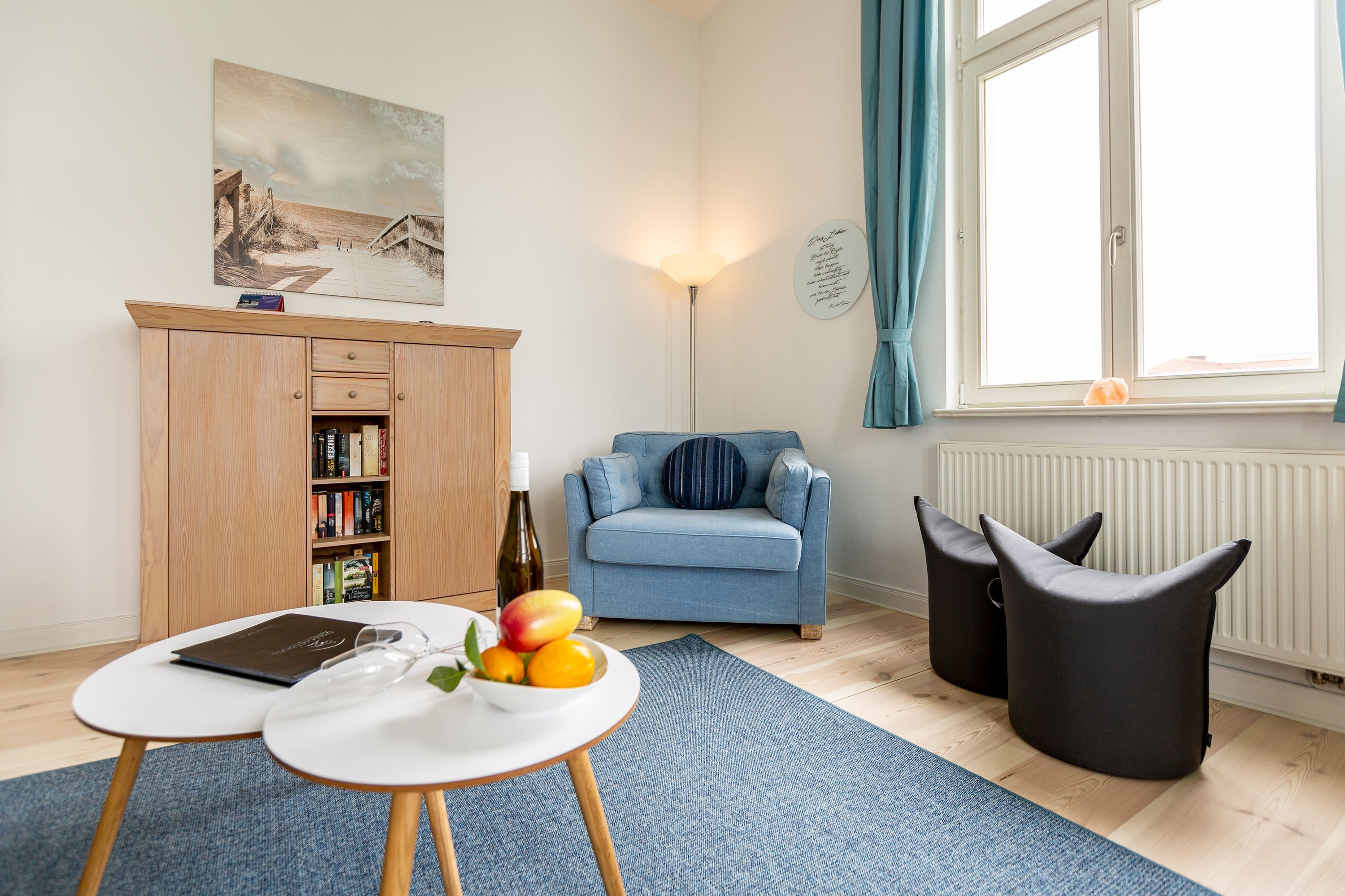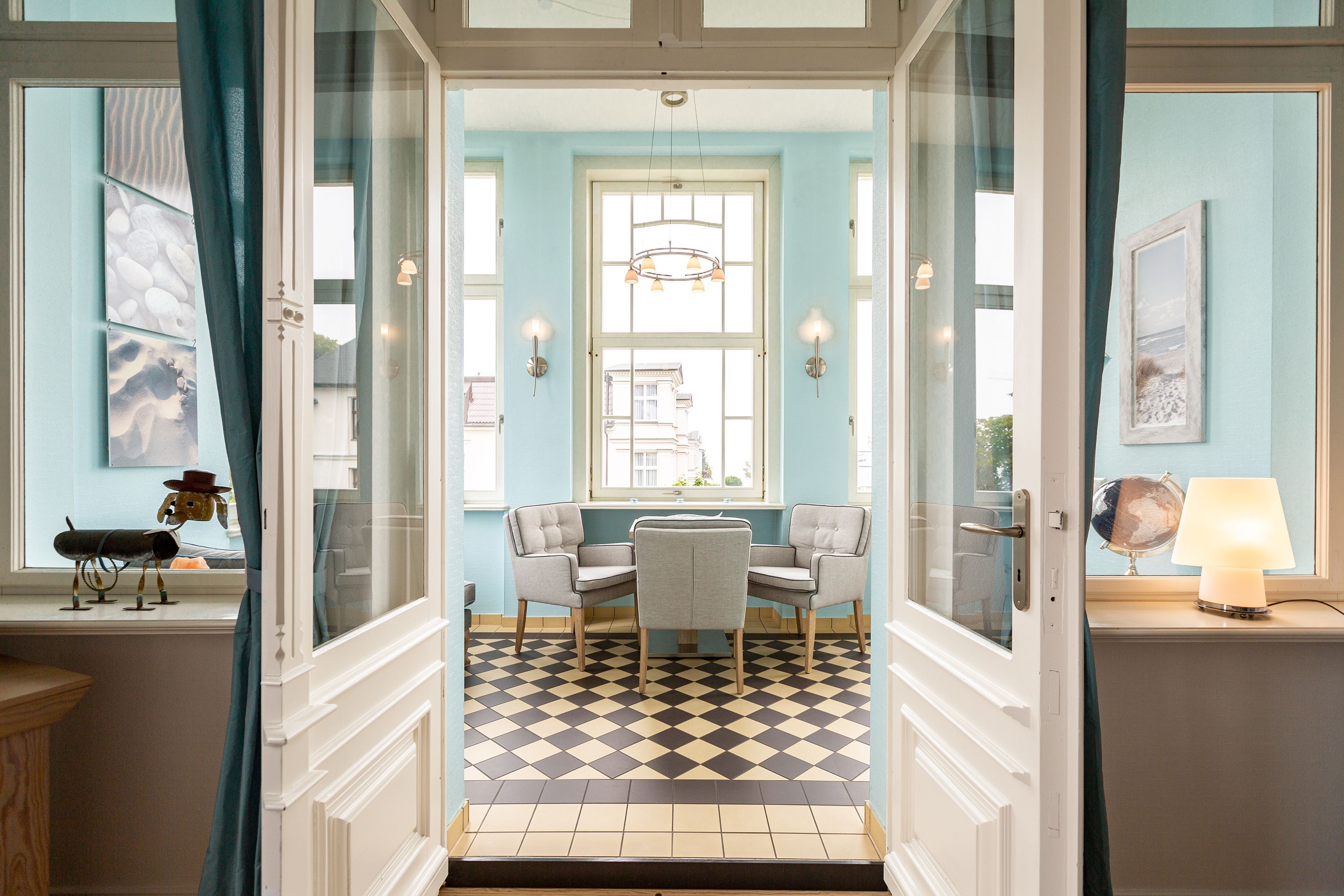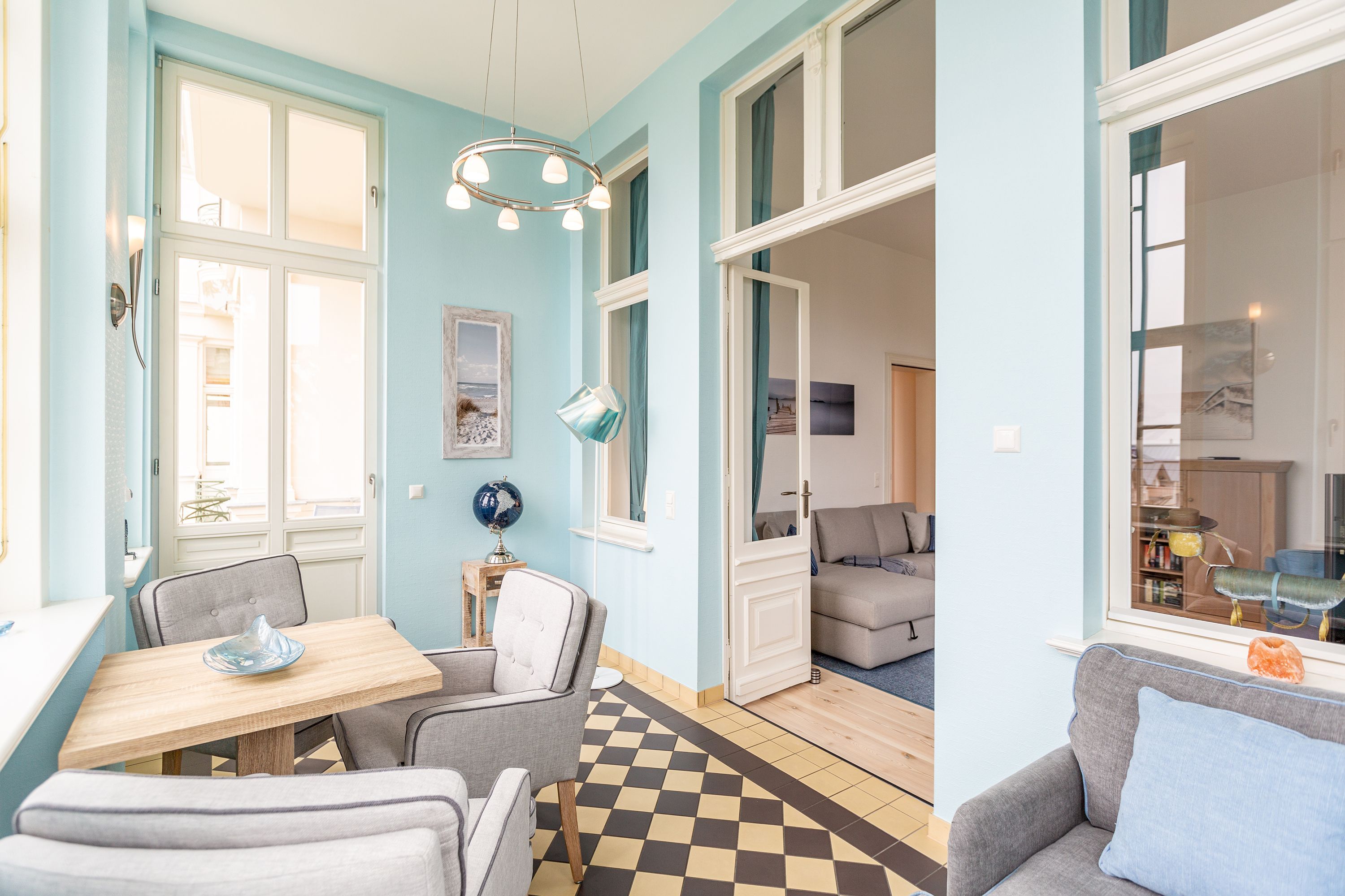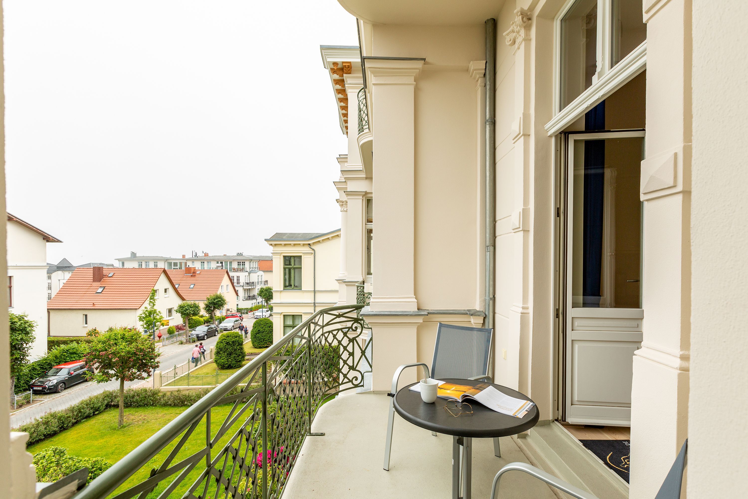 Ihre großzügige Ferienwohnung im 1. Obergeschoss der Villa verwöhnt sie mit moderner Möblierung und farblich gekonnt kombinierten Farben und Stoffen angelehnt an die Prinzipien von Feng Shui. Lichte hohe Räume, ein aufwendig sanierter Dielenboden und die geschmackvollen Dekorationen lassen keine Wünsche offen. Eine große Wohnküche, das Wohnzimmer mit bequemer Schlafcouch (1,20 m x 2,00m), die historische Veranda mit originalen Schiebefenstern, ein Schlafzimmer mit Doppelbett (1,80m x 2m) und zwei, zum Meer ausgerichtete Balkone bieten Platz für 3 Personen und 1 Kleinkind (bis 2 Jahre). Für Ihren Komfort sind die Betten bei der Anreise bezogen und Handtücher liegen bereit. Auf Wunsch stellen wir für unsere kleinen Gäste ein Kinderreisebett und einen Kinderhochstuhl ( gegen einen Aufpreis) zur Verfügung. Ein Pkw-Stellplatz steht am Haus unter dem Carport zur Verfügung.