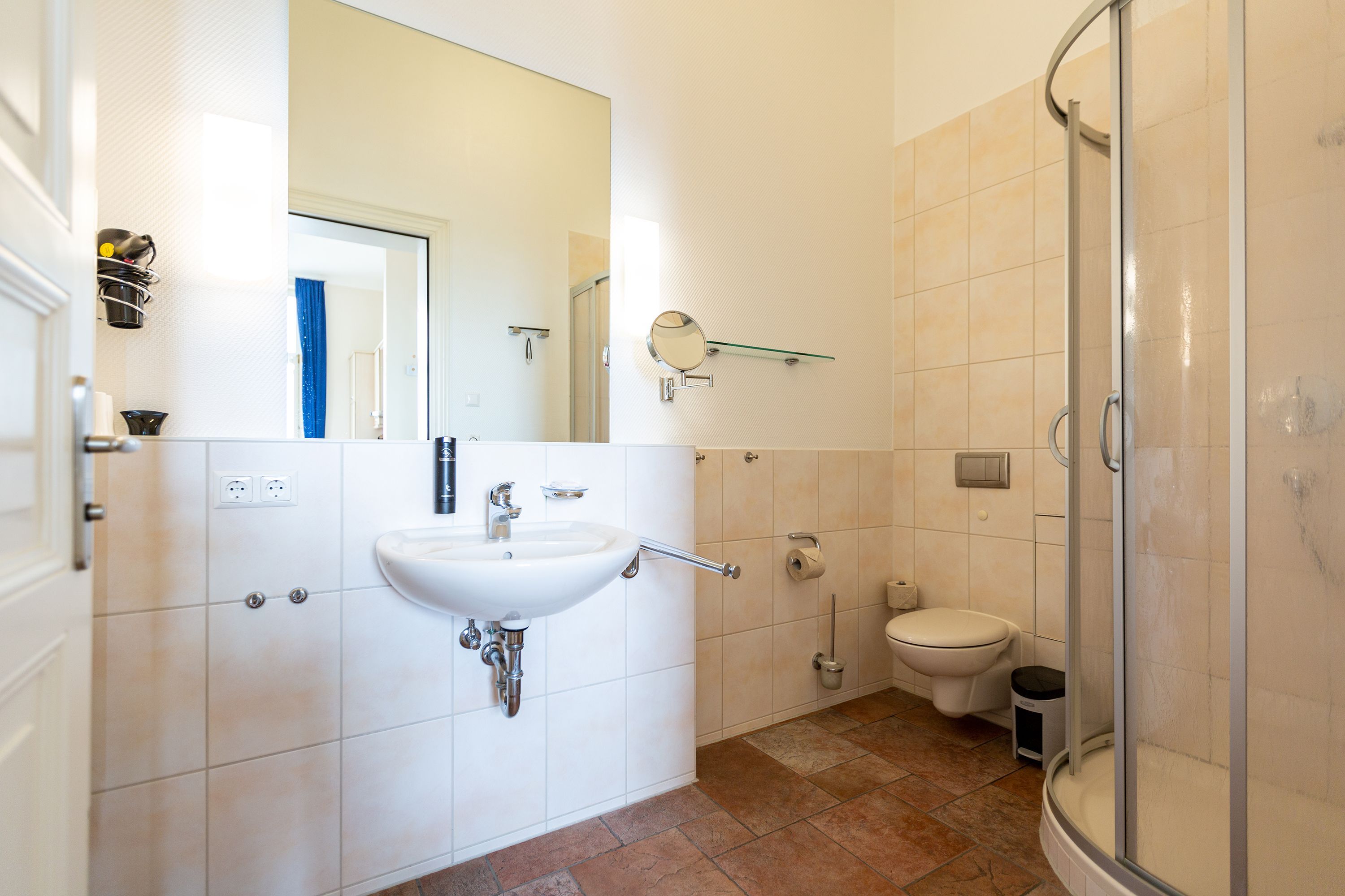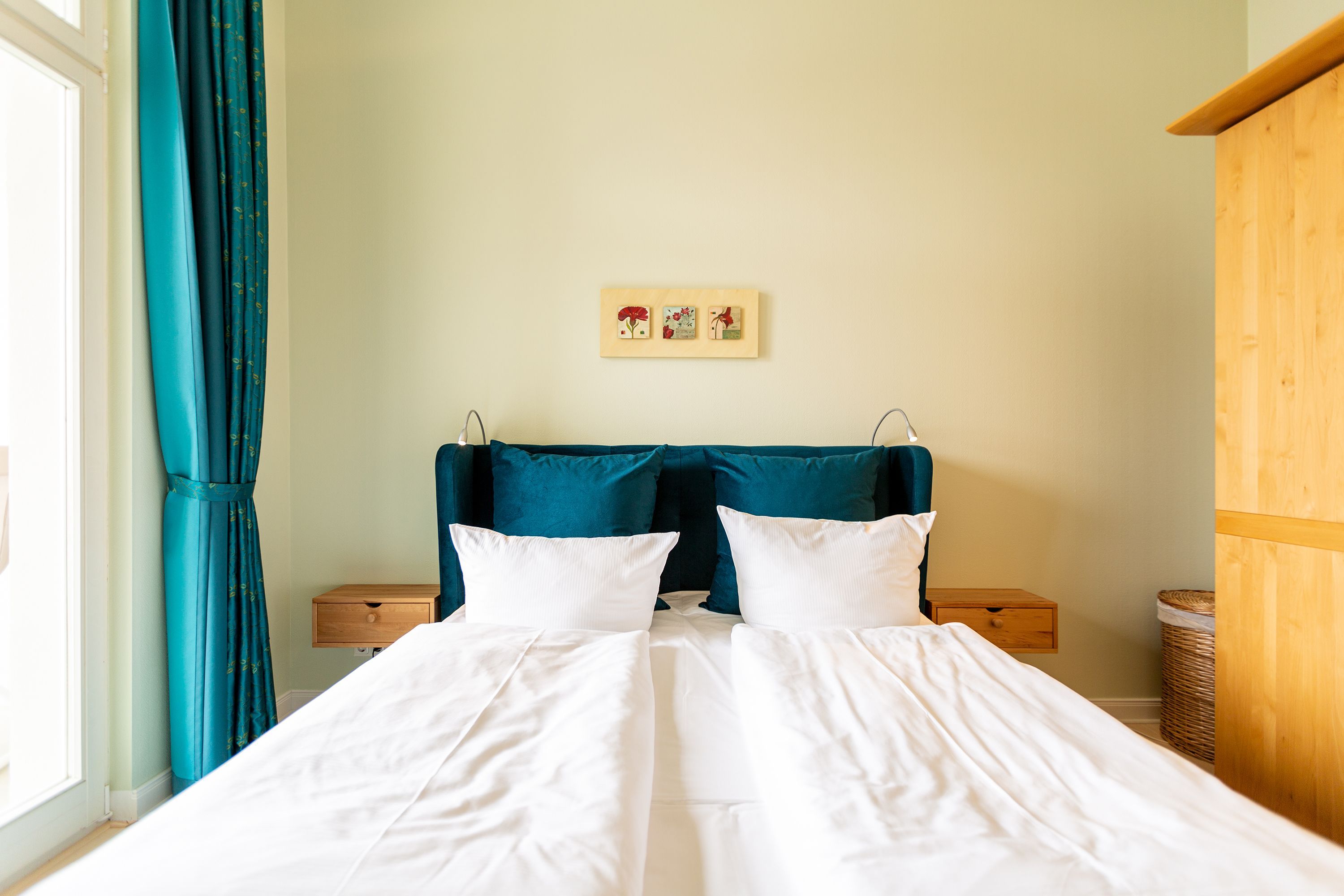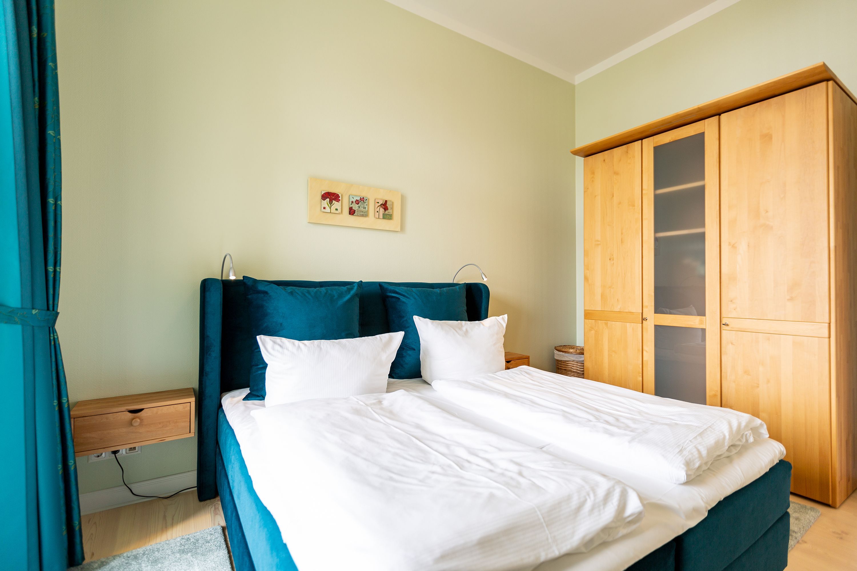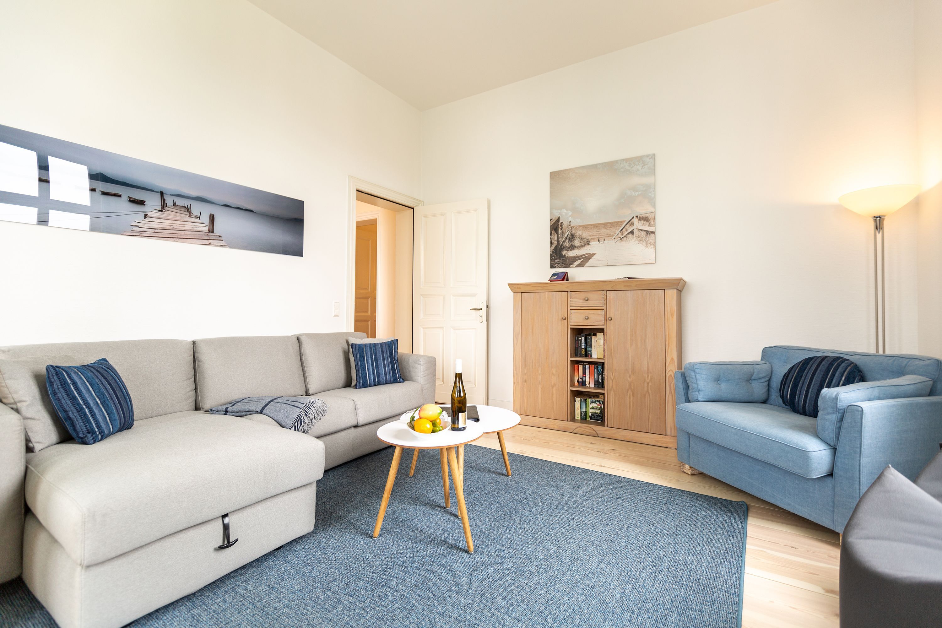Ihre großzügige Ferienwohnung im 1. Obergeschoss der Villa verwöhnt sie mit moderner Möblierung und farblich gekonnt kombinierten Farben und Stoffen angelehnt an die Prinzipien von Feng Shui. Lichte hohe Räume, ein aufwendig sanierter Dielenboden und die geschmackvollen Dekorationen lassen keine Wünsche offen. Eine große Wohnküche, das Wohnzimmer mit bequemer Schlafcouch (1,20 m x 2,00m), die historische Veranda mit originalen Schiebefenstern, ein Schlafzimmer mit Doppelbett (1,80m x 2m) und zwei, zum Meer ausgerichtete Balkone bieten Platz für 3 Personen und 1 Kleinkind (bis 2 Jahre). Für Ihren Komfort sind die Betten bei der Anreise bezogen und Handtücher liegen bereit. Auf Wunsch stellen wir für unsere kleinen Gäste ein Kinderreisebett und einen Kinderhochstuhl ( gegen einen Aufpreis) zur Verfügung. Ein Pkw-Stellplatz steht am Haus unter dem Carport zur Verfügung.