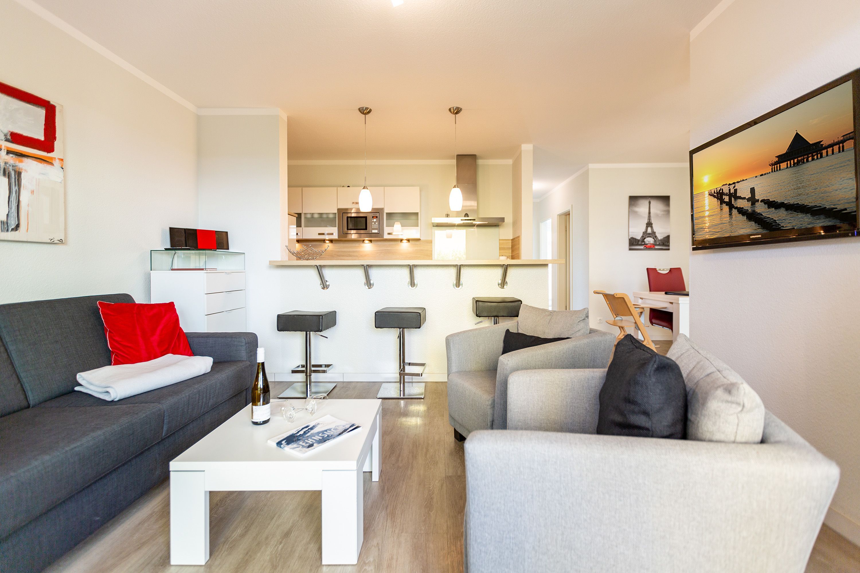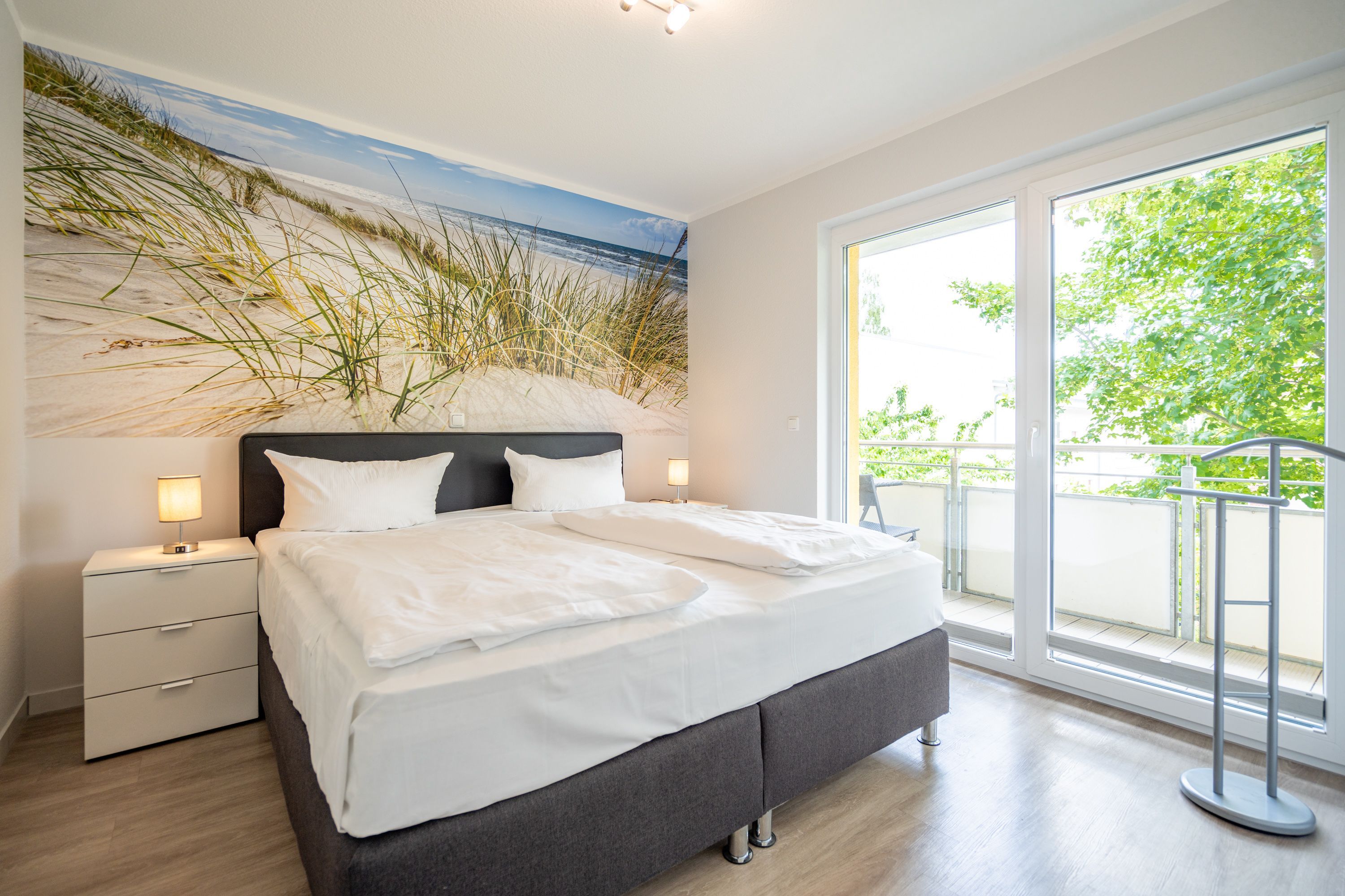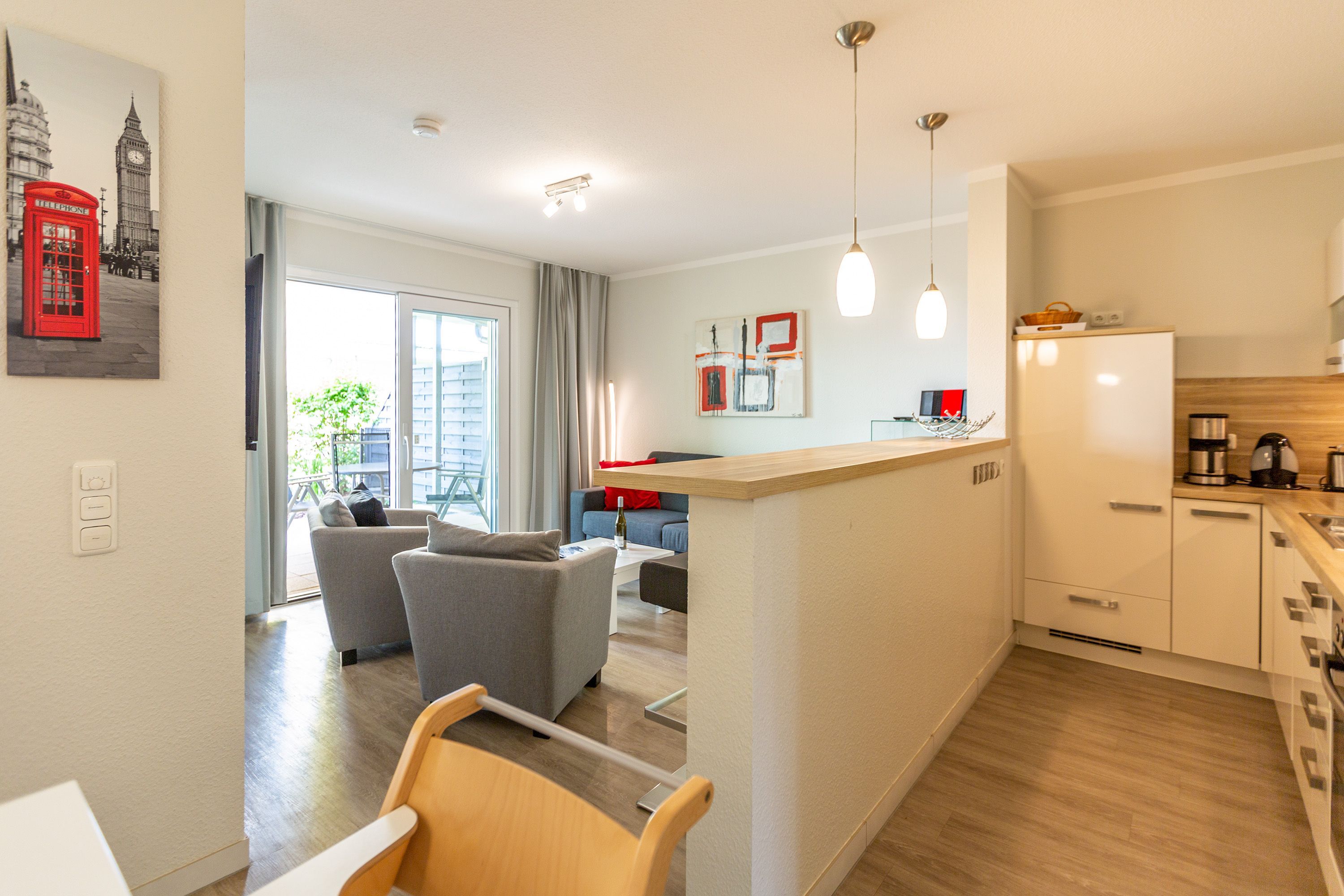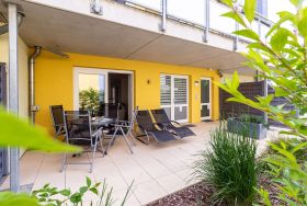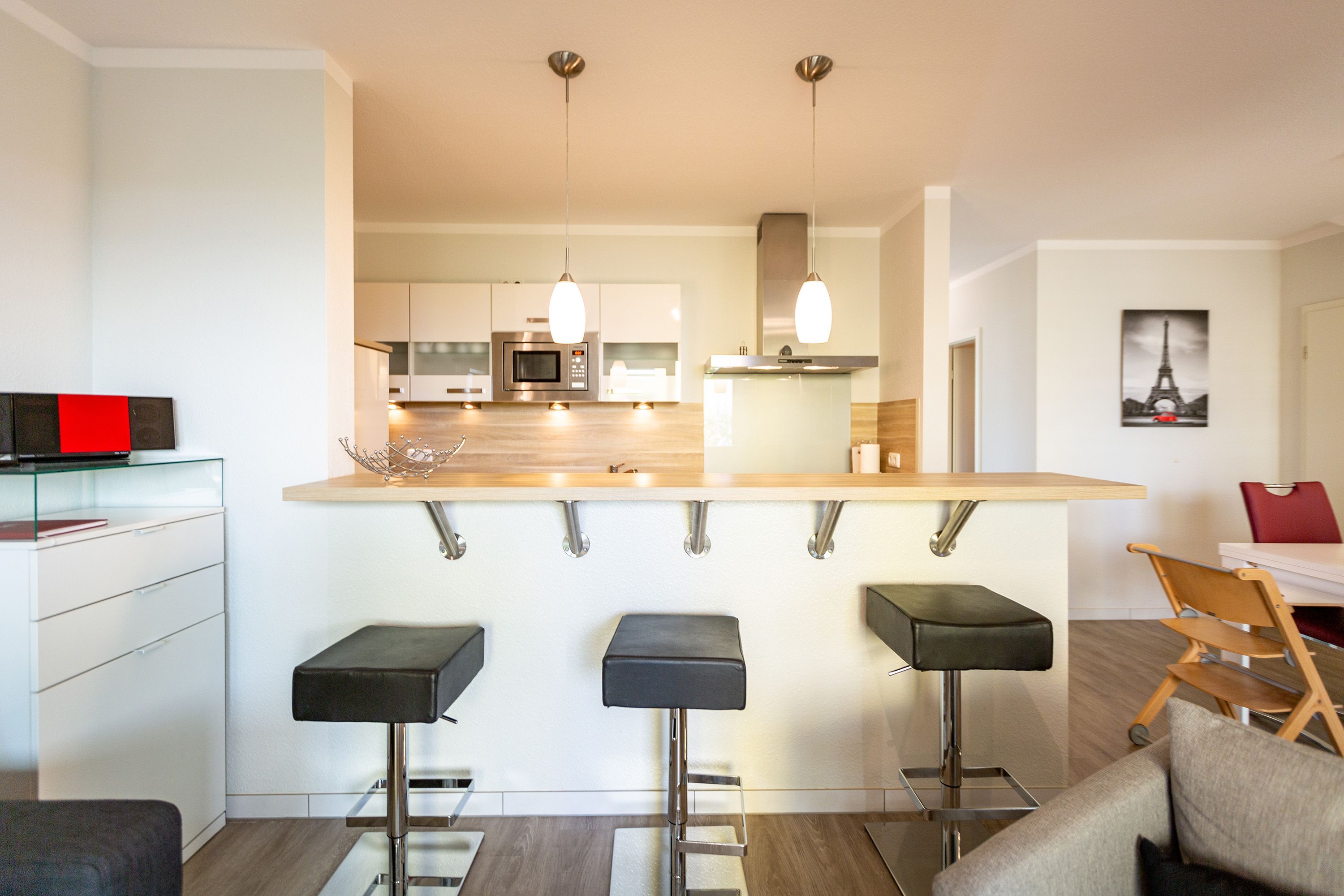 Ein moderner Wohn-Ess-Bereich empfängt den Urlaubsfreudigen in diesem schönen Domizil. Die elegante und stilvolle Einrichtung sorgt für eine gemütliche Atmosphäre. Eine schöne Ledersitzgruppe aus Sofa und Sessel ist ein echter Farbtupfer und lädt zum ausgiebigen Relaxen ein. Die Wohnung im Erdgeschoss des Domizils am Hang bietet auf 67 Quadratmetern viel Platz zum Urlauben. Bis zu vier Personen und ein Kleinkind (im Kinderreisebett) werden dieses kleine Fleckchen Usedom gar nicht wieder verlassen wollen. Die großzügige Südterrasse, die vom Wohnzimmer aus zugängig ist, mit Sonnenliegen und Esstisch ausgestattet, ist das Highlight dieses Appartements. Hier können Sie Sonne satt tanken. Die mit hochwertigen Markengeräten voll ausgestattete Küche ist zum Wohnraum hin offen, aber mit einem stylischen Tresen mit hohen Hockern von diesem abgegrenzt. Am schönen und großen Esstisch können Sie sämtliche Mahlzeiten mit viel Genuss zu sich nehmen. Zwei Schlafzimmer hat die Wohnung Nummer 2. In beiden wartet ein komfortables Boxspringdoppelbett (1,80 m x 2,00 m) nur darauf, Ihnen erholsame Träume zu schenken. Beide Zimmer haben einen Flat-TV mit DVD-Player und Zugang zu einem eigenen, kleinen Balkon, auf dem Sie schon morgens die Sonne genießen können. Die Schränke bieten viel Ablagefläche für die Urlaubsgarderobe. Das Appartement verfügt außerdem über zwei Badezimmer mit ebenerdiger und geräumiger Dusche, Waschtisch und WC. Das Masterbad ist von einem der beiden Schlafzimmer aus zugängig. In beiden Bädern liegen Handtücher für Sie bereit. Zudem sind die Betten bei Anreise für Sie bezogen. Zu der Wohnung gehört ein Tiefgaragenstellplatz. Es gibt auch einen Fahrradabstellraum. Das WLAN-Netz ist kostenfrei nutzbar.