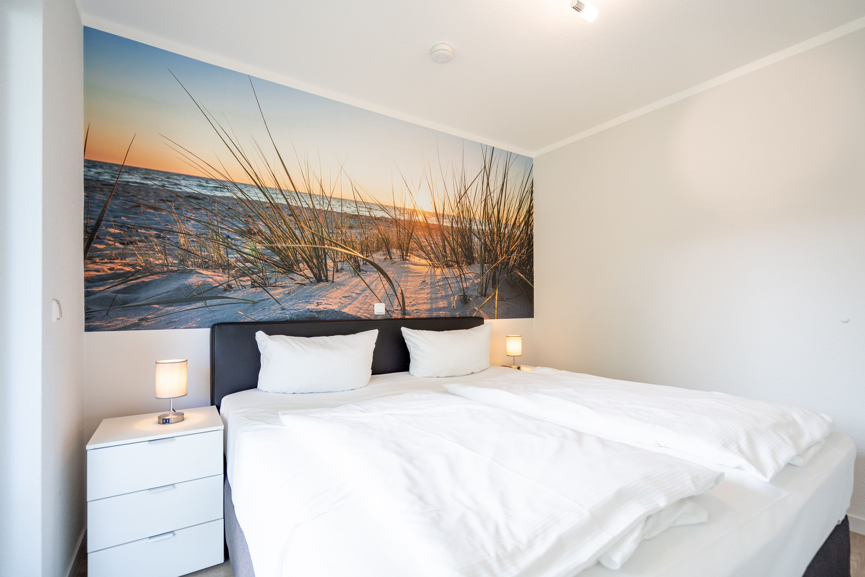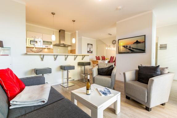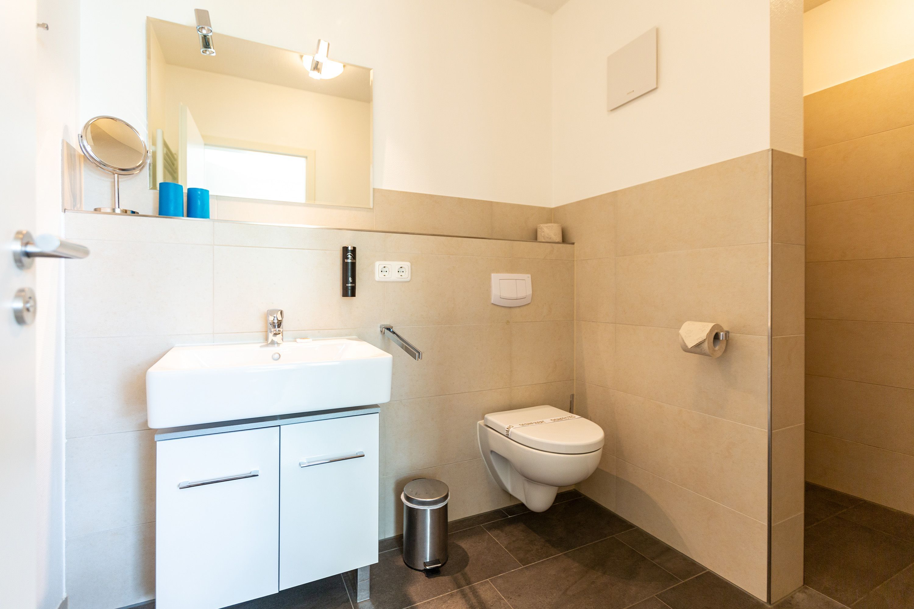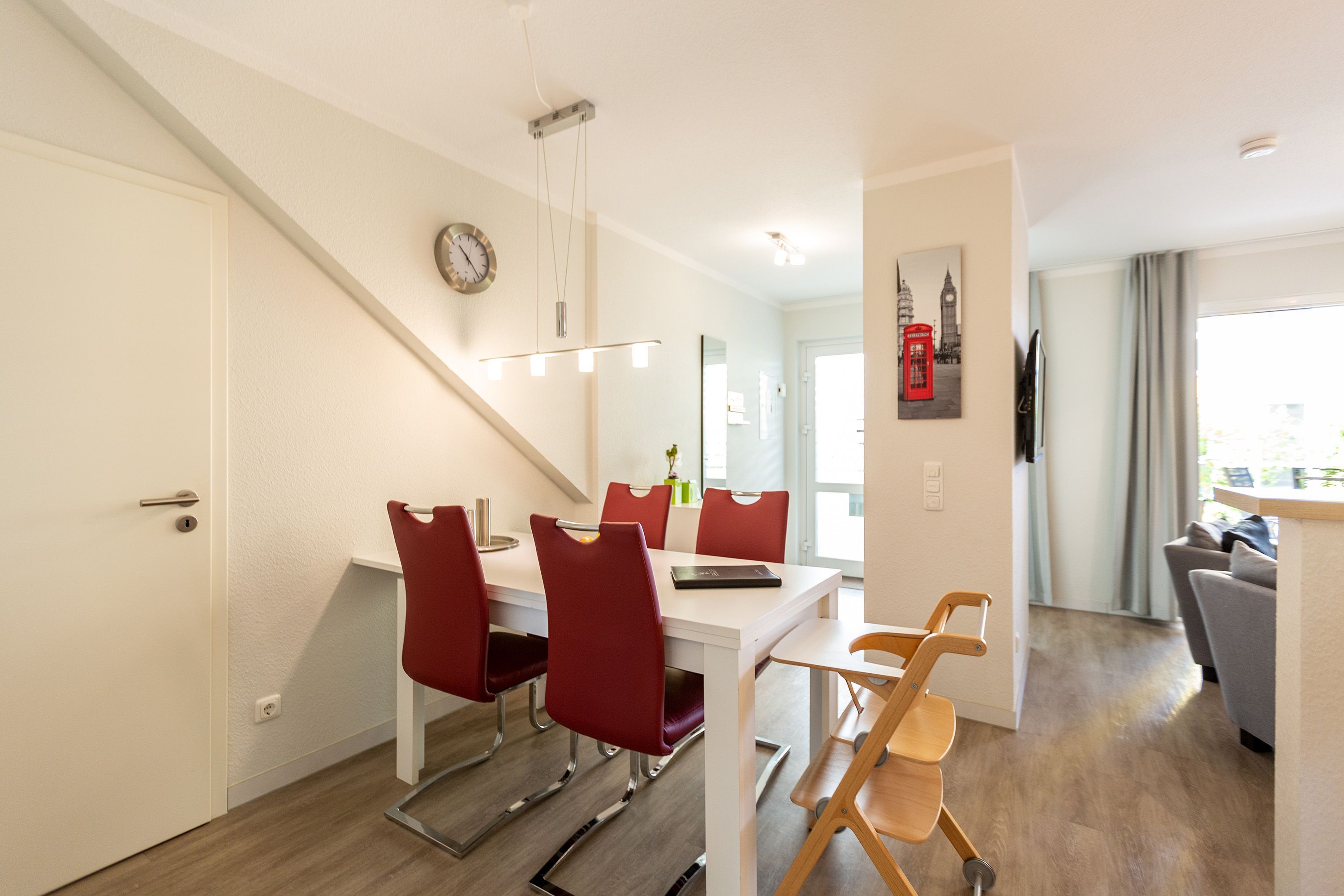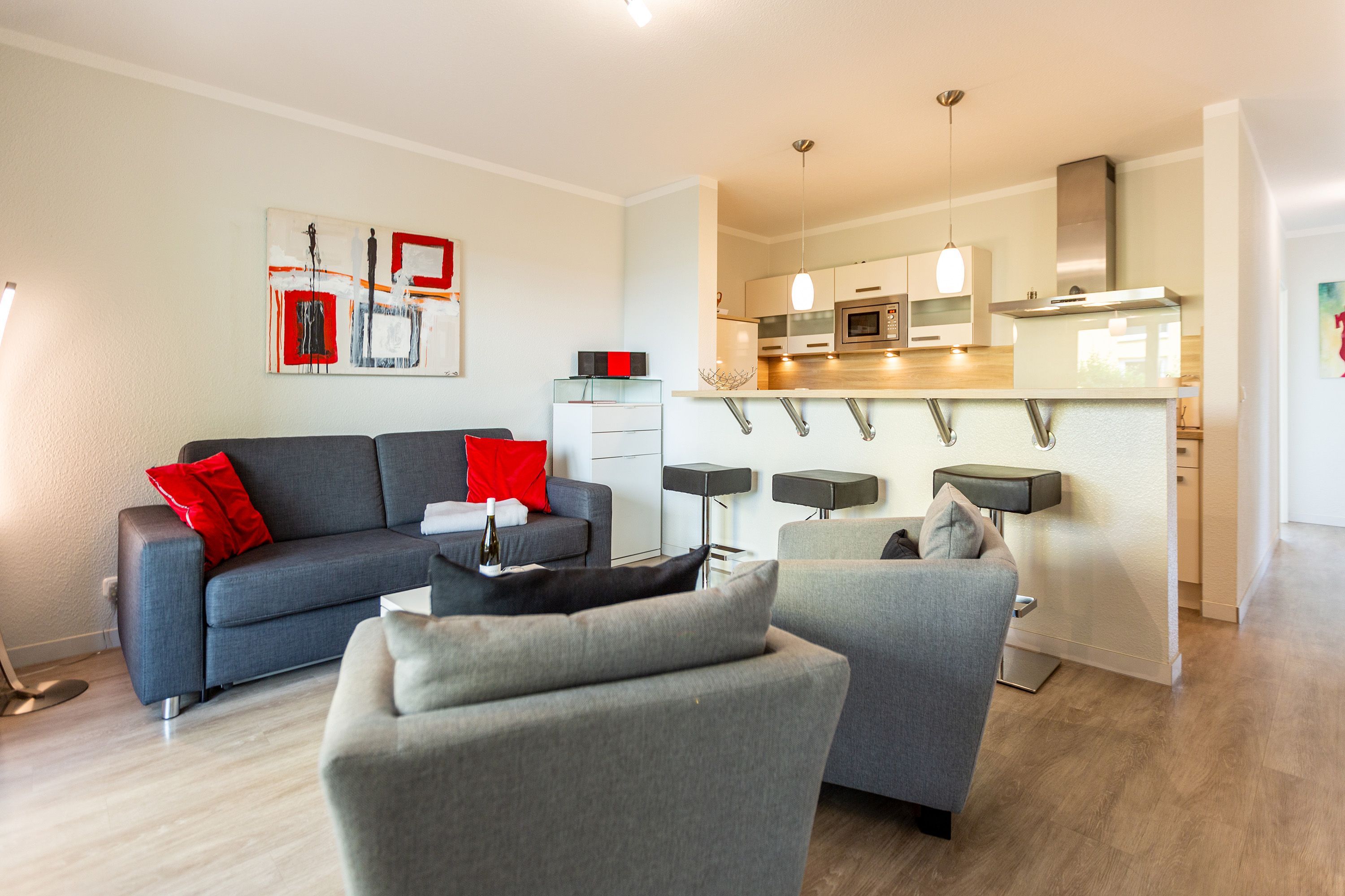 Ein moderner Wohn-Ess-Bereich empfängt den Urlaubsfreudigen in diesem schönen Domizil. Die elegante und stilvolle Einrichtung sorgt für eine gemütliche Atmosphäre. Eine schöne Ledersitzgruppe aus Sofa und Sessel ist ein echter Farbtupfer und lädt zum ausgiebigen Relaxen ein. Die Wohnung im Erdgeschoss des Domizils am Hang bietet auf 67 Quadratmetern viel Platz zum Urlauben. Bis zu vier Personen und ein Kleinkind (im Kinderreisebett) werden dieses kleine Fleckchen Usedom gar nicht wieder verlassen wollen. Die großzügige Südterrasse, die vom Wohnzimmer aus zugängig ist, mit Sonnenliegen und Esstisch ausgestattet, ist das Highlight dieses Appartements. Hier können Sie Sonne satt tanken. Die mit hochwertigen Markengeräten voll ausgestattete Küche ist zum Wohnraum hin offen, aber mit einem stylischen Tresen mit hohen Hockern von diesem abgegrenzt. Am schönen und großen Esstisch können Sie sämtliche Mahlzeiten mit viel Genuss zu sich nehmen. Zwei Schlafzimmer hat die Wohnung Nummer 2. In beiden wartet ein komfortables Boxspringdoppelbett (1,80 m x 2,00 m) nur darauf, Ihnen erholsame Träume zu schenken. Beide Zimmer haben einen Flat-TV mit DVD-Player und Zugang zu einem eigenen, kleinen Balkon, auf dem Sie schon morgens die Sonne genießen können. Die Schränke bieten viel Ablagefläche für die Urlaubsgarderobe. Das Appartement verfügt außerdem über zwei Badezimmer mit ebenerdiger und geräumiger Dusche, Waschtisch und WC. Das Masterbad ist von einem der beiden Schlafzimmer aus zugängig. In beiden Bädern liegen Handtücher für Sie bereit. Zudem sind die Betten bei Anreise für Sie bezogen. Zu der Wohnung gehört ein Tiefgaragenstellplatz. Es gibt auch einen Fahrradabstellraum. Das WLAN-Netz ist kostenfrei nutzbar.