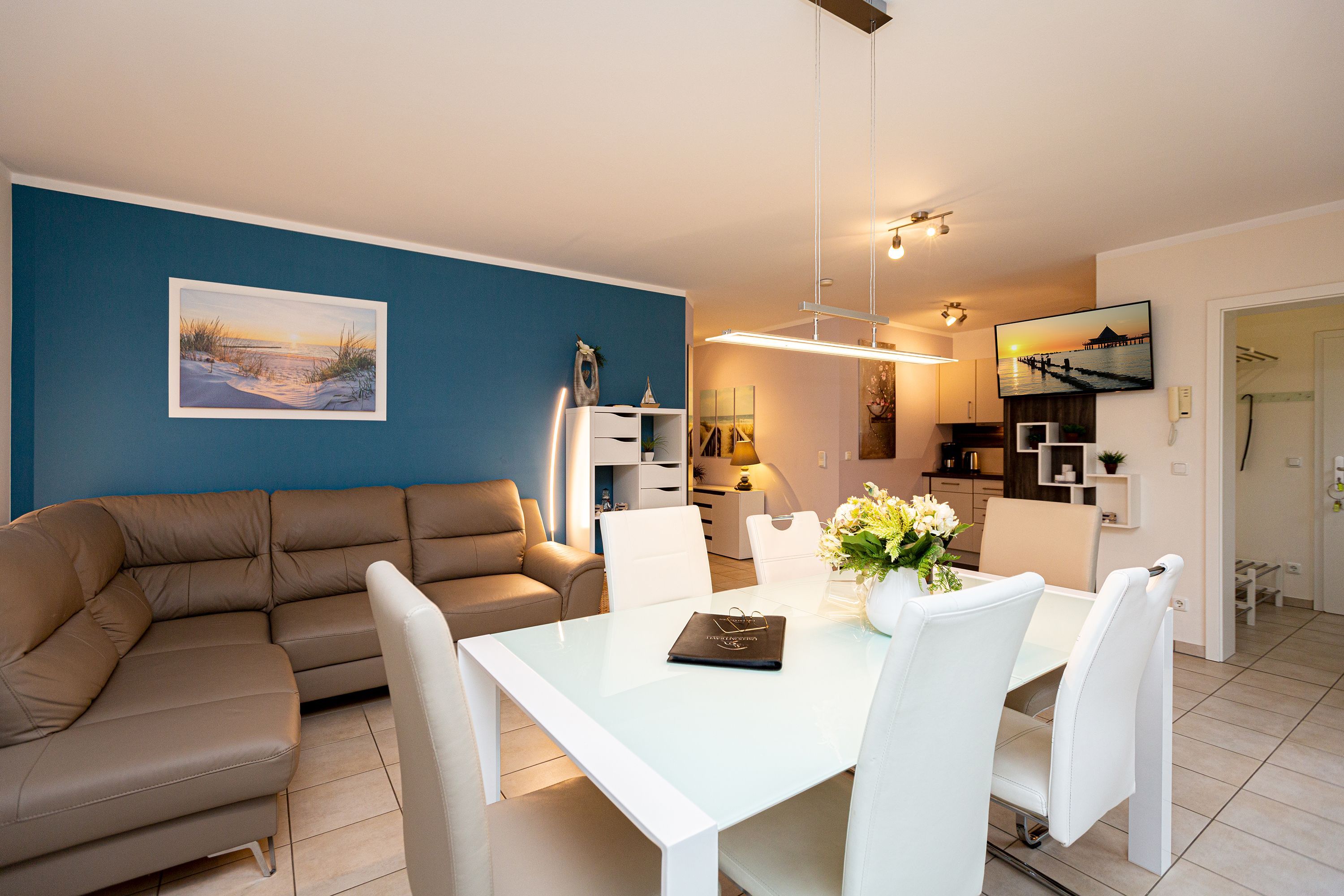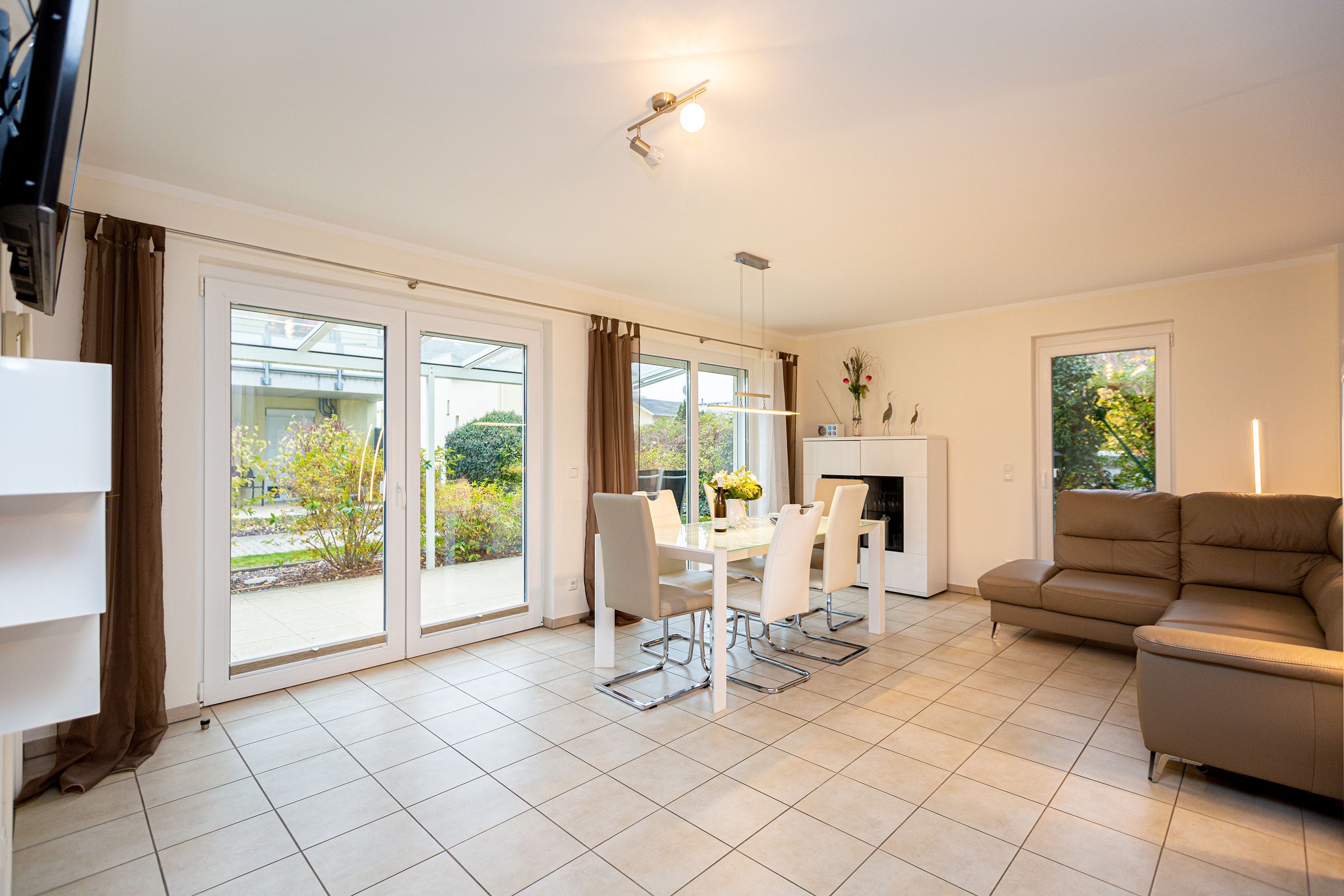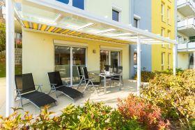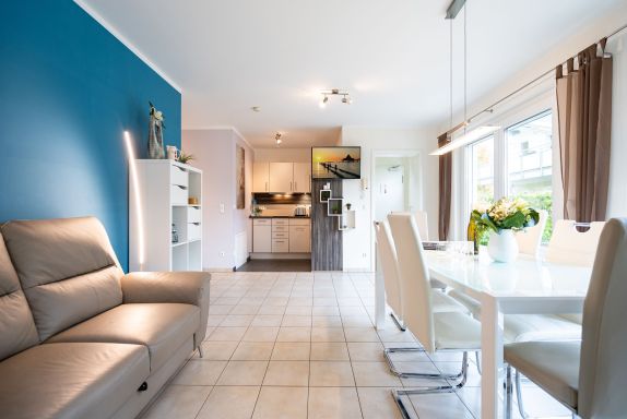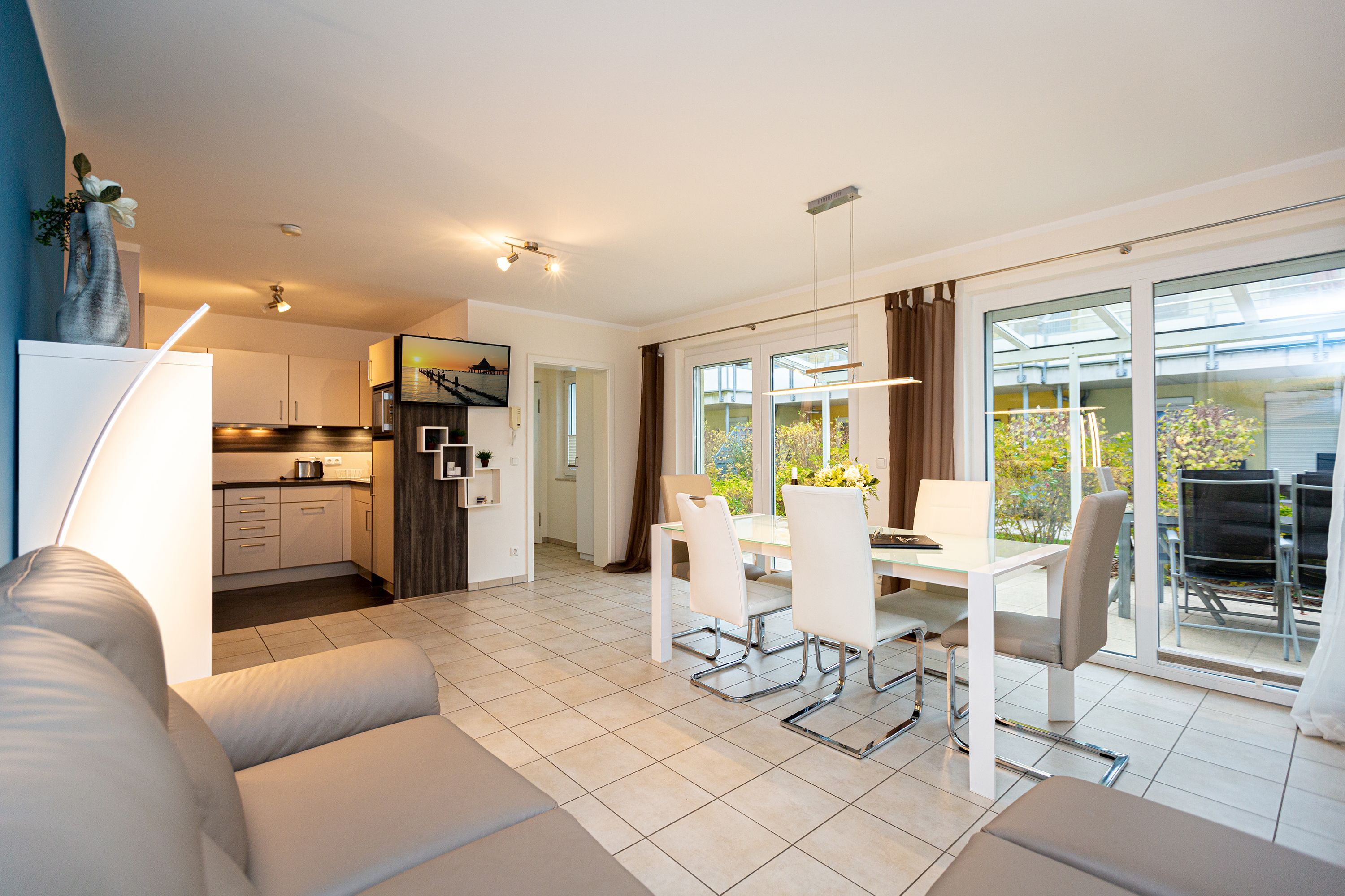 Modern und mit allem erdenklichen Komfort ausgestattet, empfängt das Appartement 7 Auszeitler, die sich im Herzen von Heringsdorf einen erholsamen Urlaub gönnen wollen. Auf 70 Quadratmetern haben Sie viel Platz zum Aus- und Entspannen. Bis zu vier Personen und ein Kleinkind kann das Drei-Zimmer-Appartement im Erdgeschoss beherbergen. Machen Sie es sich gemütlich im großen Wohn-Esszimmer. Ob am Esstisch oder auf den Gartenmöbeln auf der Terrasse mit Blick ins Grüne das Essen schmeckt im Urlaub ohnehin immer viel besser als daheim. Brennt die Sonne zu arg, schafft eine große Markise kühlend Abhilfe. Die Sonnenliegen laden zum Mittagsschläfchen ein. Oder schalten Sie auf dem Sofa im Wohnzimmer bei Highend-Unterhaltung via Flat-TV entspannt ab. Die offene Küchenzeile ist mit einer Einbau-Mikrowelle mit Grillfunktion und einem 2-Platten-Ceranfeld ausgestattet. Gemeinsame Kochaktionen werden Dank der hochwertigen Geräte zum Kinderspiel. Kleine Erholungsoasen sind die beiden Schlafzimmer. Die Doppelbetten sind bei Anreise bereits bezogen. Jedes der Zimmer verfügt ebenfalls über einen eigenen Flat-TV und einen geräumigen Schrank. Das moderne Badezimmer hat Dusche, Waschtisch und WC. Außerdem gibt es ein separates Gäste-WC. Handtücher liegen für Sie bereit. Auf Wunsch kann für die kleinen Gäste ein Kinderreisebett (ohne zusätzliche Matratze & Bettzeug) und ein Kinderhochstuhl (gegen einen Aufpreis) zur Verfügung gestellt werden.