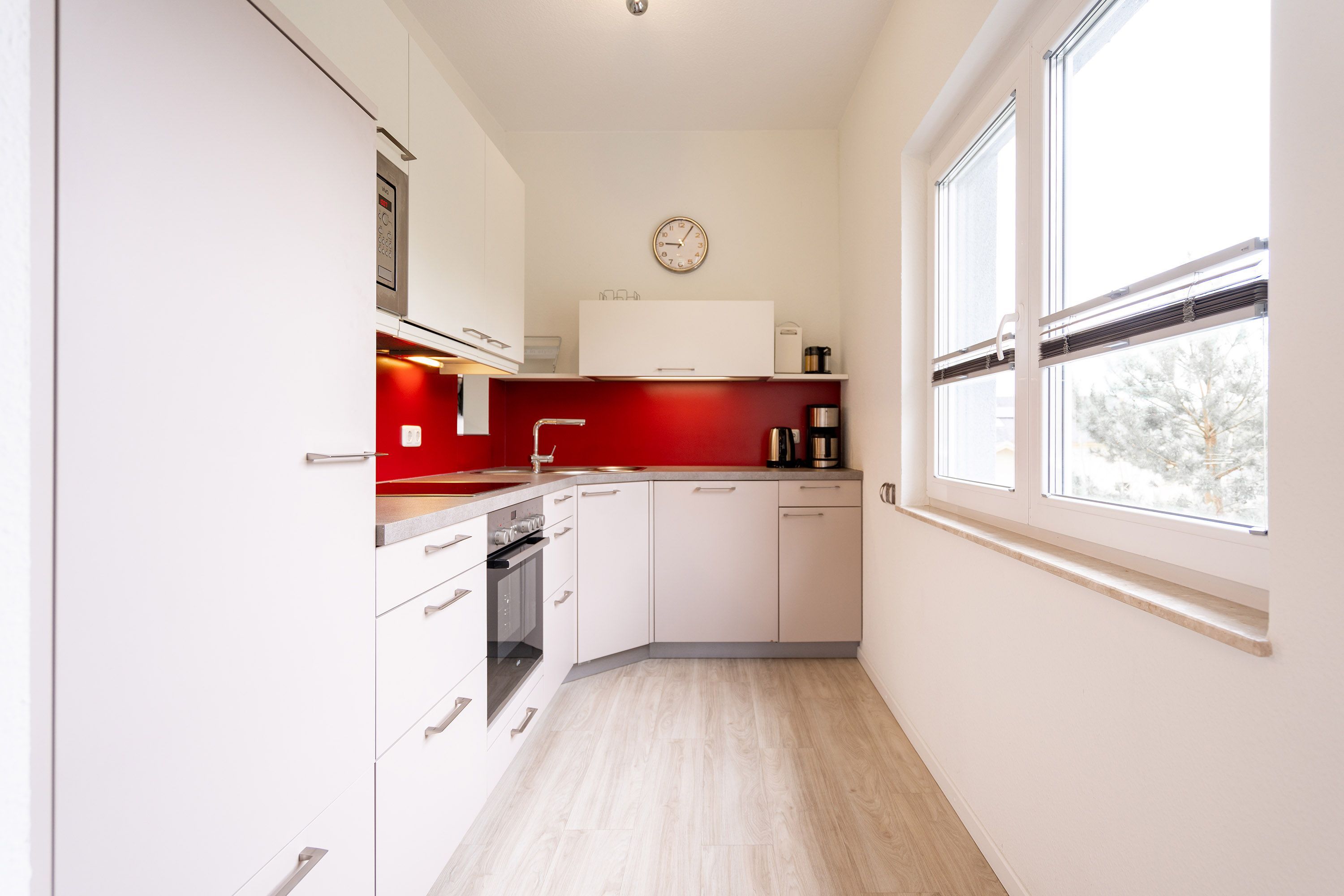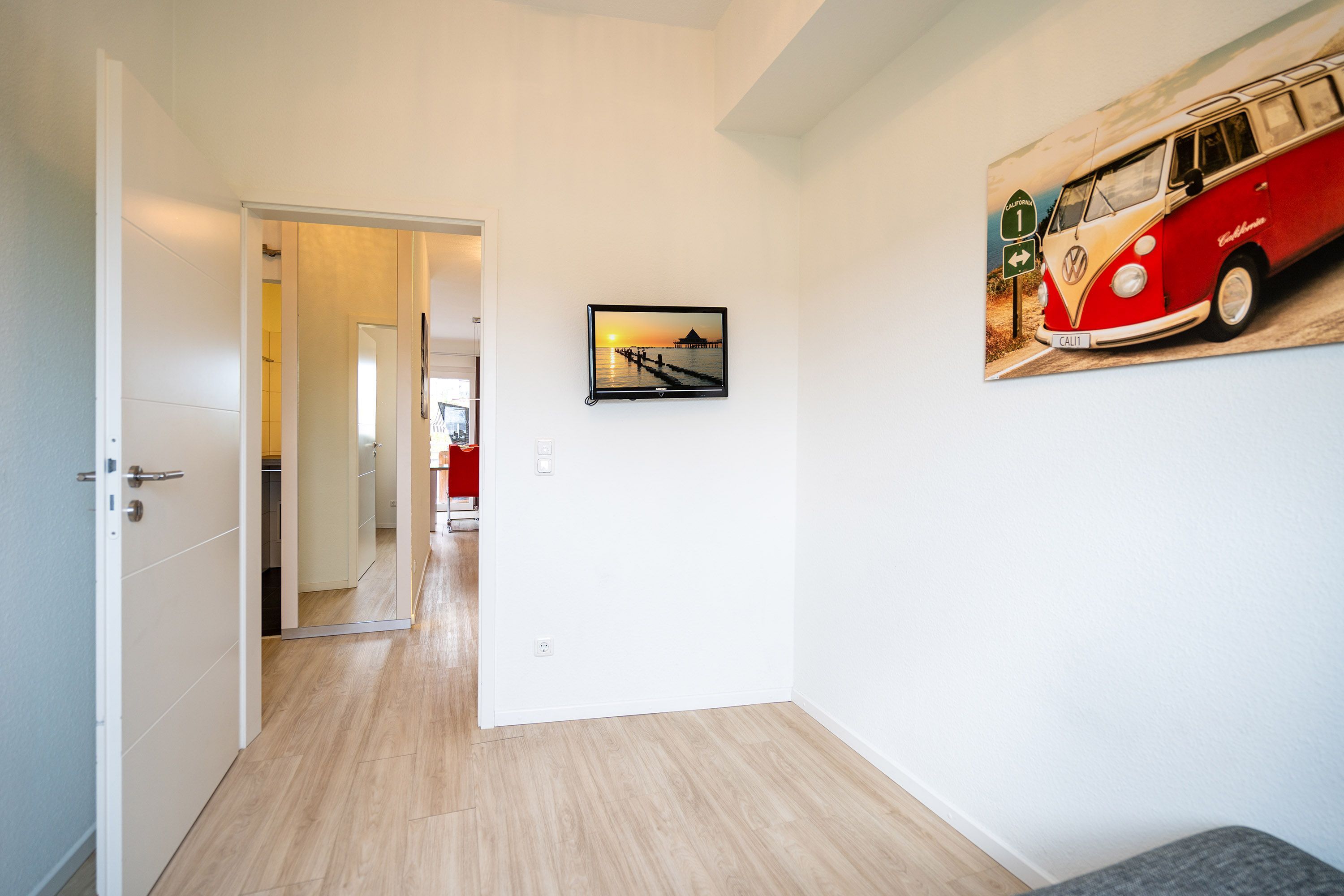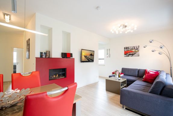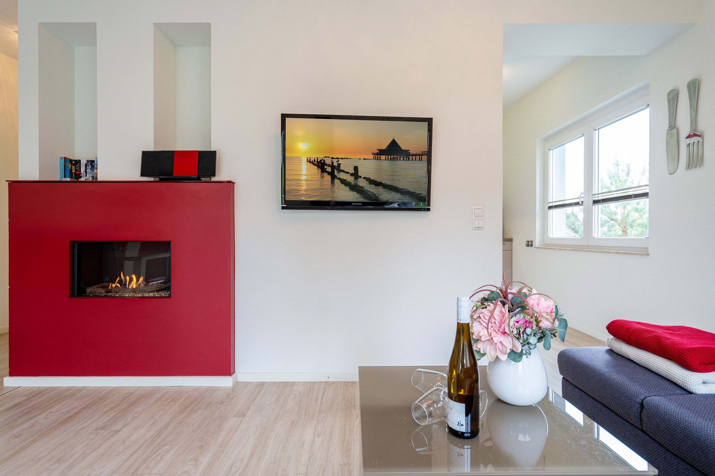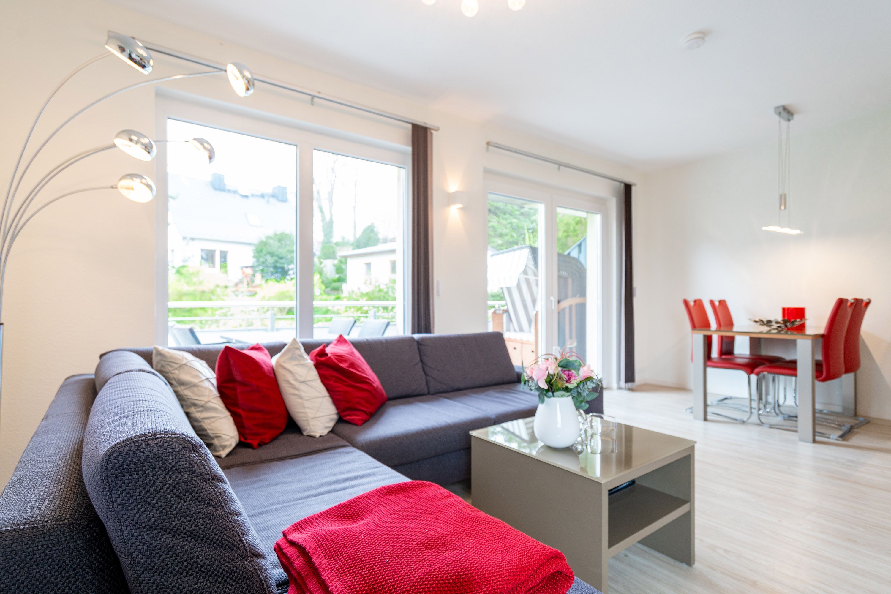Sonne über Sonne lassen Sie in diesem Appartement auf alle möglichen Arten entspannen und neue Energie tanken. Das 61 Quadratmeter große Ferien-Appartement, zu dem Sie ganz bequem per Fahrstuhl gelangen können, ist für einen Urlaub an der Ostsee die ideale Ruhe-Oase. Dazu passt der Spruch Ihres Domizils ideal: Gönne dir einen Augenblick der Ruhe und achte auf das, was dir Freude macht. Bis zu drei Personen und ein Kleinkind (im kostenpflichtig dazu buchbaren Kinderreisebett) können es sich hier gut gehen lassen. Auf Wunsch stellen wir auch einen Kinderhochstuhl in die Wohnung. Das Urlaubsdomizil ist hell und modern eingerichtet. Frische Farben, Bilder und Accessoires sorgen für Akzente. Das Wohnzimmer ist großzügig geschnitten, bietet viel Platz zum Kuscheln auf dem Sofa vor dem flackernden Flammenspiel des Gas-Kamins oder dem großen Flat-TV. Genießen Sie darüber hinaus den großen Südbalkon oder essen Sie entspannt am schönen Esstisch. Die Küche ist offen und mit Geräten wie Herd, Kühlschrank, Spülmaschine, Mikrowelle, Toaster etc. voll ausgestattet. Und da man für ein gemeinsames Essen auch Geschirr braucht, ist dieses dort ebenfalls zu finden. Den großen Südbalkon (17 Quadratmeter groß) mit Strandkorb können Sie vom Wohnzimmer aus betreten. Ob beim Sonnenbaden auf den Liegen oder beim Frühstück im Freien die frische Ostseeluft erfrischt so oder so Körper und Seele. Das Appartement hat zwei Schlafzimmer. Eines verfügt über ein bequemes Boxspringdoppelbett, einen stummen Diener zum Aufhängen Ihrer Sachen, einen geräumigen Schrank und einen Flat TV. Im zweiten Schlafzimmer steht eine ausziehbare Schlafcouch (1,40 m x 2,00 m). Auch hier gibt es einen Fernseher und einen großen Schrank. Das Badezimmer verfügt über Dusche, Waschtisch und WC. Handtücher liegen für Sie bereit und die Betten sind bei Anreise bezogen. Das WLAN ist kostenfrei. Ein Pkw-Stellplatz ist in der Tiefgarage vorhanden.