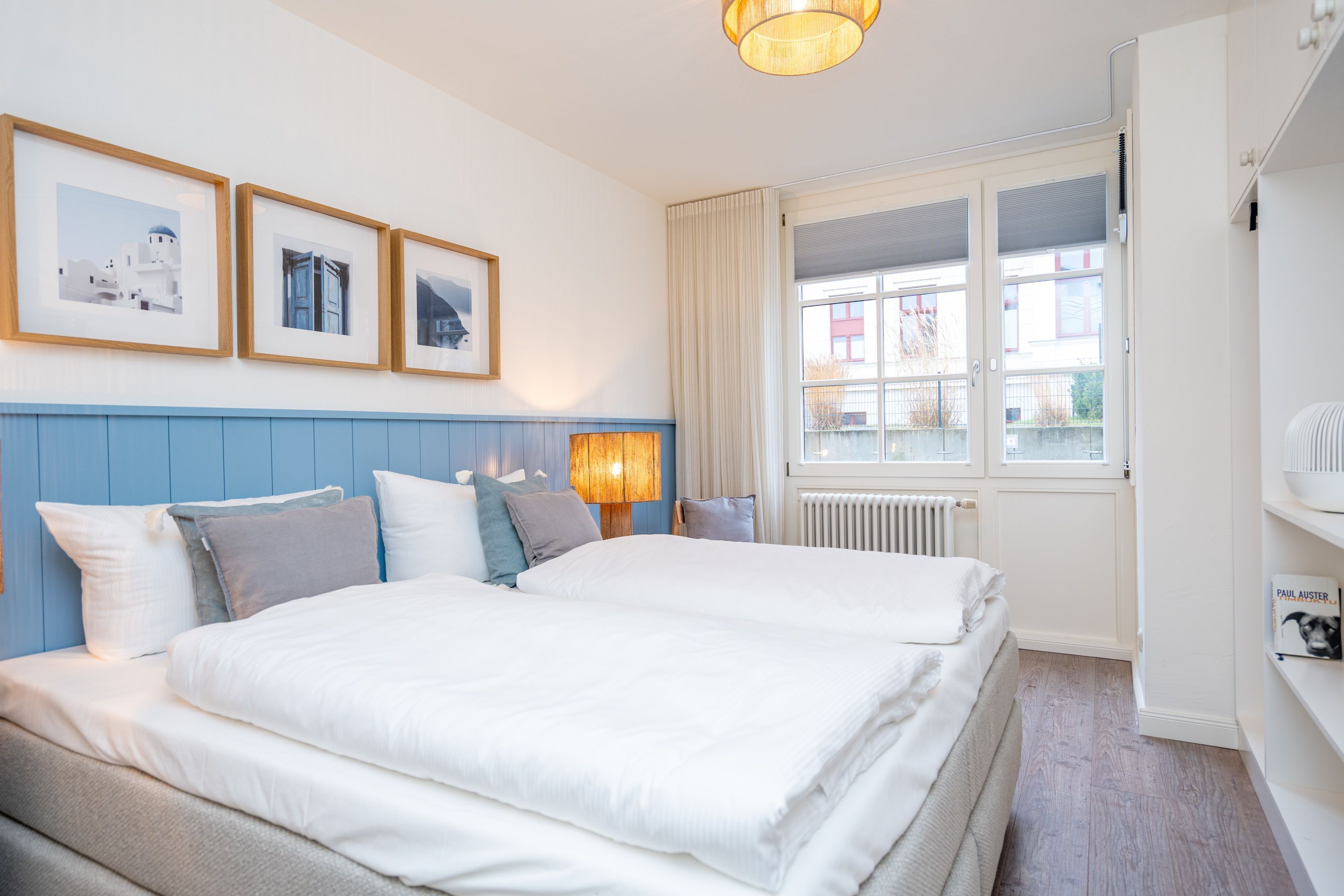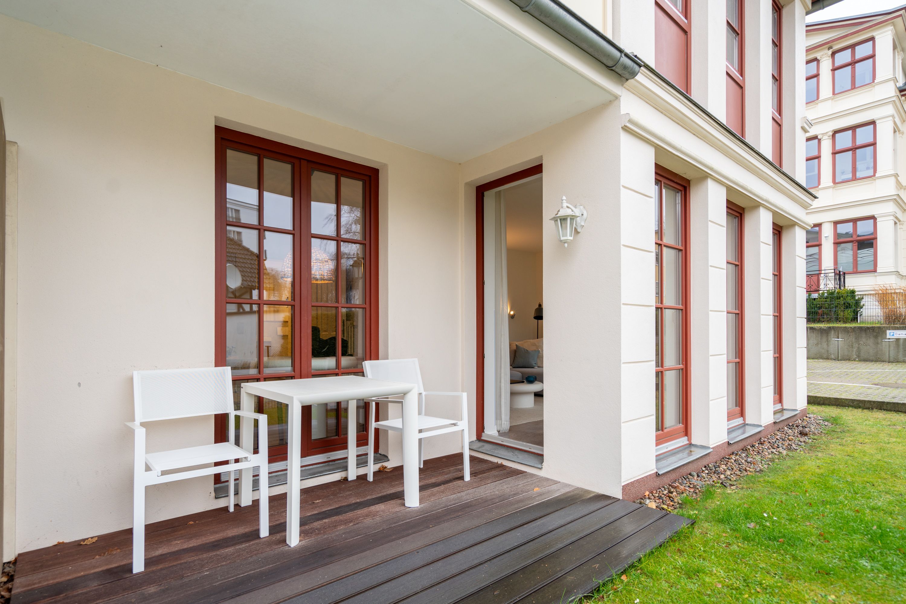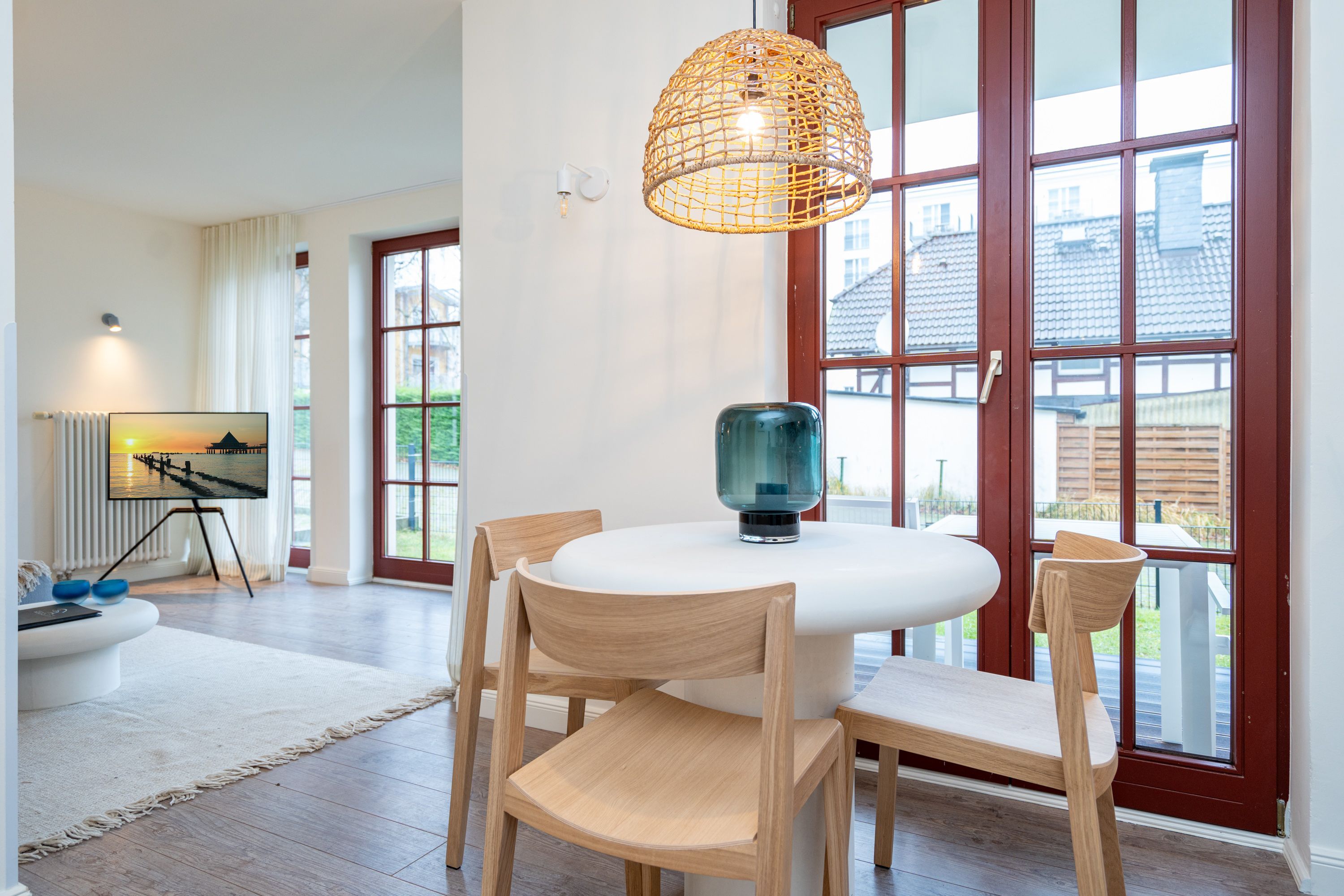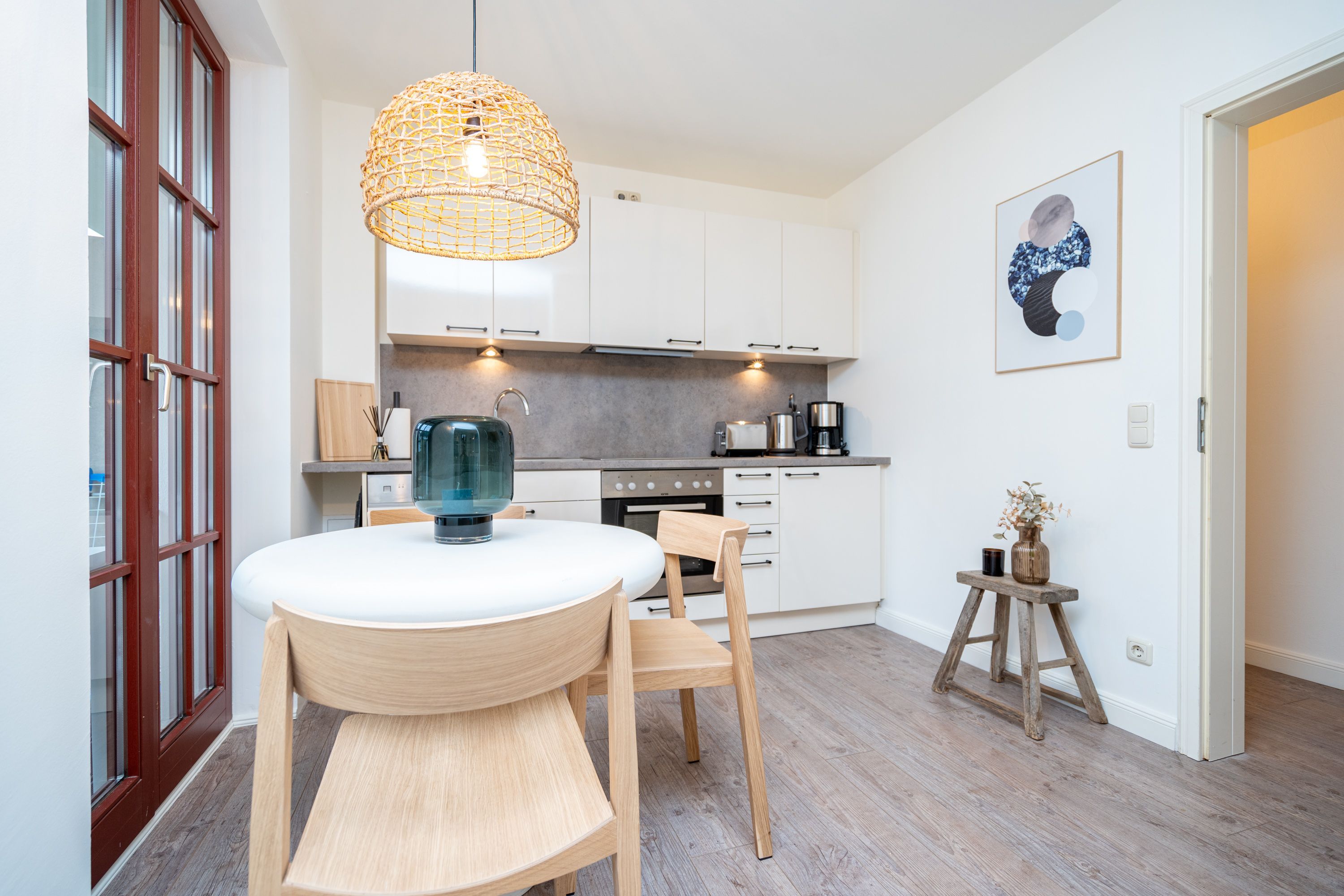 Willkommen in der neu gestalteten 2-Raum-Ferienwohnung (46 m²), Nummer 03, die ab Winter 2024 in frischem Glanz erstrahlt! Die Wohnung befindet sich im Erdgeschoss der charmanten Villa Damaris und bietet Platz für 2 Erwachsene und 1 Kleinkind bis 3 Jahre (im Kinderreisebett). Freuen Sie sich auf eine moderne Ausstattung und stilvolle Dekorationen, die für eine angenehme Urlaubsatmosphäre sorgen. Der lichtdurchflutete Wohnbereich ist mit einer gemütlichen Sitzgruppe und einem Flat-TV ausgestattet. Angrenzend befindet sich eine offene, vollständig eingerichtete Küchenzeile mit Essbereich, die keine Wünsche offenlässt. Das separate Schlafzimmer verfügt über ein komfortables Boxspringdoppelbett, einen Kleiderschrank und einen weiteren Flat-TV. Das moderne Badezimmer bietet eine Dusche, einen Waschtisch und ein WC. Zusätzlich lädt die Terrasse mit einem Tisch und zwei Gartenstühlen zum Verweilen im Freien ein. Für unsere kleinen Gäste stellen wir auf Anfrage gerne ein Kinderreisebett (ohne zusätzliche Matratze und Bettzeug) sowie einen Kinderhochstuhl bereit (gegen Aufpreis). Ihr Fahrzeug parken Sie bequem auf dem zur Wohnung gehörenden Stellplatz Nr. 3 direkt am Haus. Zudem steht Ihnen während Ihres Aufenthalts kostenfreies WLAN zur Verfügung.