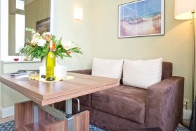 Die Ferienwohnung 5 empfängt Sie im 1. Obergeschoß der Villa Dora und besticht durch einen traumhaften Meerblick. Das gemütliche Einraumdomizil ist ideal für zwei Personen. Sie finden hier auf 35 qm einen Schlafbereich mit Doppelbett ( 1,60m x 2,00m) mit einer geschlossenen Veranda, die als kleiner Wohnbereich gestaltet ist. Sie genießen einen fantastischen Blick auf das Meer. Ihr Domizil ist mit einer Küchenzeile ( 2-Platten-Herd) ausgestattet, so dass man sich auch hier selbst verpflegen kann. Das Bad mit Dusche und WC ergänzt dieses Appartement. Für Ihren Komfort sind die Betten bei Ihrer Anreise bezogen und die Handtücher liegen bereit. Ein Pkw-Stellplatz steht in einer Garage in der hinteren Bergstraße zur Verfügung.