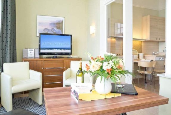 Traumhafter Meerblick, erste Reihe, 4-Sterne-Komfort-Wohnungen. Gibt es nicht? Doch! In der Villa Dora, eine stilvolle Villa der Kaiserzeit. Hier wird Ihr Urlaub zu einem besonderen Erlebnis, denn die Ostsee ist quasi vor der Tür. Komfortabel und ansprechend gestaltete Domizile, vom 1-Raum-Appartement mit verglaster Veranda bis hin zum Dachstudio mit 100 qm, bieten Ihnen zu zweit oder in Familie erholsame Urlaubstage. Für jedes Appartement in der Villa Dora steht ein Stellplatz zur Verfügung. Sie haben die Möglichkeit Ihre Fahrräder in einem separaten Raum unterzustellen. Eine Waschmaschine und ein Trockner im Haus sind gegen eine Gebühr nutzbar. Das WLAN-Netz steht kostenfrei zur Verfügung.