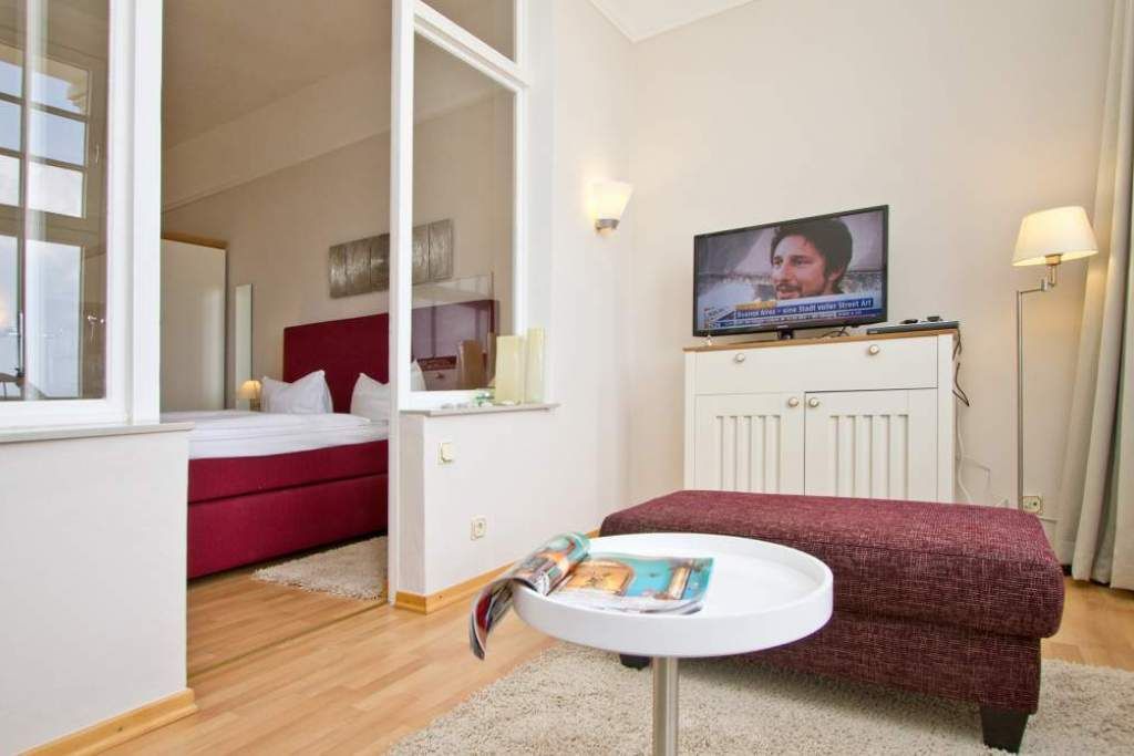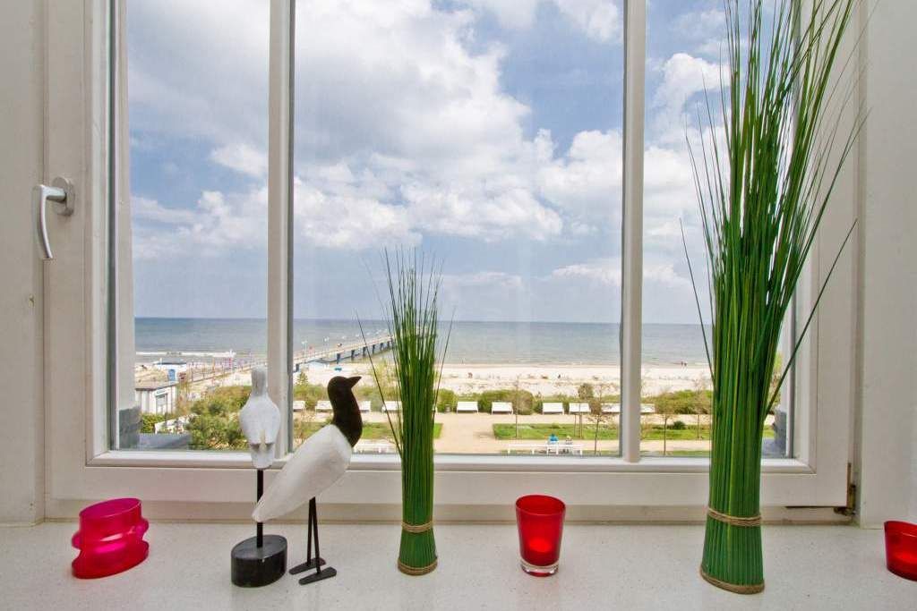 Panorama mit Meerblick! Die Ferienwohnung 8 begrüßt Sie im 2. Obergeschoss der Villa Dora und besticht neben seinem traumhaften Blick auf die Ostsee, auch mit seiner modernen und sehr geschmackvollen Einrichtung. Das gemütliche Einraumdomizil ist ideal für zwei Personen (zusätzlich Kleinkind bis 3 Jahre im Babyreisebett möglich). Sie finden hier auf 35 qm einen Schlafbereich mit bequemen Boxspringbett (1,80m x 2,00m). Die vorgelagerte Veranda ist als Wohnbereich mit Sitzgruppe und Flat-TV gestaltet. Lassen Sie die Seele baumeln beim Blick auf das Meer! Zusätzlich ist das Appartement mit einer Küchenzeile (2 Platten-Cerankochfeld und Geschirrspüler) ausgestattet. Das Bad mit Dusche und WC ergänzt dieses Appartement. Für Ihren Komfort sind die Betten bei der Anreise bezogen und Handtücher liegen bereit. Für Ihren PKW steht Ihnen ein Parkplatz mit Poller vor dem Haus zur Verfügung.