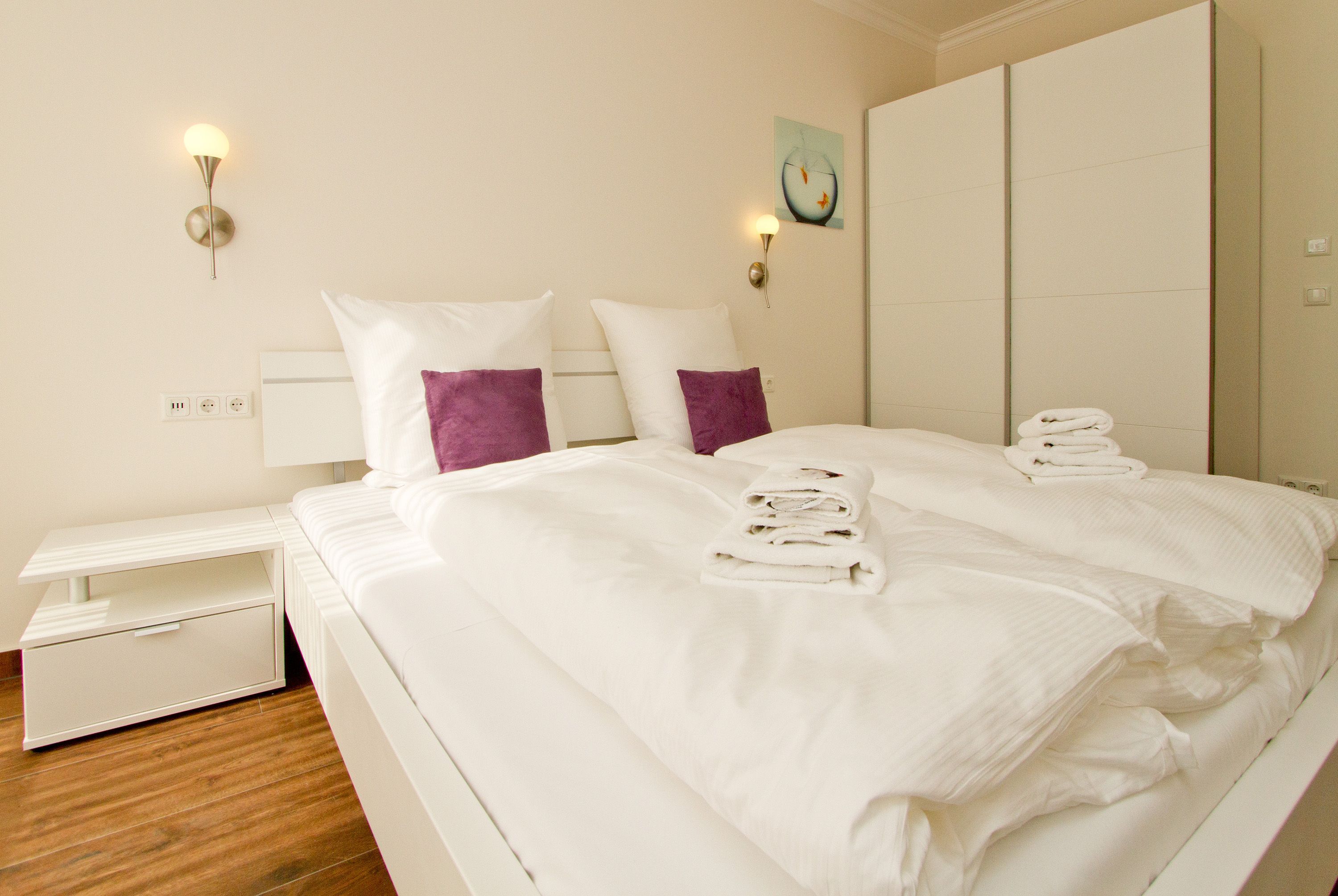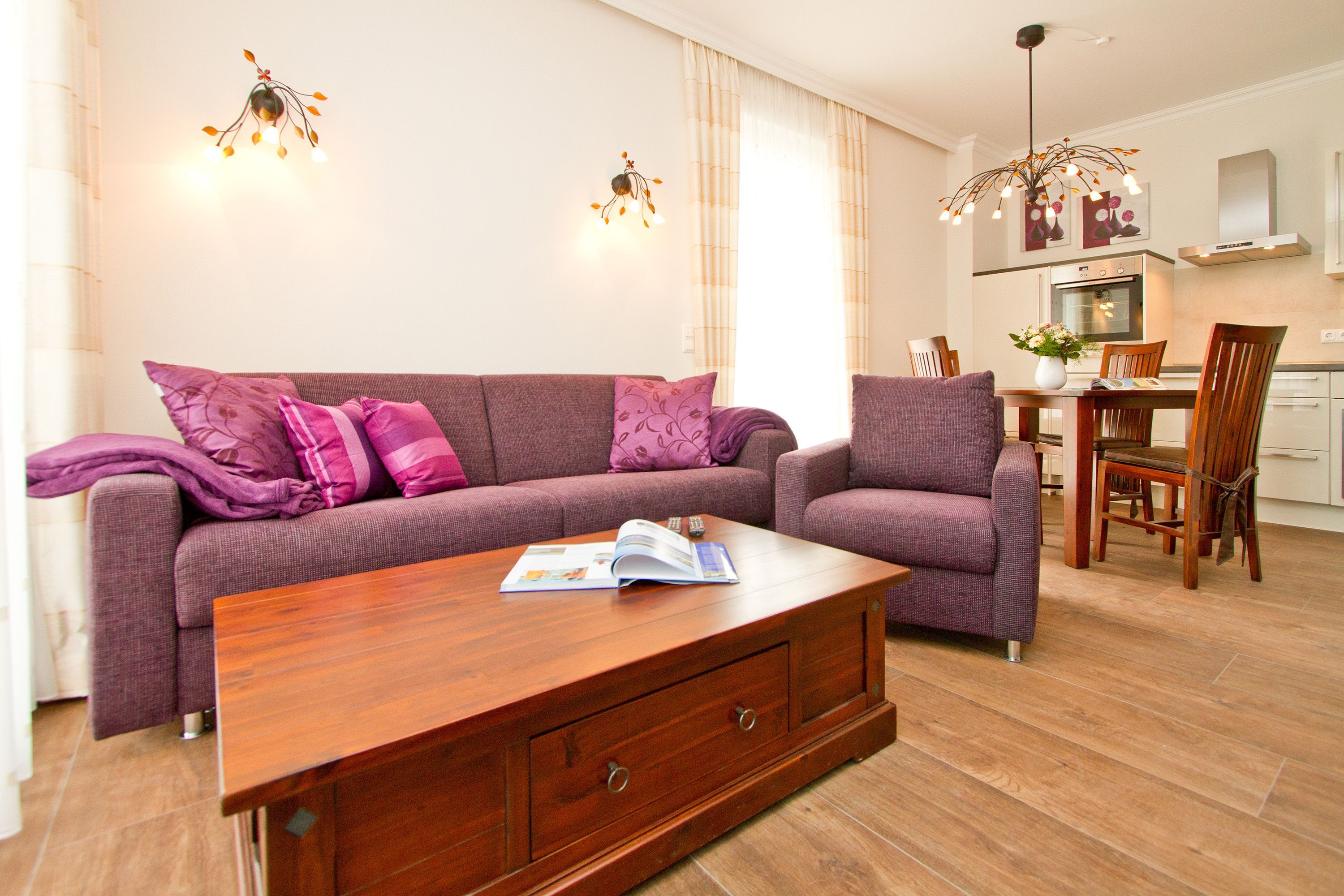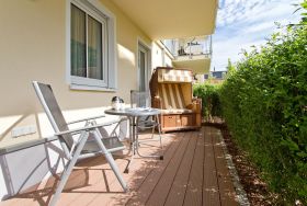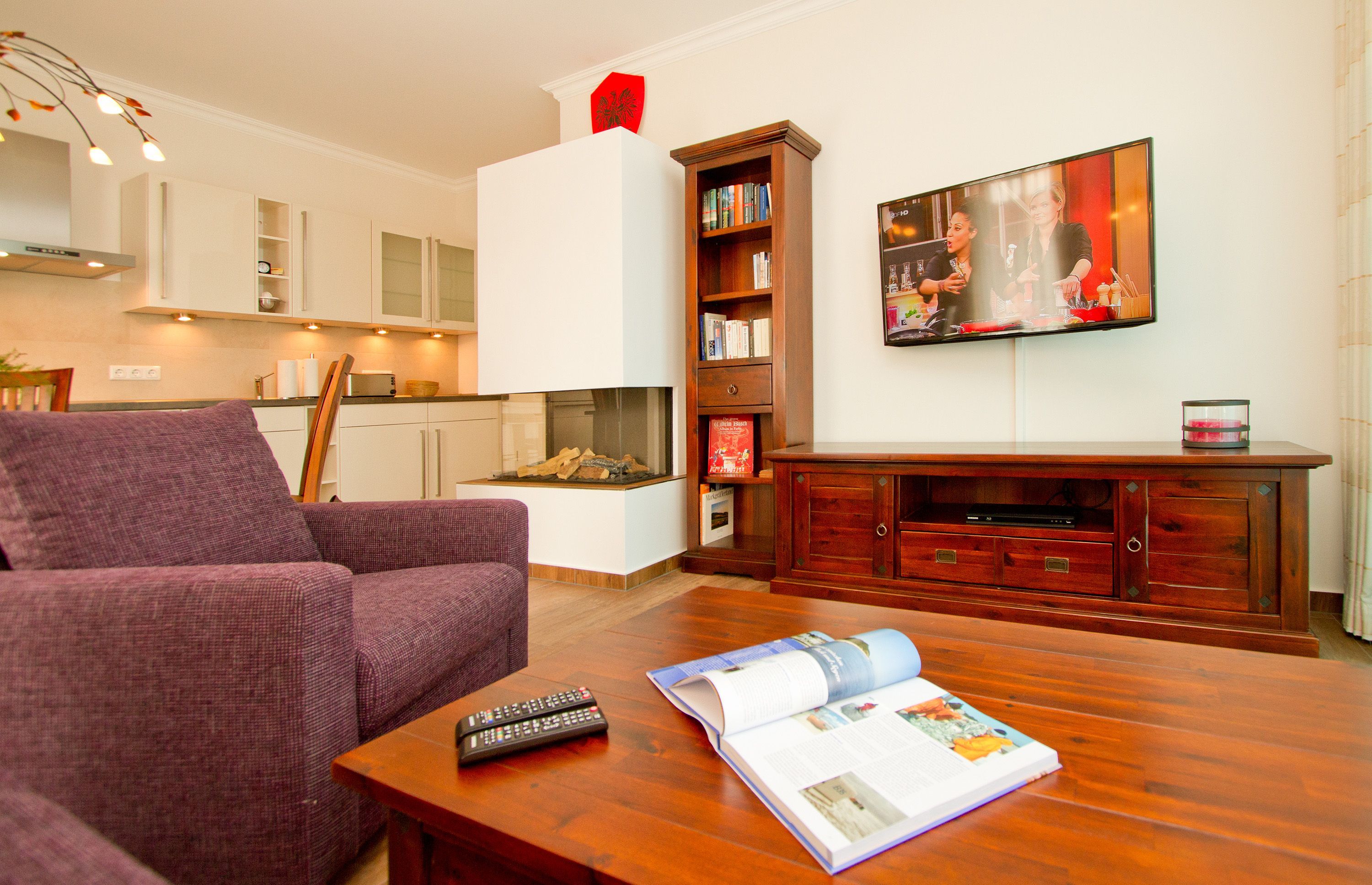 Dünenpalais Ferienwohnung 6: Im Erdgeschoss des Südhauses befindet sich dieses schöne 3-Raum-Appartement für 4 Personen und ein Kleinkind (bis 3 Jahre im Kinderreisebett). Der gemütliche Wohnraum wird ergänzt durch die moderne, komplett ausgestattete Küchenzeile mit Essbereich. Die beiden Schlafzimmer sind mit Doppelbetten (1,80 m x 2 m) und je einem Flat-TV ausgestattet, hier findet sich auch genug Platz für ein Kinderreisebett (kann im Vorwege ohne Matratze & Bettzeug gegen einen Aufpreis bestellt werden). Zum hellen Bad mit großer Echtglasdusche und WC gibt es zusätzlich ein Gäste-WC. Ein besonderes Highlight ist die wohnungseigene Sauna (ideal für 2 Personen) und der per Fernbedienung bedienbare Gaskamin. Wer keine Lust auf Strand hat, macht es sich wahlweise auf dem großen, sonnigen Südbalkon (teilweise überdacht) oder der schönen Terrasse gemütlich, bequeme Gartenmöbel und ein Strandkorb sowie Sonnenliege warten hier auf Sie. Für Ihren Komfort steht die Erstausstattung Wäsche für Sie bereit. Ein Pkw-Stellplatz befindet sich in der Tiefgarage.