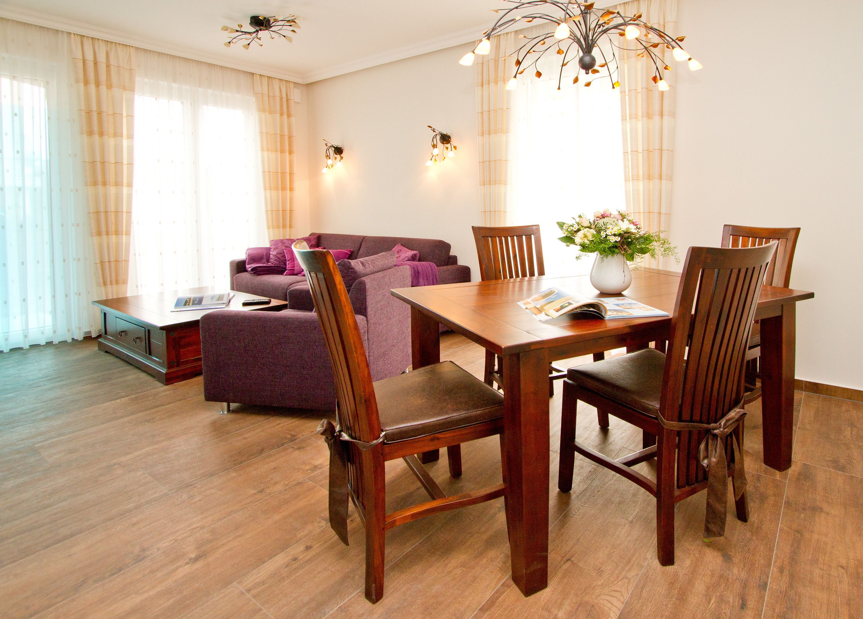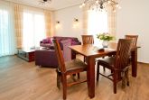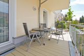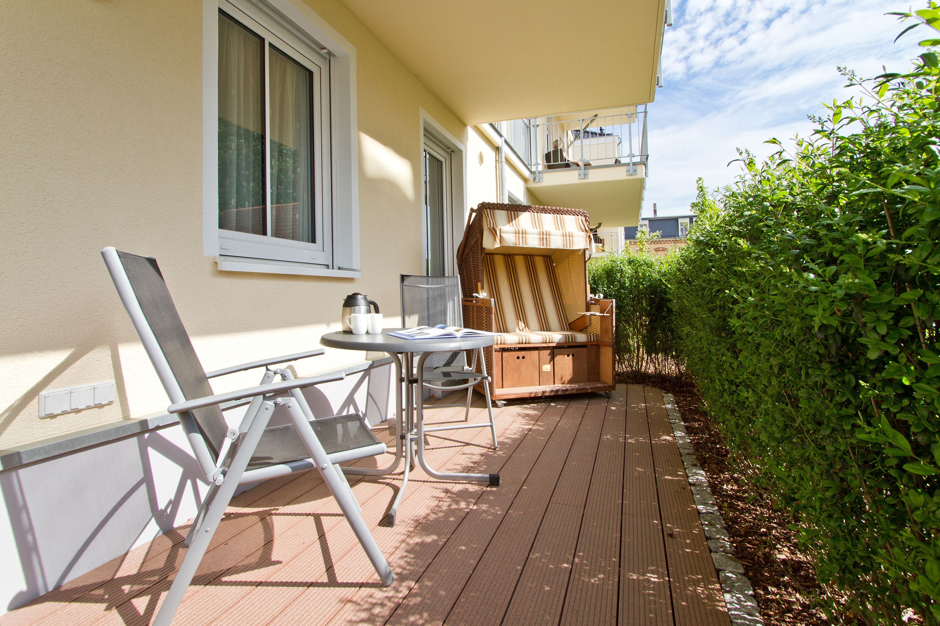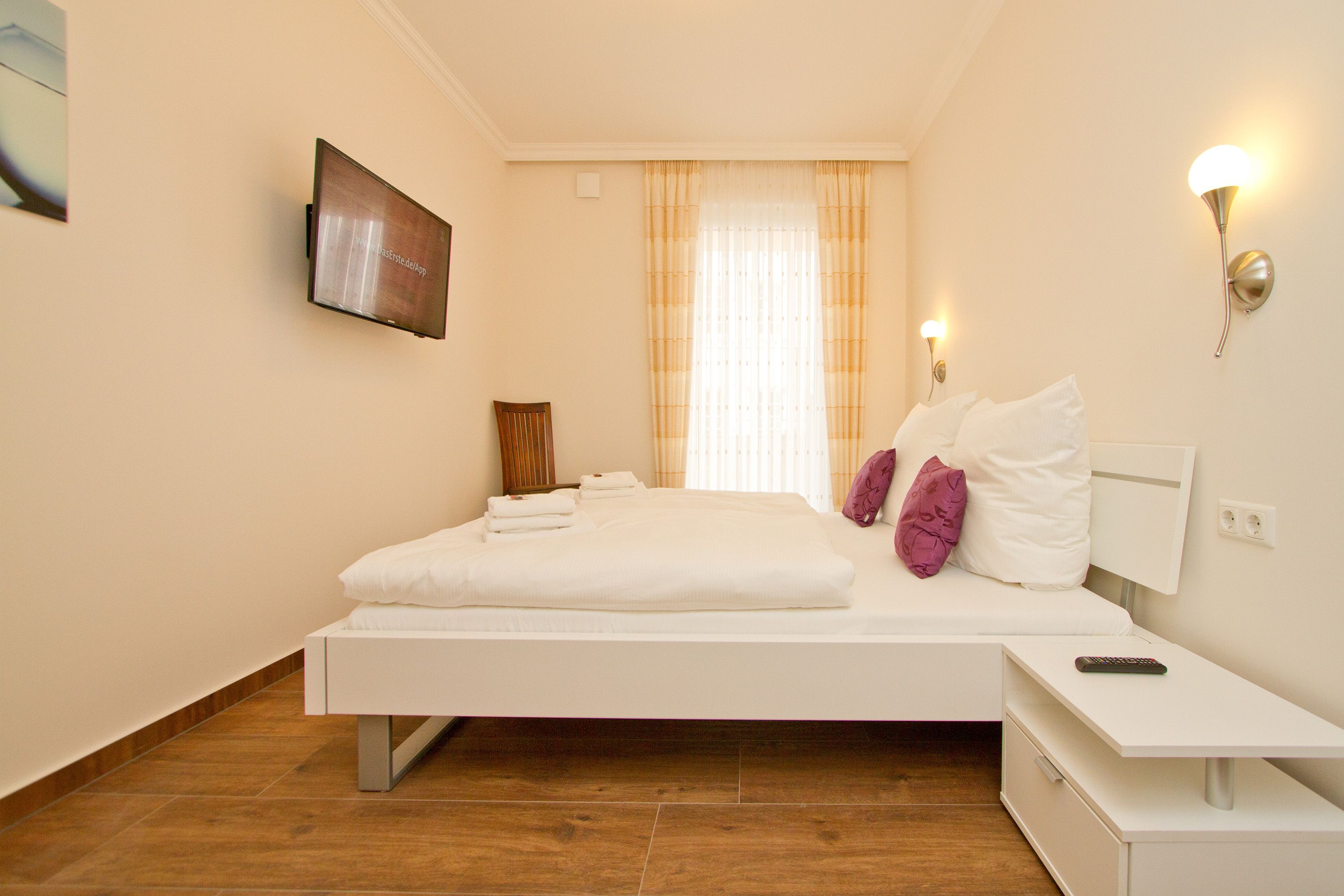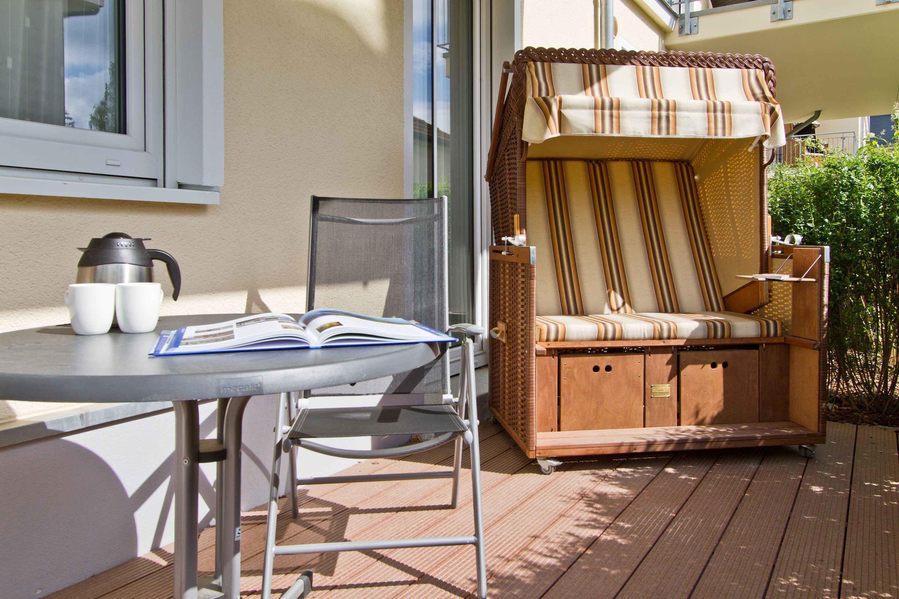 Dünenpalais Ferienwohnung 6: Im Erdgeschoss des Südhauses befindet sich dieses schöne 3-Raum-Appartement für 4 Personen und ein Kleinkind (bis 3 Jahre im Kinderreisebett). Der gemütliche Wohnraum wird ergänzt durch die moderne, komplett ausgestattete Küchenzeile mit Essbereich. Die beiden Schlafzimmer sind mit Doppelbetten (1,80 m x 2 m) und je einem Flat-TV ausgestattet, hier findet sich auch genug Platz für ein Kinderreisebett (kann im Vorwege ohne Matratze & Bettzeug gegen einen Aufpreis bestellt werden). Zum hellen Bad mit großer Echtglasdusche und WC gibt es zusätzlich ein Gäste-WC. Ein besonderes Highlight ist die wohnungseigene Sauna (ideal für 2 Personen) und der per Fernbedienung bedienbare Gaskamin. Wer keine Lust auf Strand hat, macht es sich wahlweise auf dem großen, sonnigen Südbalkon (teilweise überdacht) oder der schönen Terrasse gemütlich, bequeme Gartenmöbel und ein Strandkorb sowie Sonnenliege warten hier auf Sie. Für Ihren Komfort steht die Erstausstattung Wäsche für Sie bereit. Ein Pkw-Stellplatz befindet sich in der Tiefgarage.