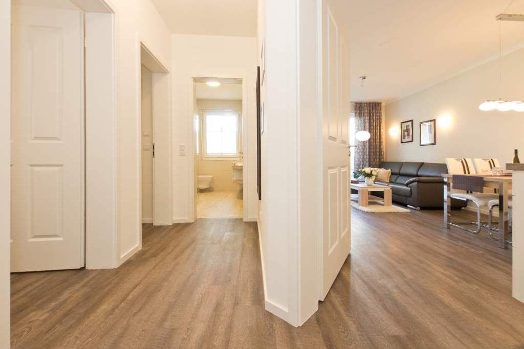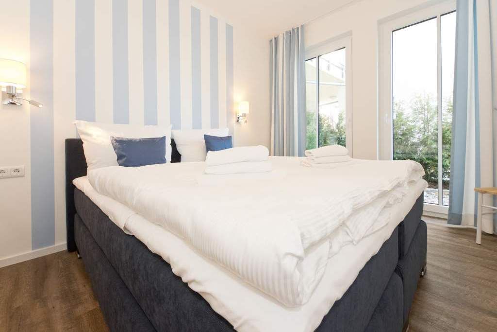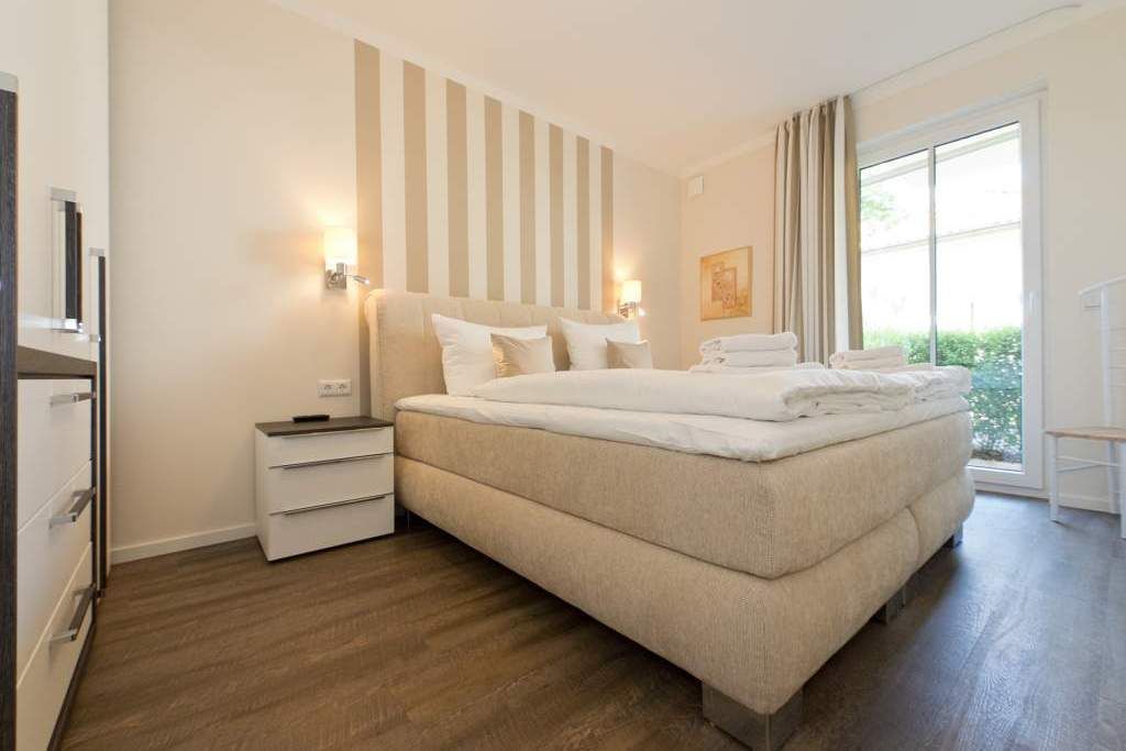 Im Erdgeschoss des Hauses erwartet Sie eine charmante 3-Raum-Ferienwohnung (70 qm) für 4 Personen und ein Kleinkind (bis 3 Jahre im Kinderreisebett). Geschmackvolle Farben & die moderne Einrichtung machen es zu einem perfekten Urlaubsdomizil. Der helle Wohnbereich mit bequemer Ledersitzgruppe wird ergänzt durch den schönen Gaskamin (per Fernbedienung zu benutzen) und die offene, komplett ausgestattete Küche mit Essplatz. Zwei Schlafzimmer mit komfortablen Boxspringbetten (1x 1,60m / 1x 1,80m breit) sorgen für erholsame Nächte. Für Ihren Komfort sind die Betten bei der Anreise bezogen und Handtücher liegen bereit (Erstausstattung). Das Bad ist mit einer großen Echtglas-Dusche und einem WC ausgestattet. Vom Wohnbereich hat man Zugang zur geschützten (Ost)Terrasse mit Gartenmöbeln. Auf Wunsch stellen wir ein Kinderreisebett (ohne Matratze & Bettzeug) und einen Kinderhochstuhl gegen einen Aufpreis zur Verfügung. Ein PKW-Stellplatz (Nr.6) steht Ihnen in der Tiefgarage zur Verfügung. Das WLAN-Netz ist kostenfrei nutzbar.
