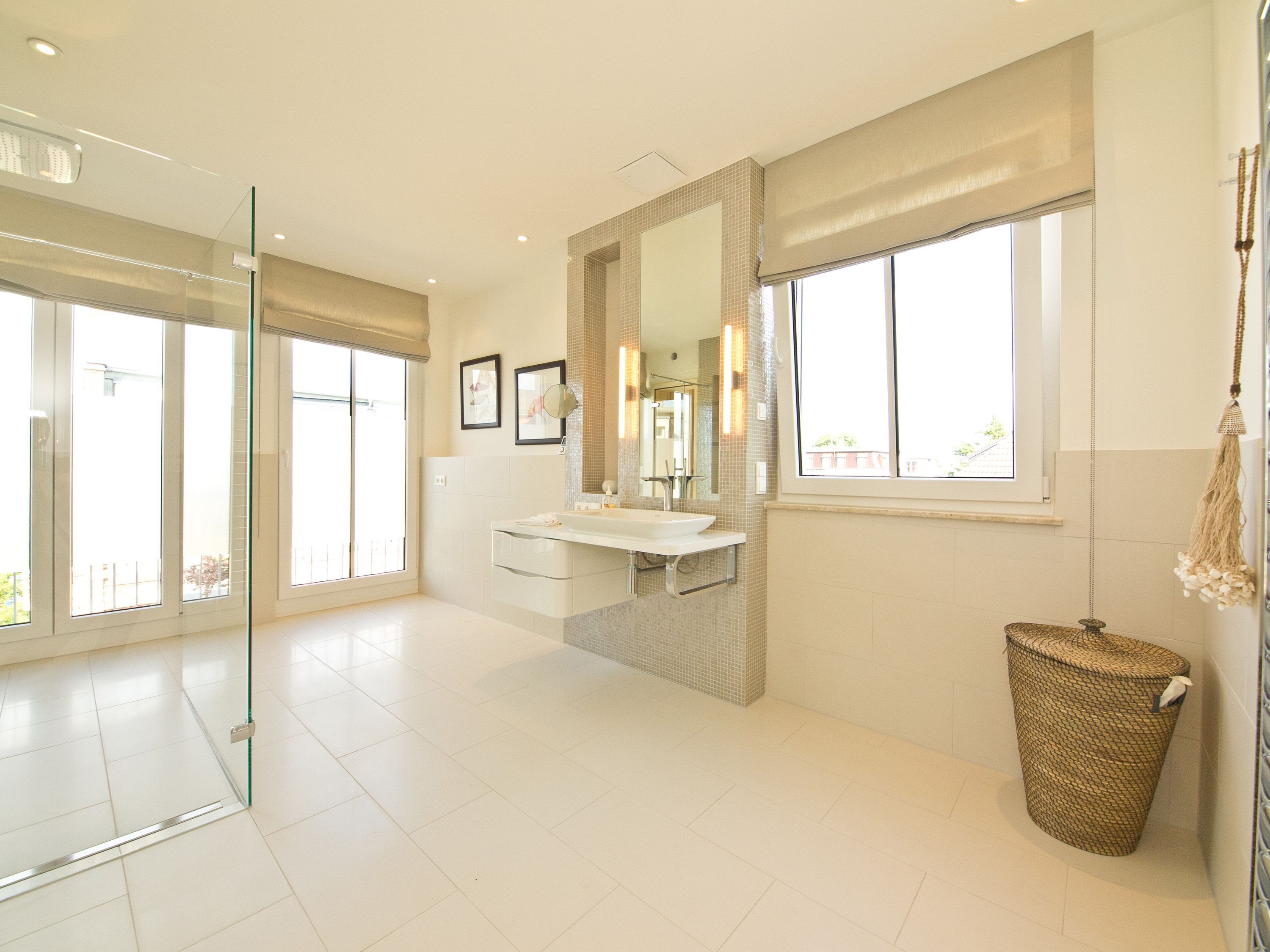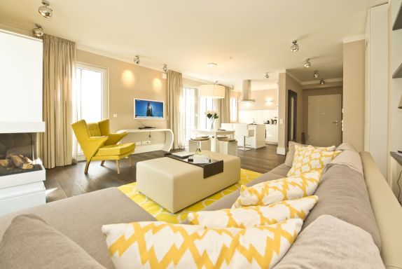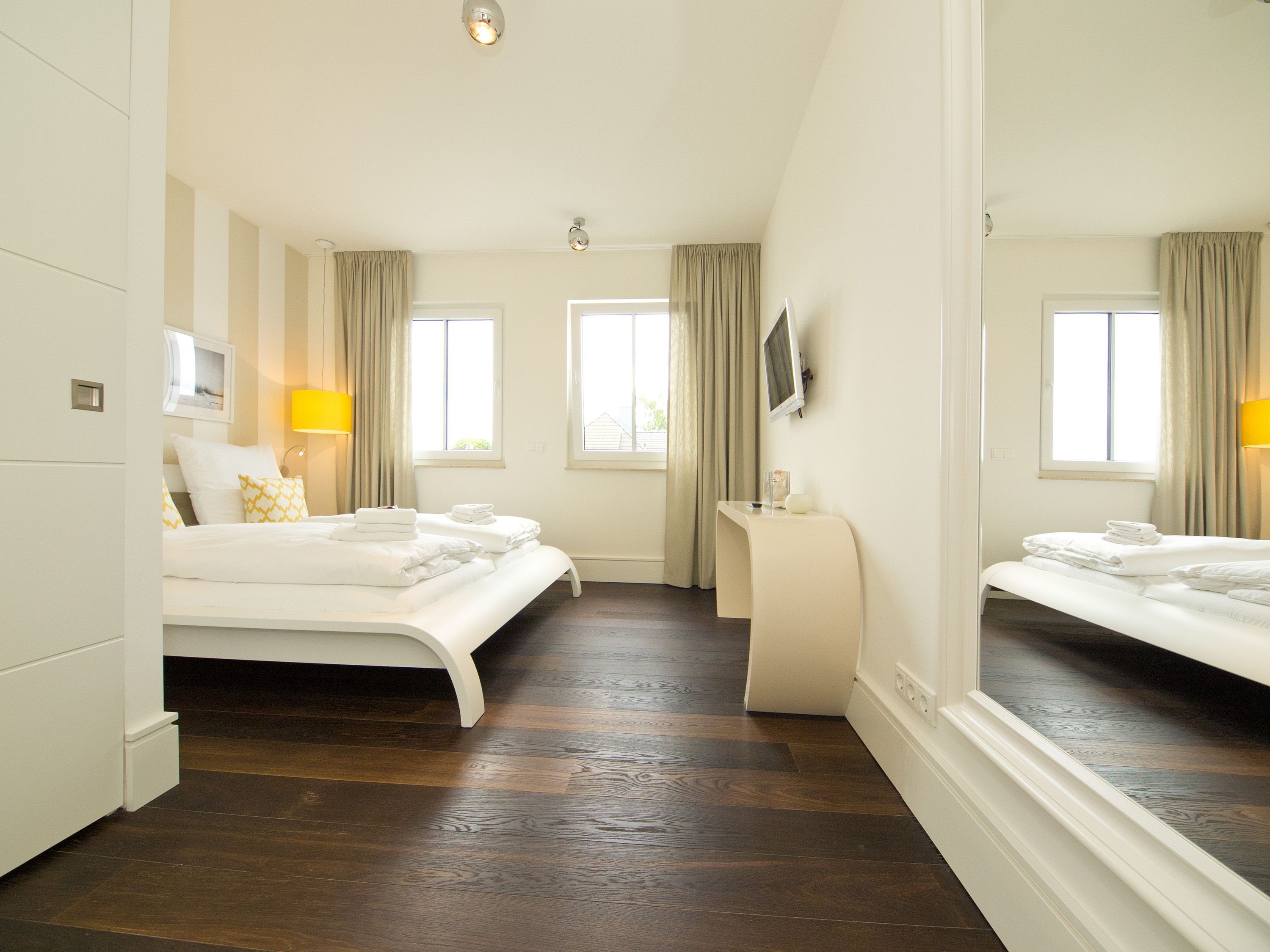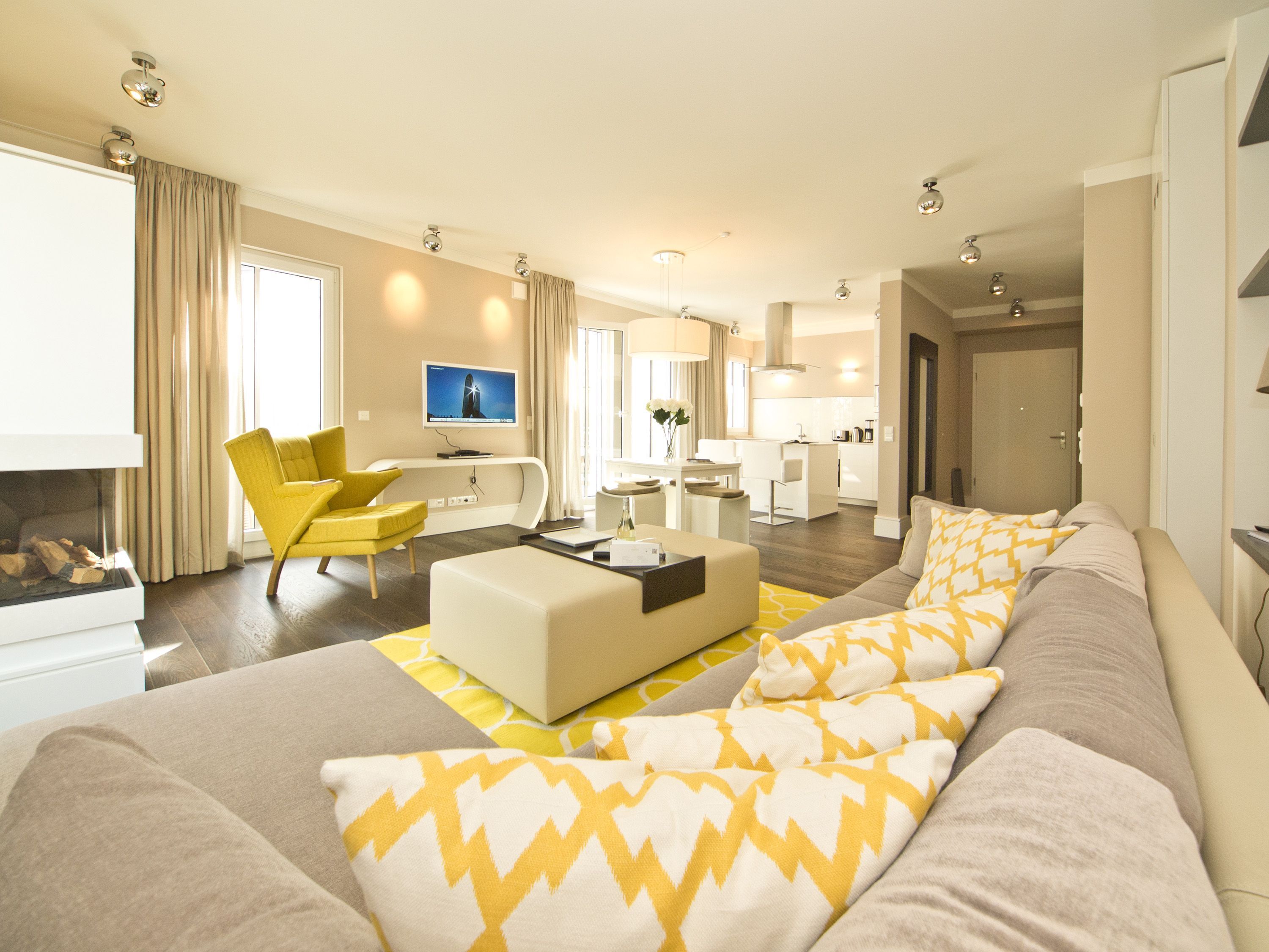 Im 2. Obergeschoss des Dünenpalais trifft modernes Design exklusive Ausstattung! Auf 100 qm wurden hochwertige Einbauten, ein edler dunkler Dielenboden und geschmackvolle Dekorationen von versierter Innenarchitektenhand zusammengestellt und schaffen so eine stylische Wohlfühlatmosphäre für bis zu 4 Personen und 1 Kleinkind (bis 3 Jahre im Kinderreisebett). Der großzügige Wohnbereich mit bequemer Sitzgruppe und Flat-TV schließt sich an die offene Küche mit Essplatz an. Ein besonderes Highlight ist der Gaskamin, der per Fernbedienung ein tolles Ambiente zaubert. Der Masterbedroom (mit Doppelbett 1,80m und Flat-TV) mit Balkon (Nordseite) verfügt über ein eigenes Ankleidezimmer, an das sich das große Bad mit Echtglasdusche & WC anschließt. Hier wurde ebenfalls die wohnungseigene Sauna (gegen Gebühr 1,00 € pro Stunde) integriert, nicht nur in der kalten Jahreszeit ein Ort zum Relaxen. Das zweite Schlafzimmer ist ebenfalls mit Doppelbett und eigenem Flat-TV ausgestattet, ihm gegenüber liegt das zweite Duschbad. Im Abstellraum kann eine Waschmaschine ( gegen Gebühr) genutzt werden. Ein sonniger Südbalkon mit Strandkorb und Gartenmöbeln rundet das Appartement ab. Für Ihren Komfort steht die Erstausstattung Wäsche für Sie bereit. Auf Wunsch stellen wir ein Kinderreisebett (ohne Matratze & Bettzeug) und einen Kinderhochstuhl gegen einen Aufpreis zur Verfügung. Ein PKW-Stellplatz steht Ihnen in der Tiefgarage zur Verfügung.