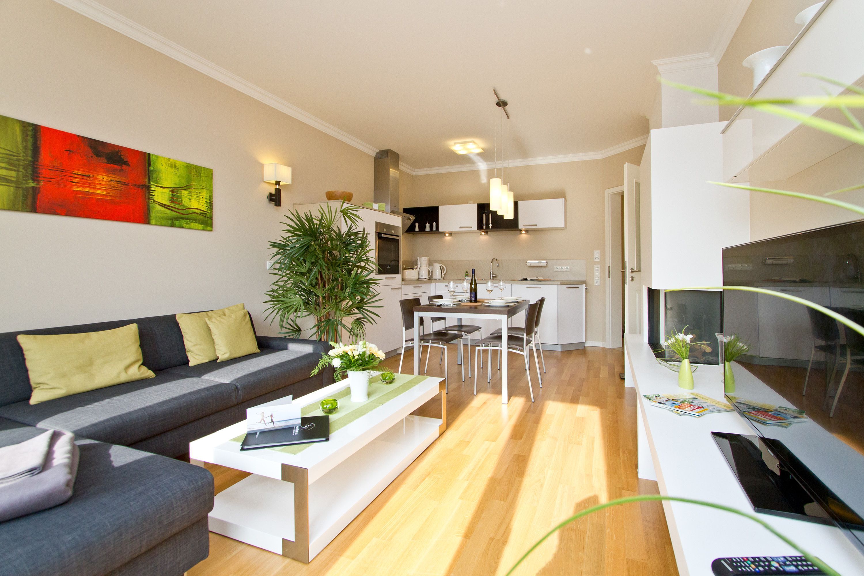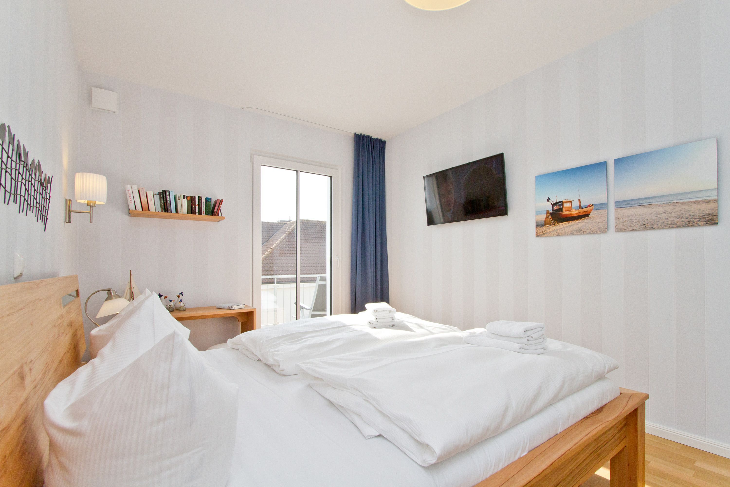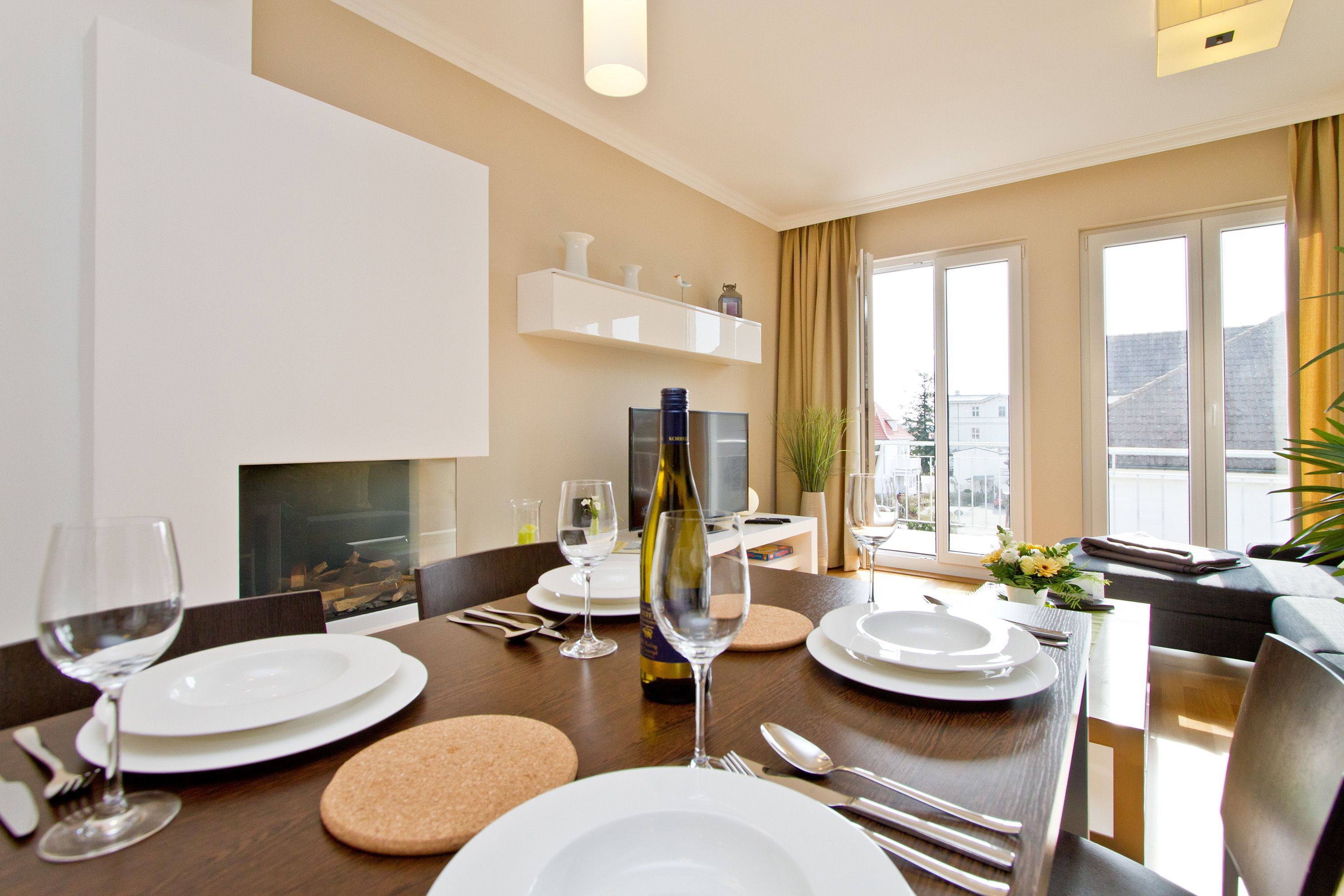 Im 2. Obergeschoss des Südhauses befindet sich diese schöne 3-Raum-Ferienwohnung für 4 Personen (inklusive Kleinkind bis 2 Jahre). Helle Räume, passend abgestimmte Farben und Stoffe und eine moderne, aber gemütliche Einrichtung werden Sie hier begeistern. Der Wohnbereich ist mit einer bequemen Sitzgruppe ausgestattet und wird ergänzt durch die komplett ausgestattete Küchenzeile mit Essplatz. Ein besonderes Highlight ist der per Fernbedienung bedienbare Gaskamin. Die beiden Schlafzimmer sind mit schönen Holzmöbeln eingerichtet. Metallfreie Doppelbetten unterstützen hier erholsamen Schlaf. Das helle Bad verfügt über eine große Echtglasdusche, Waschtisch, Bidet und ein WC. Im Hauswirtschaftsraum finden Sie eine Waschmaschine. Ein großer Ostbalkon lädt zum Frühstücken ein, von hier genießt man bis zum frühen Nachmittag die Usedomer Sonne. Das Blu-Ray-Heimkinosystem lässt aber auch Regentage wie im Flug vergehen. Gern können Sie den kostenfreien, wohnungseigenen DSL-Anschluss mit LAN und WLAN-Funktionalität nutzen. Für Ihren Komfort steht die Erstausstattung Wäsche für Sie bereit. Auf Wunsch stellen wir ein Kinderreisebett (ohne Matratze & Bettzeug) und einen Kinderhochstuhl gegen einen Aufpreis zur Verfügung. Ein Pkw-Stellplatz ( Nr.15) befindet sich in der Tiefgarage des Hauses.