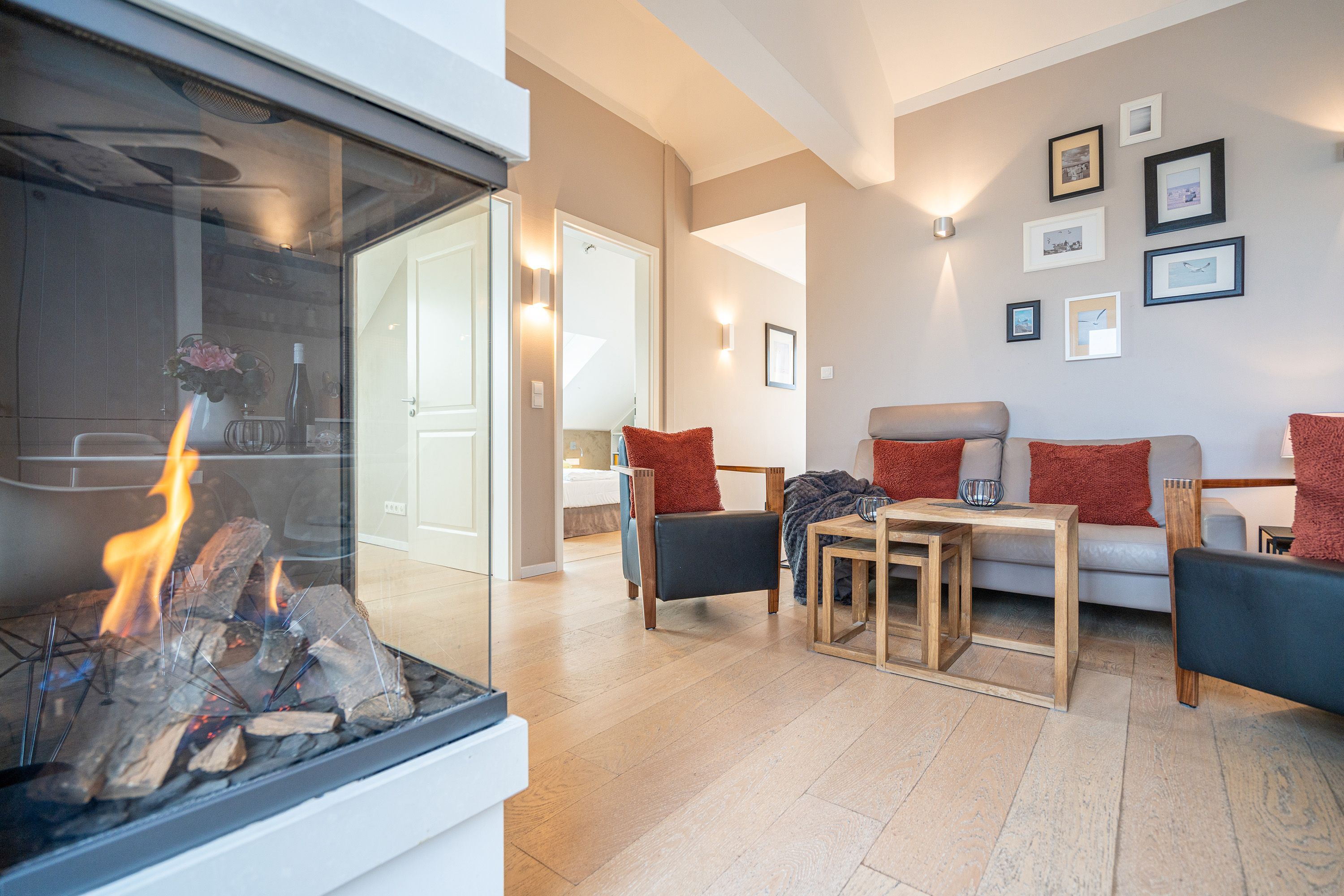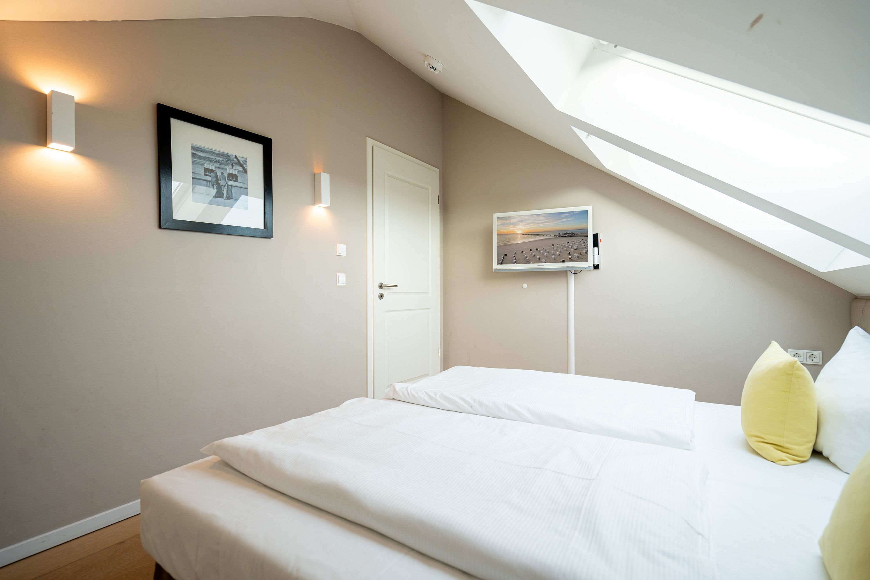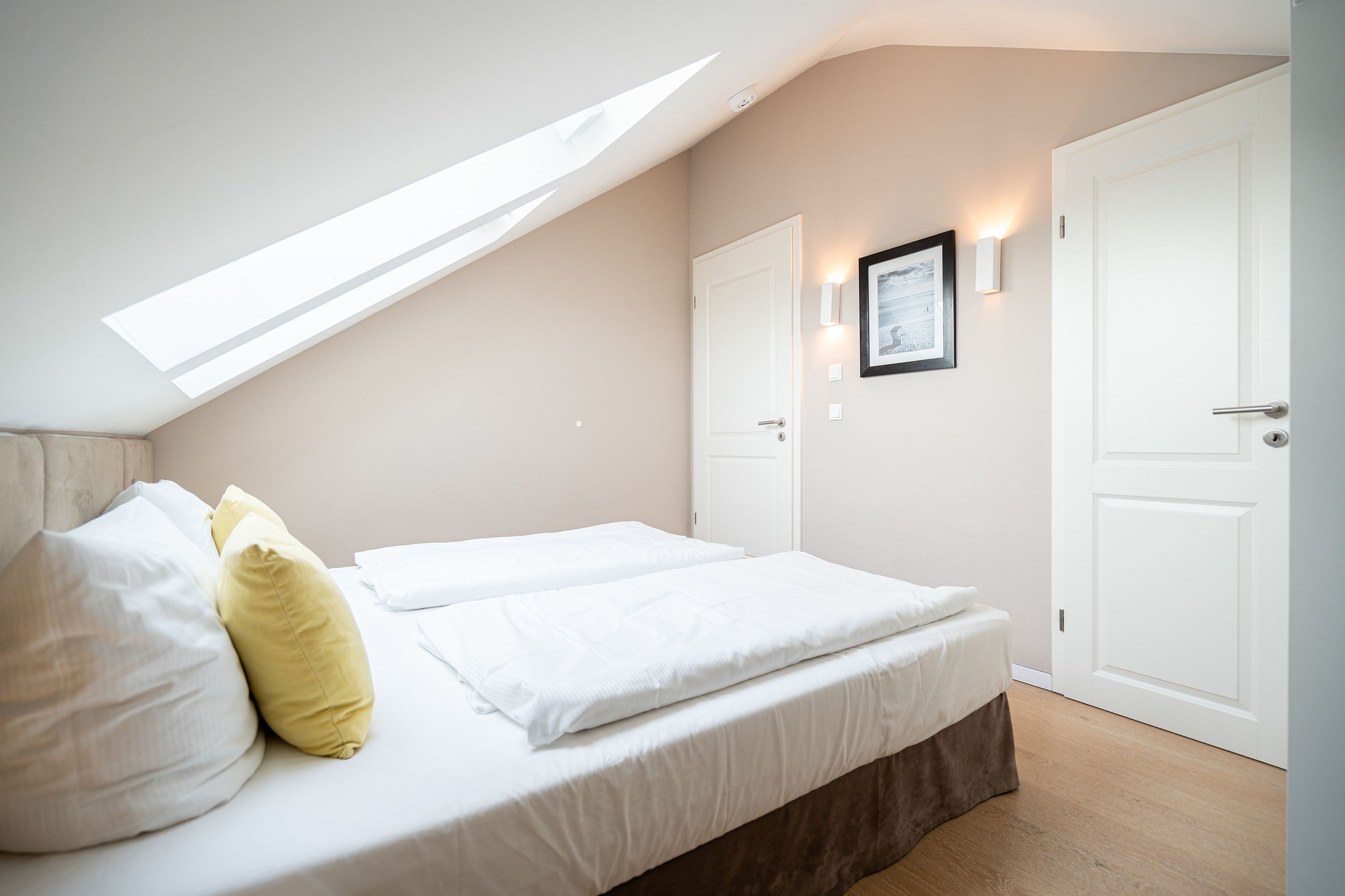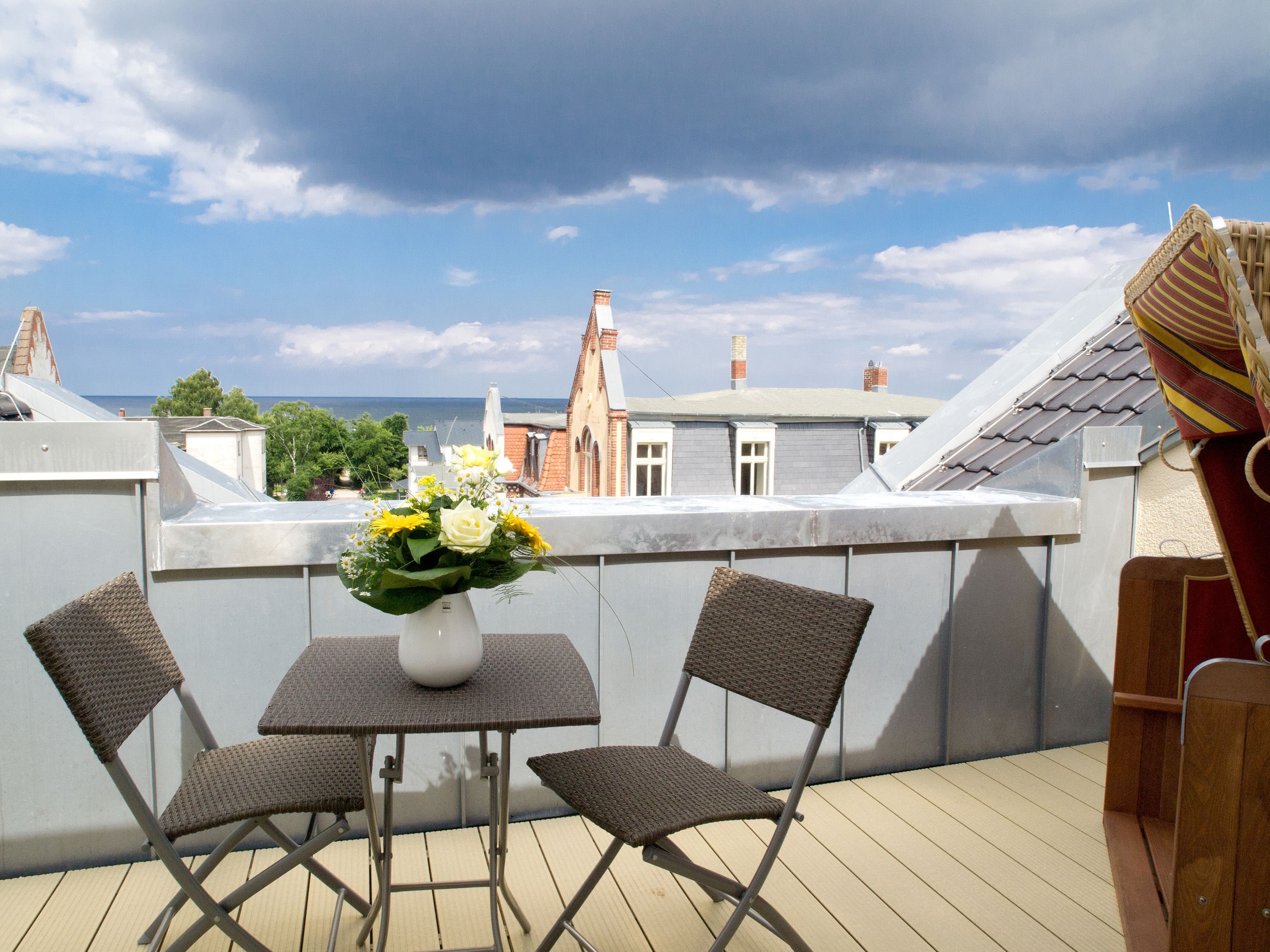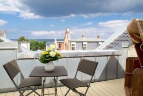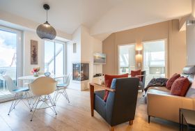 Wohlfühlen maßgeschneidert! Versierte Innenarchitektenhände schufen hier eine charmante 3-Raum-Ferienwohnung (68 qm für max. 4 Personen) unter dem Dach des Dünenpalais. Geschmackvolles Design, perfekte Einbauten und der tolle Meerblick machen diese Wohnung sicher schnell zu Ihrem Lieblingsdomizil. Der stylische Wohnraum mit gemütlichem Sofa und Flat-TV wird durch die komplett ausgestattete Küchenzeile mit Essplatz ergänzt. Der per Fernbedienung zu benutzende Gaskamin sorgt zusätzlich für heimelige Stunden. Zwei Schlafzimmer mit Doppelbetten (1,80m) und schönen Einbauten ( 1x mit eigenem Flat-TV) sorgen für ruhige Nächte. Zum Emails checken oder zum entspannten Lesen empfiehlt sich der Schreibtisch, der in einem kleinen Extra-Bereich gestaltet wurde. Von hier aus hat man auch Zugang zum schönen Bad mit Dusche, WC und der dort integrierten Sauna und zum kleinen, sonnigen Südbalkon. Der größere Balkon mit Strandkorb ist zur Meerseite ausgerichtet. Neben einem tollen Blick auf die Ostsee, ist dies der ideale Platz für ein Frühstück in der Morgensonne. Für Ihren Komfort sind die Betten bei der Anreise bezogen und Handtücher liegen bereit. Ein Pkw-Stellplatz ( Nr.13) steht in der Tiefgarage zur Verfügung. Das WLAN-Netz kann kostenfrei genutzt werden.