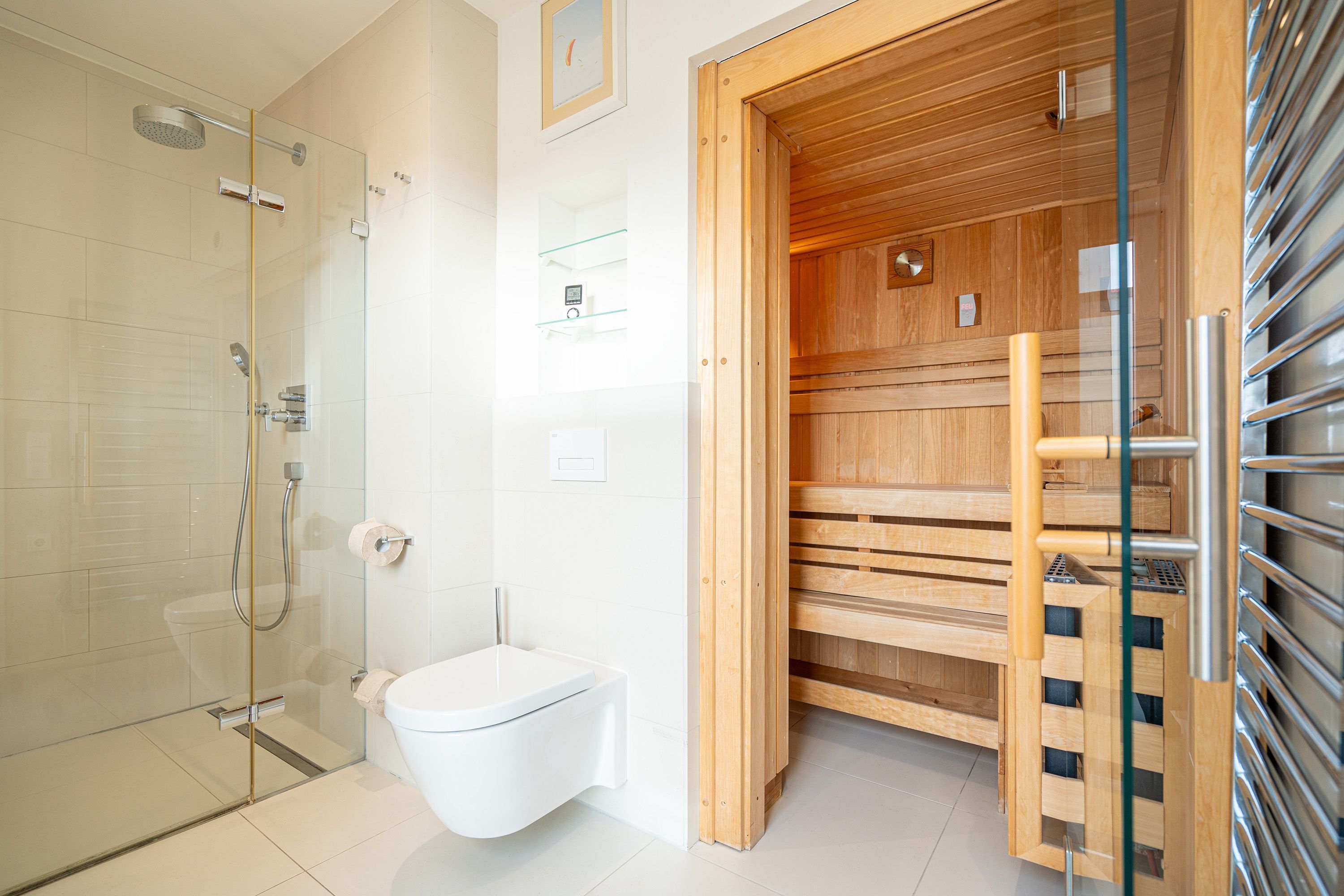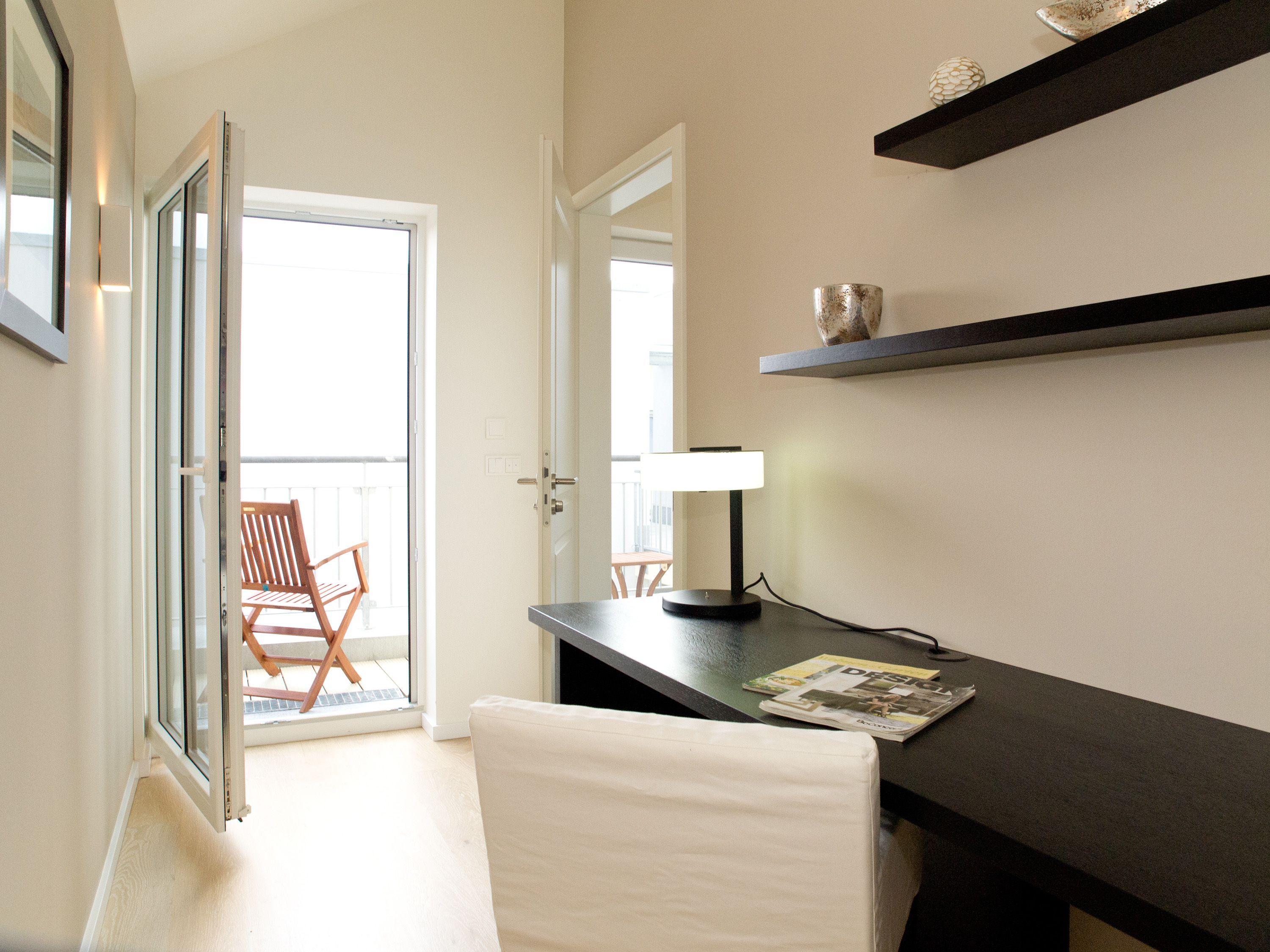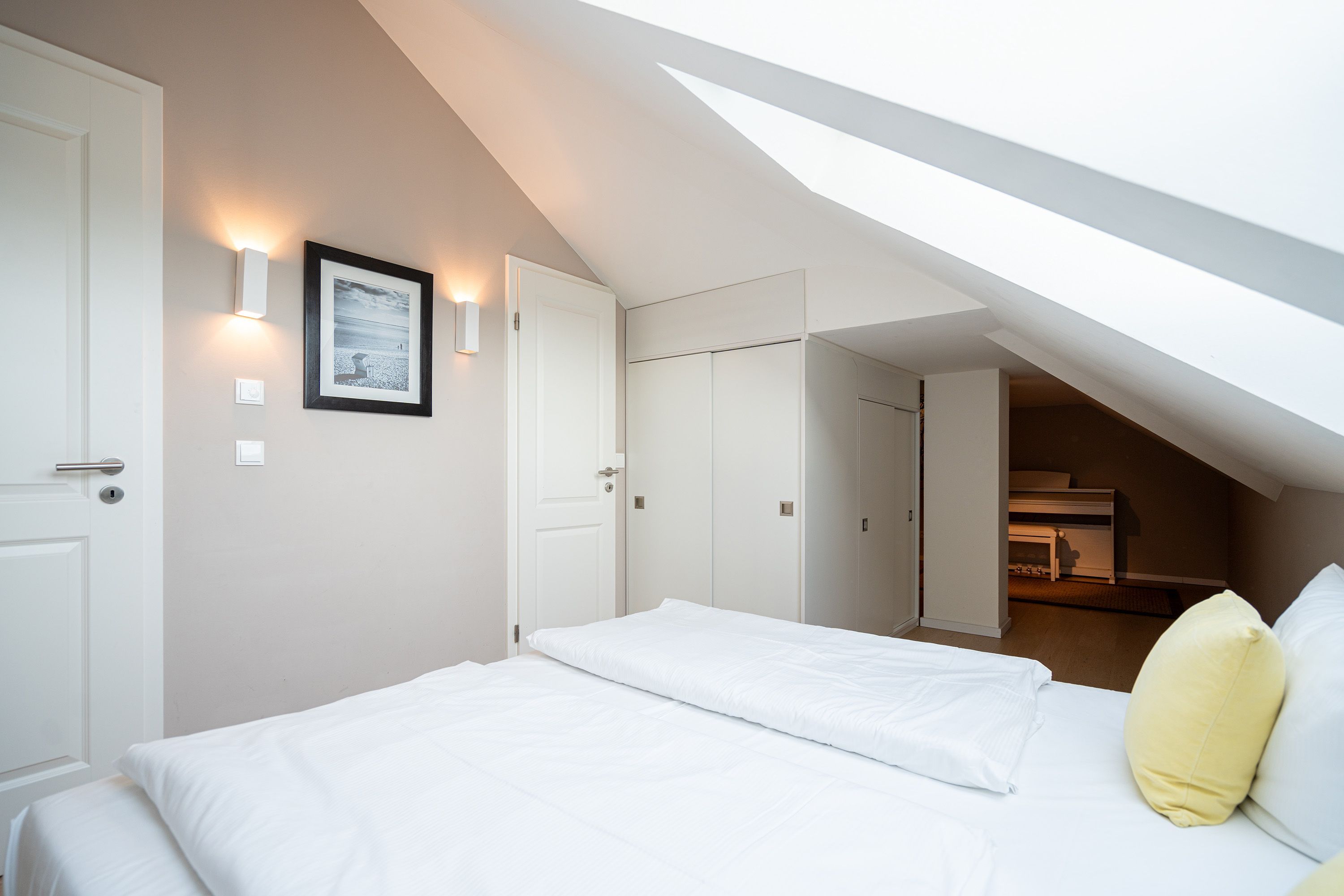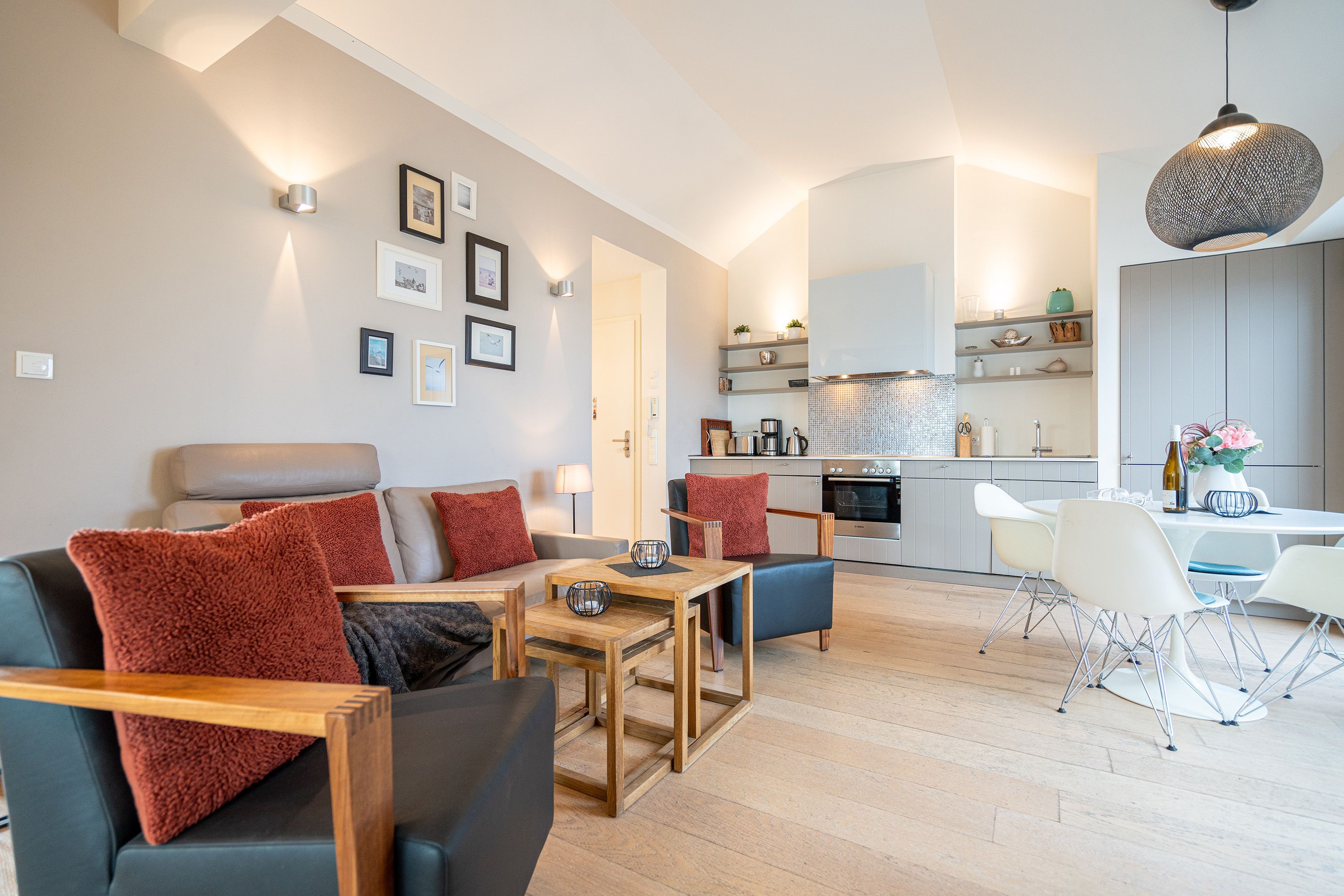 Wohlfühlen maßgeschneidert! Versierte Innenarchitektenhände schufen hier eine charmante 3-Raum-Ferienwohnung (68 qm für max. 4 Personen) unter dem Dach des Dünenpalais. Geschmackvolles Design, perfekte Einbauten und der tolle Meerblick machen diese Wohnung sicher schnell zu Ihrem Lieblingsdomizil. Der stylische Wohnraum mit gemütlichem Sofa und Flat-TV wird durch die komplett ausgestattete Küchenzeile mit Essplatz ergänzt. Der per Fernbedienung zu benutzende Gaskamin sorgt zusätzlich für heimelige Stunden. Zwei Schlafzimmer mit Doppelbetten (1,80m) und schönen Einbauten ( 1x mit eigenem Flat-TV) sorgen für ruhige Nächte. Zum Emails checken oder zum entspannten Lesen empfiehlt sich der Schreibtisch, der in einem kleinen Extra-Bereich gestaltet wurde. Von hier aus hat man auch Zugang zum schönen Bad mit Dusche, WC und der dort integrierten Sauna und zum kleinen, sonnigen Südbalkon. Der größere Balkon mit Strandkorb ist zur Meerseite ausgerichtet. Neben einem tollen Blick auf die Ostsee, ist dies der ideale Platz für ein Frühstück in der Morgensonne. Für Ihren Komfort sind die Betten bei der Anreise bezogen und Handtücher liegen bereit. Ein Pkw-Stellplatz ( Nr.13) steht in der Tiefgarage zur Verfügung. Das WLAN-Netz kann kostenfrei genutzt werden.