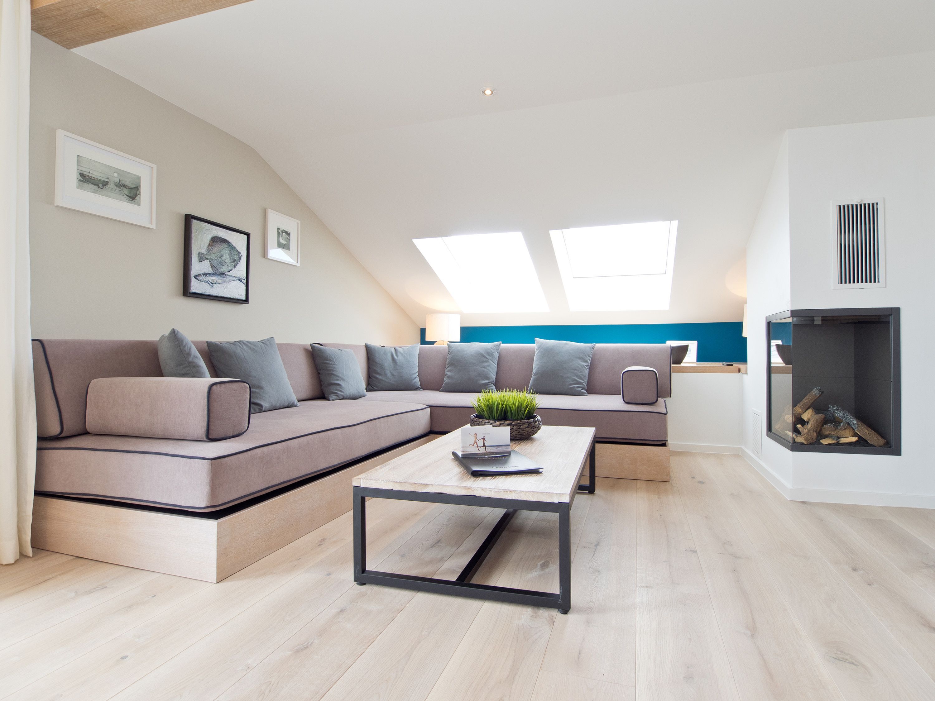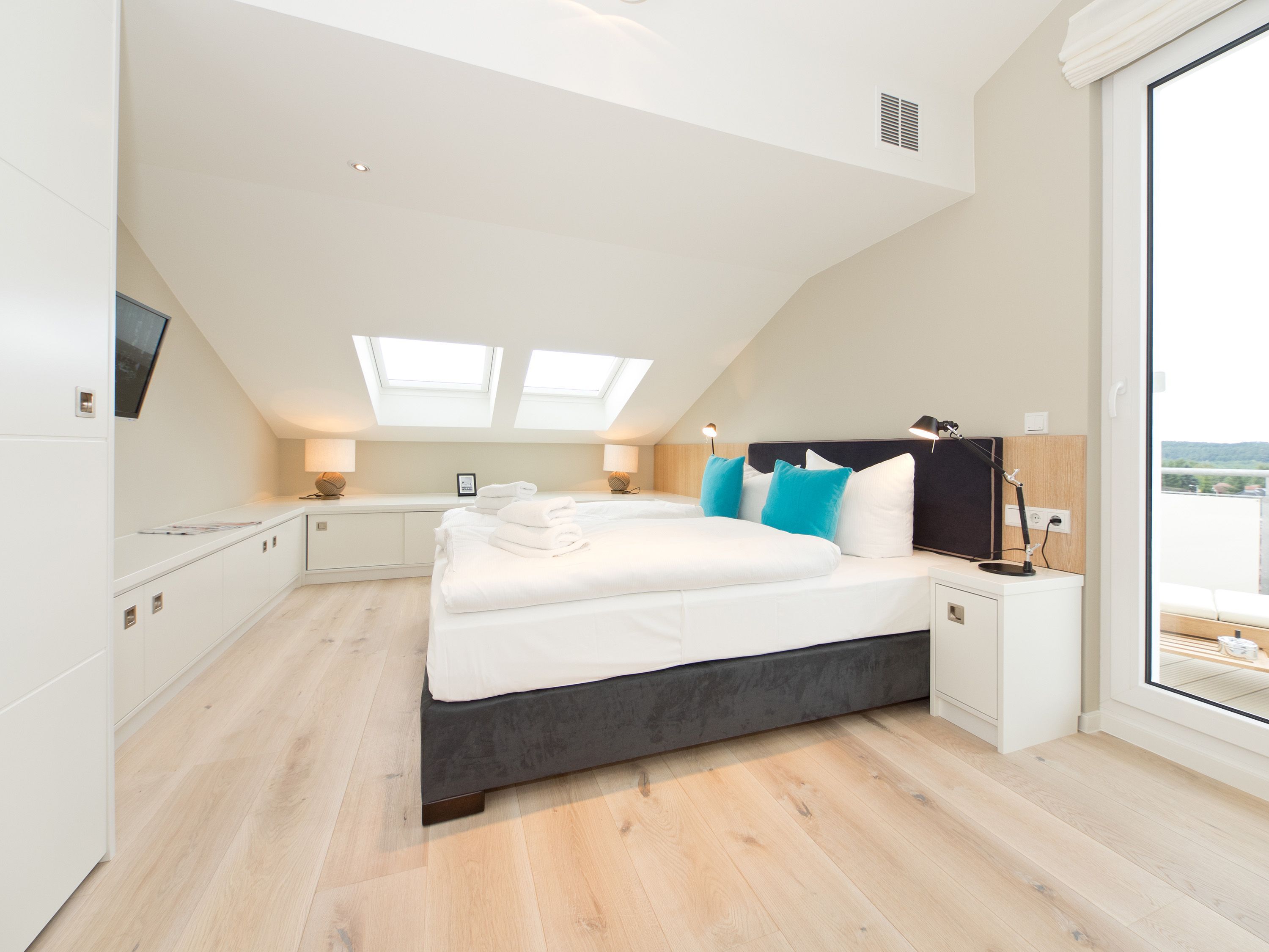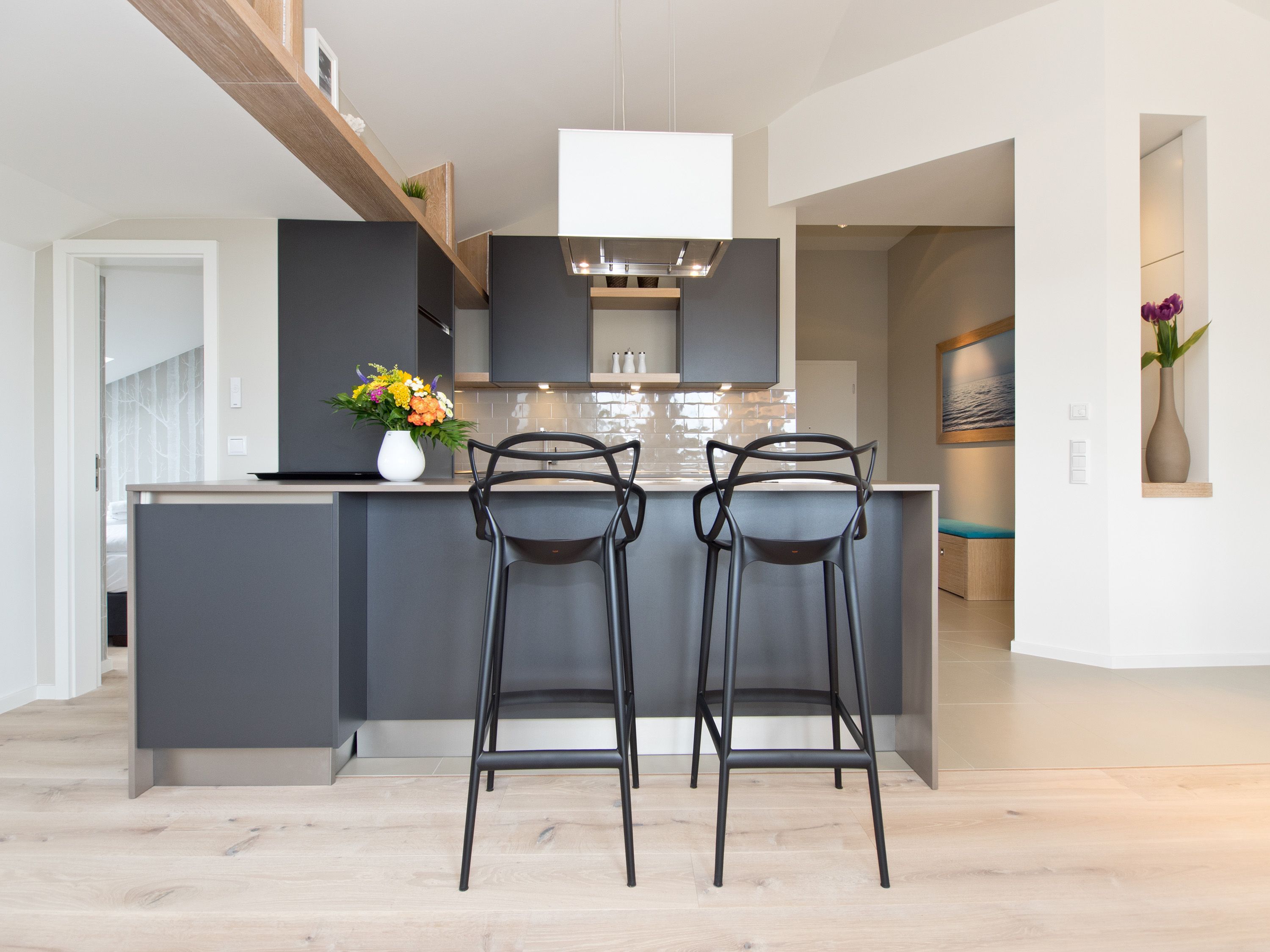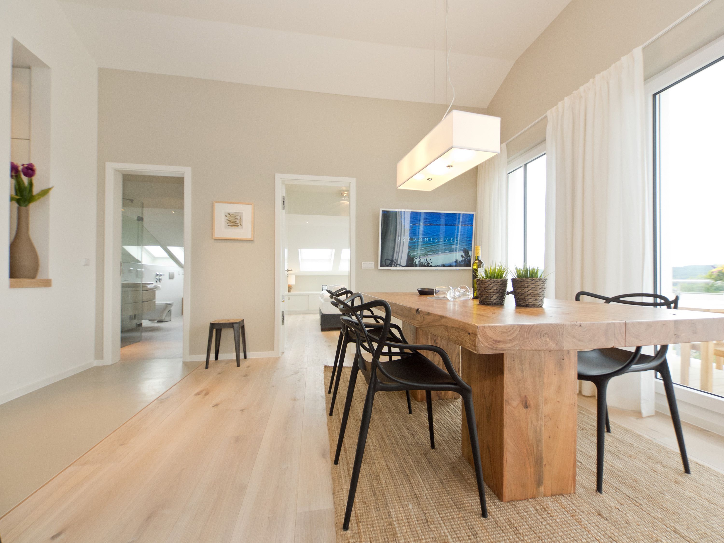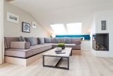 Eine Ferienwohnung zum Verlieben! Direkt unterm Dach des Südhauses im Dünenpalais empfängt Sie unser neues 2,5 Raum-Appartement (75 qm) für 2 Personen und ein Kind bis 14 Jahre. Wunderschönes Innenarchitekten-Design, stimmige Farben und Stoffe und hochwertige Einbauten, die jeden Raum perfektionieren, machen dieses Appartement so besonders. Die offen gestaltete Küche mit Tresen schließt sich an den Wohnbereich mit gemütlicher Sitzgruppe, Flat-TV und Design-Gaskamin (per Fernbedienung zu nutzen) an. Ergänzt wird dies durch den schönen Essplatz an der großzügigen Fensterfront. Von hier hat man Zugang zum sonnigen Südbalkon, der mit Gartenmöbeln und einem XL-Strandkorb ausgestattet ist und einen schönen Blick auf das Seebadhinterland bietet. Das Schlafzimmer mit Doppelboxspringbett (1,80m x 2,10m) und tollen Einbauten verspricht ruhige Stunden (hier kann auch ein Kinderbett aufgestellt werden). Ein kleines, schnuckliges Extrazimmer mit einem Einzelbett (0,80m x 2,00m) kann als Schlafgelegenheit für ein Kind genutzt werden. Für Ihren Komfort sind die Betten bei der Anreise bezogen und Handtücher liegen bereit. Ein Pkw-Stellplatz (whg.25) steht in der Tiefgarage zur Verfügung. Auf Wunsch stellen wir ein Kinderreisebett (ohne Matratze & Bettzeug) und einen Kinderhochstuhl gegen einen Aufpreis zur Verfügung. Das WLAN-Netz kann kostenfrei genutzt werden.