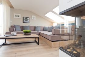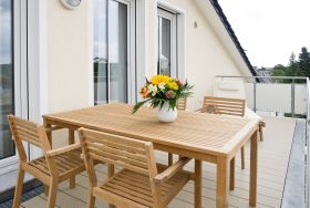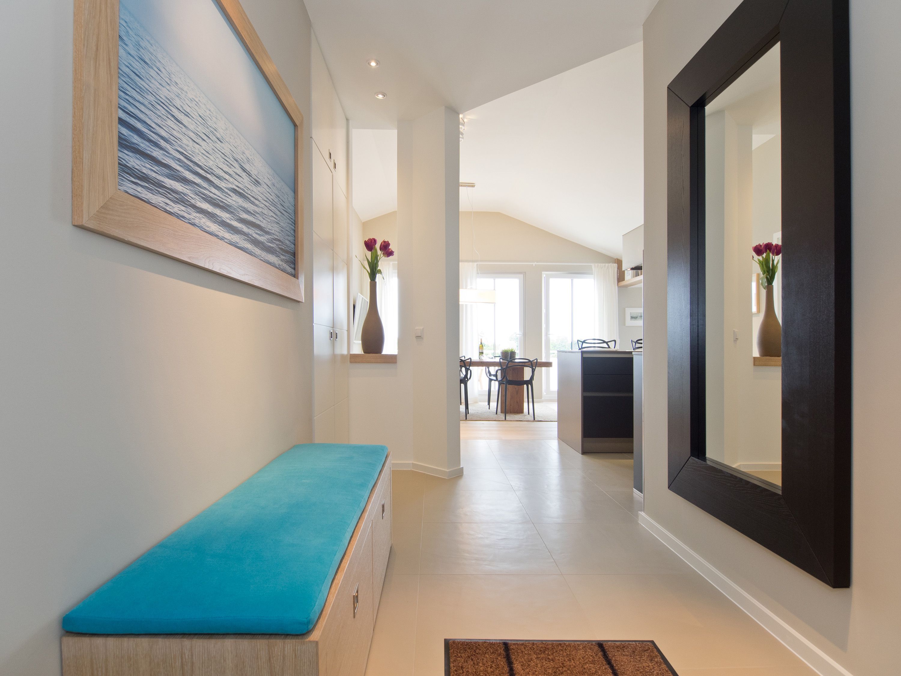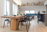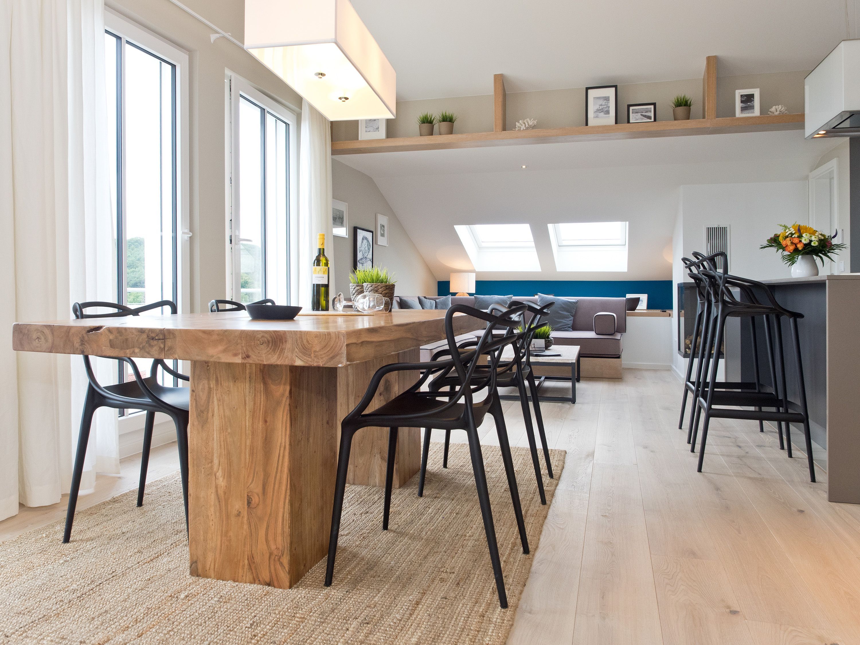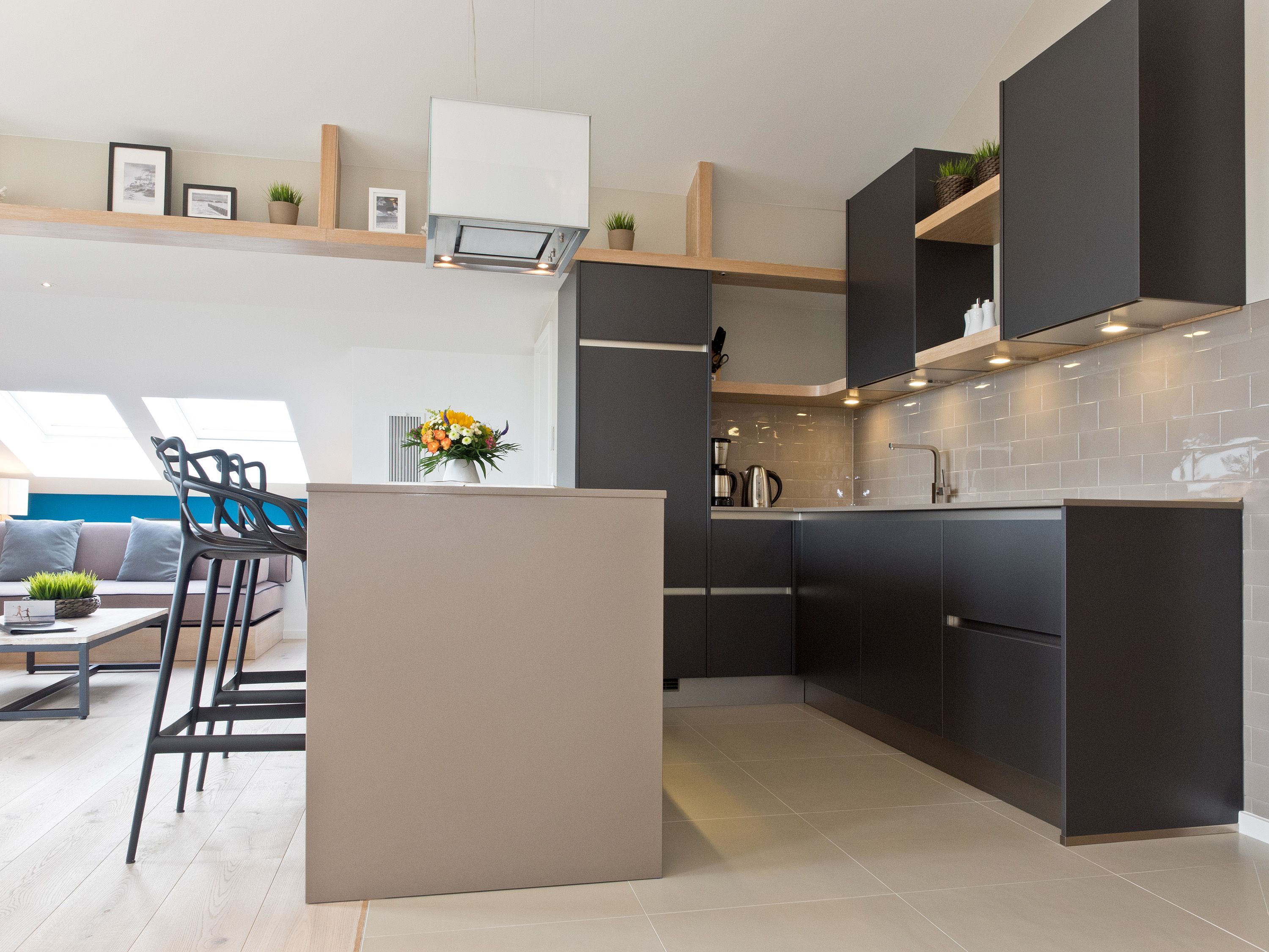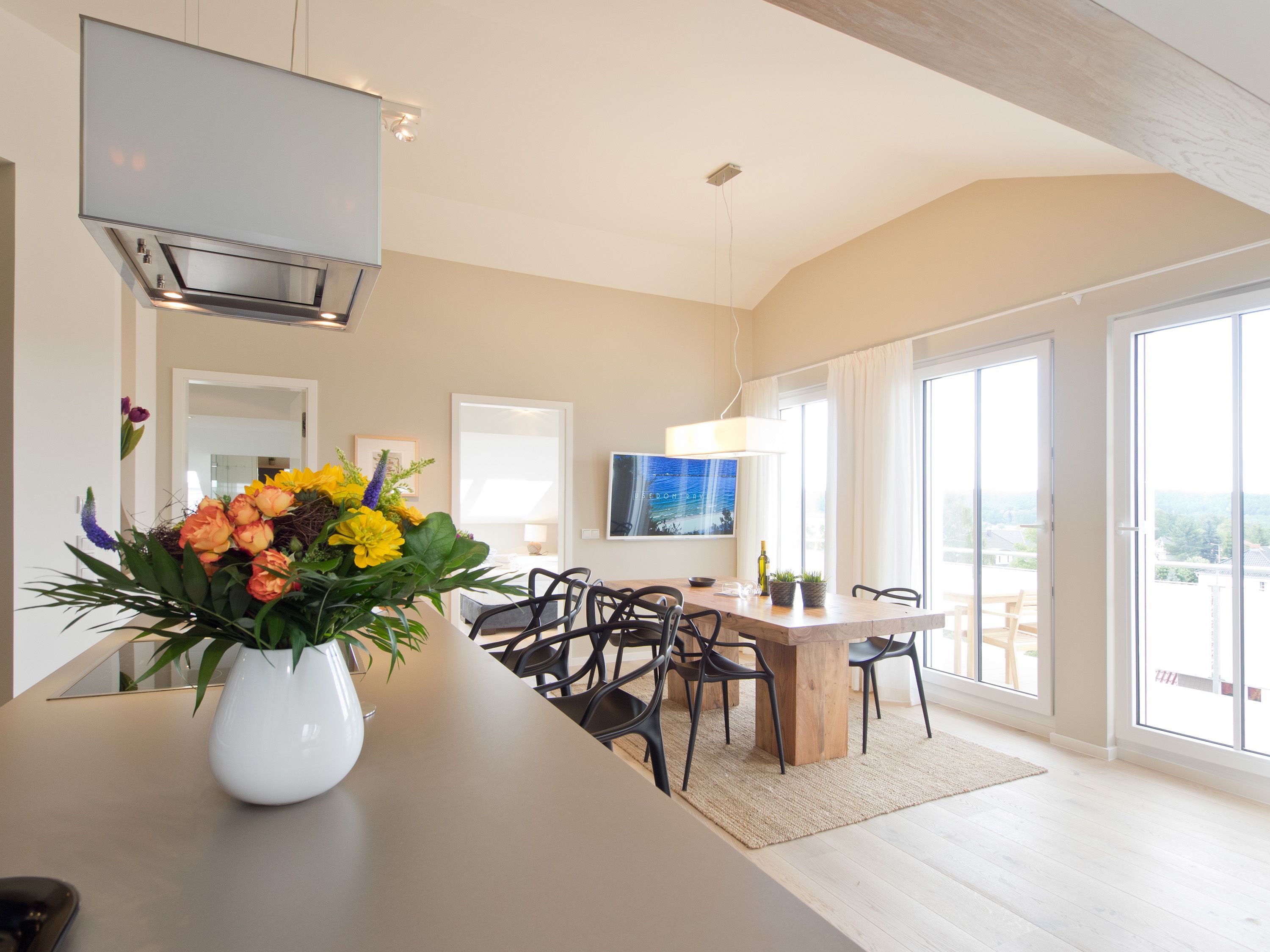 Eine Ferienwohnung zum Verlieben! Direkt unterm Dach des Südhauses im Dünenpalais empfängt Sie unser neues 2,5 Raum-Appartement (75 qm) für 2 Personen und ein Kind bis 14 Jahre. Wunderschönes Innenarchitekten-Design, stimmige Farben und Stoffe und hochwertige Einbauten, die jeden Raum perfektionieren, machen dieses Appartement so besonders. Die offen gestaltete Küche mit Tresen schließt sich an den Wohnbereich mit gemütlicher Sitzgruppe, Flat-TV und Design-Gaskamin (per Fernbedienung zu nutzen) an. Ergänzt wird dies durch den schönen Essplatz an der großzügigen Fensterfront. Von hier hat man Zugang zum sonnigen Südbalkon, der mit Gartenmöbeln und einem XL-Strandkorb ausgestattet ist und einen schönen Blick auf das Seebadhinterland bietet. Das Schlafzimmer mit Doppelboxspringbett (1,80m x 2,10m) und tollen Einbauten verspricht ruhige Stunden (hier kann auch ein Kinderbett aufgestellt werden). Ein kleines, schnuckliges Extrazimmer mit einem Einzelbett (0,80m x 2,00m) kann als Schlafgelegenheit für ein Kind genutzt werden. Für Ihren Komfort sind die Betten bei der Anreise bezogen und Handtücher liegen bereit. Ein Pkw-Stellplatz (whg.25) steht in der Tiefgarage zur Verfügung. Auf Wunsch stellen wir ein Kinderreisebett (ohne Matratze & Bettzeug) und einen Kinderhochstuhl gegen einen Aufpreis zur Verfügung. Das WLAN-Netz kann kostenfrei genutzt werden.