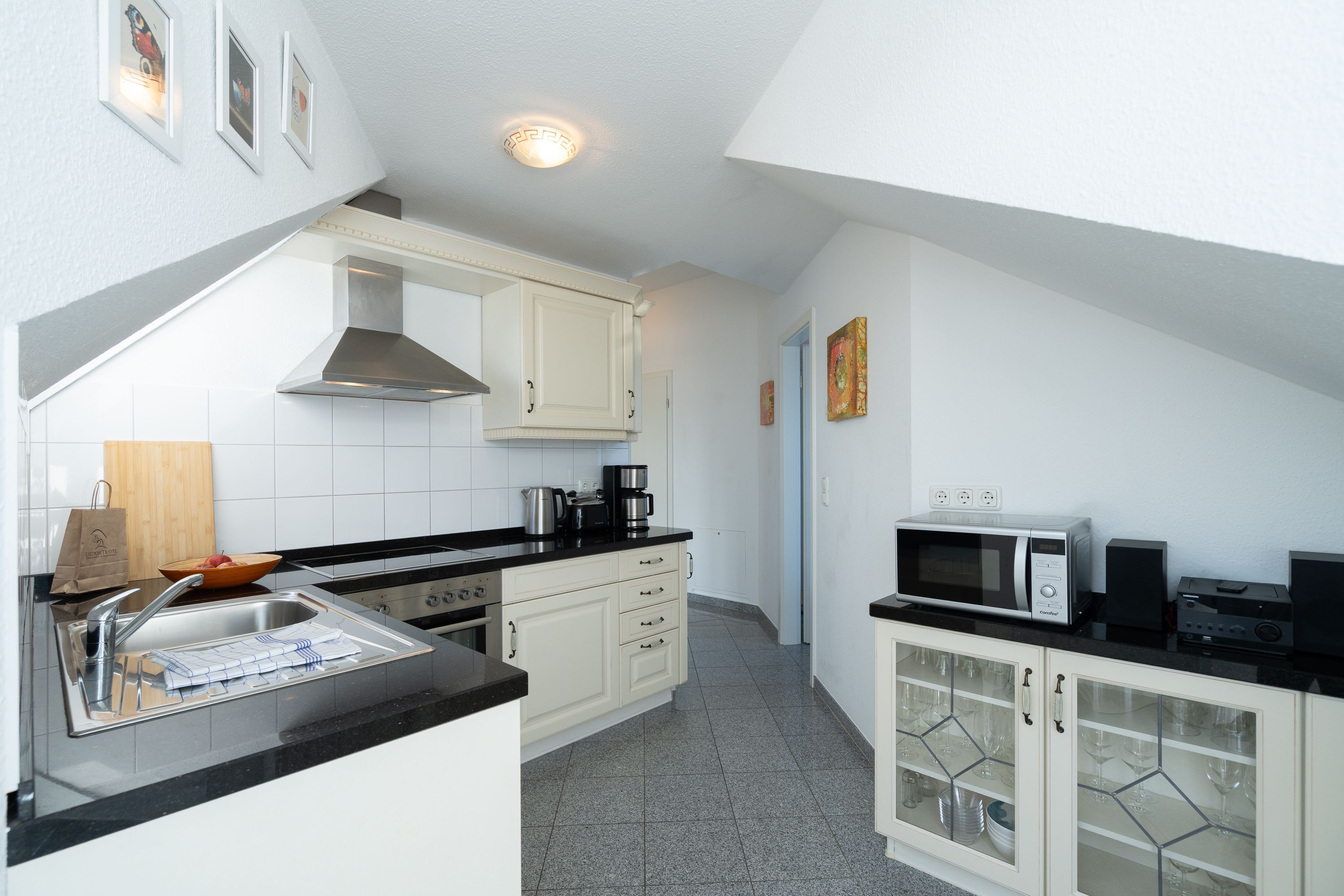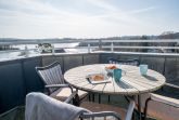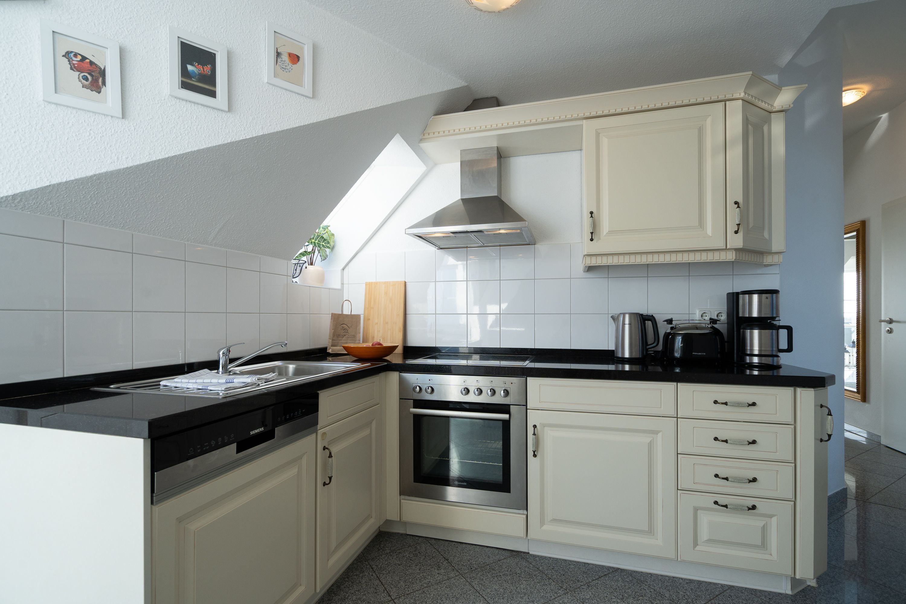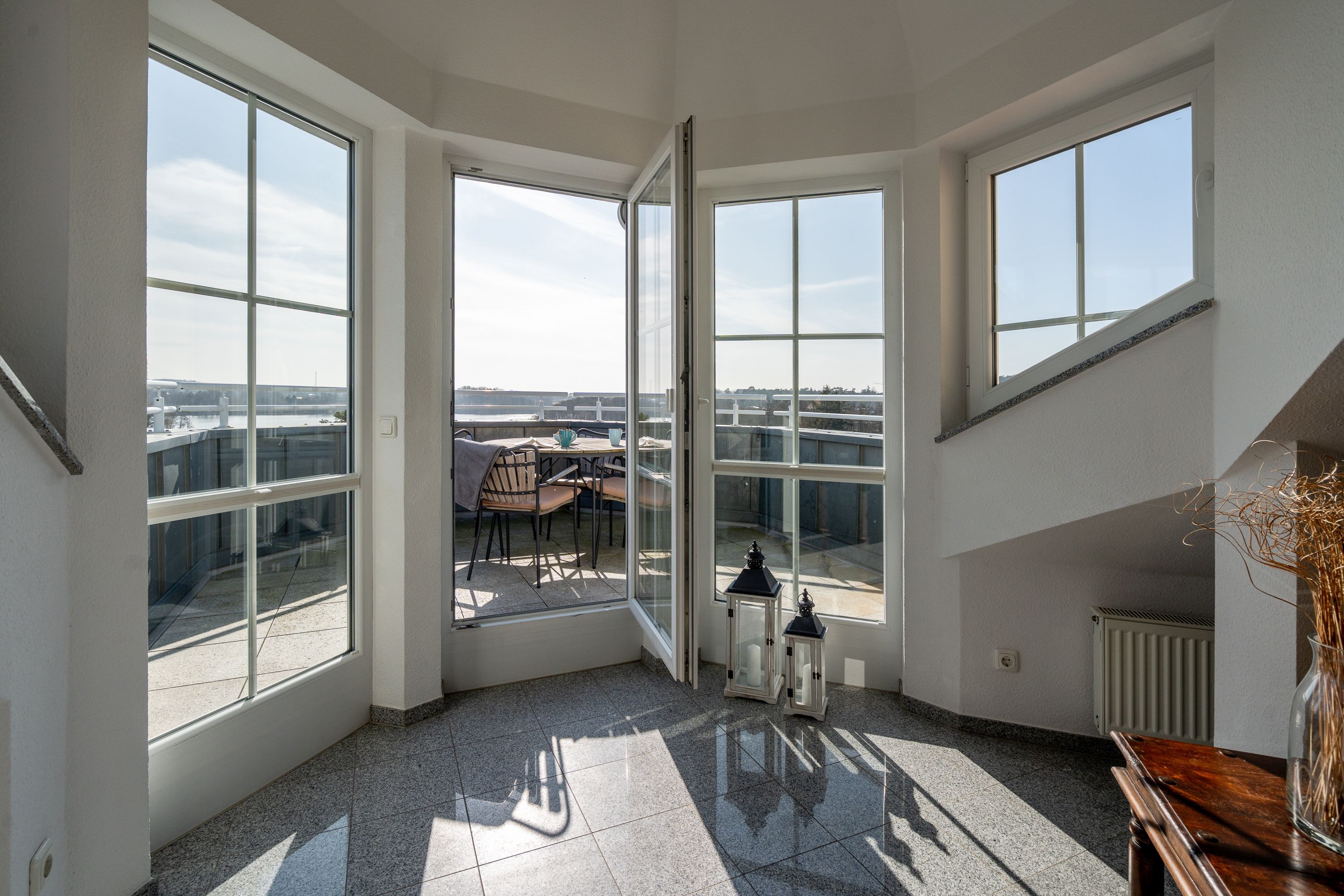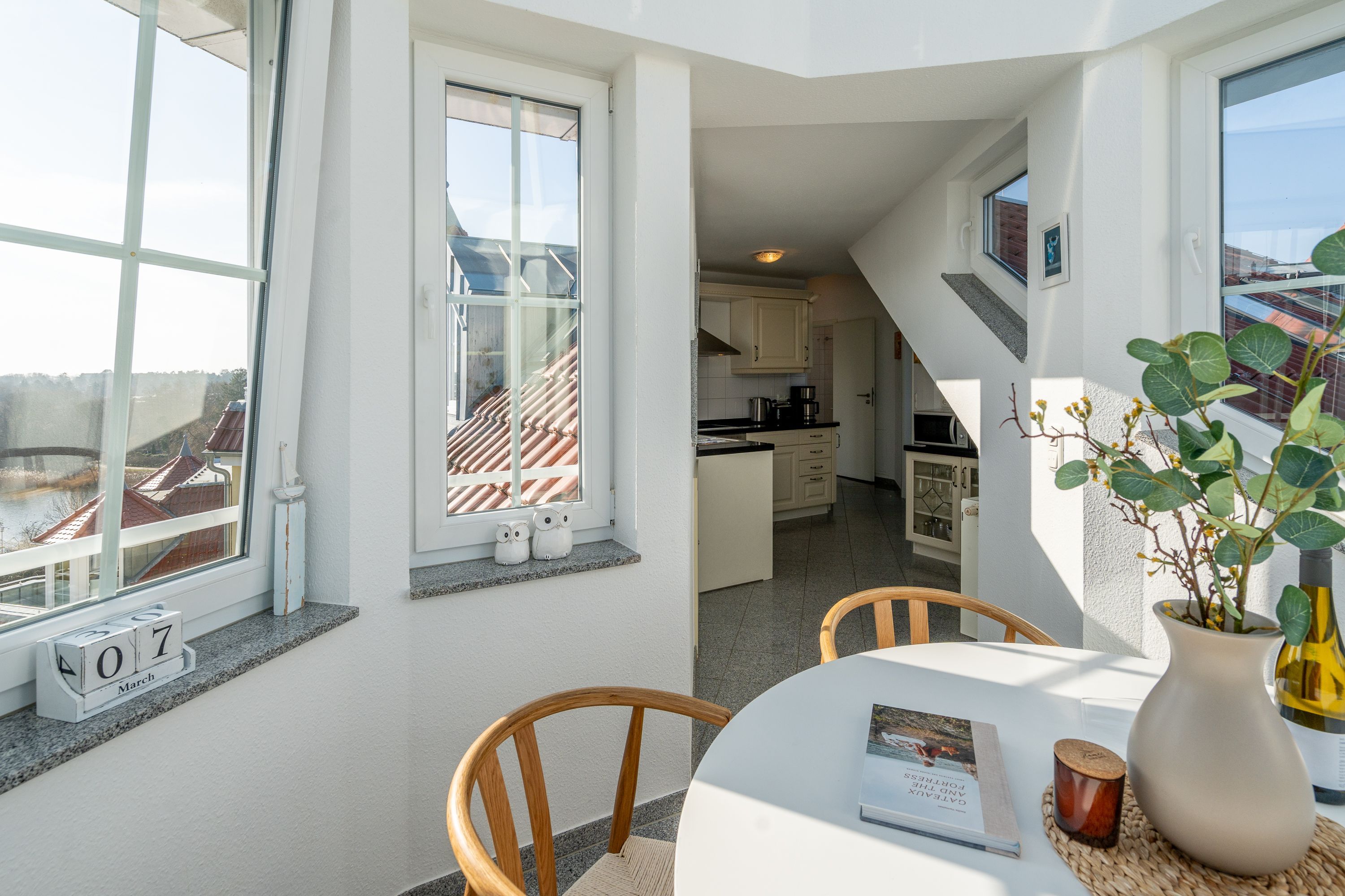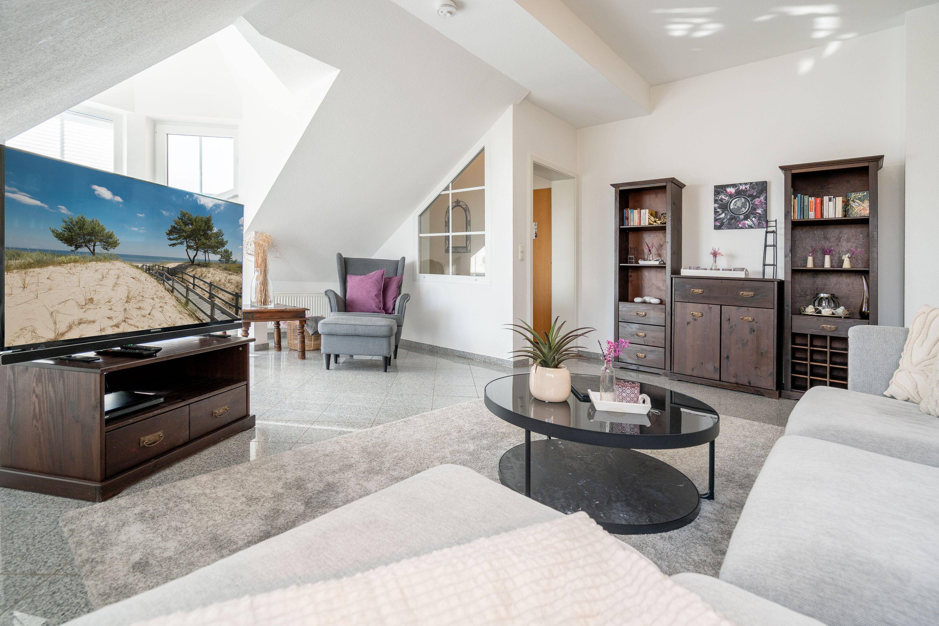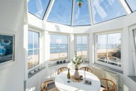 Genießen Sie den einzigartigen Ausblick auf das Meer aus unserer stilvoll und modern eingerichteten 3-Raum-Ferienwohnung in der Dünenresidenz. Die 75 m² große Dachgeschosswohnung bietet höchsten Komfort und ist bequem mit dem Aufzug erreichbar. Zwei gemütliche Schlafzimmer mit Doppelbetten ( Boxspringbett 1,60m x 2,00m / Doppelbett 1,80m x 2,00m), ein modernes Duschbad sowie eine voll ausgestattete Küche lassen keine Wünsche offen. Der lichtdurchflutete Essbereich im Glasturm schafft eine besondere Atmosphäre – hier speisen Sie mit direktem Blick auf die Wellen. Der großzügige Wohnbereich öffnet sich zu einem Balkon, von dem aus Sie den Blick auf den Schloonsee und auch das Rauschen des Meeres genießen können. Die Wohnung bietet Platz für bis zu 4 Personen sowie ein Kleinkind bis 3 Jahre im Kinderreisebett. Auf Wunsch stellen wir Ihnen gern ein Kinderreisebett (ohne zusätzliche Matratze & Bettzeug) sowie einen Kinderhochstuhl (gegen Aufpreis) zur Verfügung. Für Ihren PKW steht Ihnen ein fester Stellplatz in der Tiefgarage zur Verfügung. Erleben Sie Erholung pur mit grandiosem Meerblick – ein erholsamer Aufenthalt erwartet Sie!