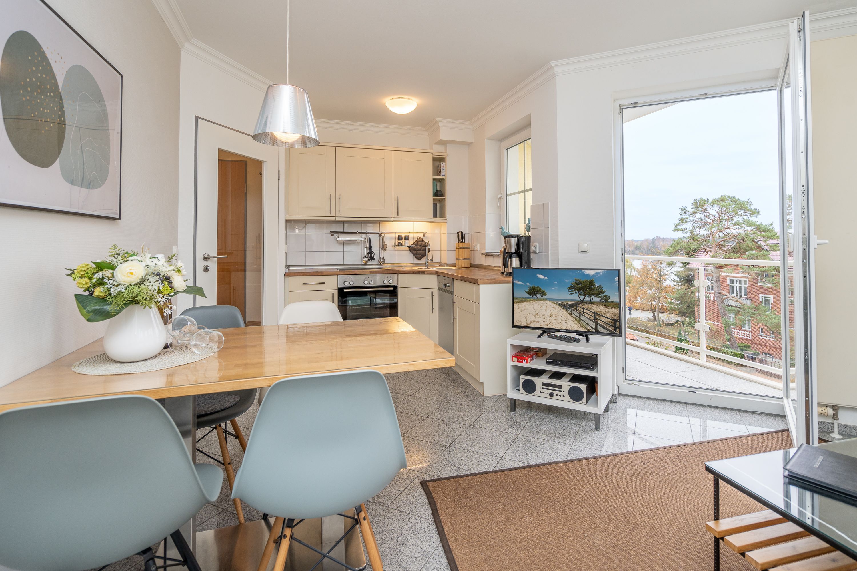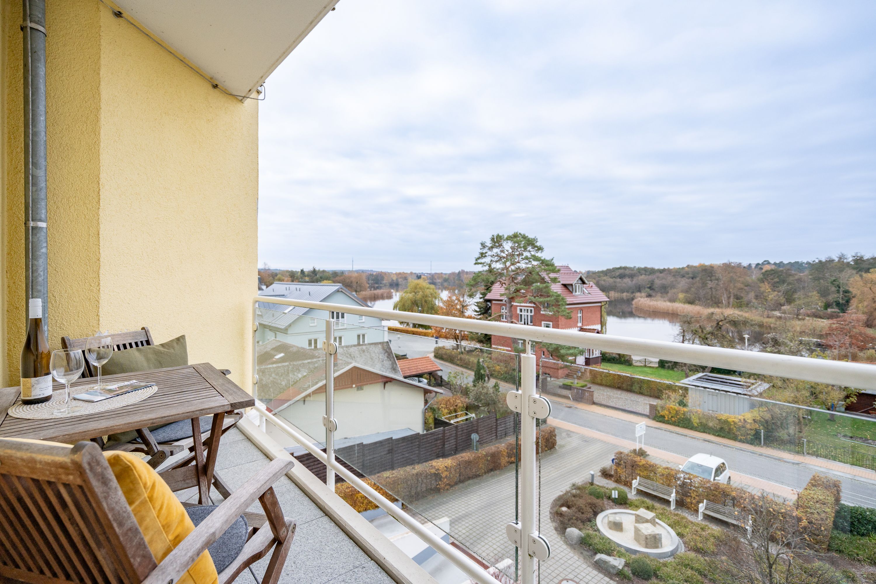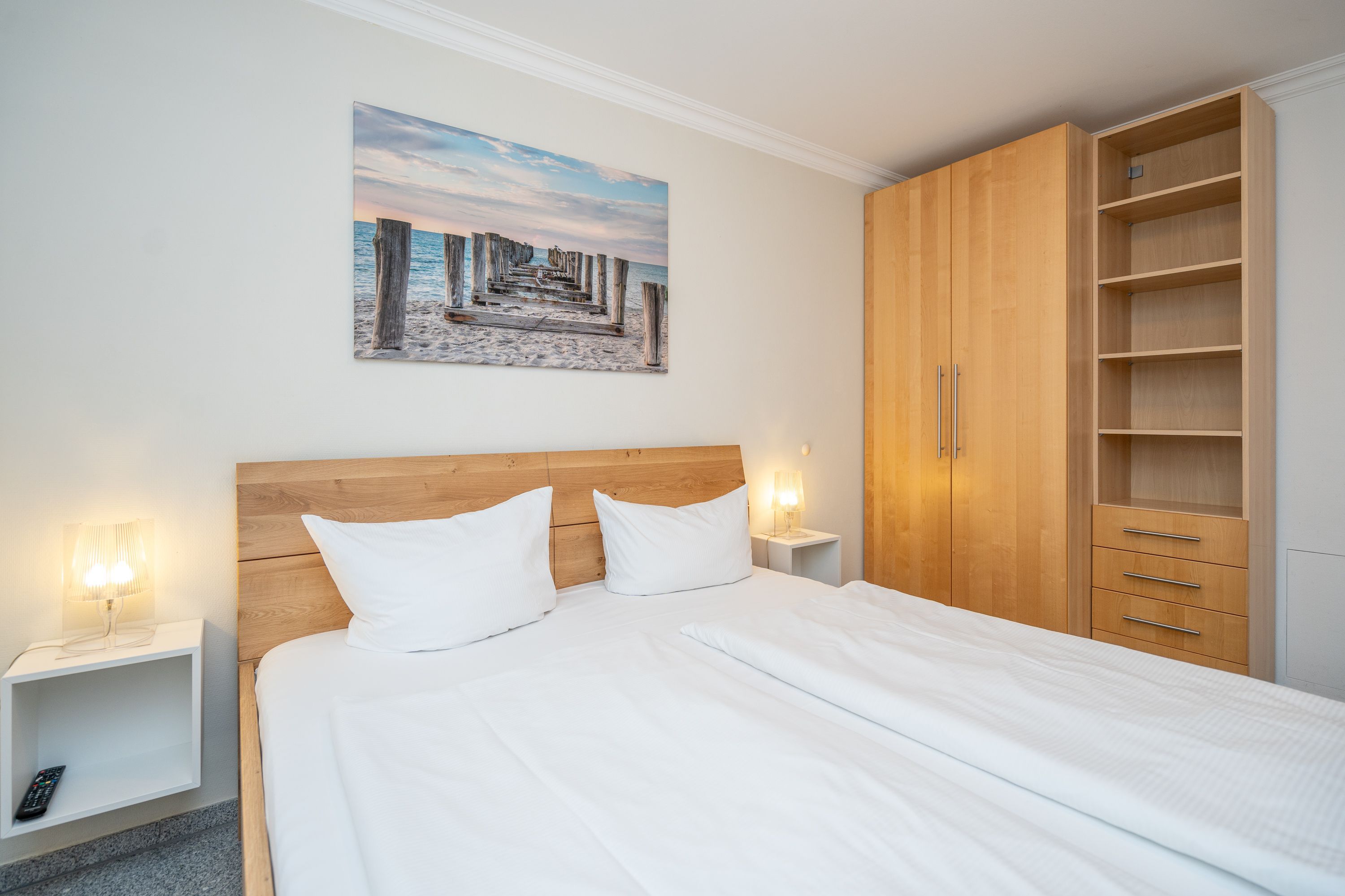 Die Ferienwohnung B11 lädt Sie ein, entspannte Urlaubstage zu verbringen (für max. 4 Personen). Geschmackvoll eingerichtet, lässt die komfortable Ausstattung keine Wünsche offen. Im 2. Obergeschoss gelegen, bietet Ihnen das Appartement ein Wohnzimmer, eine komplett ausgestattete Küchenzeile (Ceranfeld, Geschirrspüler, Backofen), zwei Schlafzimmer mit Doppelbetten, ein Duschbad und ein Gäste-WC. Zwei Balkone verfügen über einen schönen Blick auf die Ostsee und auf den idyllischen Schloonsee. Für Ihren Komfort sind die Betten bei Ihrer Anreise bezogen und die Handtücher (Erstausstattung) liegen bereit.
