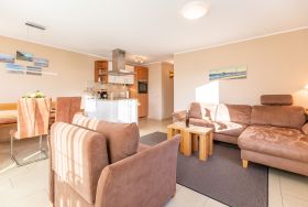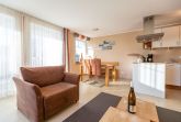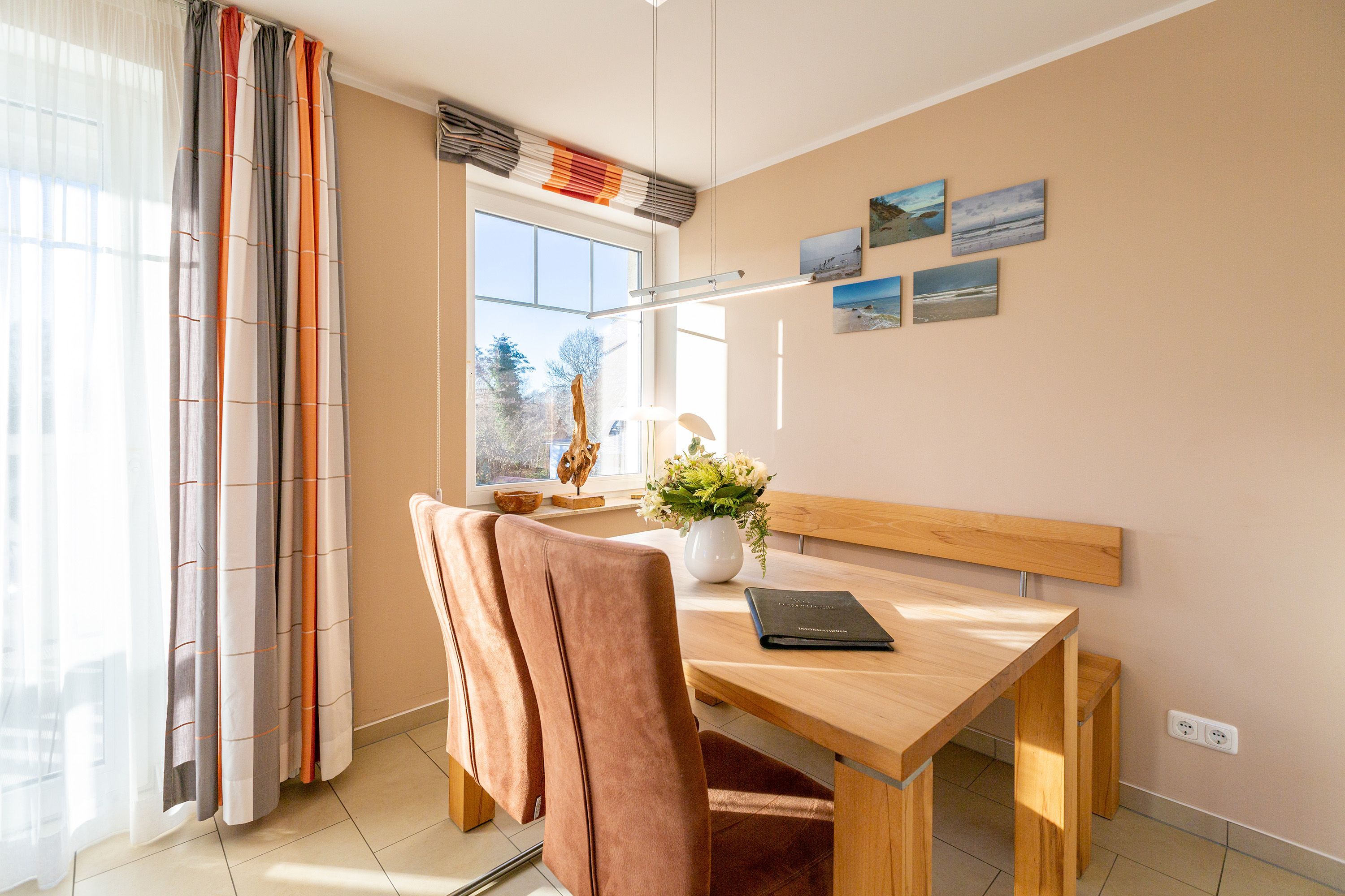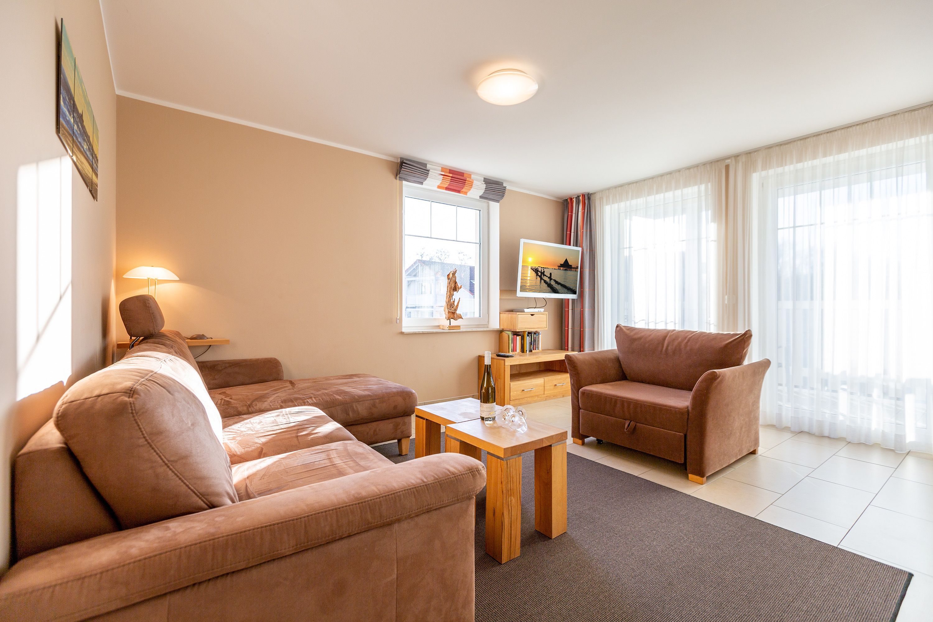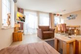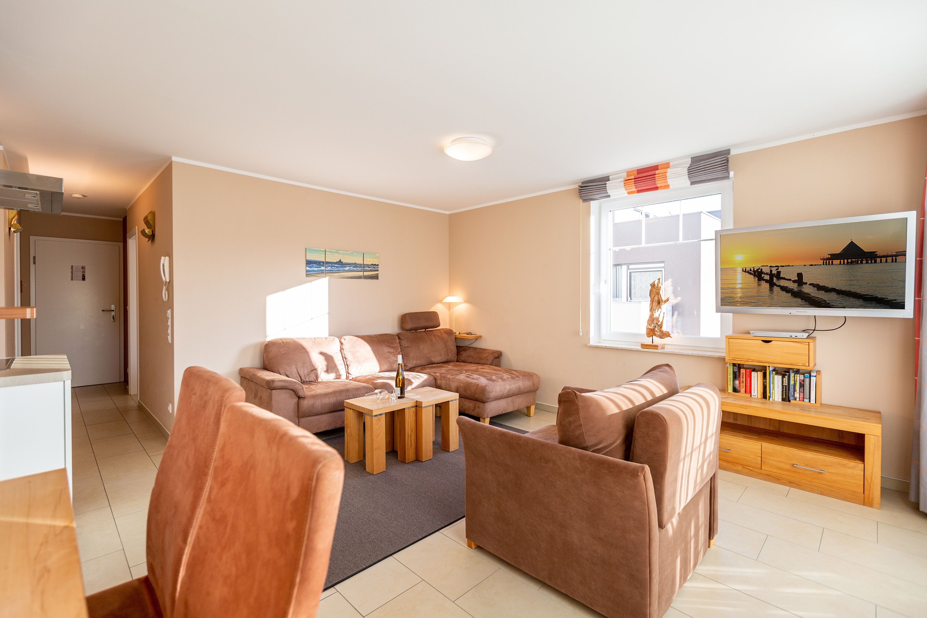 Kuschelig, gemütlich und absolut strandnah ist dieses kleine Urlaubsparadies. Auf seinen 46 Quadratmetern empfängt es Ostseeliebhaber und Auszeithungrige mit viel Komfort. Bis zu 2 Personen und ein Kleinkind bis drei Jahre haben in den zwei Zimmern im 1. Stock des Dünendomizils Platz. Ein Kinderreisebett kann bereit gestellt werden; Matratze und Bettzeug dafür müssen jedoch selbst mitgebracht werden. Der Wohnbereich ist hell und wunderbar sonnenverwöhnt. Eine schöne, große Wohnlandschaft wird zur idealen Relaxing Area mit Blick auf den großen Flat-TV oder hinaus auf den Balkon. Genießen Sie von hier aus mit einem eisgekühlten Getränk den Sonnenuntergang in all seinen romantischen Farben. Das Wohnzimmer geht nahtlos in einen großzügigen Essbereich mit Echtholztisch und offener Küche über. Mit allen Geräten hochwertig ausgestattet lässt sie keine Kochwünsche offen. Ein Kinderhochstuhl kann zur Verfügung gestellt werden (gegen Aufpreis). Müden Strandburgenbauern und Sonnenanbetern zaubert das Schlafzimmer mit seinem bequemen Doppelbett erholsame Träume. Das Bad verfügt über eine Dusche und WC. Für eine rundum entspannte Auszeit sind die Betten bereits bezogen und Handtücher liegen bereit. Das WLAN-Netz ist kostenfrei nutzbar. Zu der Wohnung gehört ein Pkw-Stellplatz in der Tiefgarage.