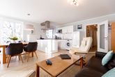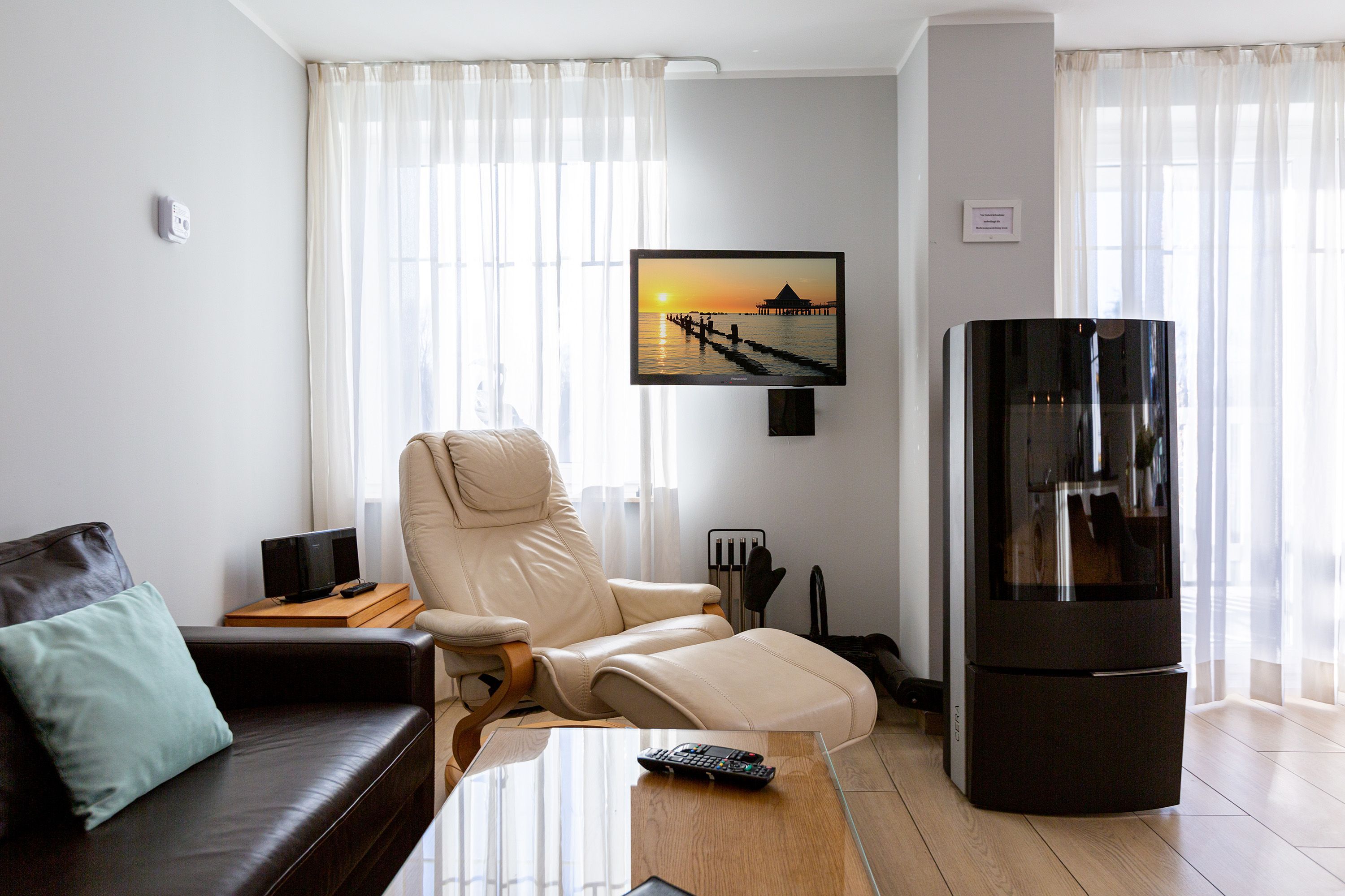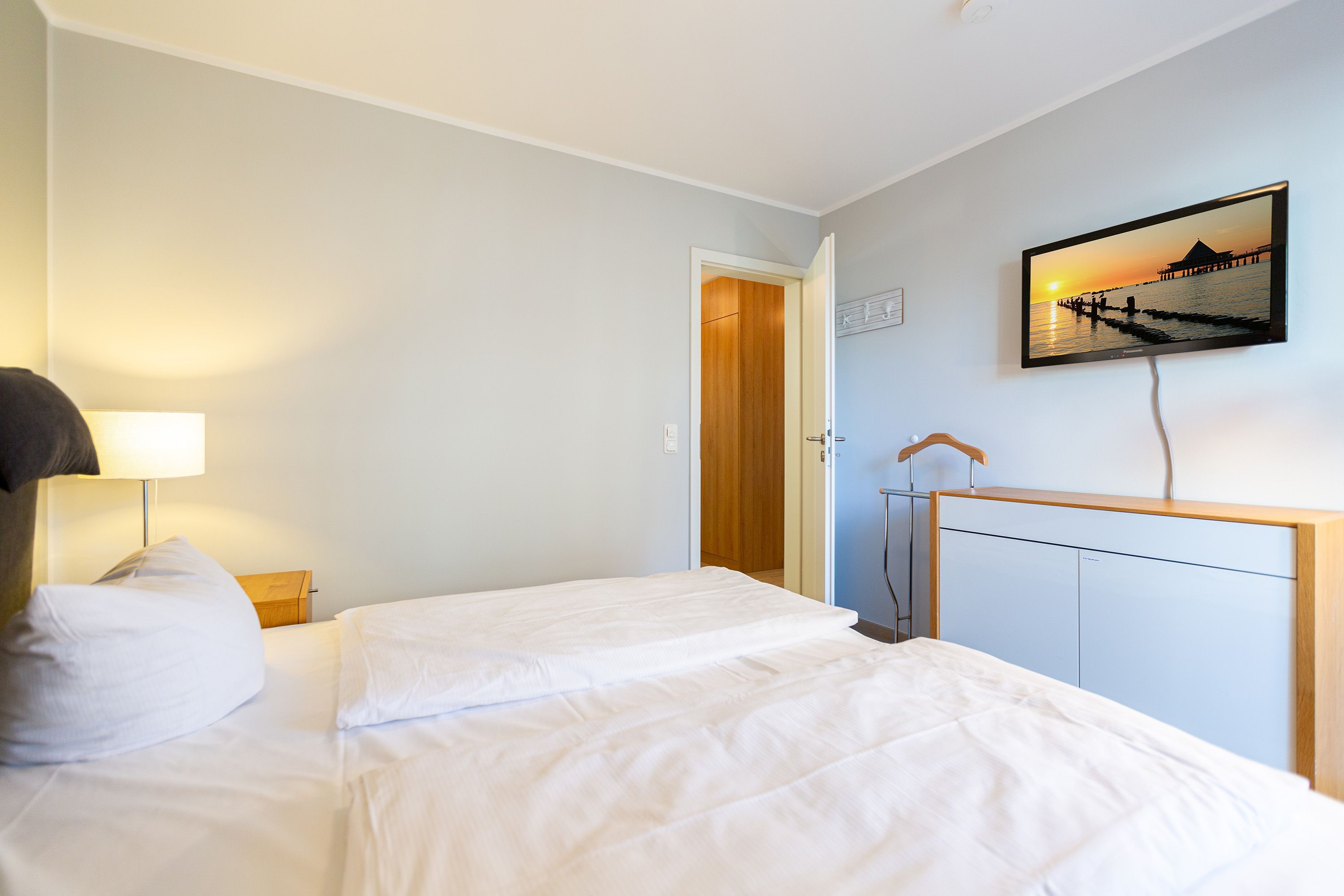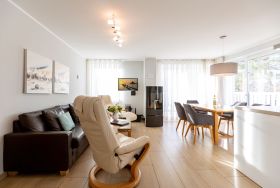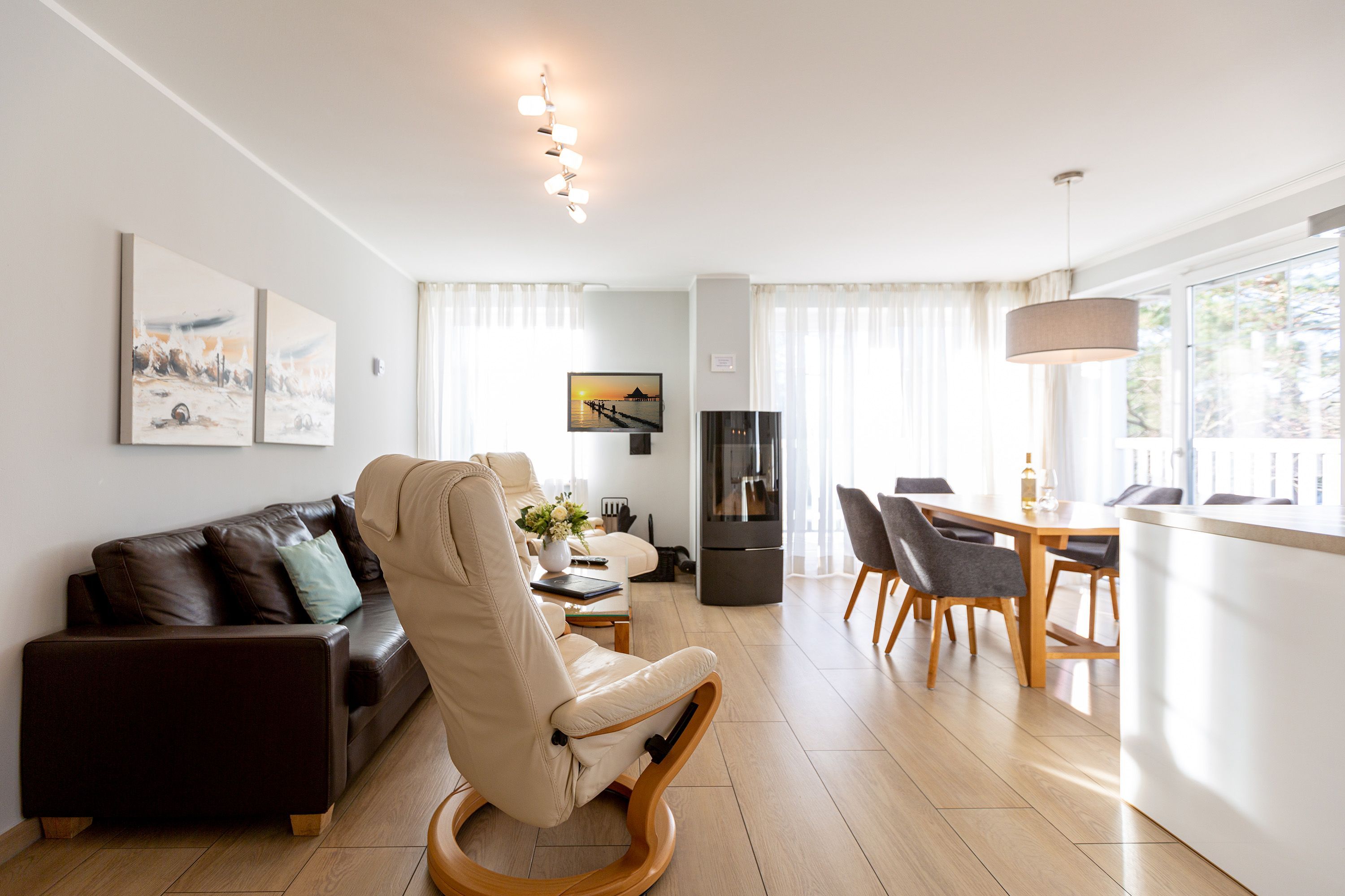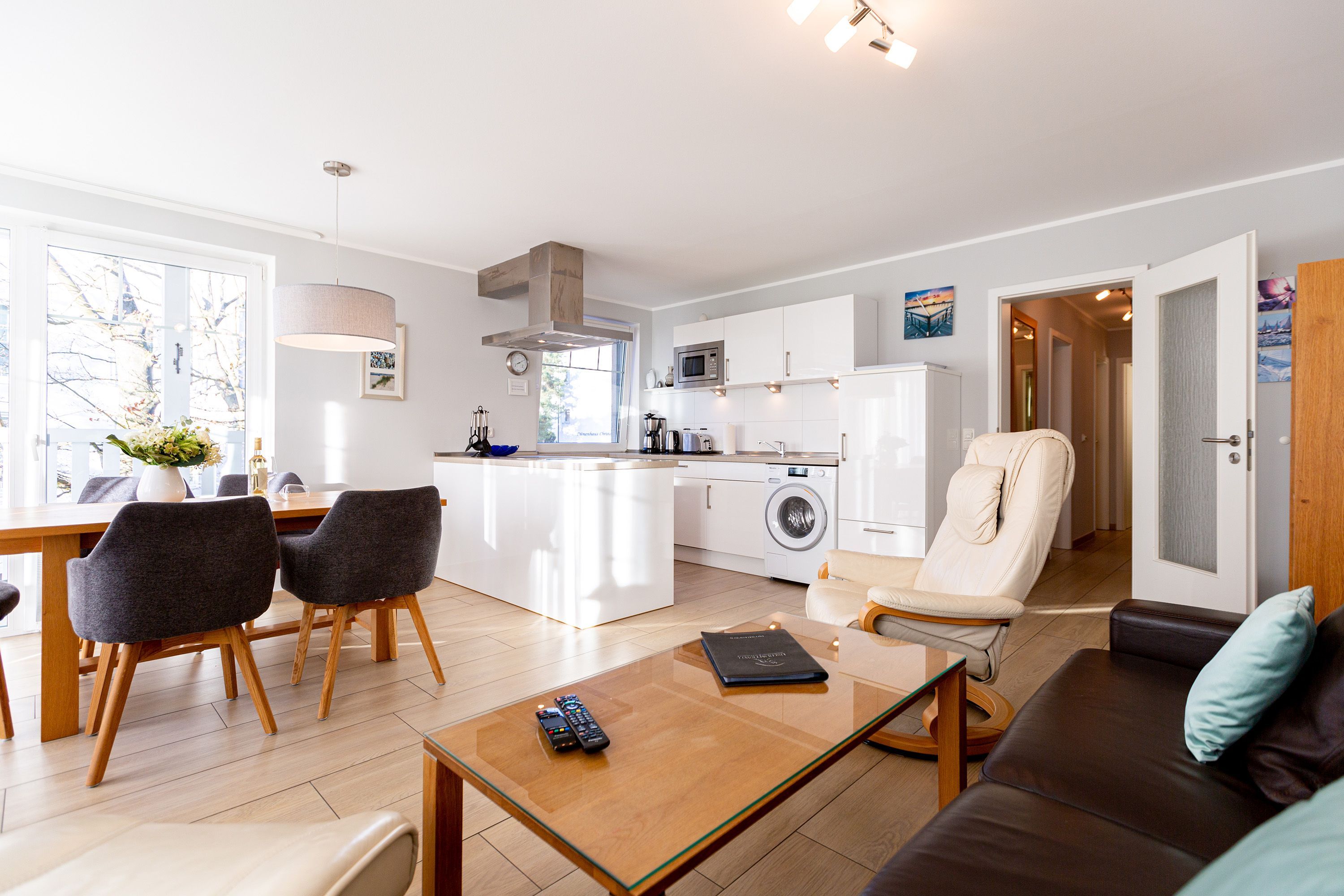 Die Ferienwohnung 5 im Dünendomizil ist einfach schön! Stilsicher und exklusiv von einer Innenarchitektin gestaltet, liegt es im 1. Obergeschoss des Hauses. Es erwarten Sie 3 Räume (Buchbar für 4 Personen), aufgeteilt auf ein Wohnzimmer mit gemütlicher Sitzgruppe und Kaminofen, ergänzt durch eine komplett ausgestattete Küchenzeile und den Essbereich. Durch seine 2 Schlafzimmern mit Doppelbetten (1x mit TV) und 2 Bäder mit Dusche und WC eignet sich dieses Appartement besonders für Familien oder befreundete Pärchen. Der großzügige Südwestbalkon und ein zweiter Westbalkon bieten auch außen genug Platz zum Wohlfühlen. Ein Pkw-Stellplatz (mit Wallbox zum Laden von E-Autos, kostenpflichtig) steht in der Tiefgarage zur Verfügung. Auch ein separater Abstellraum für Fahrräder kann genutzt werden. Für Ihren Komfort sind die Betten bei der Anreise bezogen und Handtücher liegen bereit. Das WLAN-Netz ist kostenfrei nutzbar. Für den Tag am Meer steht Ihnen als besonderes Bonbon von Mitte Mai bis Ende September (je nach Witterung) ein Strandkorb am Strand kostenlos zur Verfügung.