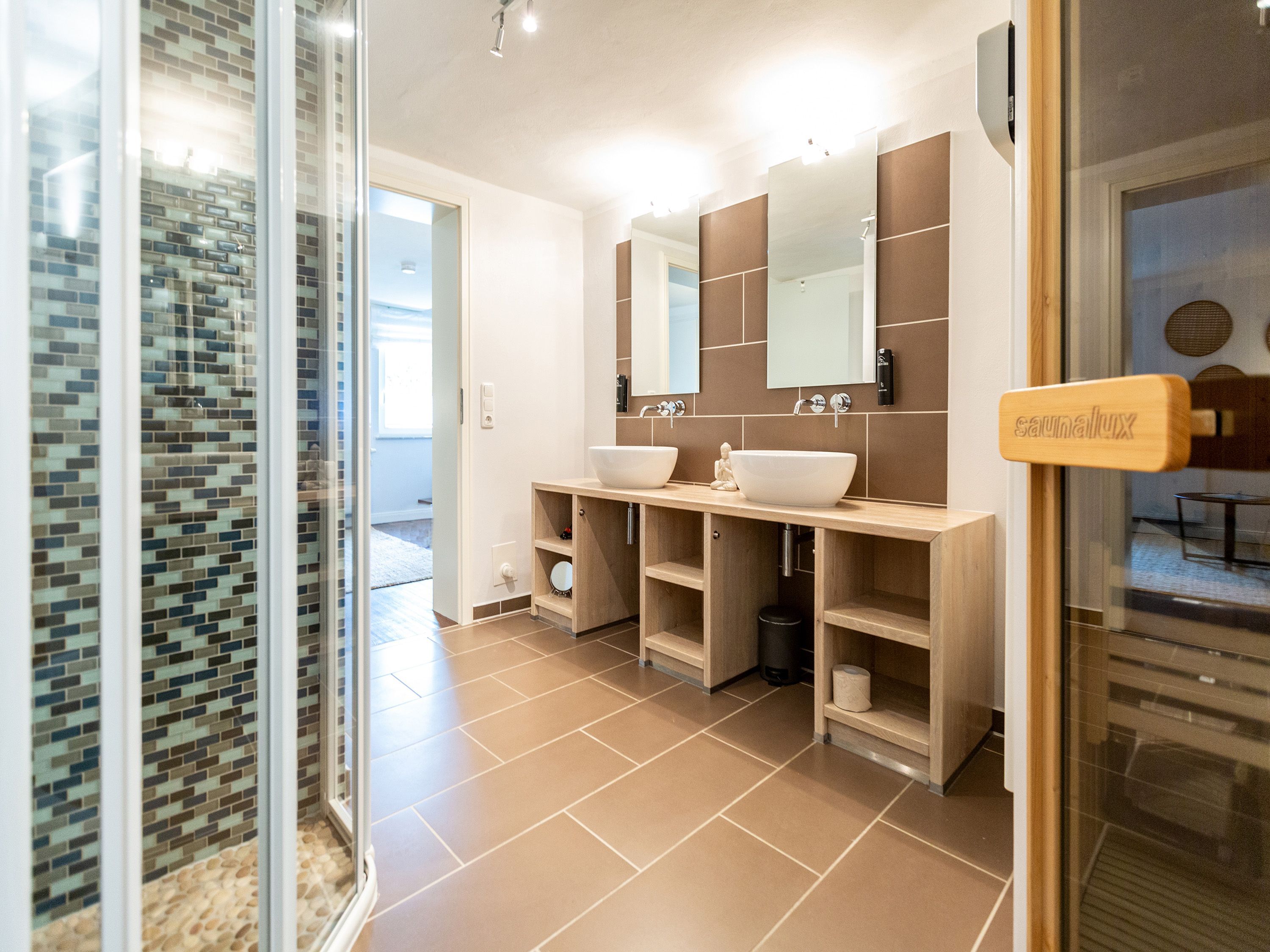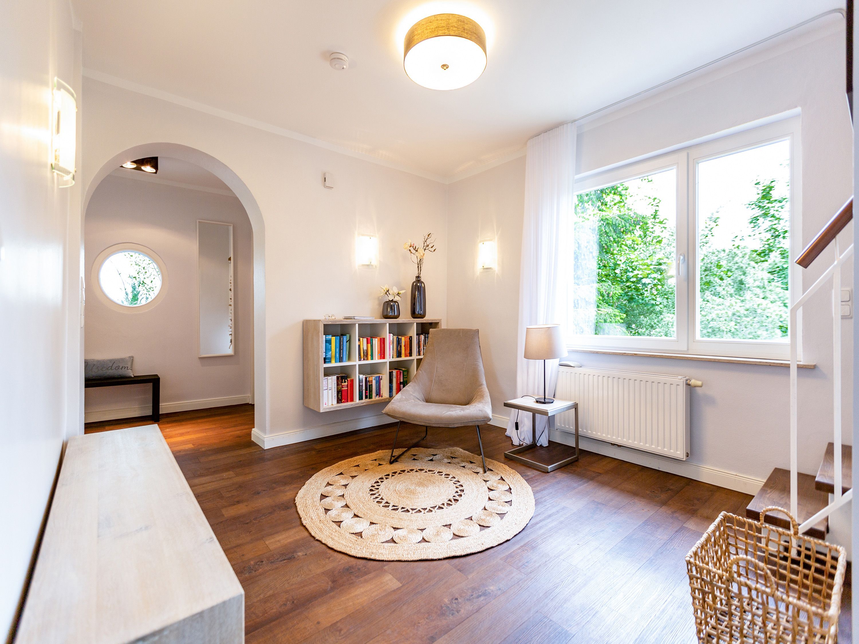 Eintreten und sofort wohlfühlen! Zentral gelegen, aber dennoch ruhig, bietet dieses Ferienhaus auf 170?m² modernen Wohnkomfort auf drei Ebenen. Stilvoll eingerichtet und mit viel Liebe zum Detail dekoriert, eignet es sich ideal für Paare, Familien oder Freunde (bis zu 8 Personen und 1 Kleinkind bis 2 Jahre). Im Erdgeschoss erwarten Sie der gemütliche Wohnbereich mit Kamin, eine sehr gut ausgestattete Küche, ein Esszimmer und eine Leseecke. Von der angrenzenden Südterrasse können Sie entspannte Stunden bis in den Abend genießen. Vier Schlafzimmer mit hochwertigen Boxspringbetten (drei 1,80?m x 2,00?m, eines 1,60?m x 2,00?m), zwei Bäder mit Dusche und Badewanne sowie ein Gäste-WC sorgen für großzügigen Komfort. Ein besonderes Highlight ist der Saunabereich mit Relaxzone im Untergeschoss, von dem Sie direkten Zugang zum Garten haben – perfekt für ruhige Stunden im Grünen. Für Ihren Komfort ist die Bettwäsche bereits bezogen und Handtücher liegen bereit. Babyreisebett und Hochstuhl können auf Wunsch bestellt werden.