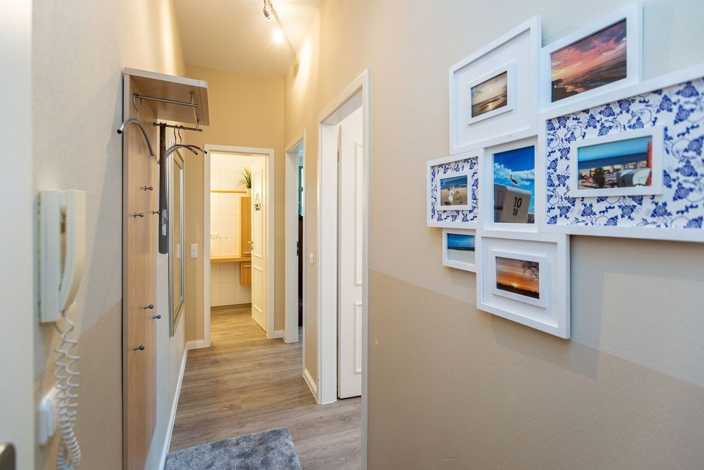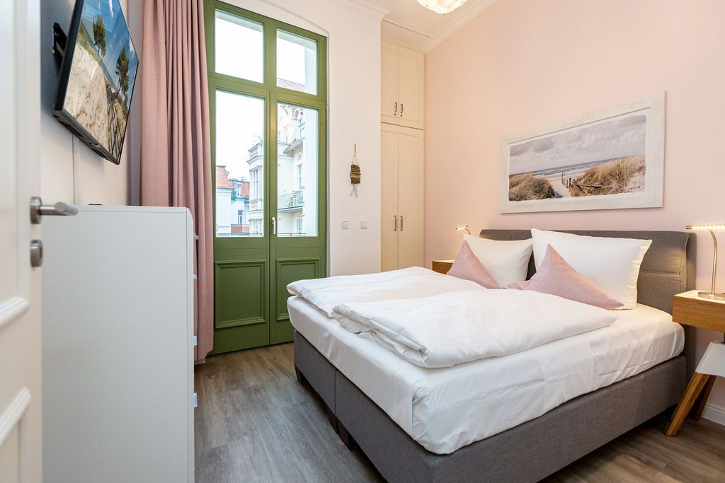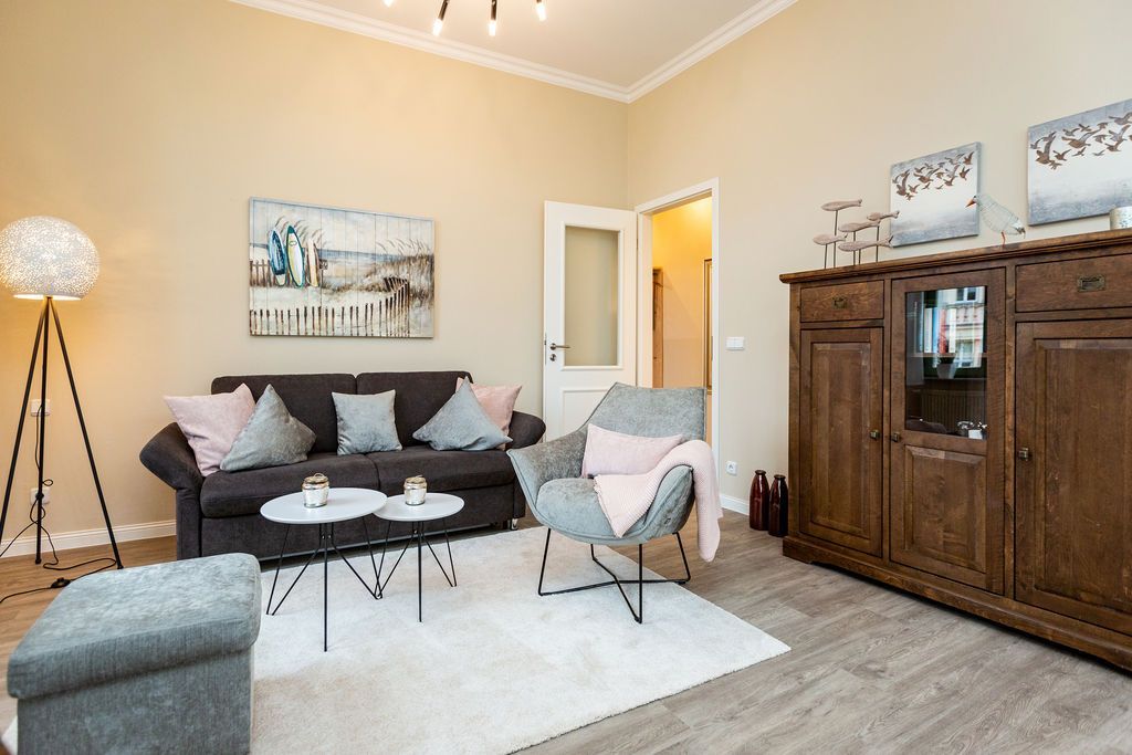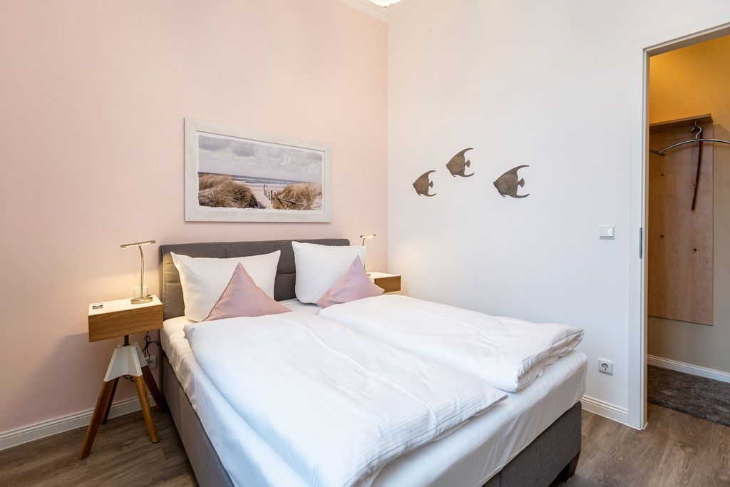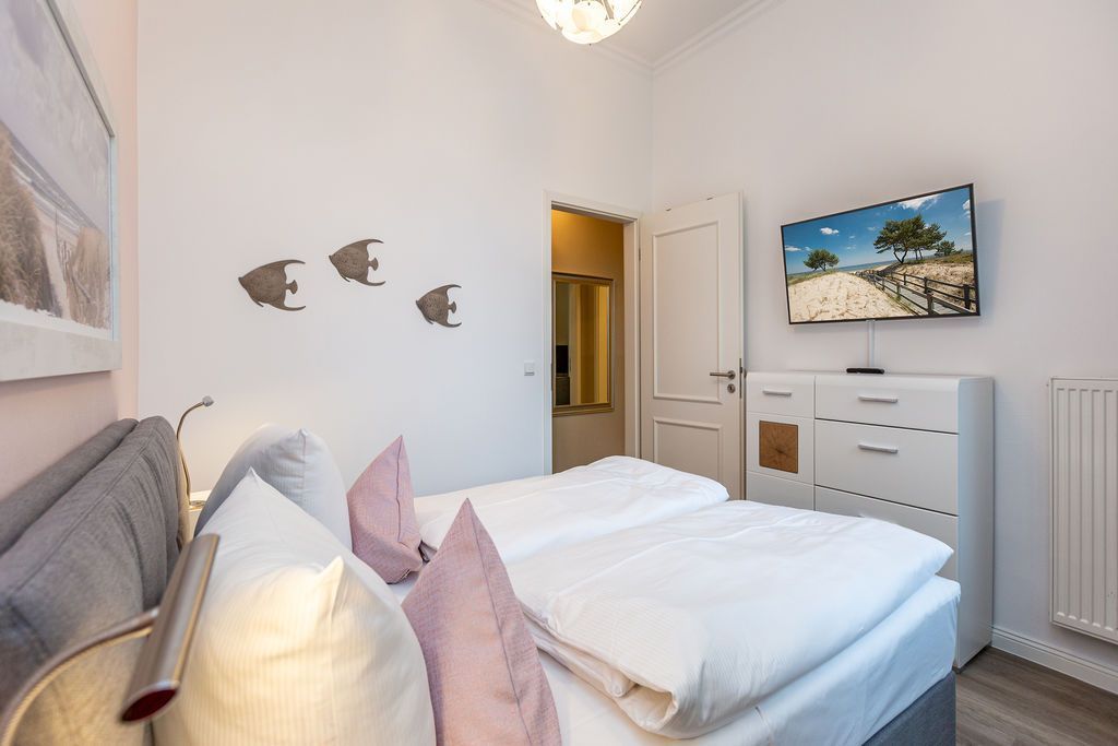 Die exklusive Ferienwohnung im 1. Obergeschoss des Hauses ist 60 qm groß und bietet zwei Personen Platz zum Wohlfühlen und Entspannen. Die moderne und stilvolle Einrichtung lassen keine Wünsche offen. Das Appartement verfügt über ein Wohnzimmer (mit seitlichem Meerblick) mit gemütlicher Sitzgruppe & Flat-TV, eine vollständig ausgestattete Küche (Ceranfeld, Geschirrspüler, Mikrowelle), ein Schlafzimmer mit Doppelbett und ein Duschbad. Auf den 2 Balkonen können Sie den Blick auf die Seestraße genießen.