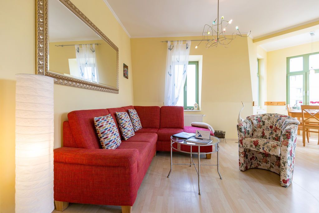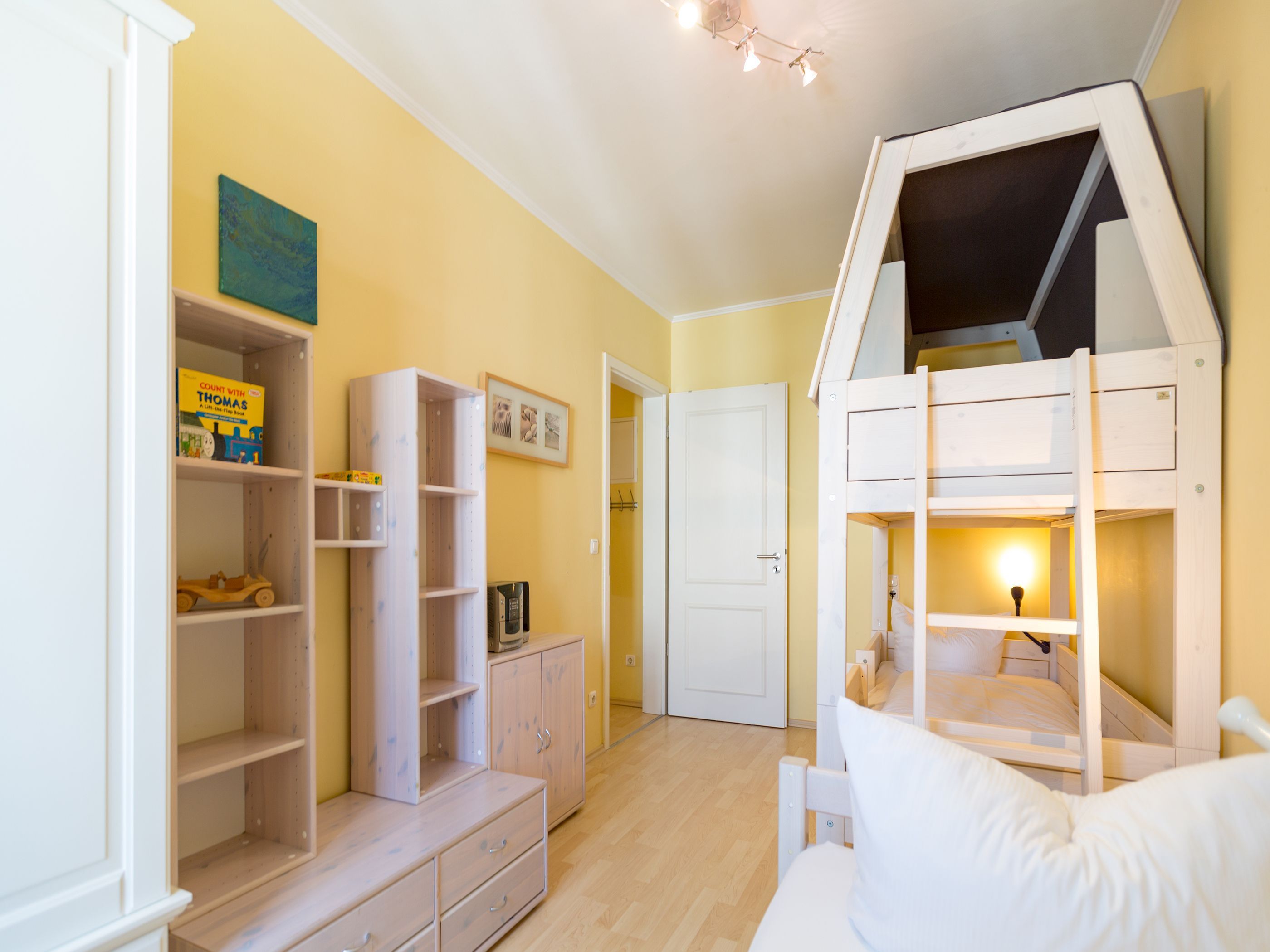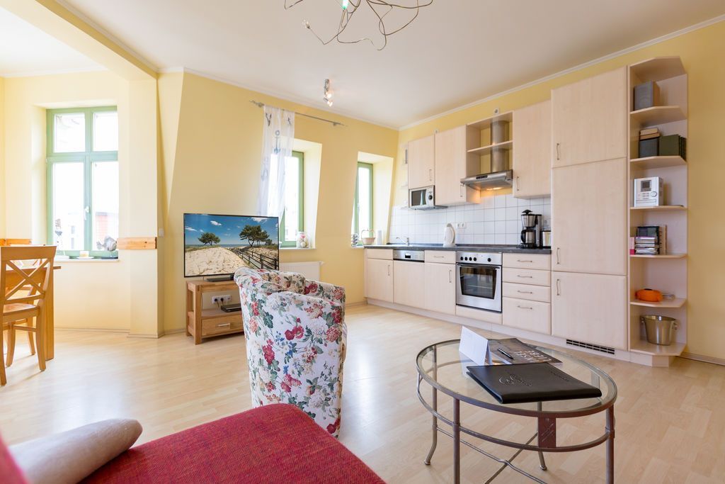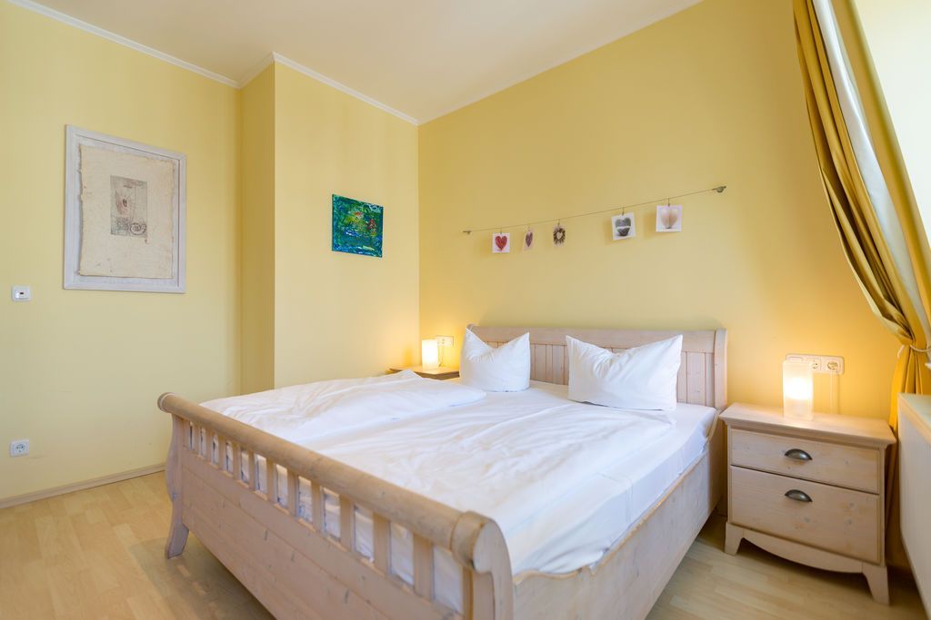 Die exklusive 3-Raum-Ferienwohnung im 3. Obergeschoss des Hauses ist 70 qm groß und bietet 2 bis 5 Personen Platz zum Wohlfühlen und Entspannen. Die moderne, geschmackvolle Einrichtung lässt keine Wünsche offen. Das Appartement verfügt über ein Wohnzimmer mit Erker und Essbereich, eine vollständig ausgestattete Küchenzeile (Ceranfeld, Backofen), ein Schlafzimmer mit Doppelbett, ein Schlafzimmer mit Etagenbett & Einzelbett und ein Duschbad. Für Ihren Komfort sind die Betten bei Anreise bezogen und Handtücher liegen bereit. Von Mitte Mai bis ca. Ende September (je nach Witterung) steht Ihnen für den Tag am Meer ein Strandkorb am Strand kostenlos zur Verfügung.