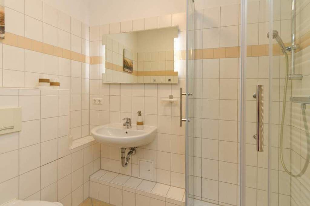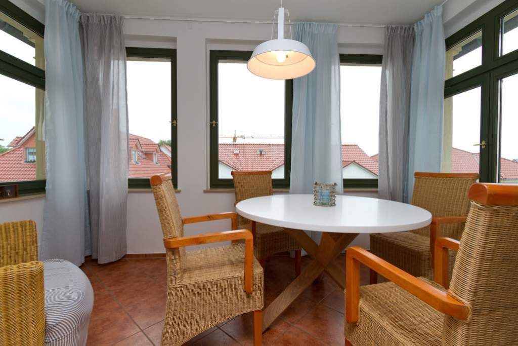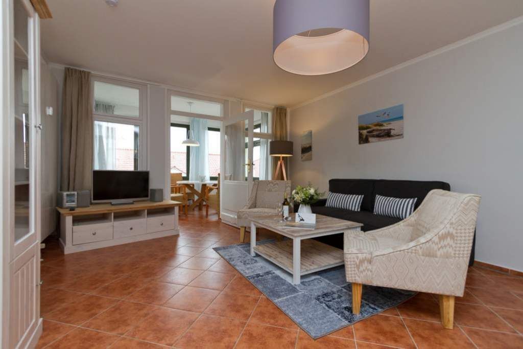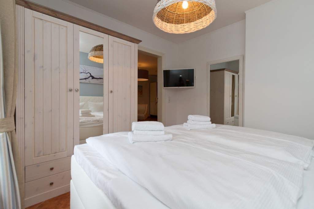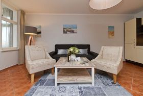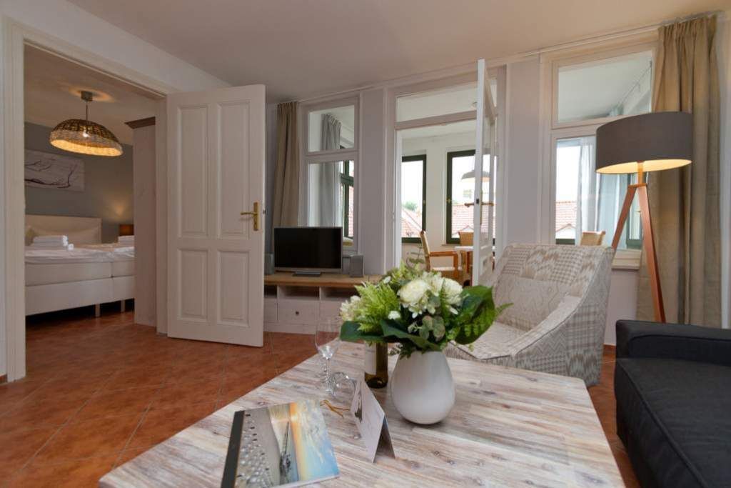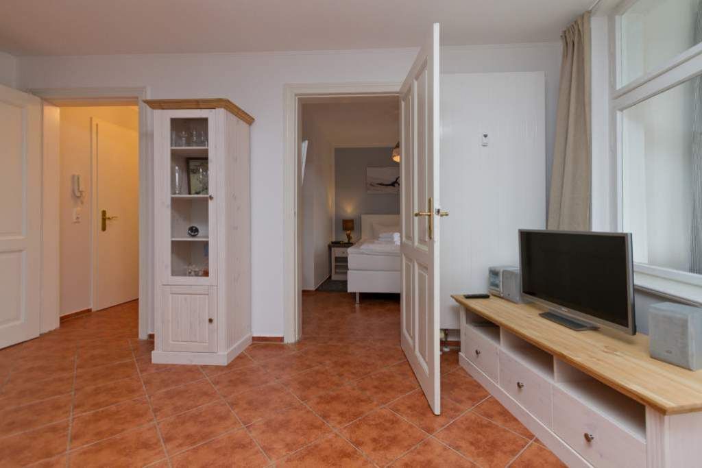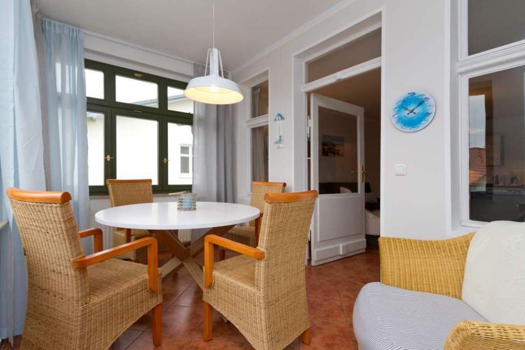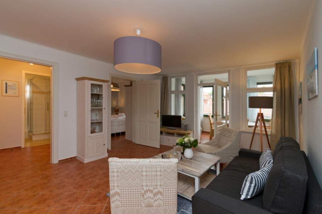Die helle freundliche 2-Raum-Ferienwohnung (47 qm) befindet sich im 2. Obergeschoss der Villa Goodewind und ist ein ideales Ziel wenn man Ruhe und Erholung sucht. Das Appartement verfügt über ein Wohnzimmer mit Schlafcouch ( als Aufbettung für die 3. Person nutzbar) & Flat-TV sowie eine voll ausgestattete Küchenzeile. In der verglasten Veranda mit seitlichem Meerblick lässt es sich gemütlich frühstücken. Das schöne Schlafzimmer ist mit einem Doppelboxspringbett (1,80m x 2,00m) & Flat-TV ausgestattet. Das Bad mit Dusche & WC verfügt über eine Fußbodenheizung. Ein PKW-Stellplatz befindet sich auf dem Hof.