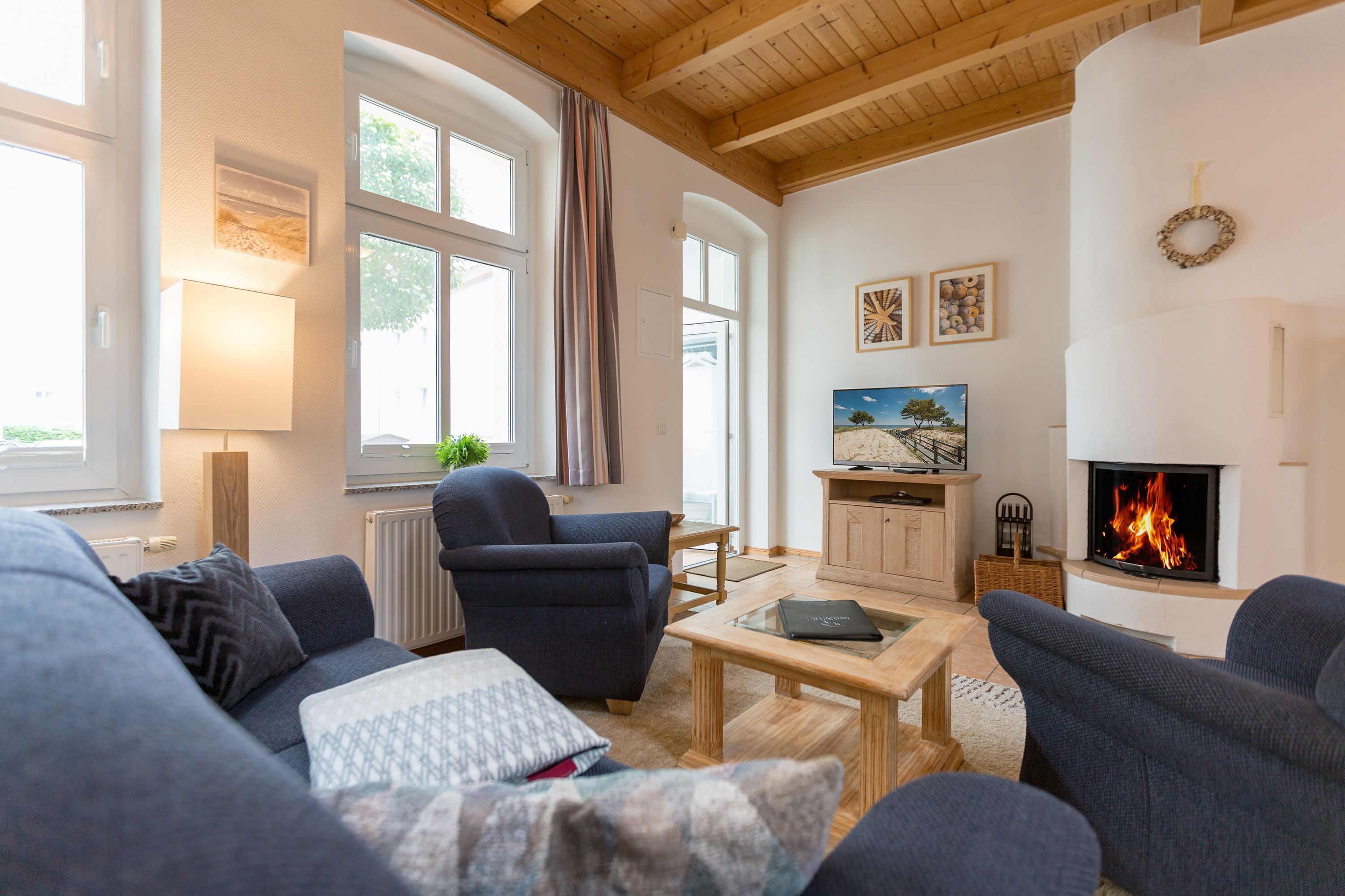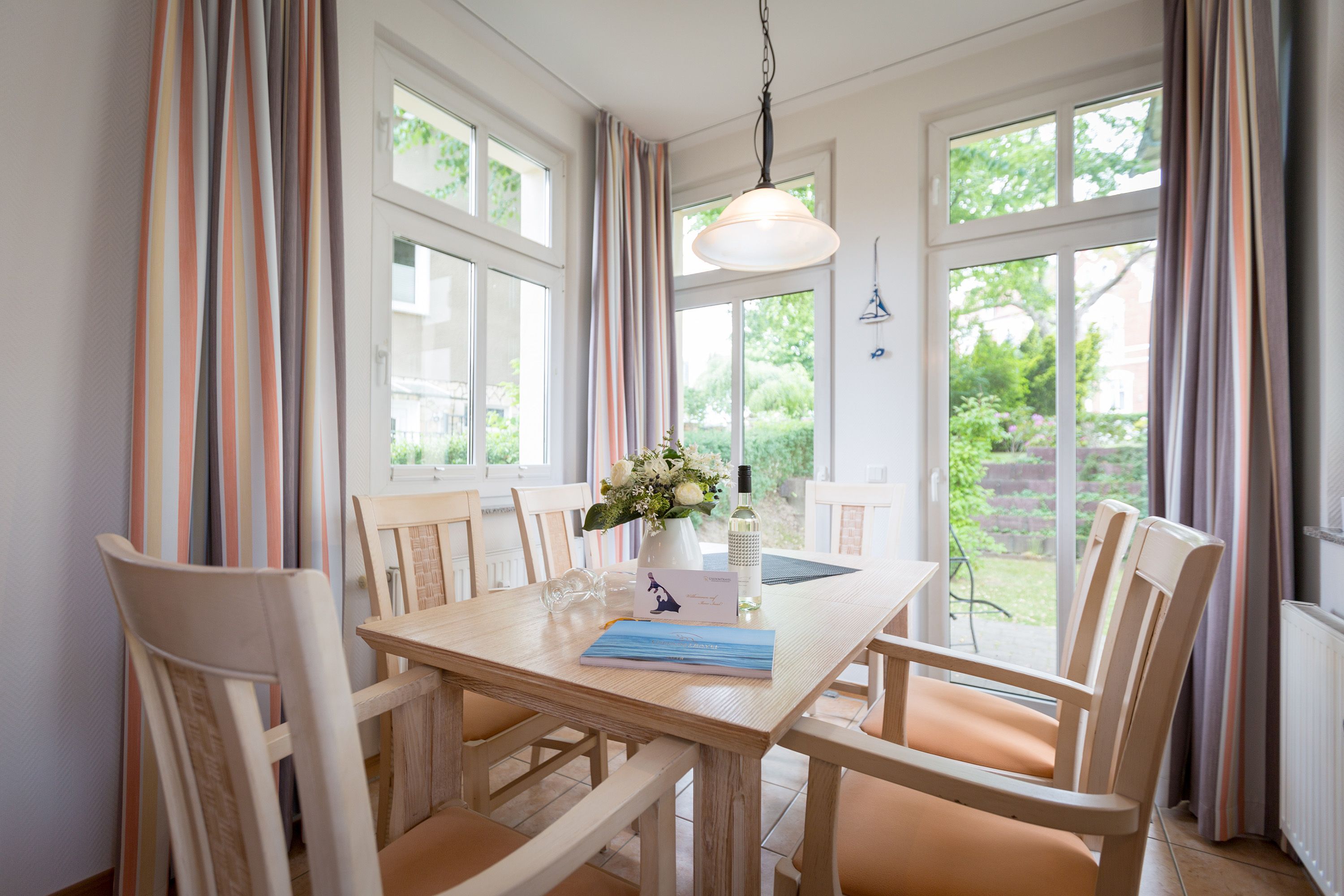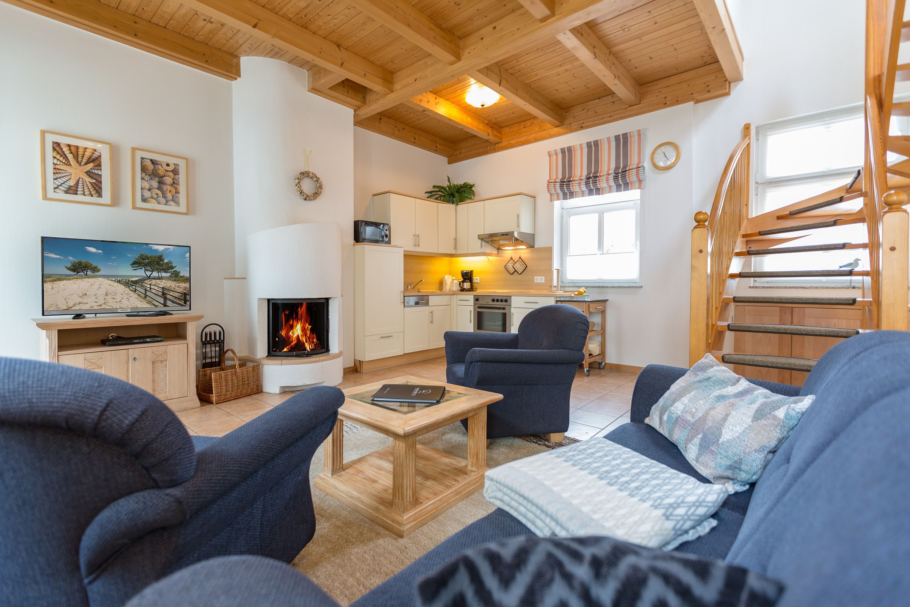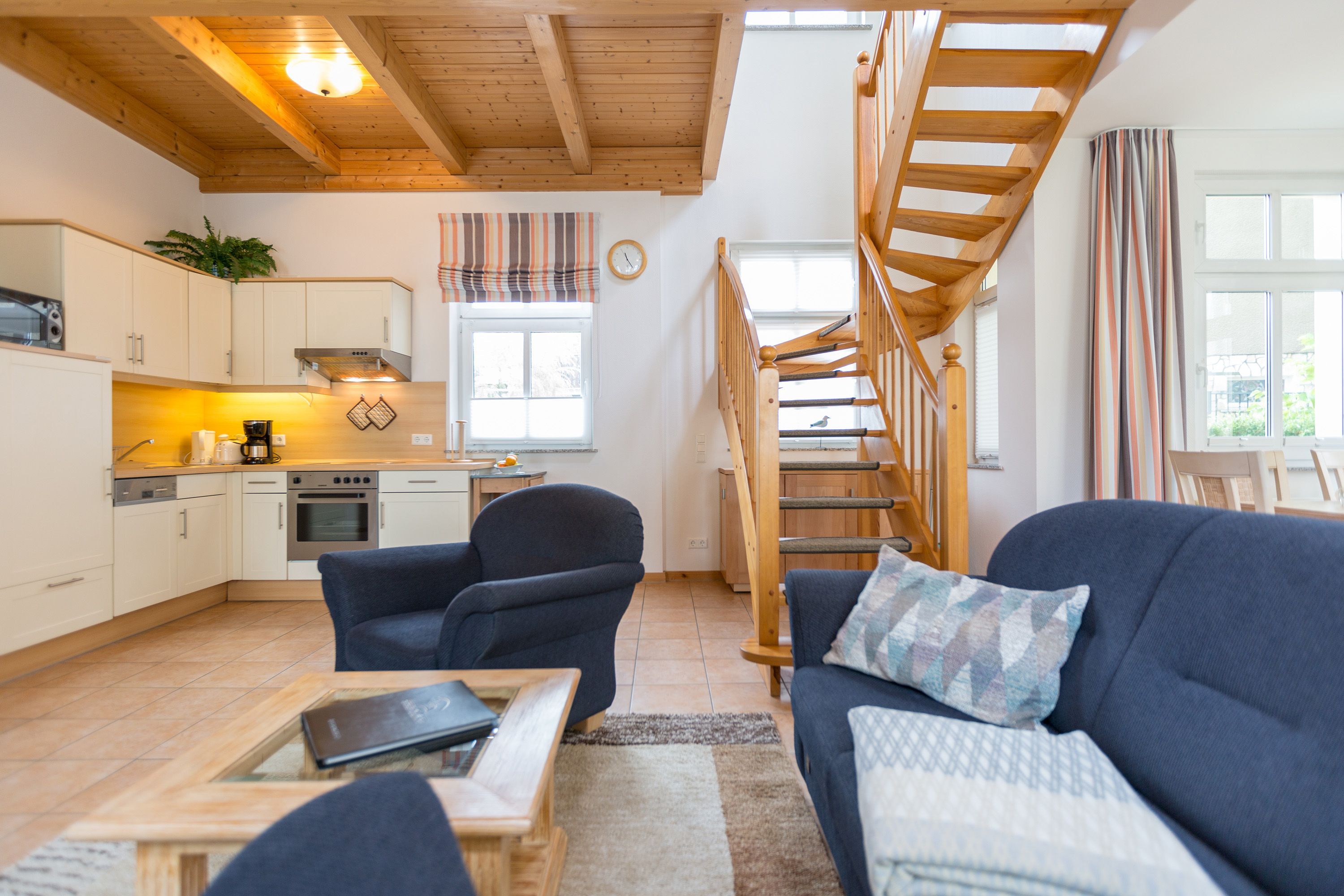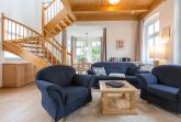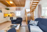 Die mit Balkon und Terrasse 72 m² große Maisonette-Ferienwohnung bietet 4 Personen & 1 Kleinkind ( bis 3 Jahre im Kinderreisebett) bequem Platz. Im Erdgeschoss befinden sich der Wohnbereich mit gemütlichem Kamin, eine offene komplett ausgestattete Küchenzeile und der Essplatz im verglasten Erker. Eine offene Treppe führt in das Obergeschoss. Dort befinden sich zwei Schlafzimmer (1x Etagenbett, 1x Doppelbett), ein Duschbad und der Balkon mit einer Sitzgruppe für 4 Personen. Auf Wunsch stellen wir für unsere kleinen Gäste ein Kinderreisebett (ohne zusätzliche Matratze & Bettzeug) und einen Kinderhochstuhl ( gegen einen Aufpreis) zur Verfügung. Für Ihren Komfort sind die Betten bei der Anreise bezogen und Handtücher liegen bereit. Liebevoll ausgesuchte maritime Accessoires in allen Räumlichkeiten sorgen für ein behagliches Ambiente. Haustiere sind willkommen, sofern sie sich im gefliesten Erdgeschoss aufhalten. Für empfindliche Schläfer wurden Insektenschutzrollos angebracht. Das WLAN-Netz im Haus ist kostenfrei nutzbar.