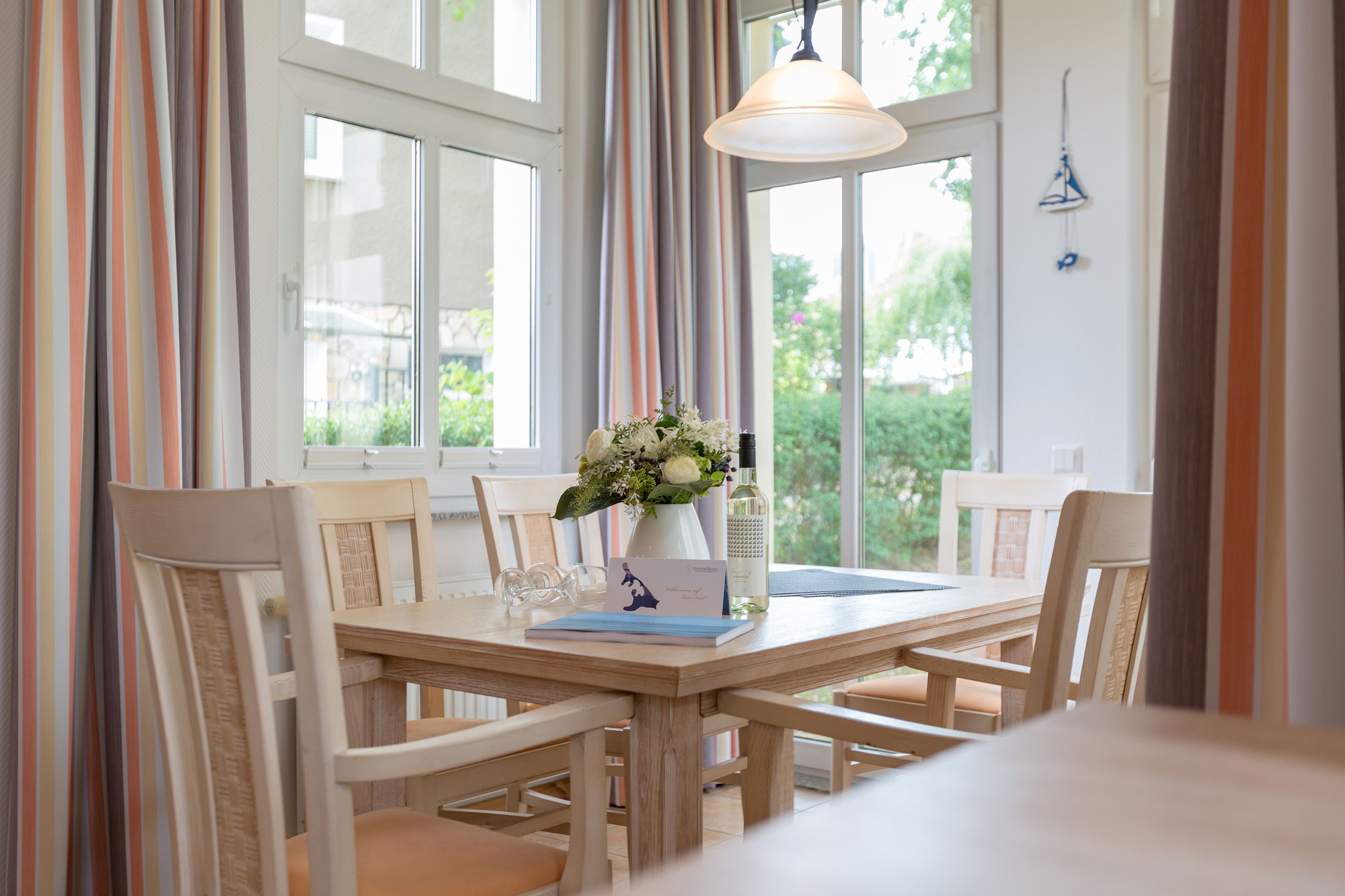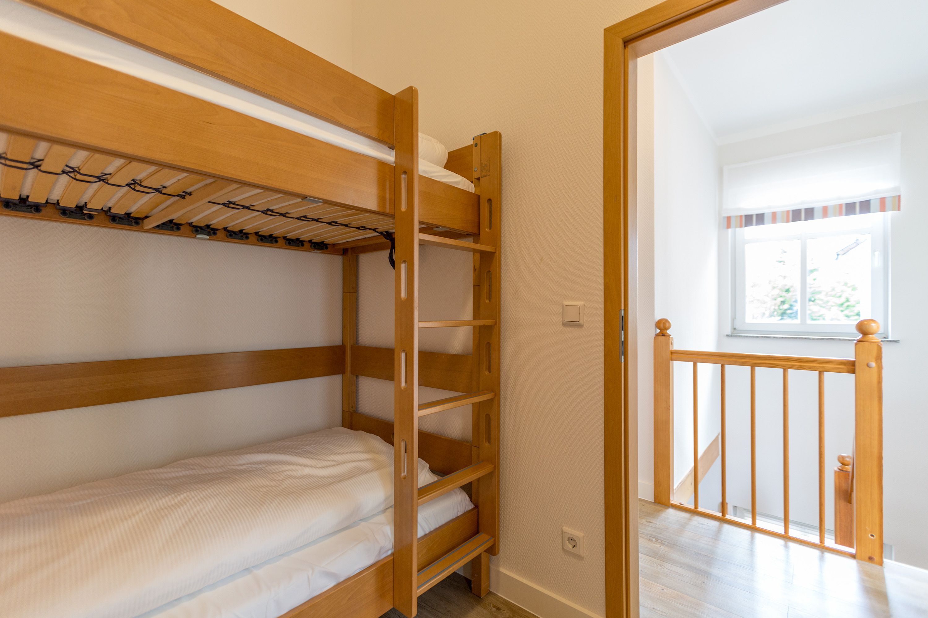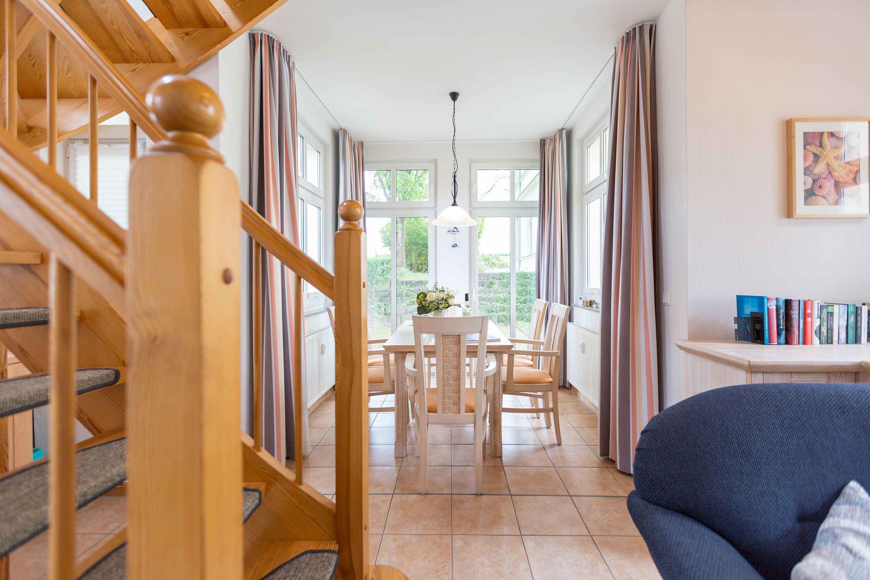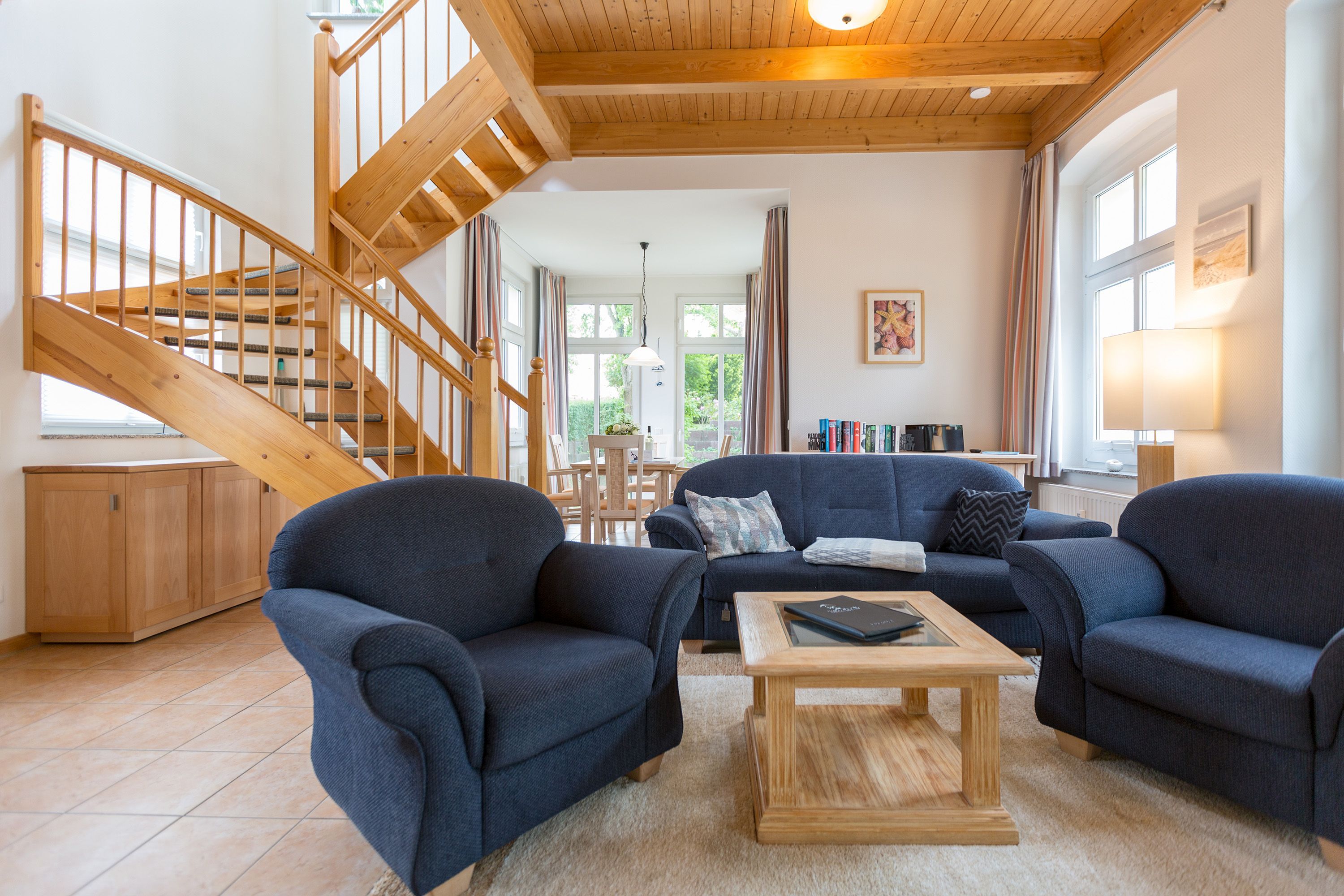 Die mit Balkon und Terrasse 72 m² große Maisonette-Ferienwohnung bietet 4 Personen & 1 Kleinkind ( bis 3 Jahre im Kinderreisebett) bequem Platz. Im Erdgeschoss befinden sich der Wohnbereich mit gemütlichem Kamin, eine offene komplett ausgestattete Küchenzeile und der Essplatz im verglasten Erker. Eine offene Treppe führt in das Obergeschoss. Dort befinden sich zwei Schlafzimmer (1x Etagenbett, 1x Doppelbett), ein Duschbad und der Balkon mit einer Sitzgruppe für 4 Personen. Auf Wunsch stellen wir für unsere kleinen Gäste ein Kinderreisebett (ohne zusätzliche Matratze & Bettzeug) und einen Kinderhochstuhl ( gegen einen Aufpreis) zur Verfügung. Für Ihren Komfort sind die Betten bei der Anreise bezogen und Handtücher liegen bereit. Liebevoll ausgesuchte maritime Accessoires in allen Räumlichkeiten sorgen für ein behagliches Ambiente. Haustiere sind willkommen, sofern sie sich im gefliesten Erdgeschoss aufhalten. Für empfindliche Schläfer wurden Insektenschutzrollos angebracht. Das WLAN-Netz im Haus ist kostenfrei nutzbar.