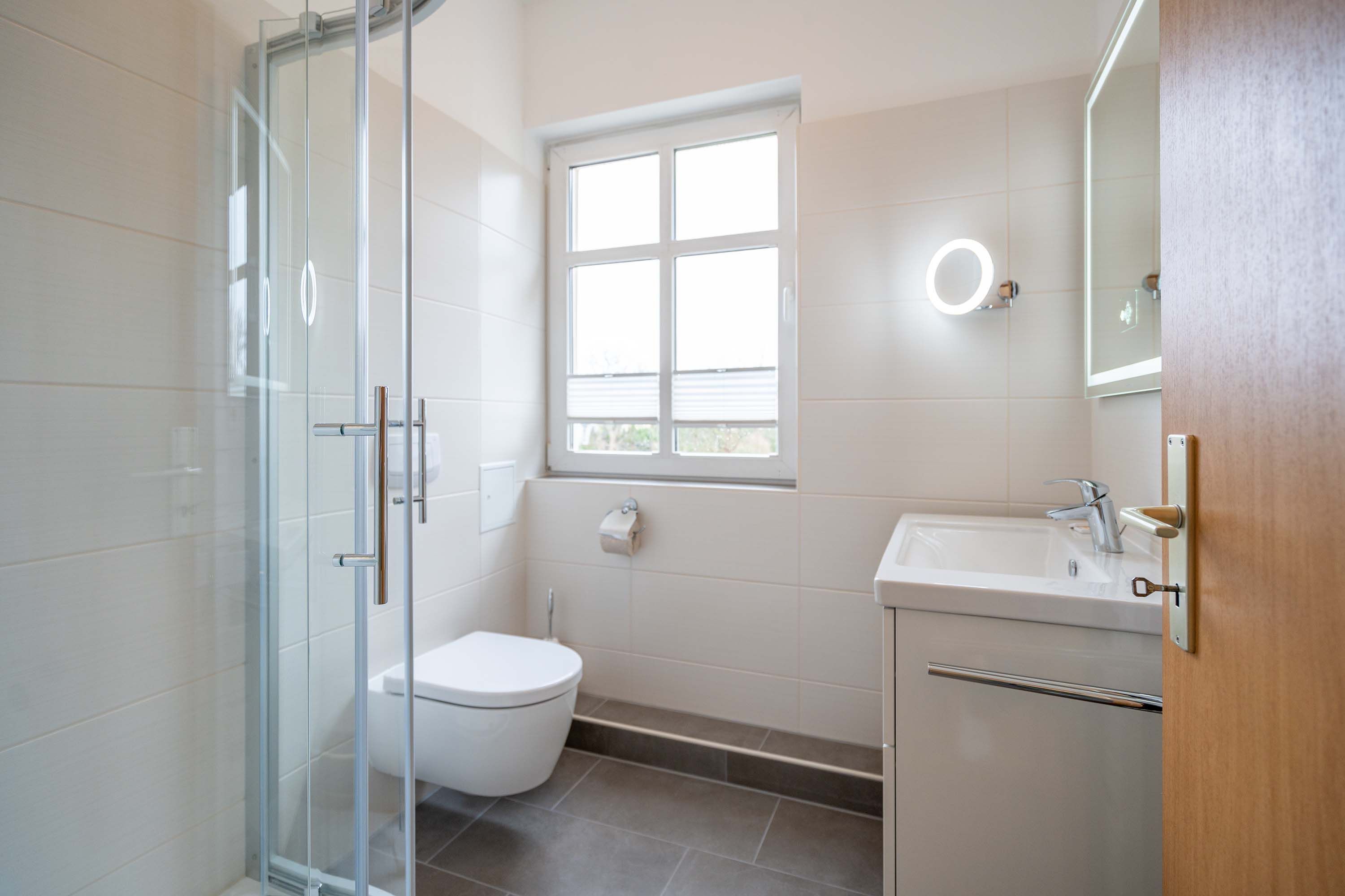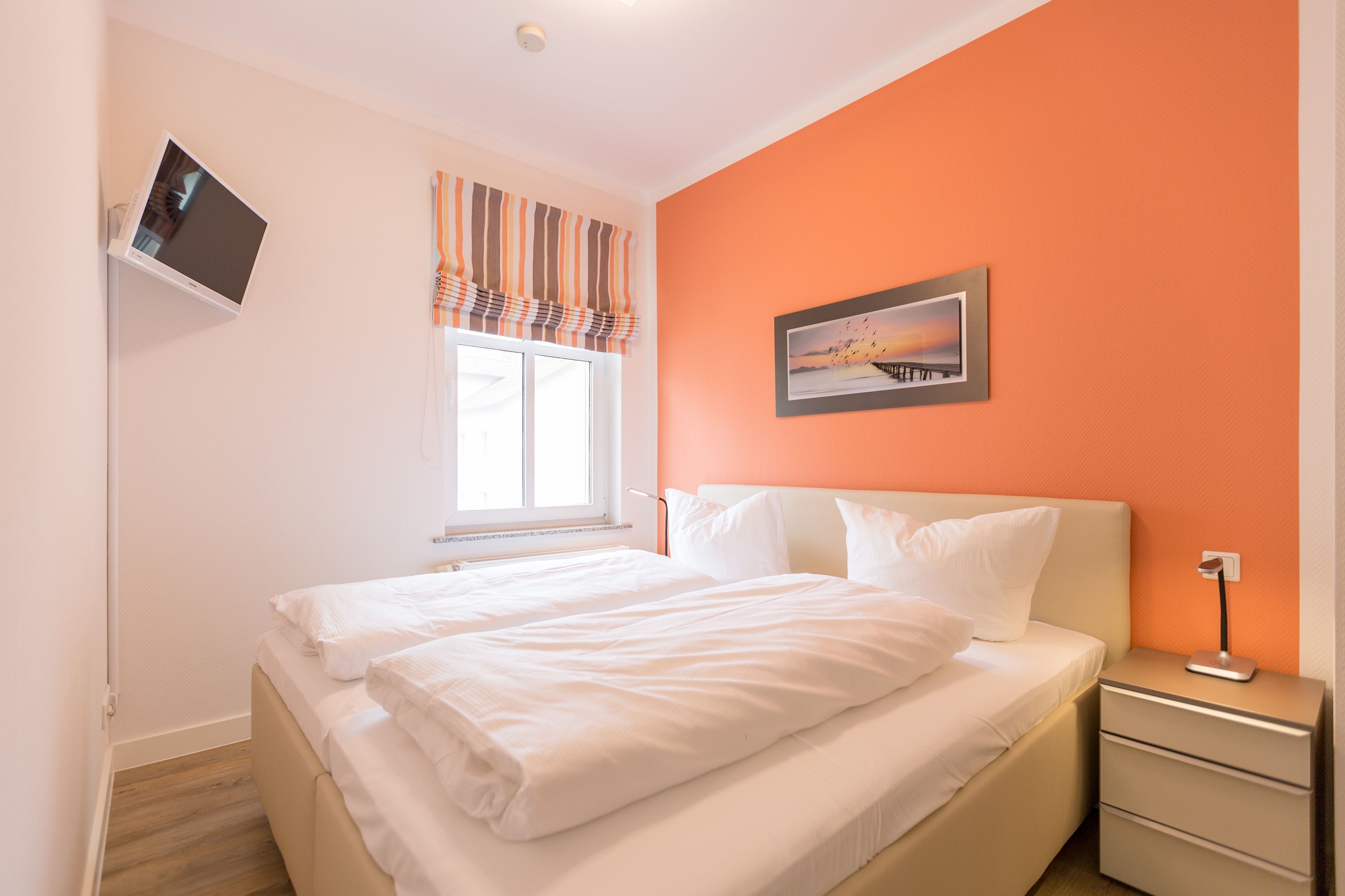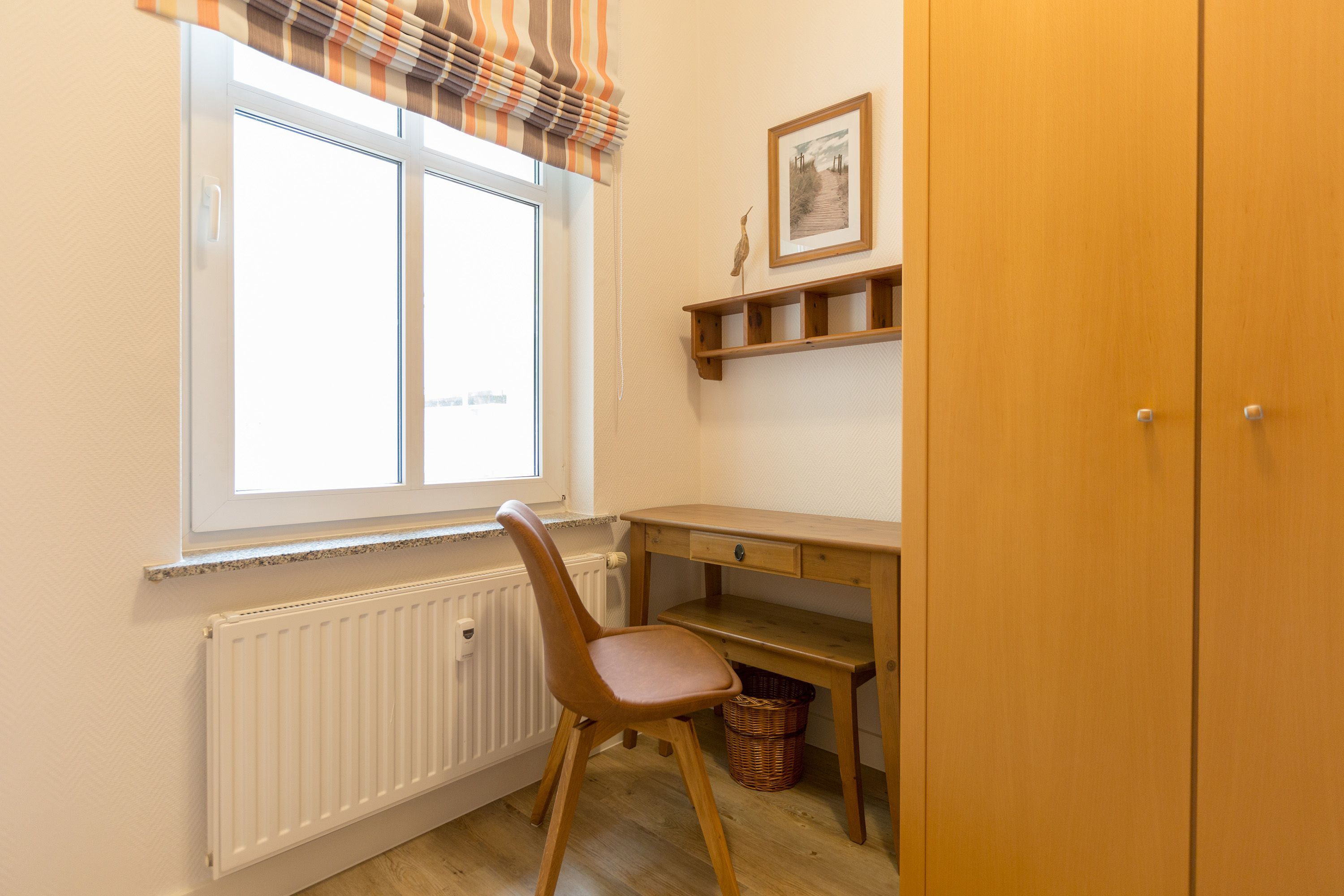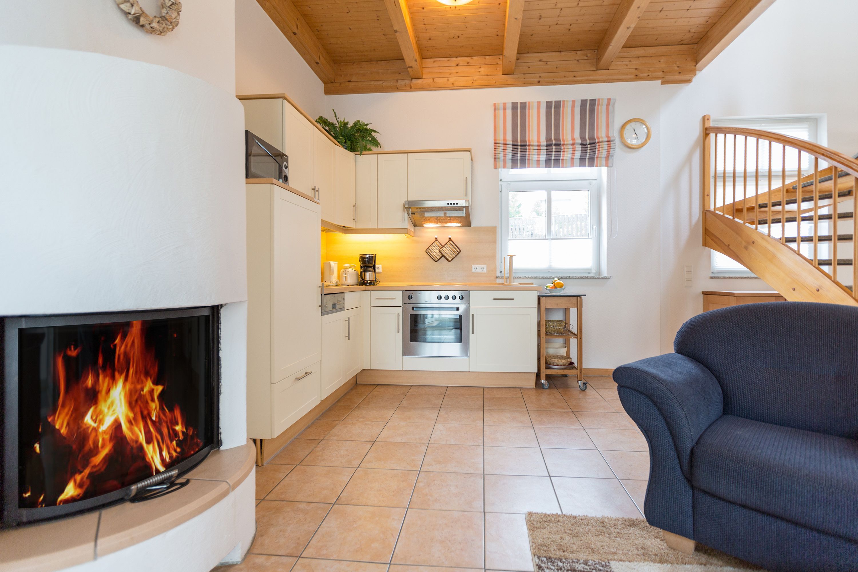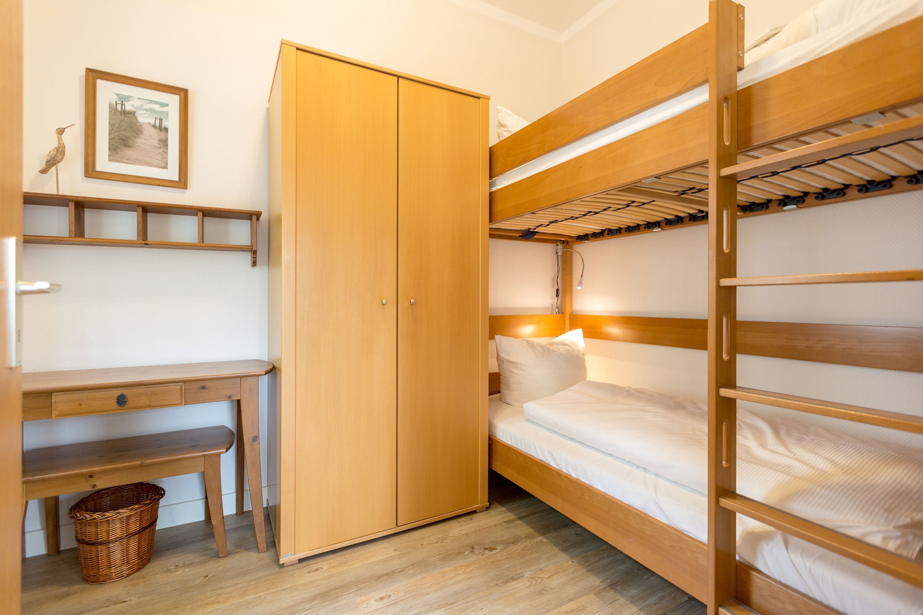 Die mit Balkon und Terrasse 72 m² große Maisonette-Ferienwohnung bietet 4 Personen & 1 Kleinkind ( bis 3 Jahre im Kinderreisebett) bequem Platz. Im Erdgeschoss befinden sich der Wohnbereich mit gemütlichem Kamin, eine offene komplett ausgestattete Küchenzeile und der Essplatz im verglasten Erker. Eine offene Treppe führt in das Obergeschoss. Dort befinden sich zwei Schlafzimmer (1x Etagenbett, 1x Doppelbett), ein Duschbad und der Balkon mit einer Sitzgruppe für 4 Personen. Auf Wunsch stellen wir für unsere kleinen Gäste ein Kinderreisebett (ohne zusätzliche Matratze & Bettzeug) und einen Kinderhochstuhl ( gegen einen Aufpreis) zur Verfügung. Für Ihren Komfort sind die Betten bei der Anreise bezogen und Handtücher liegen bereit. Liebevoll ausgesuchte maritime Accessoires in allen Räumlichkeiten sorgen für ein behagliches Ambiente. Haustiere sind willkommen, sofern sie sich im gefliesten Erdgeschoss aufhalten. Für empfindliche Schläfer wurden Insektenschutzrollos angebracht. Das WLAN-Netz im Haus ist kostenfrei nutzbar.