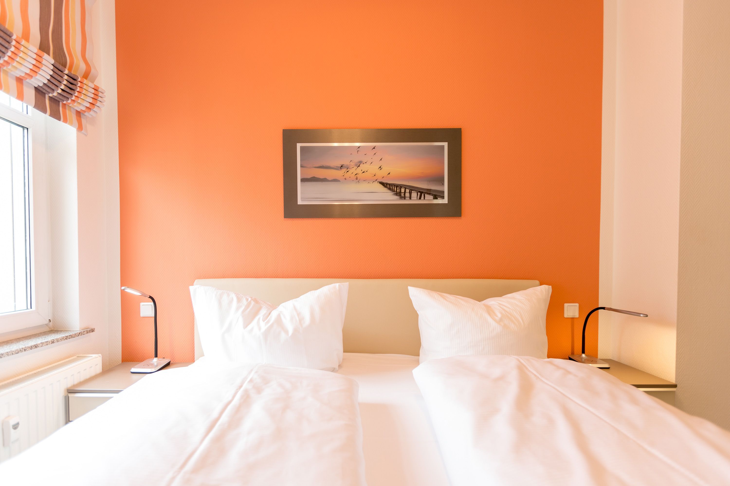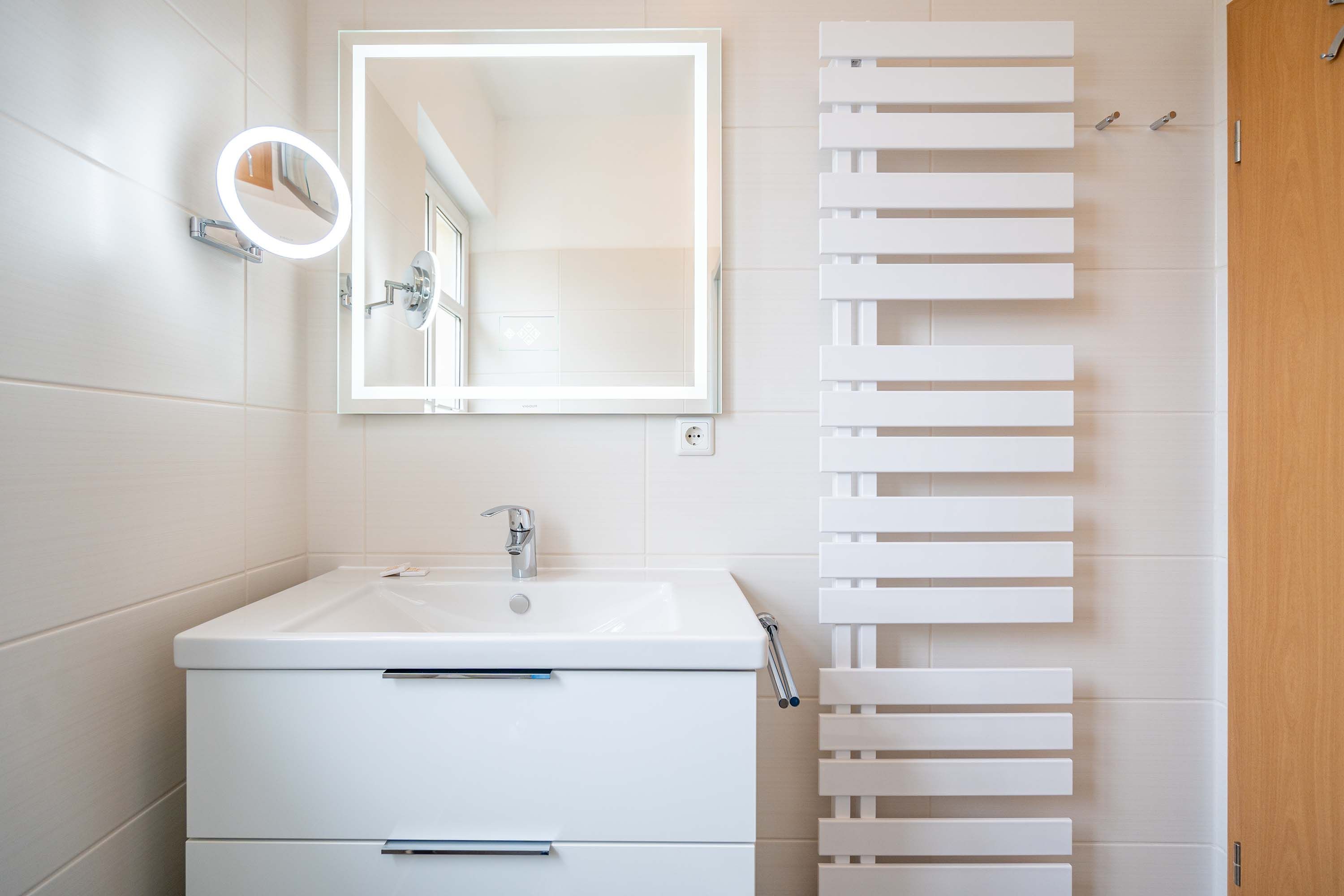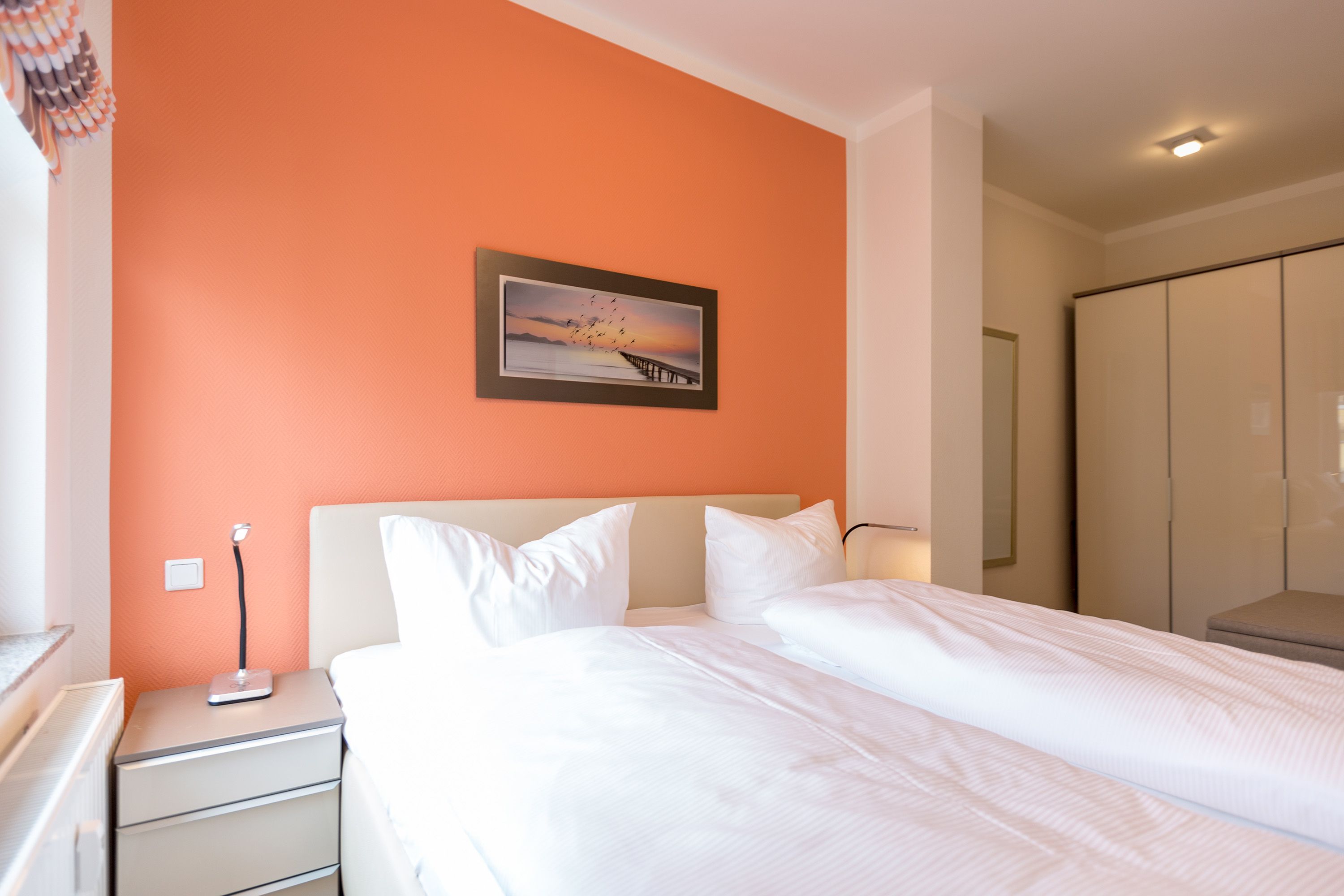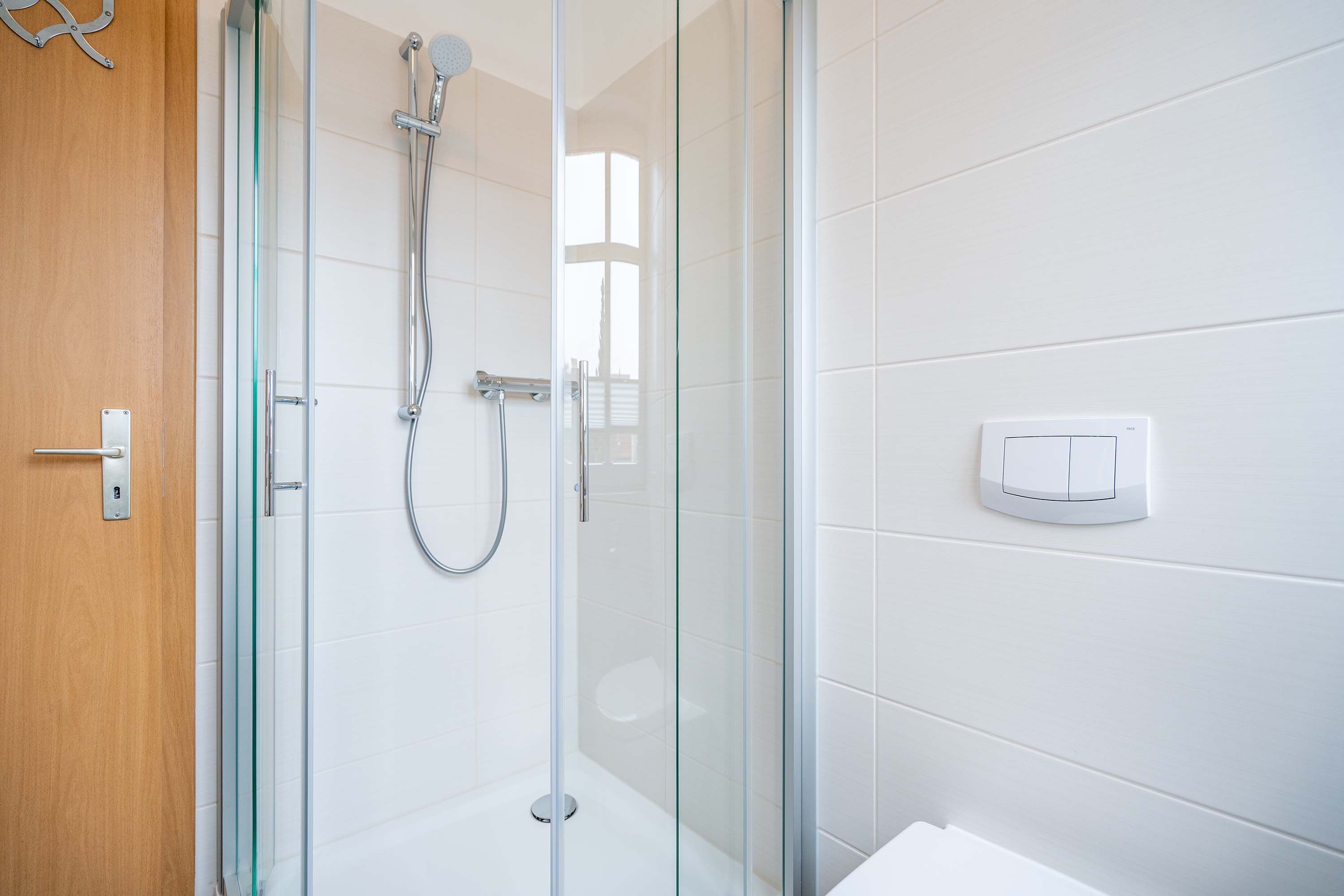 Die mit Balkon und Terrasse 72 m² große Maisonette-Ferienwohnung bietet 4 Personen & 1 Kleinkind ( bis 3 Jahre im Kinderreisebett) bequem Platz. Im Erdgeschoss befinden sich der Wohnbereich mit gemütlichem Kamin, eine offene komplett ausgestattete Küchenzeile und der Essplatz im verglasten Erker. Eine offene Treppe führt in das Obergeschoss. Dort befinden sich zwei Schlafzimmer (1x Etagenbett, 1x Doppelbett), ein Duschbad und der Balkon mit einer Sitzgruppe für 4 Personen. Auf Wunsch stellen wir für unsere kleinen Gäste ein Kinderreisebett (ohne zusätzliche Matratze & Bettzeug) und einen Kinderhochstuhl ( gegen einen Aufpreis) zur Verfügung. Für Ihren Komfort sind die Betten bei der Anreise bezogen und Handtücher liegen bereit. Liebevoll ausgesuchte maritime Accessoires in allen Räumlichkeiten sorgen für ein behagliches Ambiente. Haustiere sind willkommen, sofern sie sich im gefliesten Erdgeschoss aufhalten. Für empfindliche Schläfer wurden Insektenschutzrollos angebracht. Das WLAN-Netz im Haus ist kostenfrei nutzbar.