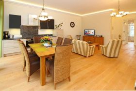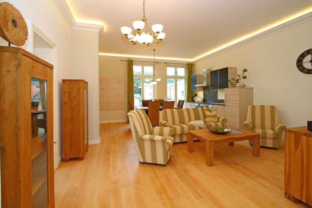 Willkommen in unserer großzügigen und hellen 3-Raum-Ferienwohnung in der 2. Etage. Diese geräumige Wohnung bietet Platz für 4 Erwachsene und ein Kleinkind bis zu 2 Jahren im Kinderreisebett. Der Wohnbereich verfügt über eine komfortable Sitzgruppe mit Flachbildfernseher, eine komplett ausgestattete Küchenzeile und einen gemütlichen Essbereich. Das großzügige Schlafzimmer ist mit einem Doppelbett ausgestattet, während das zweite Schlafzimmer über ein Schlafsofa (1,40 m x 2 m) verfügt, das auch als zwei Einzelbetten genutzt werden kann. Für Ihren Komfort sind die Betten bei Ihrer Ankunft bereits bezogen und Handtücher liegen als Erstausstattung bereit. Das Badezimmer ist mit einer Dusche und einer Toilette ausgestattet. Vom Balkon aus, der mit Gartenmöbeln ausgestattet ist, können Sie die frische Luft und die Umgebung genießen. Ein Pkw-Stellplatz befindet sich direkt am Haus.