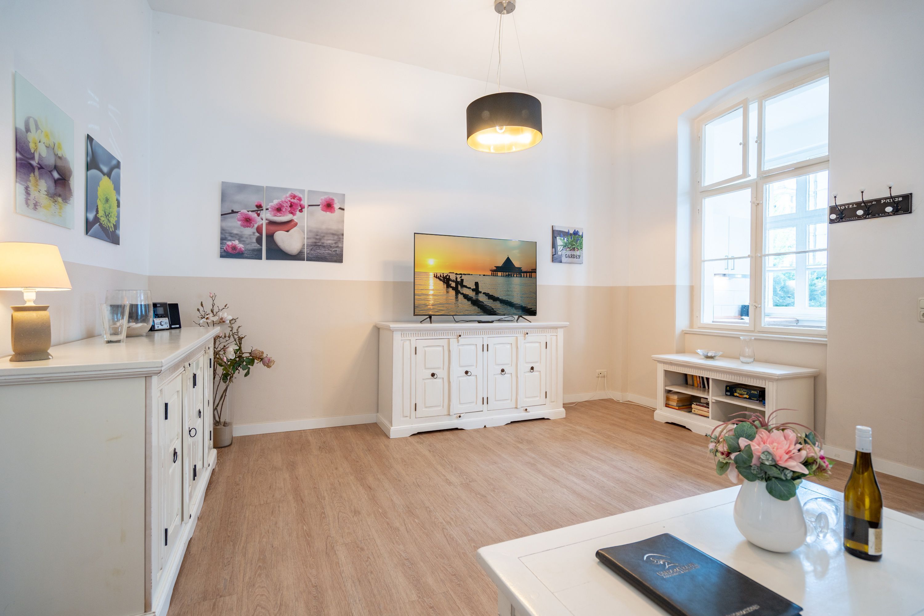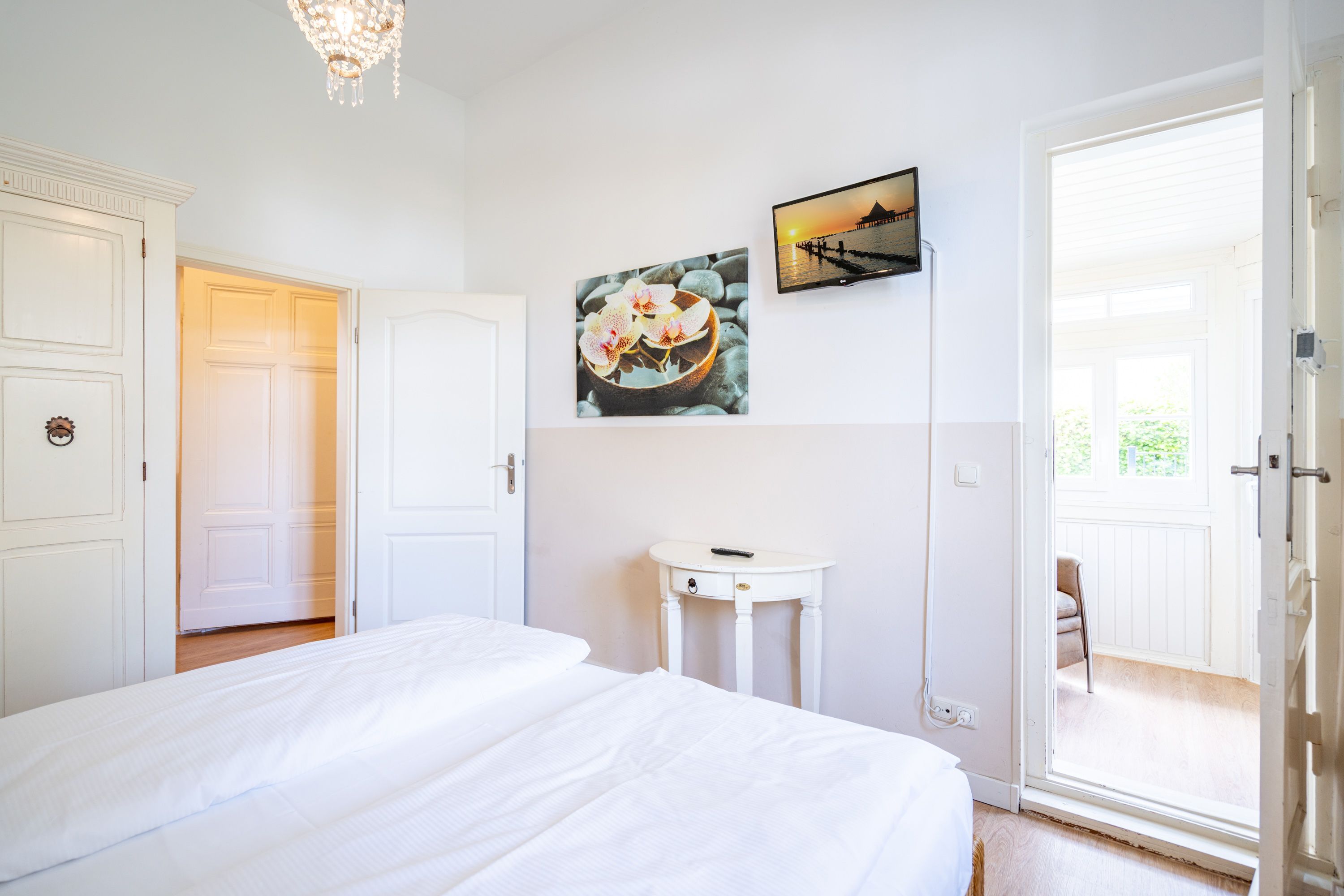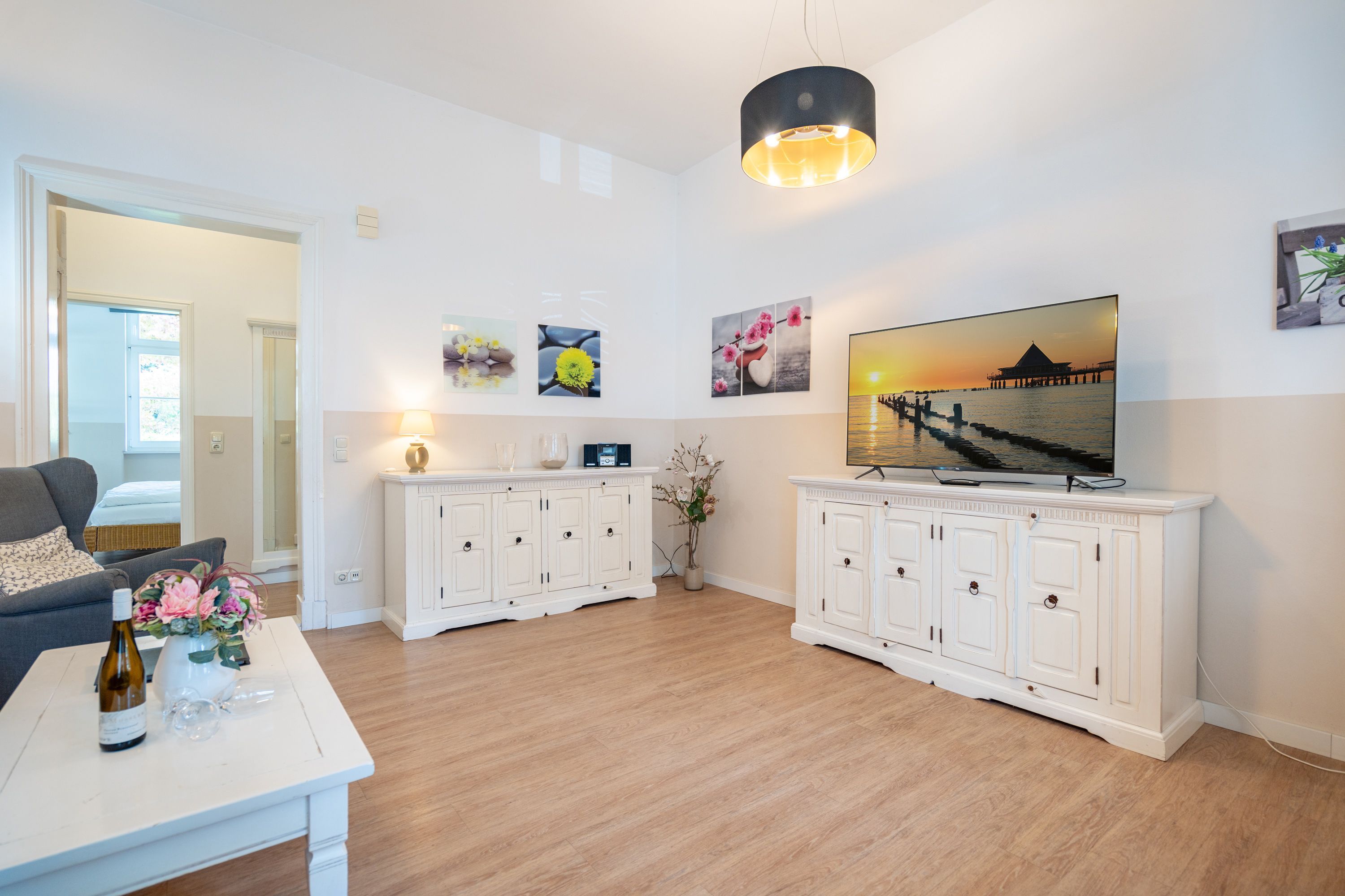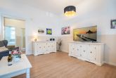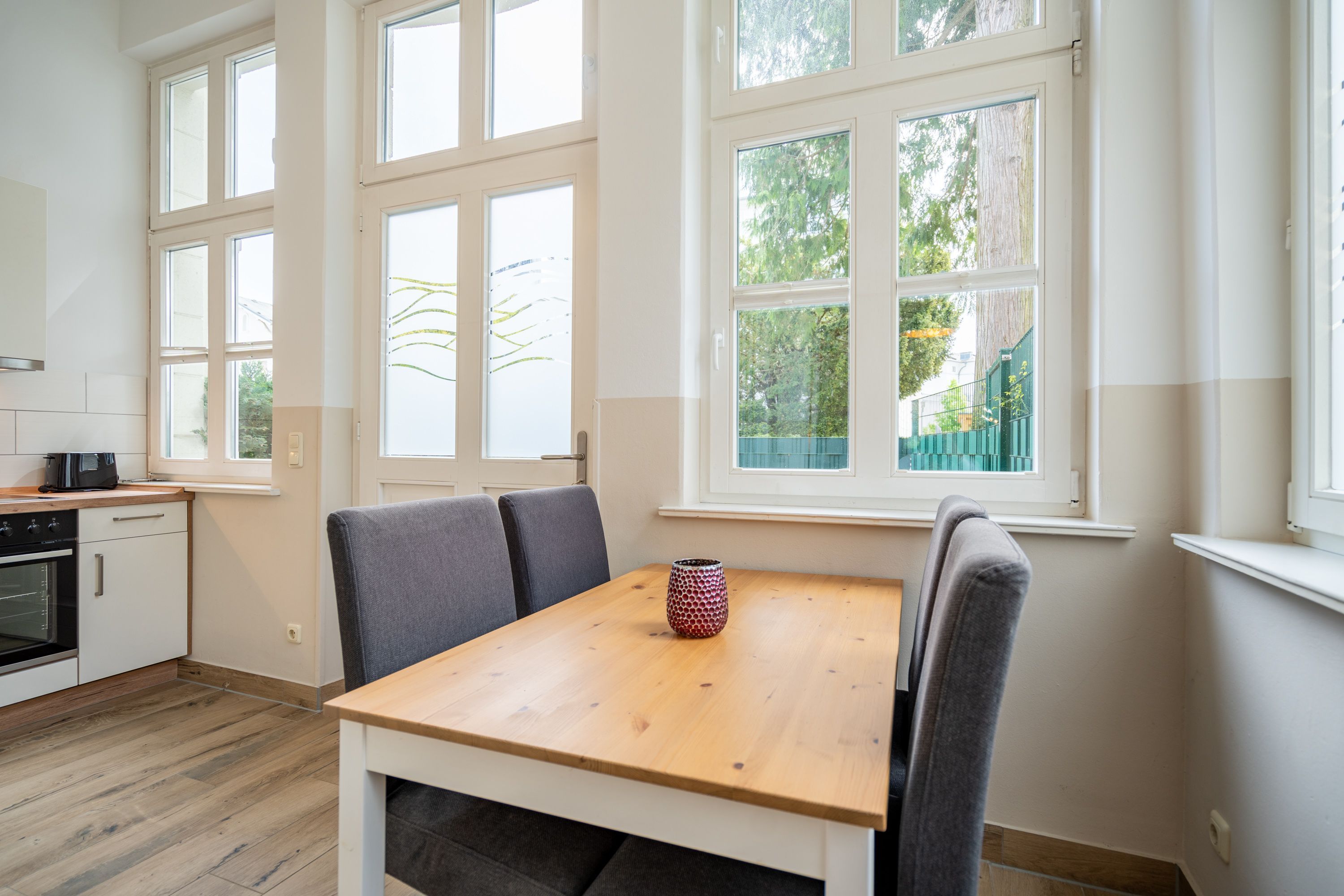 Willkommen in Ihrer 63 m² großen Ferienwohnung im Erdgeschoss der Villa Hartmann-Drewitz. Hier finden bis zu 4 Personen ein charmantes Zuhause auf Zeit. Das große Schlafzimmer mit Doppelbett und TV sowie ein zweites Schlafzimmer mit zwei Einzelbetten bieten komfortable Schlafmöglichkeiten. Im einladenden Wohnbereich können Sie entspannen, während die verglaste Veranda mit Küchenzeile und Essplatz viel Licht hereinlässt. Von hier aus treten Sie direkt auf die Terrasse, die gleichzeitig als Wohnungseingang dient. Das Bad mit Dusche und WC rundet den Komfort ab. Ein Pkw-Stellplatz steht Ihnen direkt am Haus zur Verfügung.