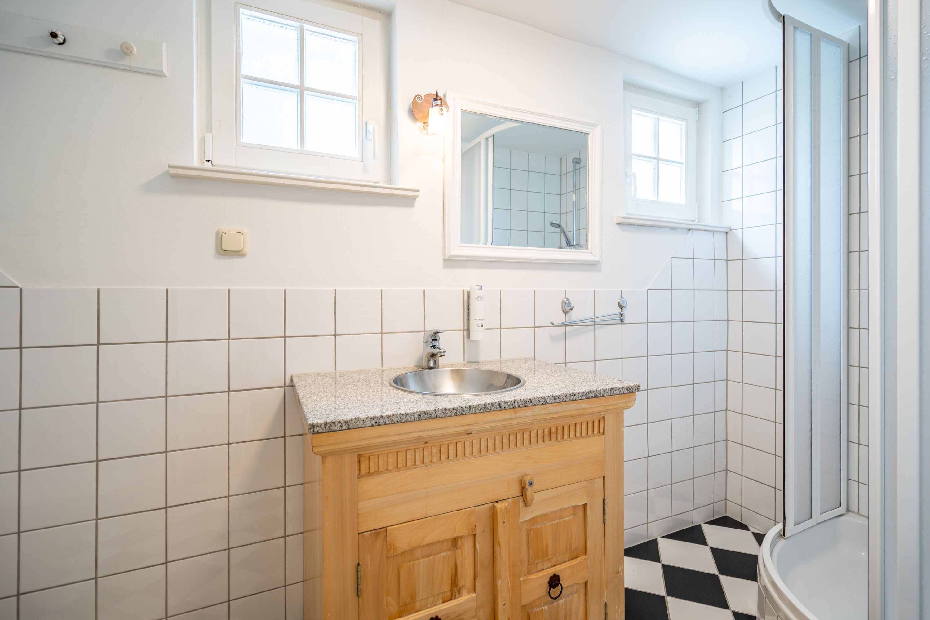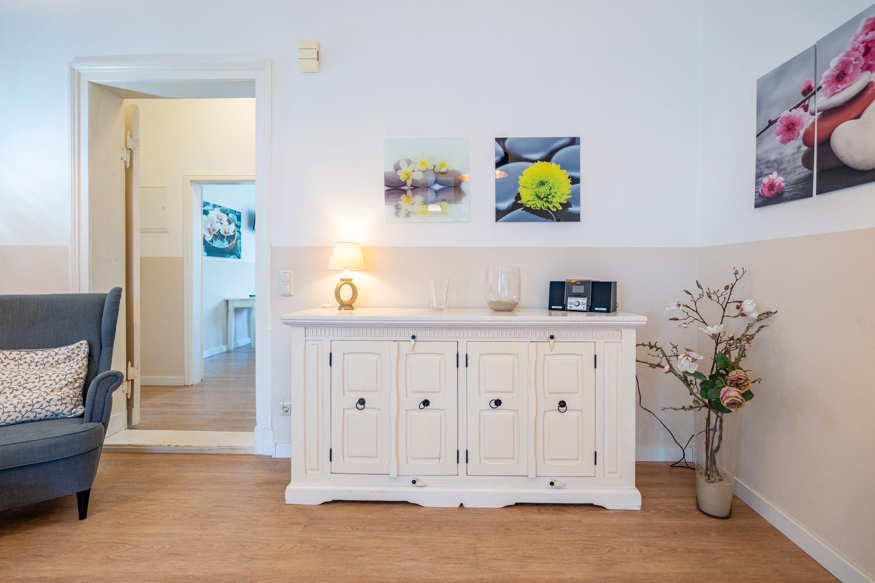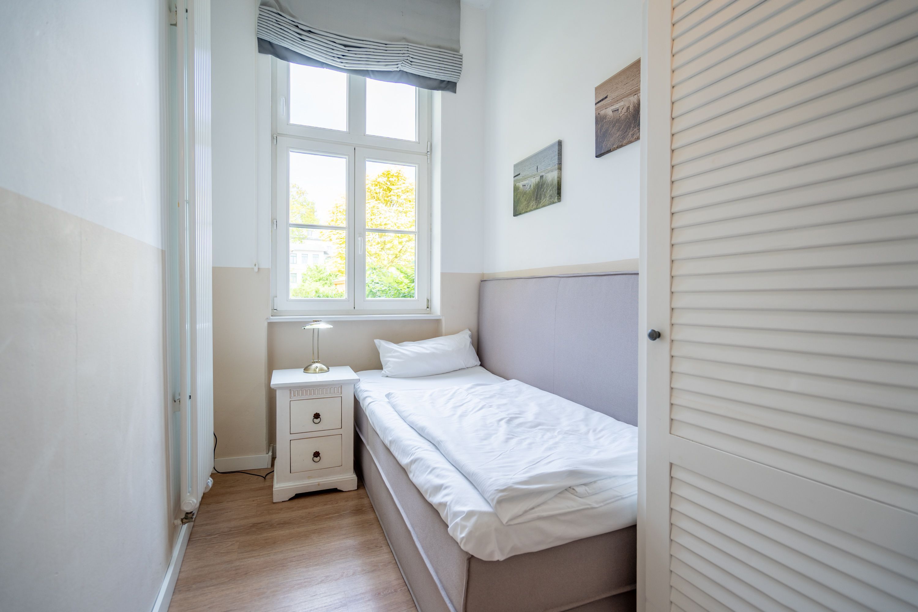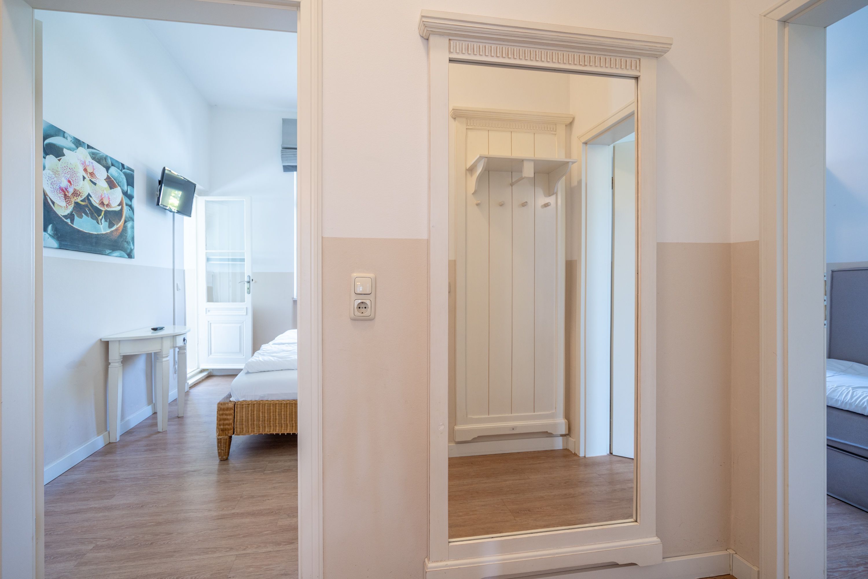 Willkommen in Ihrer 63 m² großen Ferienwohnung im Erdgeschoss der Villa Hartmann-Drewitz. Hier finden bis zu 4 Personen ein charmantes Zuhause auf Zeit. Das große Schlafzimmer mit Doppelbett und TV sowie ein zweites Schlafzimmer mit zwei Einzelbetten bieten komfortable Schlafmöglichkeiten. Im einladenden Wohnbereich können Sie entspannen, während die verglaste Veranda mit Küchenzeile und Essplatz viel Licht hereinlässt. Von hier aus treten Sie direkt auf die Terrasse, die gleichzeitig als Wohnungseingang dient. Das Bad mit Dusche und WC rundet den Komfort ab. Ein Pkw-Stellplatz steht Ihnen direkt am Haus zur Verfügung.
