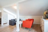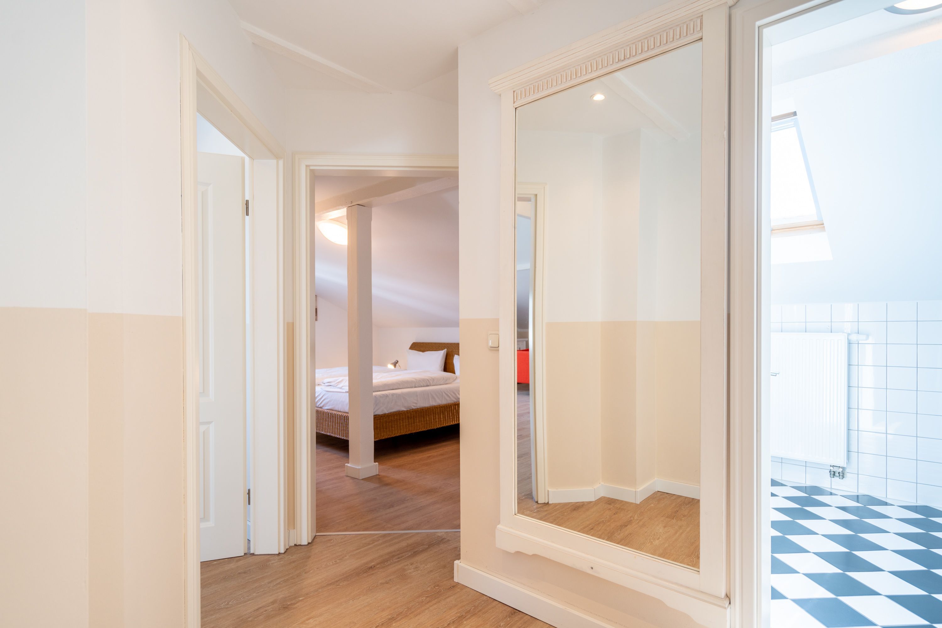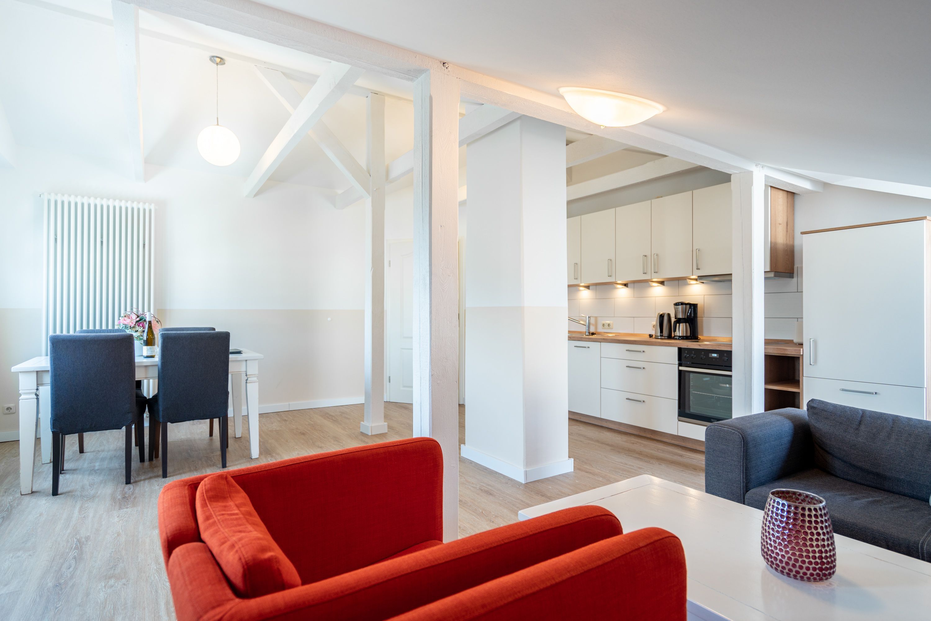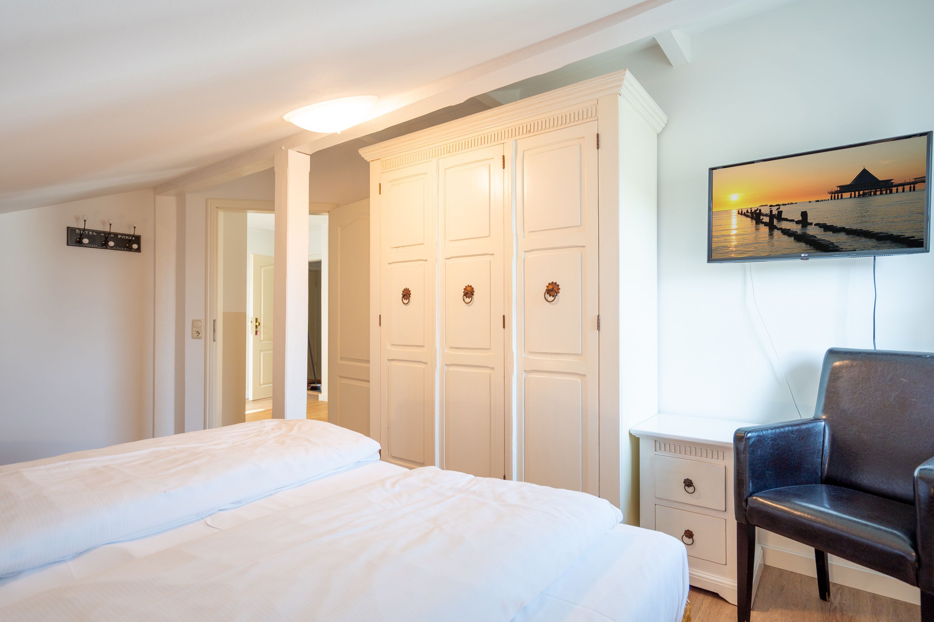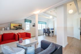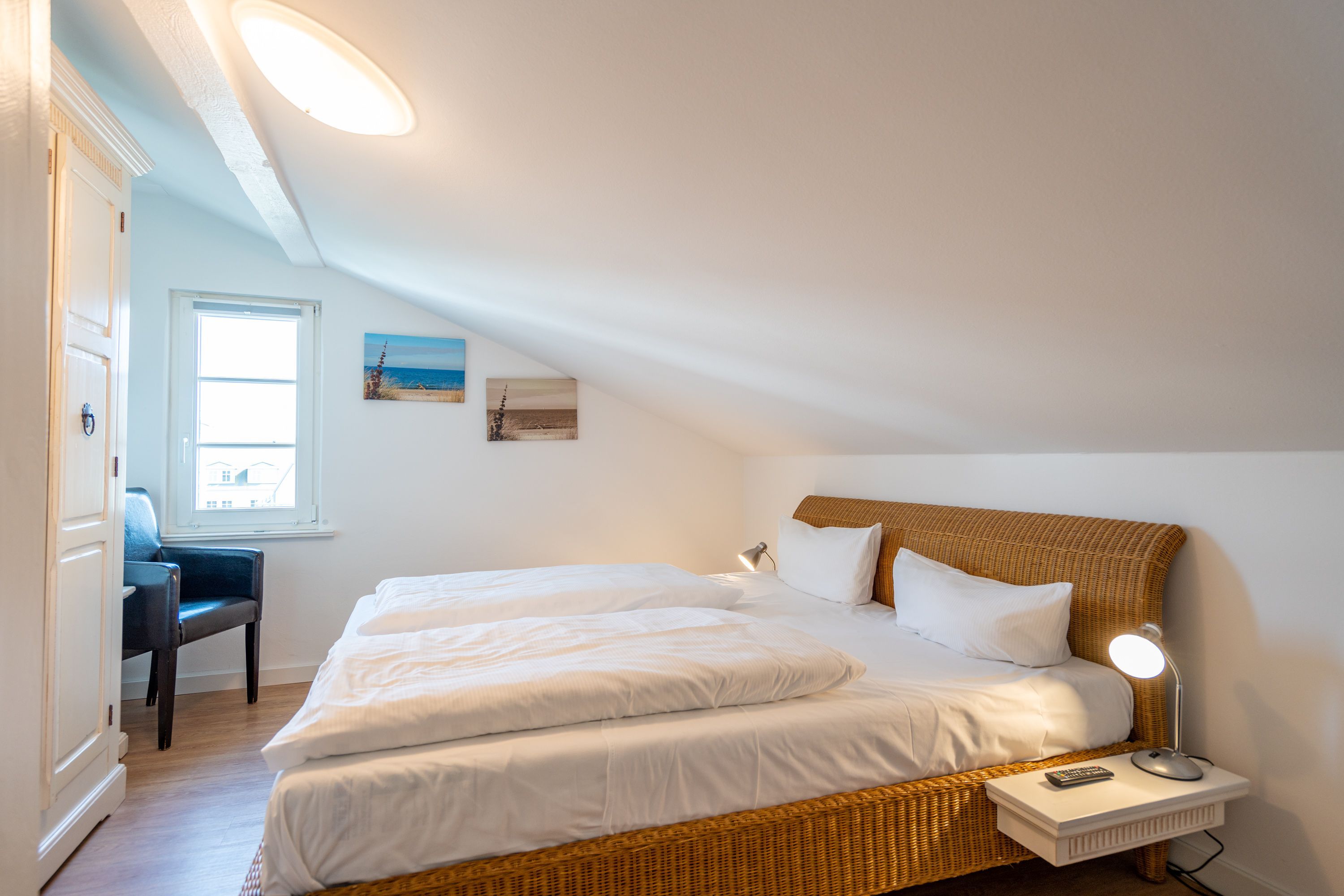 Diese 56 m² große Dachgeschosswohnung ist ideal für 2 Erwachsene und ein Kleinkind. Der Wohnbereich mit Sitzgruppe, TV, Küchenzeile und Essplatz ist hell und einladend. Von hier gelangen Sie direkt auf den schönen Balkon, wo Sie die Sonne genießen können. Das Schlafzimmer mit Doppelbett und das Bad mit Dusche und WC sorgen für erholsame Urlaubstage. Ein Pkw-Stellplatz am Haus steht zur Verfügung.