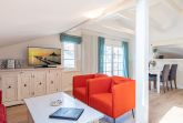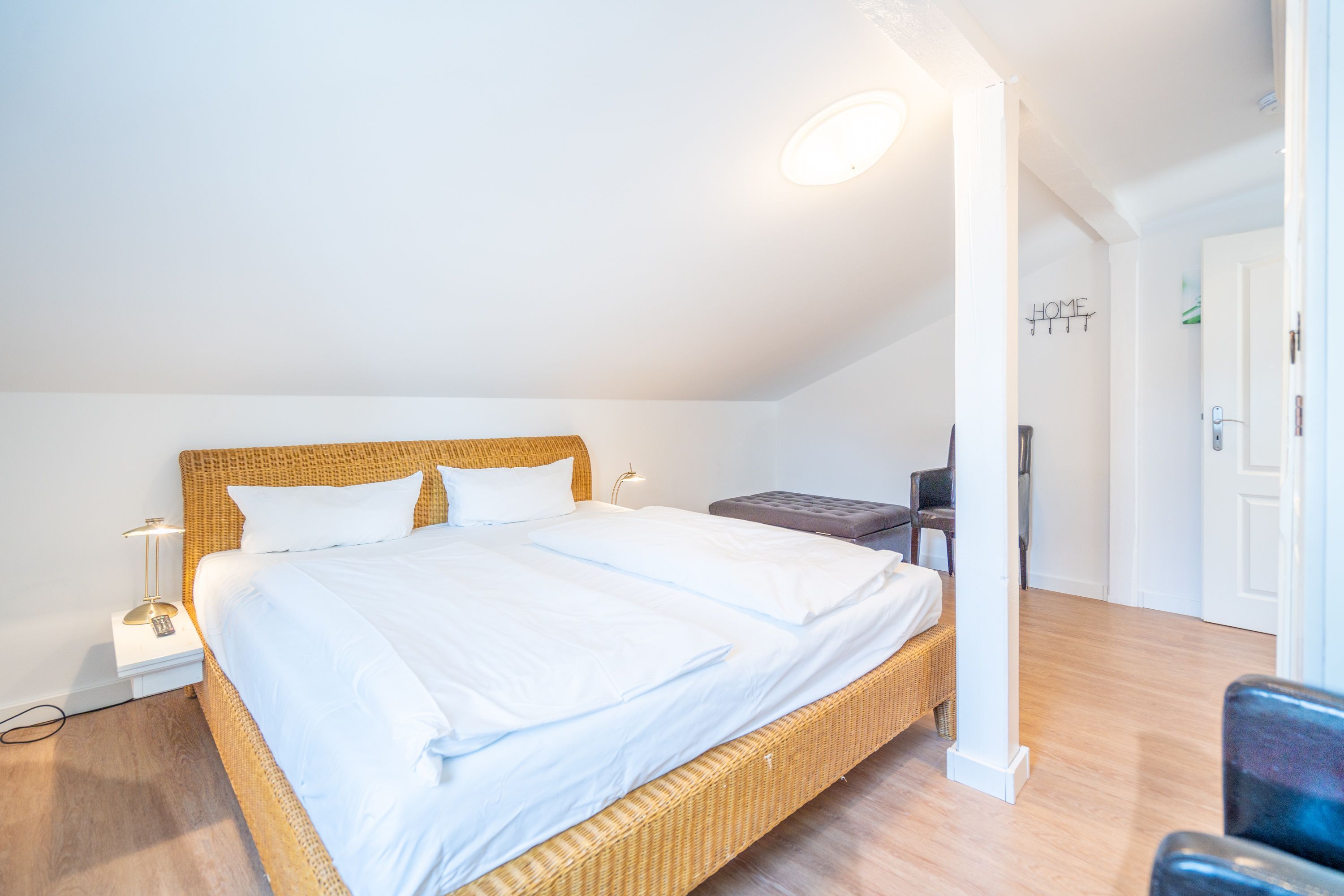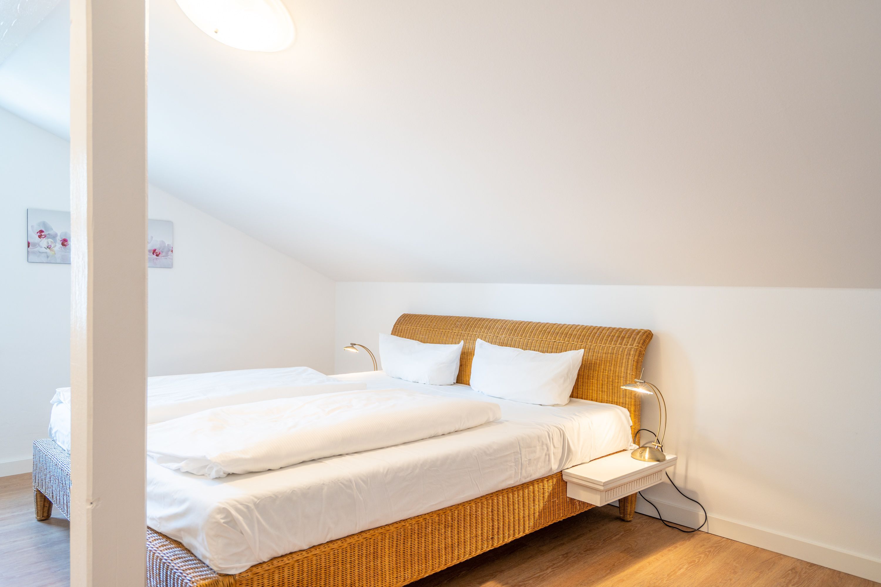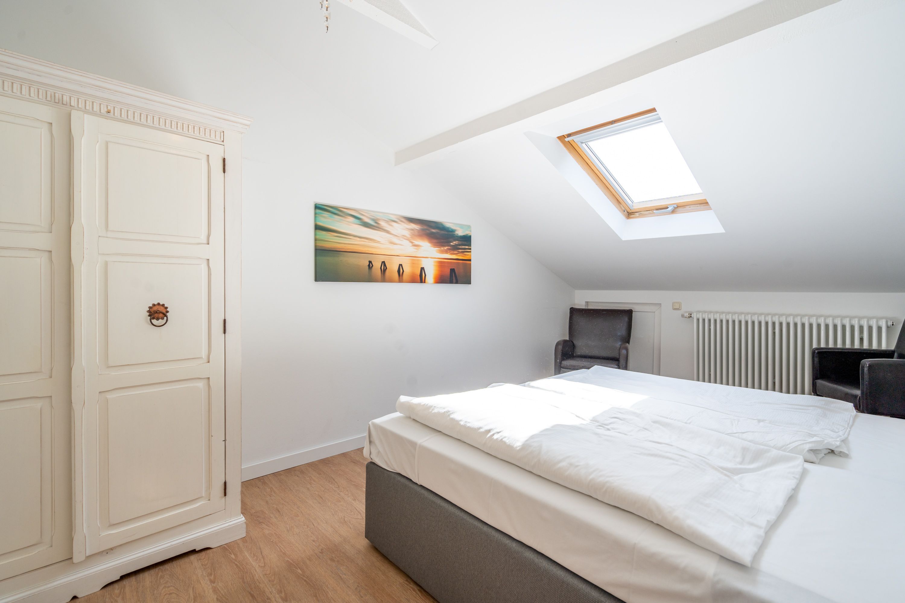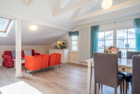 Mit 78 m² bietet diese Dachgeschosswohnung reichlich Platz für einen entspannten Urlaub mit Familie oder Freunden. Zwei Schlafzimmer mit Doppelbetten garantieren erholsame Nächte. Im Wohnbereich mit Sitzgruppe, TV, Küchenzeile und Essplatz lässt es sich gemütlich verweilen. Der 6 m² große Westbalkon lädt dazu ein, den Abend bei Sonnenuntergang ausklingen zu lassen. Bad mit Dusche und WC sowie ein Pkw-Stellplatz am Haus runden das Angebot ab.