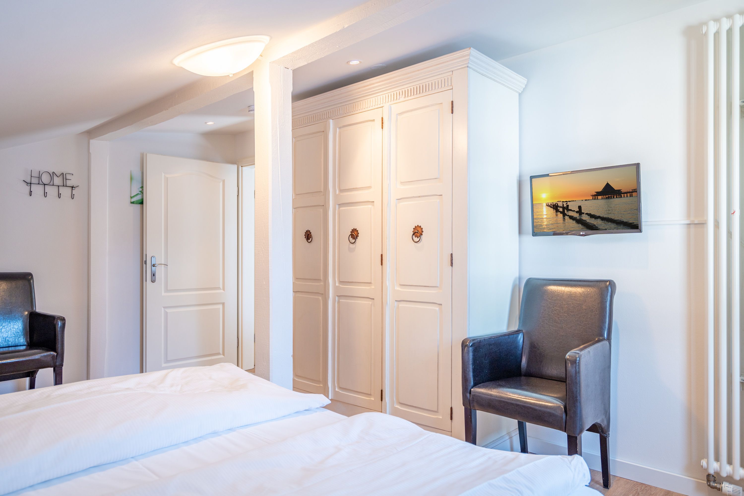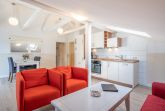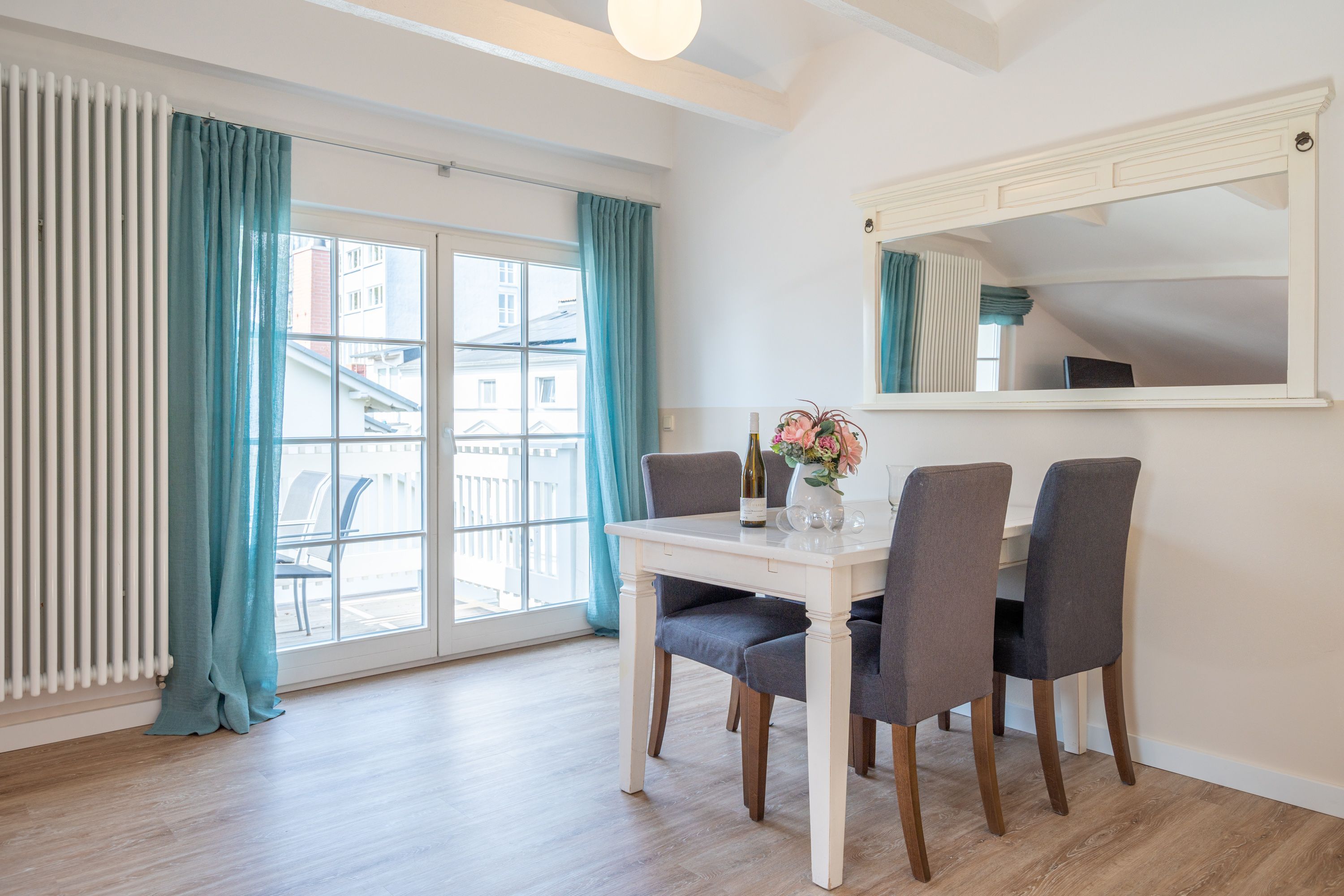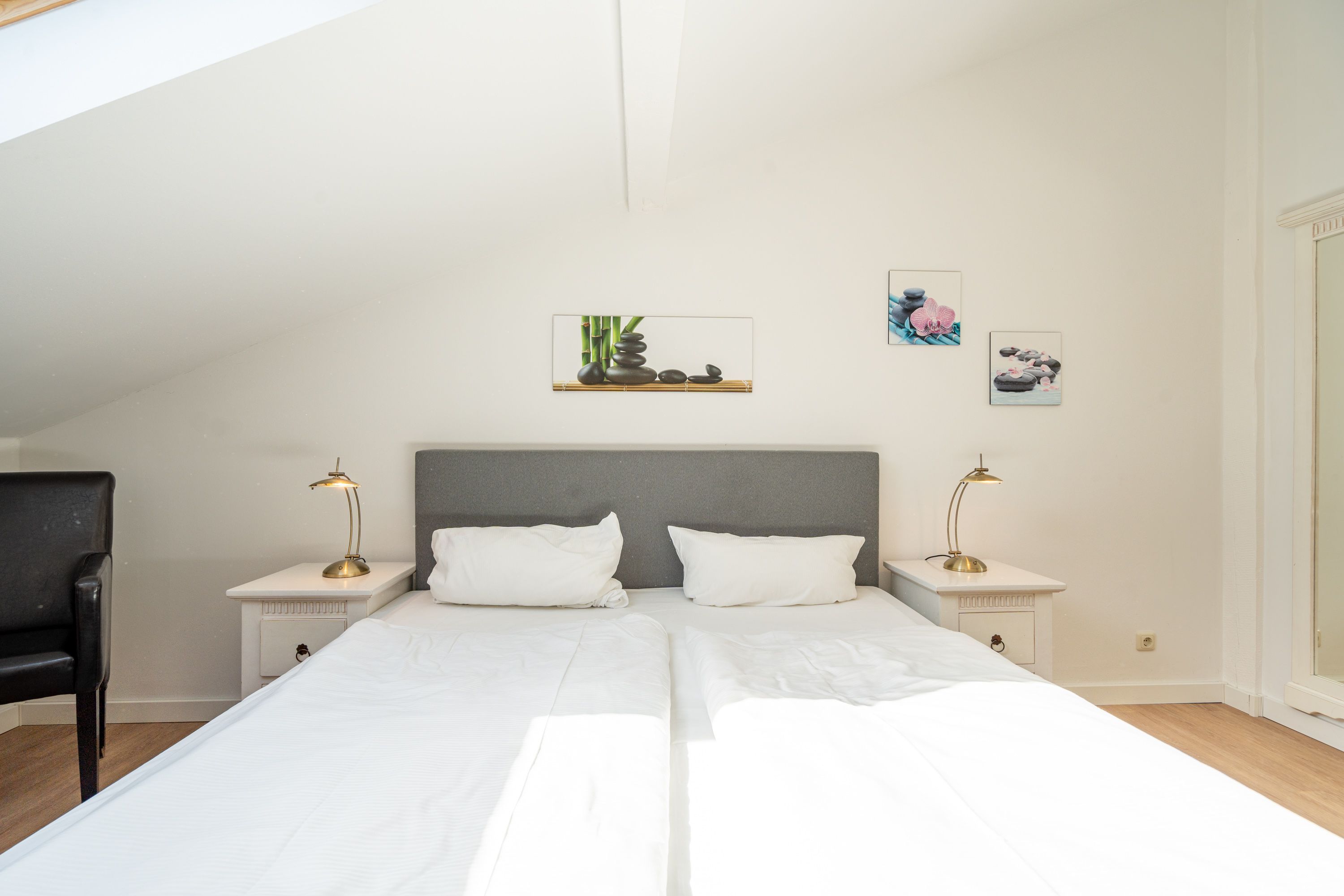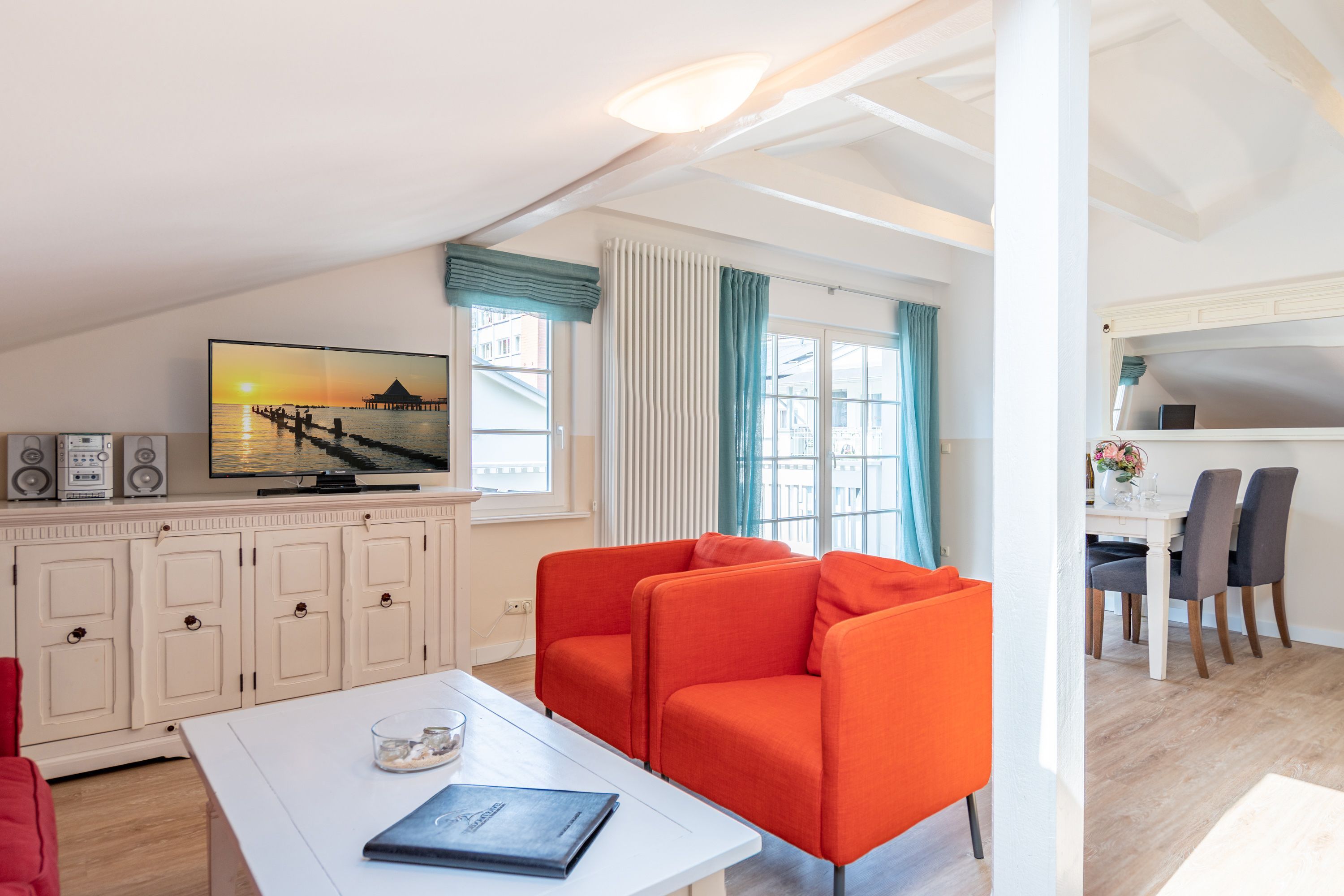 Mit 78 m² bietet diese Dachgeschosswohnung reichlich Platz für einen entspannten Urlaub mit Familie oder Freunden. Zwei Schlafzimmer mit Doppelbetten garantieren erholsame Nächte. Im Wohnbereich mit Sitzgruppe, TV, Küchenzeile und Essplatz lässt es sich gemütlich verweilen. Der 6 m² große Westbalkon lädt dazu ein, den Abend bei Sonnenuntergang ausklingen zu lassen. Bad mit Dusche und WC sowie ein Pkw-Stellplatz am Haus runden das Angebot ab.