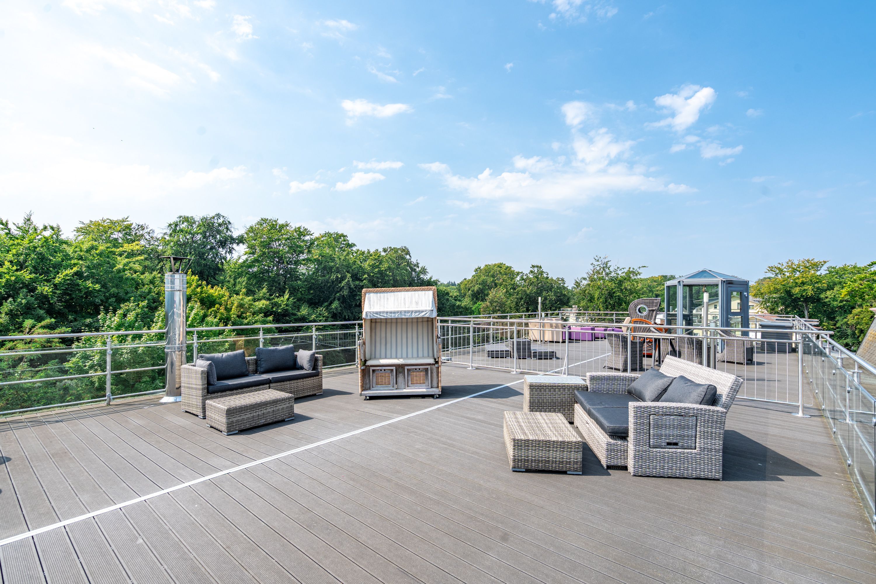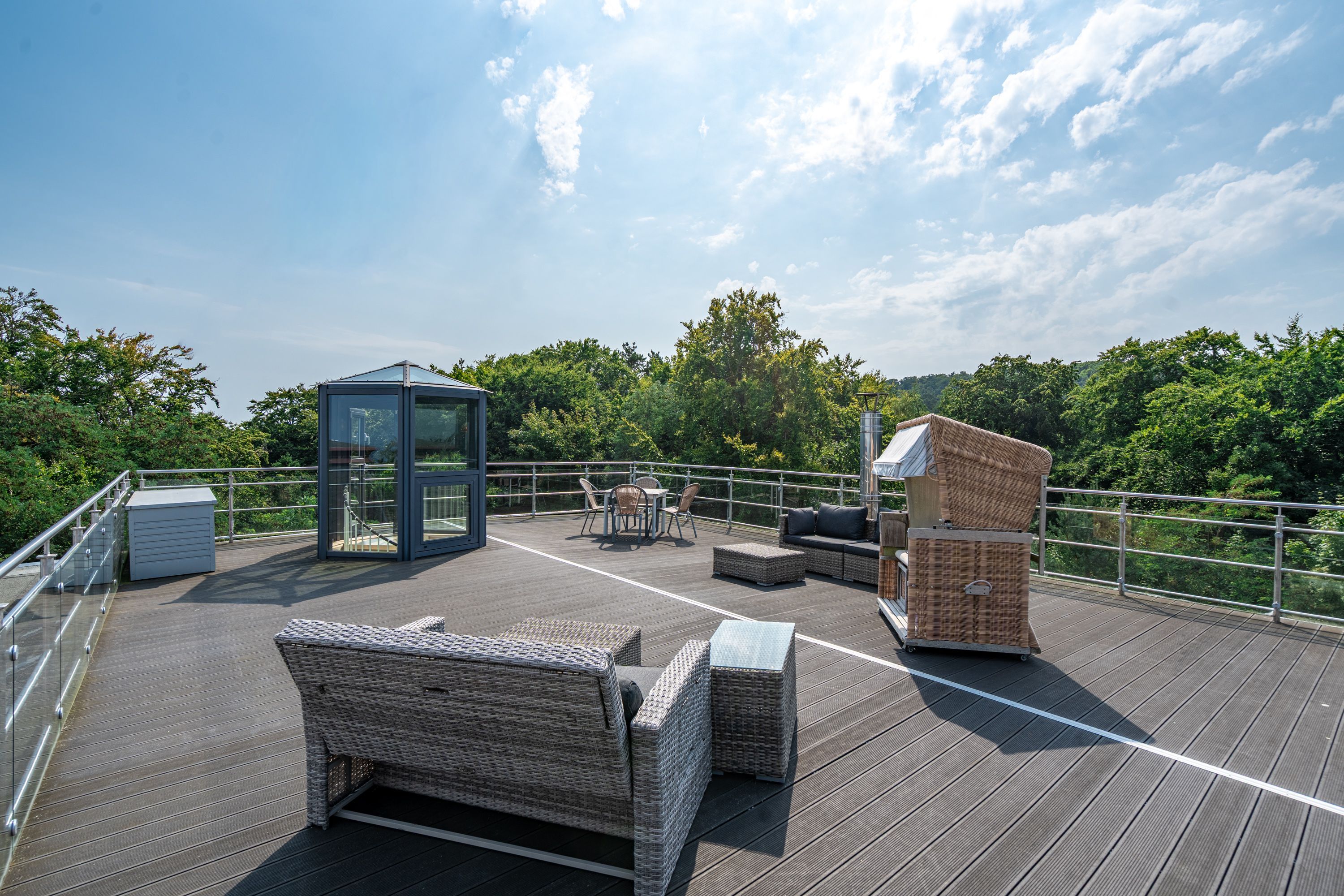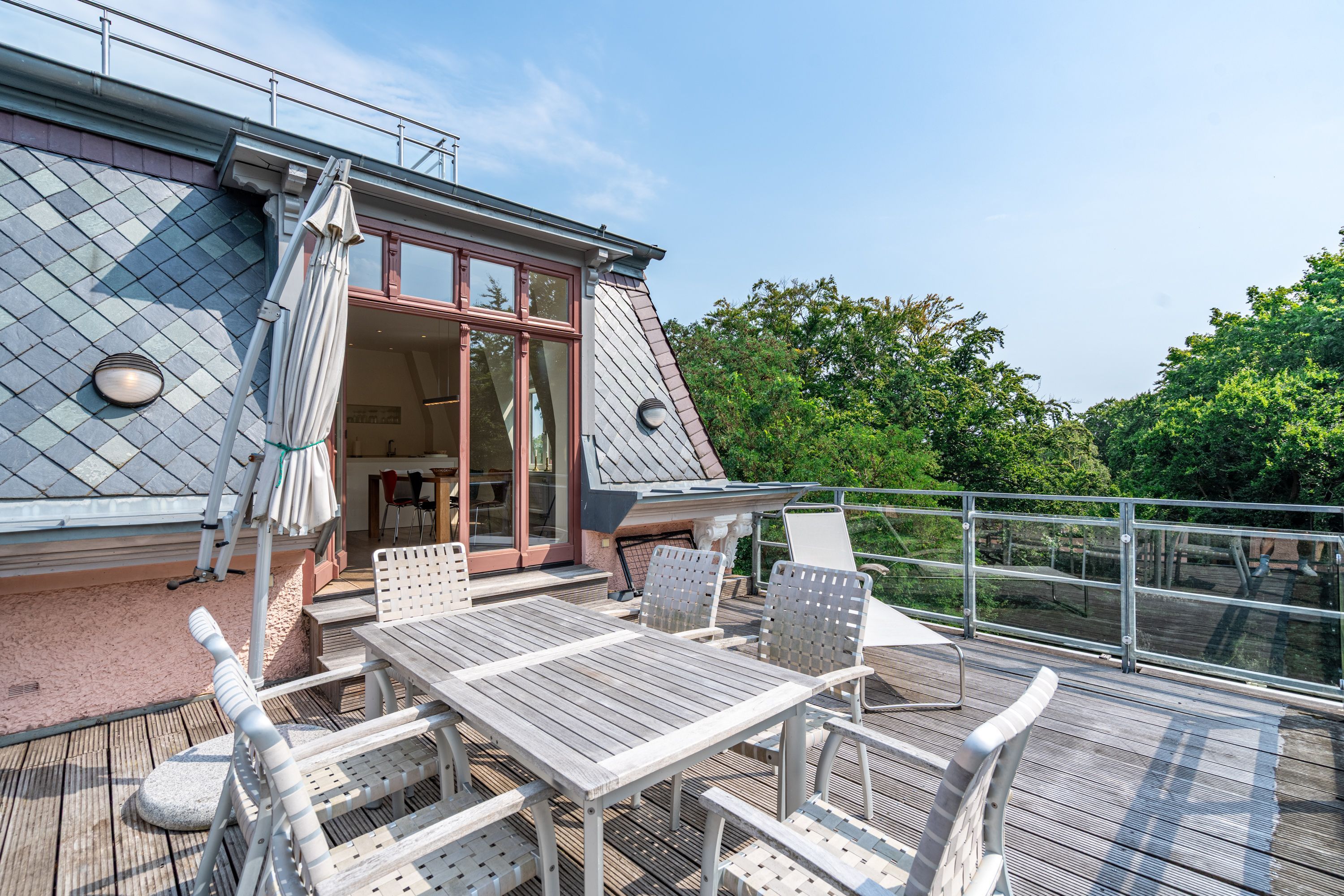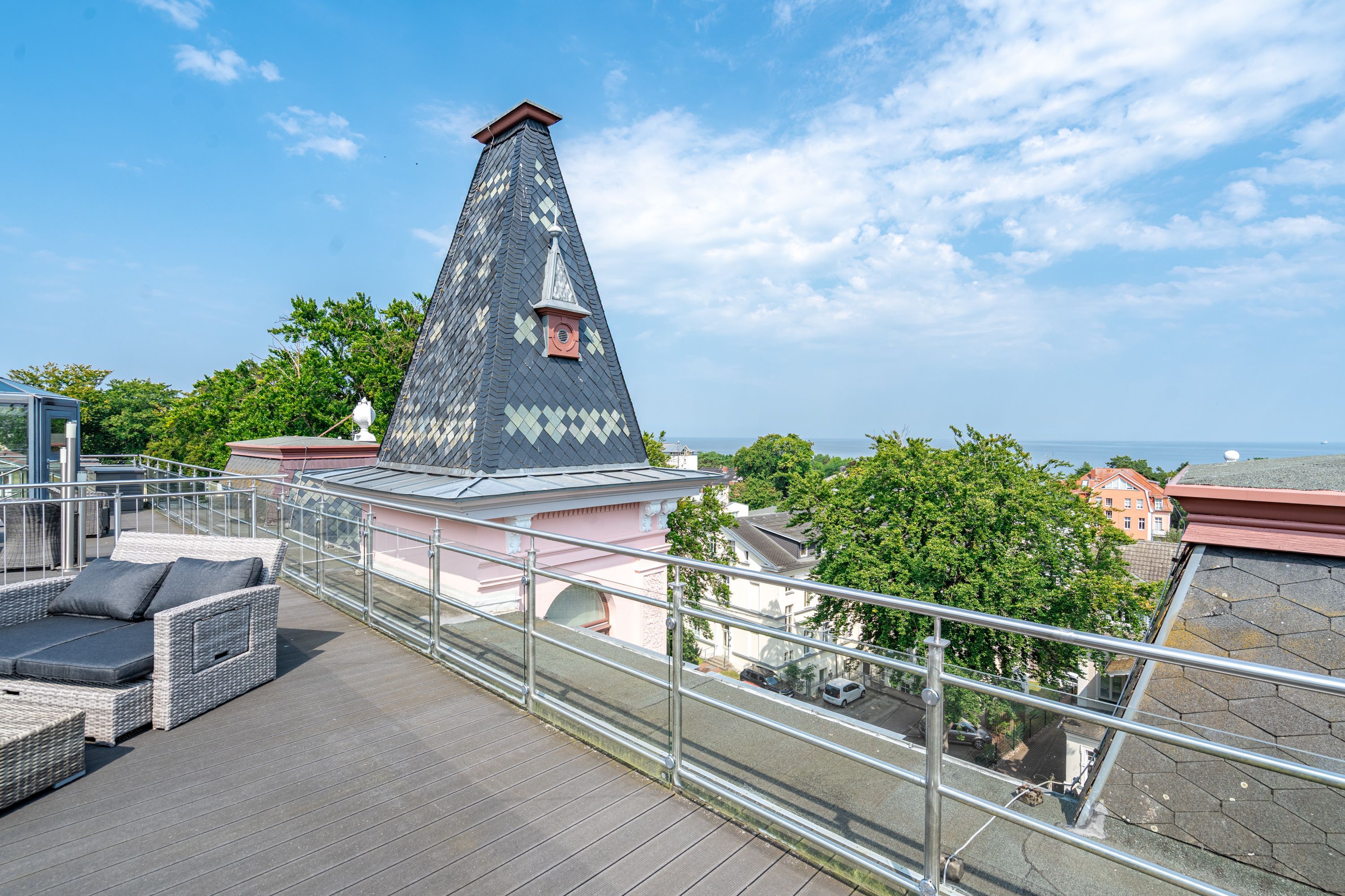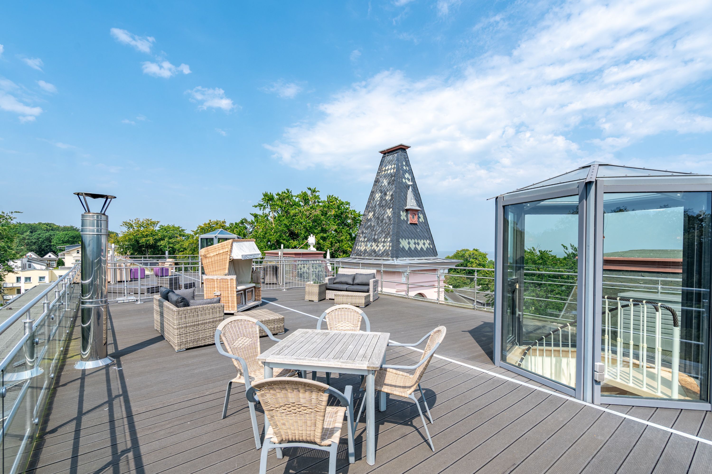 Im Dachgeschoss der Villa Hintze erwarten Sie großzügige 125 qm Luxus! Die neu gestaltete Ferienwohnung 13 (für maximal 4 Personen) offeriert Ihnen ein Wohnambiente der besonderen Art und jede Menge Ausblick auf die Ostsee! Helle, großzügige Räume, moderne Kunst und Möbel von bekannten Designern erfüllen auch anspruchsvolle Urlaubswünsche. Der Wohnbereich mit Sitzgruppe vor dem Kamin und Flat-TV wird ergänzt durch den exklusiven Küchenbereich mit schönem Essplatz. Von hier hat man Zugang zum sonnigen Südbalkon der mit Gartenmöbeln und Sonnenliege von Garpa ausgestattet ist. An den Masterbedroom mit Doppelbett und großem Einbauschrank ist ein wunderschönes Bad mit Badewanne, großer Echtglasdusche und Doppelwaschtisch angegliedert. Und das Beste - schon morgens beim Aufwachen blicken Sie von Ihrem Bett aus über die Dächer der ersten Reihe auf das Meer! Ein zweites, kleineres Schlafzimmer bietet ebenfalls ein Doppelbett (1,60m) und auch ein zweites Bad mit Dusche steht zur Verfügung. Ein ganz besonderes Highlight ist die riesige 100 qm Dachterrasse (über die wohnungseigene Wendeltreppe zu erreichen), die einen traumhaften Blick auf das Meer und Heringsdorf bietet. Hier schaffen die Sitzgruppe, der Strandkorb oder eine bequeme Liegewiese genug Auswahlmöglichkeiten zum Relaxen. In einem separaten Abstellraum auf dem Hausflur können Waschmaschine und Trockener genutzt werden. Für Ihren Komfort sind die Betten bei der Anreise bezogen und Handtücher liegen bereit. Ein Pkw-Stellplatz steht auf dem abgeschlossenen Grundstück zur Verfügung. Das WLAN in der Wohnung ist kostenlos nutzbar.