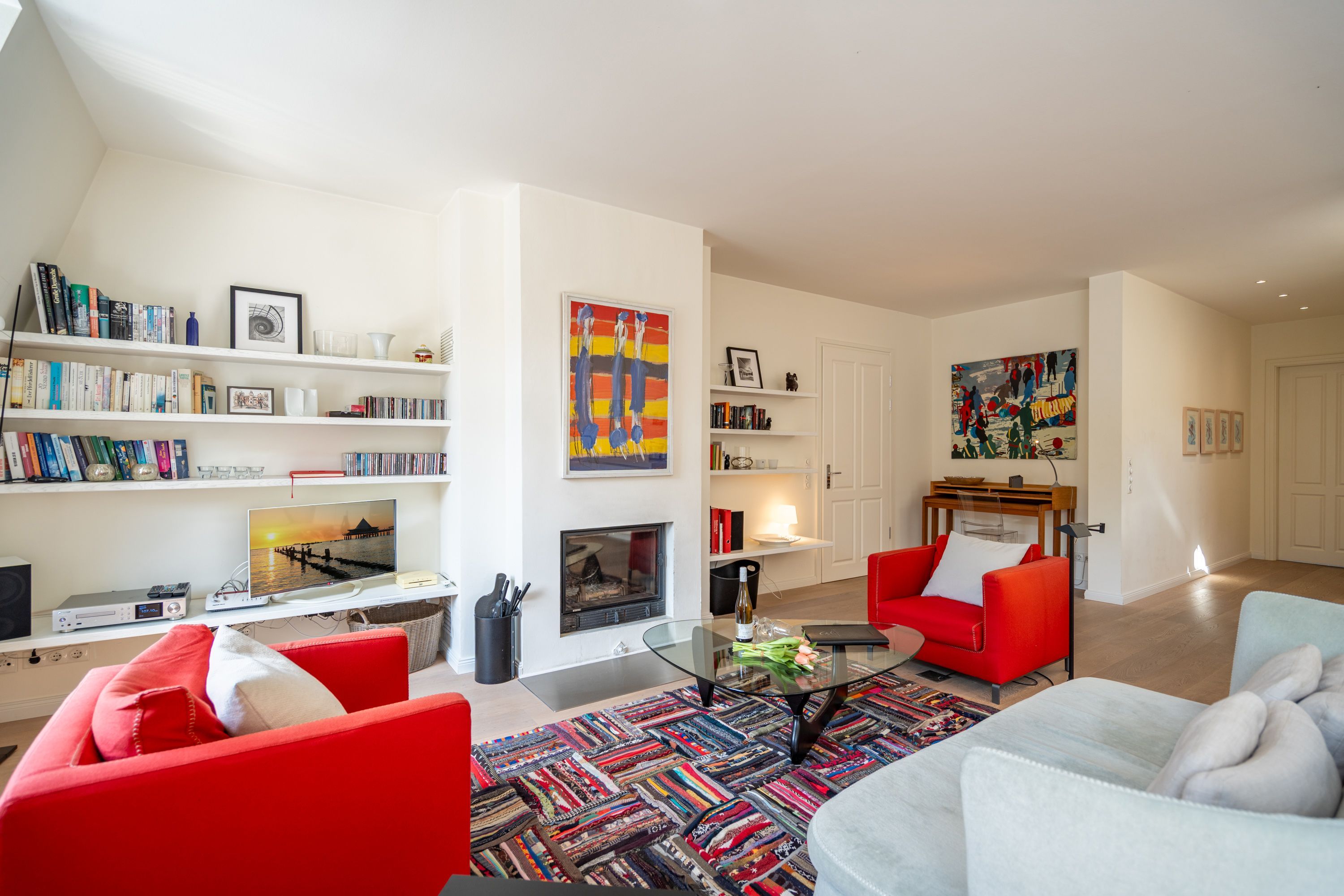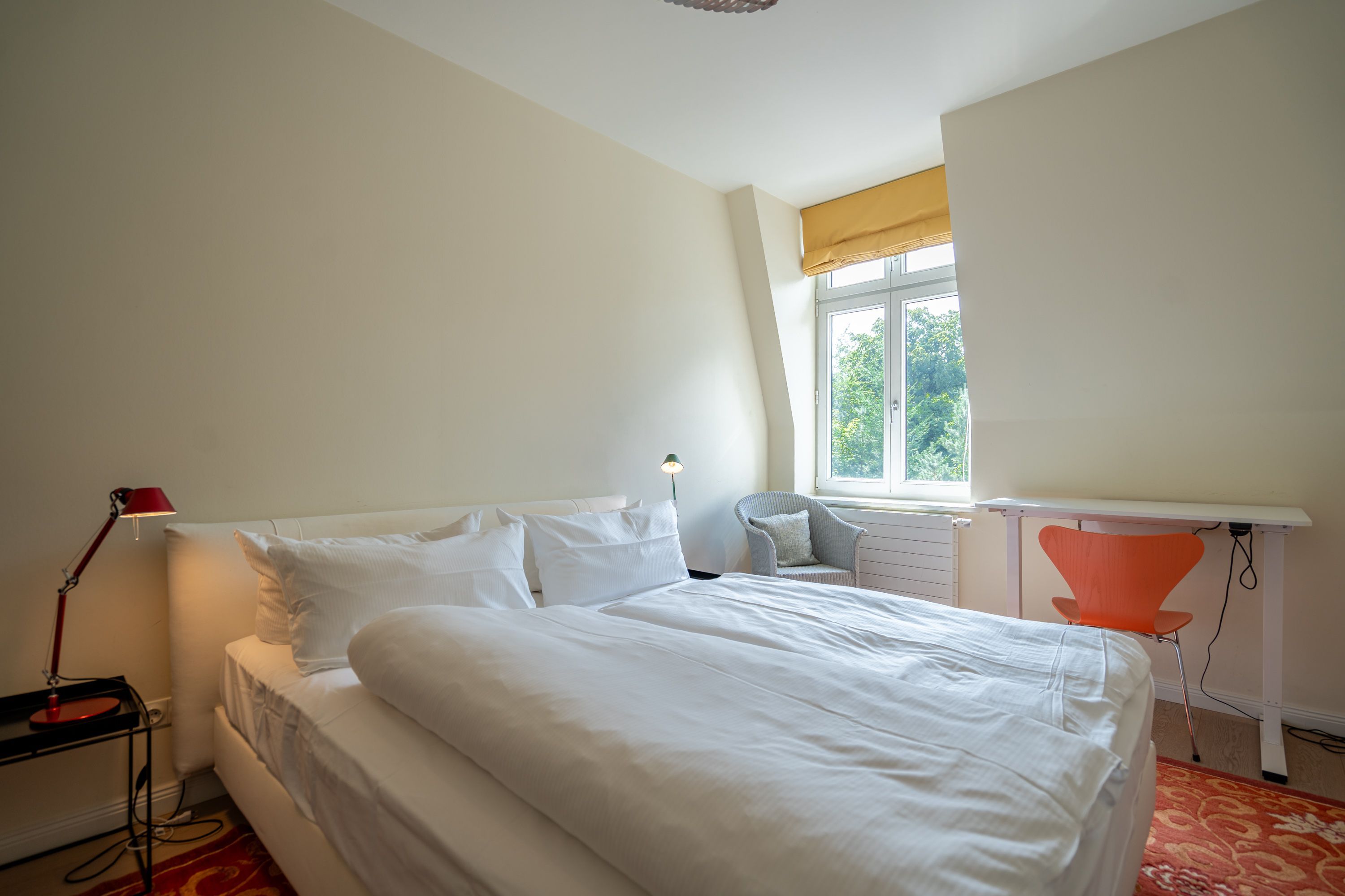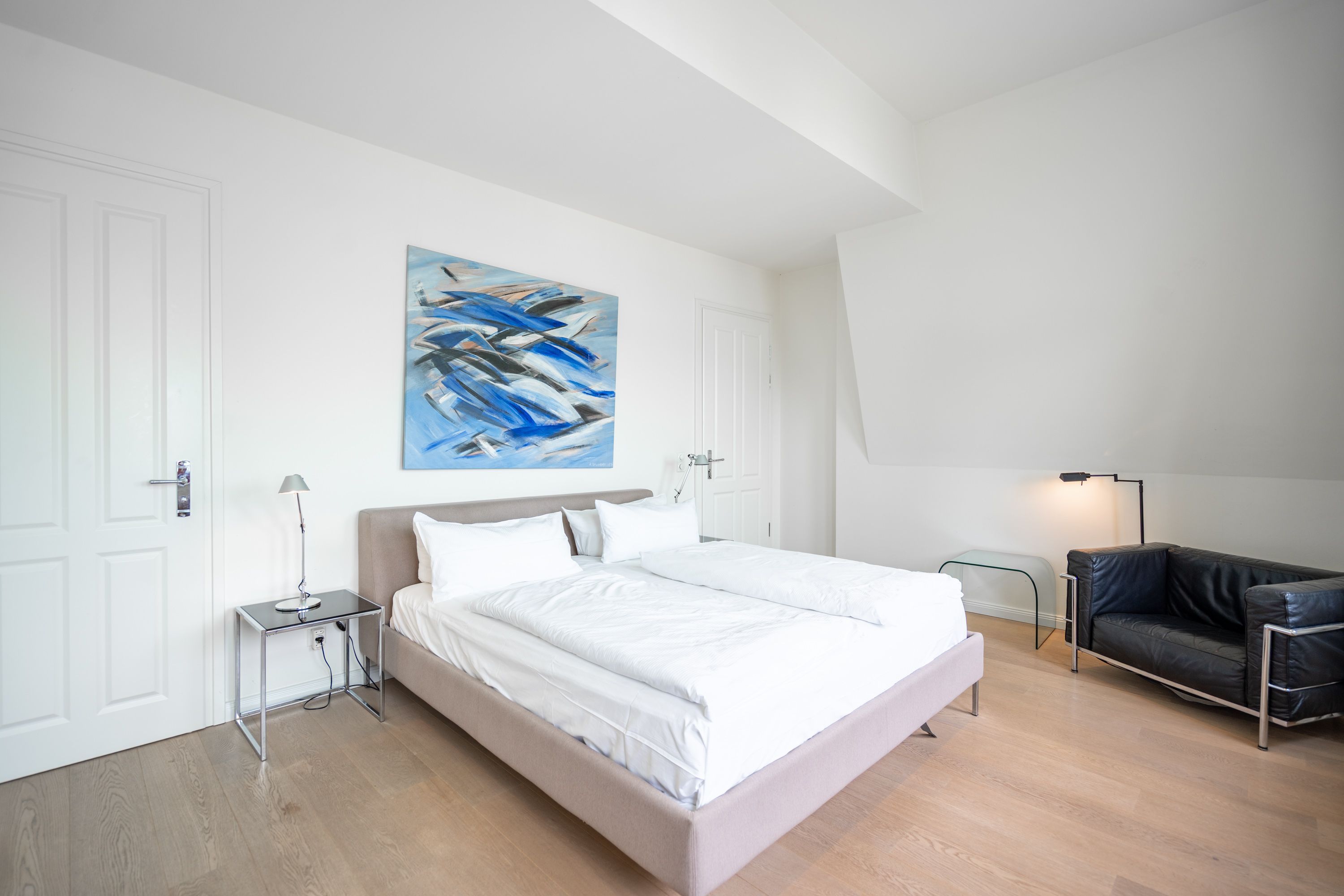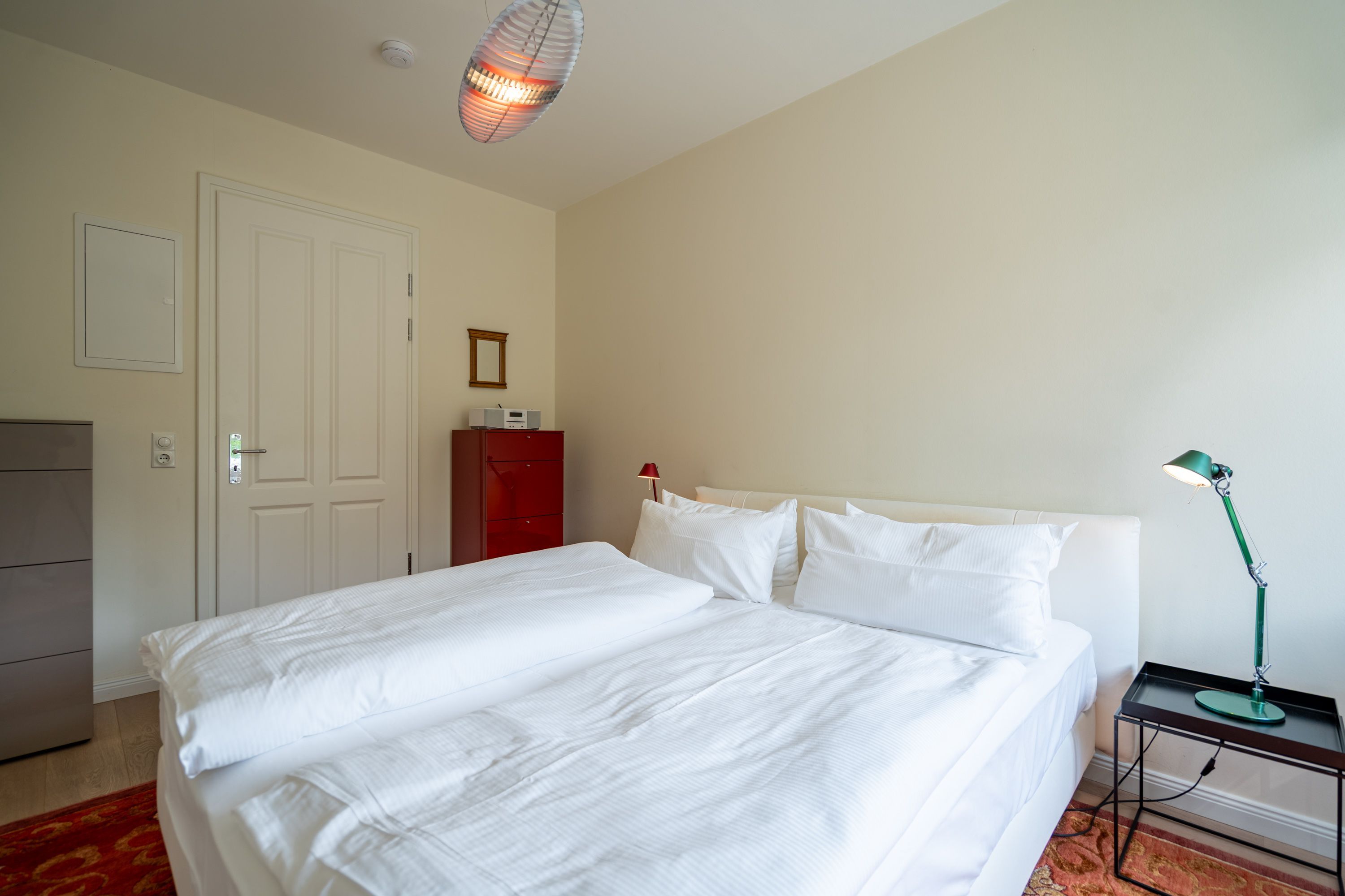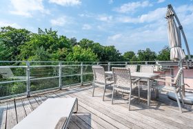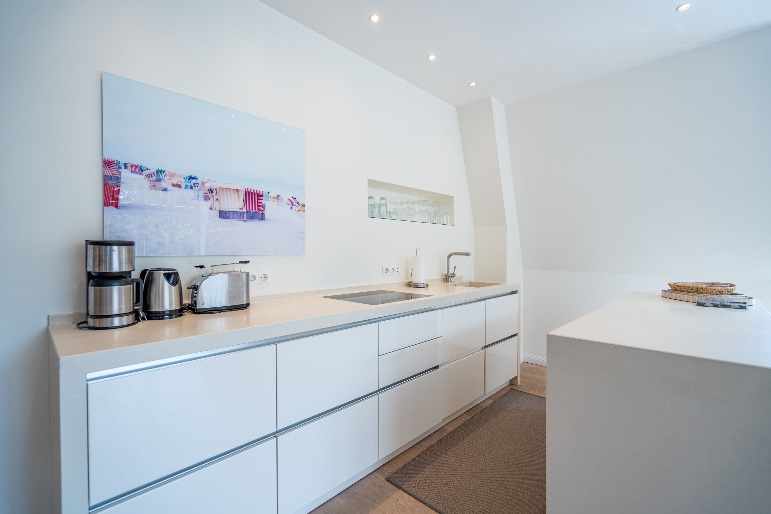 Im Dachgeschoss der Villa Hintze erwarten Sie großzügige 125 qm Luxus! Die neu gestaltete Ferienwohnung 13 (für maximal 4 Personen) offeriert Ihnen ein Wohnambiente der besonderen Art und jede Menge Ausblick auf die Ostsee! Helle, großzügige Räume, moderne Kunst und Möbel von bekannten Designern erfüllen auch anspruchsvolle Urlaubswünsche. Der Wohnbereich mit Sitzgruppe vor dem Kamin und Flat-TV wird ergänzt durch den exklusiven Küchenbereich mit schönem Essplatz. Von hier hat man Zugang zum sonnigen Südbalkon der mit Gartenmöbeln und Sonnenliege von Garpa ausgestattet ist. An den Masterbedroom mit Doppelbett und großem Einbauschrank ist ein wunderschönes Bad mit Badewanne, großer Echtglasdusche und Doppelwaschtisch angegliedert. Und das Beste - schon morgens beim Aufwachen blicken Sie von Ihrem Bett aus über die Dächer der ersten Reihe auf das Meer! Ein zweites, kleineres Schlafzimmer bietet ebenfalls ein Doppelbett (1,60m) und auch ein zweites Bad mit Dusche steht zur Verfügung. Ein ganz besonderes Highlight ist die riesige 100 qm Dachterrasse (über die wohnungseigene Wendeltreppe zu erreichen), die einen traumhaften Blick auf das Meer und Heringsdorf bietet. Hier schaffen die Sitzgruppe, der Strandkorb oder eine bequeme Liegewiese genug Auswahlmöglichkeiten zum Relaxen. In einem separaten Abstellraum auf dem Hausflur können Waschmaschine und Trockener genutzt werden. Für Ihren Komfort sind die Betten bei der Anreise bezogen und Handtücher liegen bereit. Ein Pkw-Stellplatz steht auf dem abgeschlossenen Grundstück zur Verfügung. Das WLAN in der Wohnung ist kostenlos nutzbar.