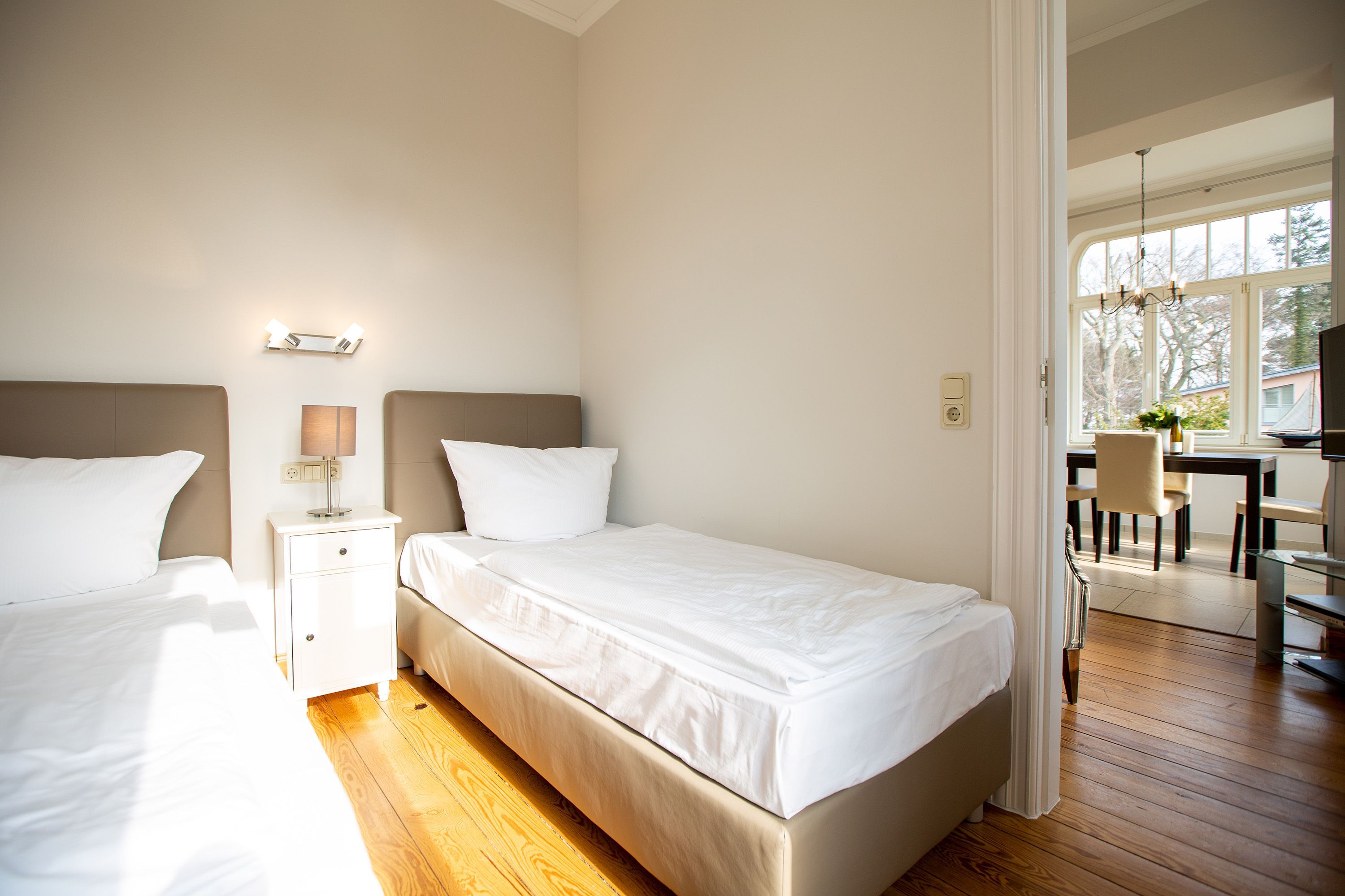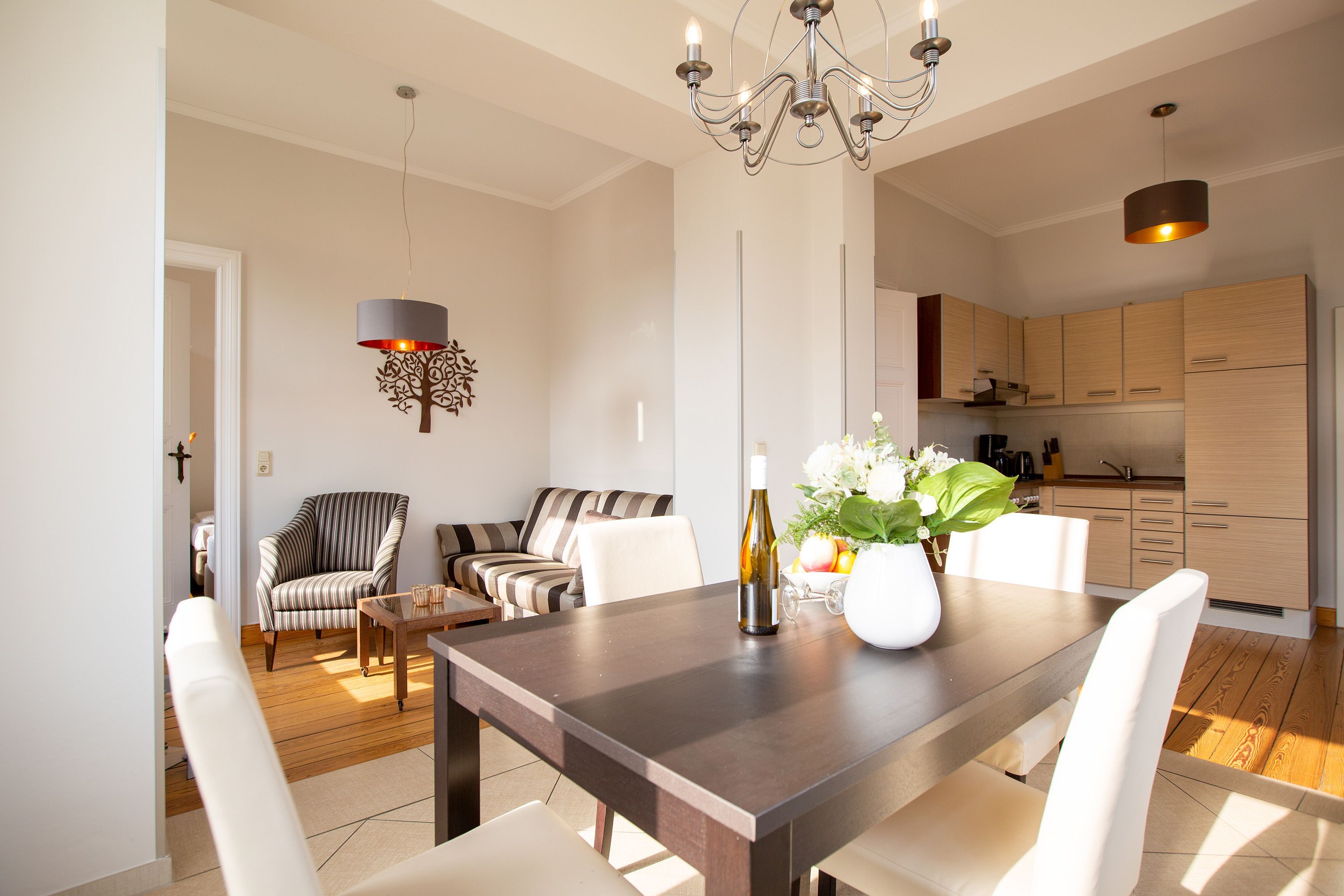 Ankommen und Wohlfühlen. Die Ferienwohnung 3 im ersten Obergeschoss der Villa gelegen, bietet alles was man für einen gelungenen Urlaub auf Usedom braucht. Der moderne Wohnbereich mit Flachbild-TV wird ergänzt durch eine offene, komplett ausgestattete Küche und einen schönen Essbereich. Zwei Schlafzimmer bieten Platz für 4 Gäste. Für Ihren Komfort steht die Erstausstattung Wäsche (Bettwäsche & Handtücher) für Sie bereit. Schon am Morgen genießen Sie die Sonne auf dem großzügigen Balkon.