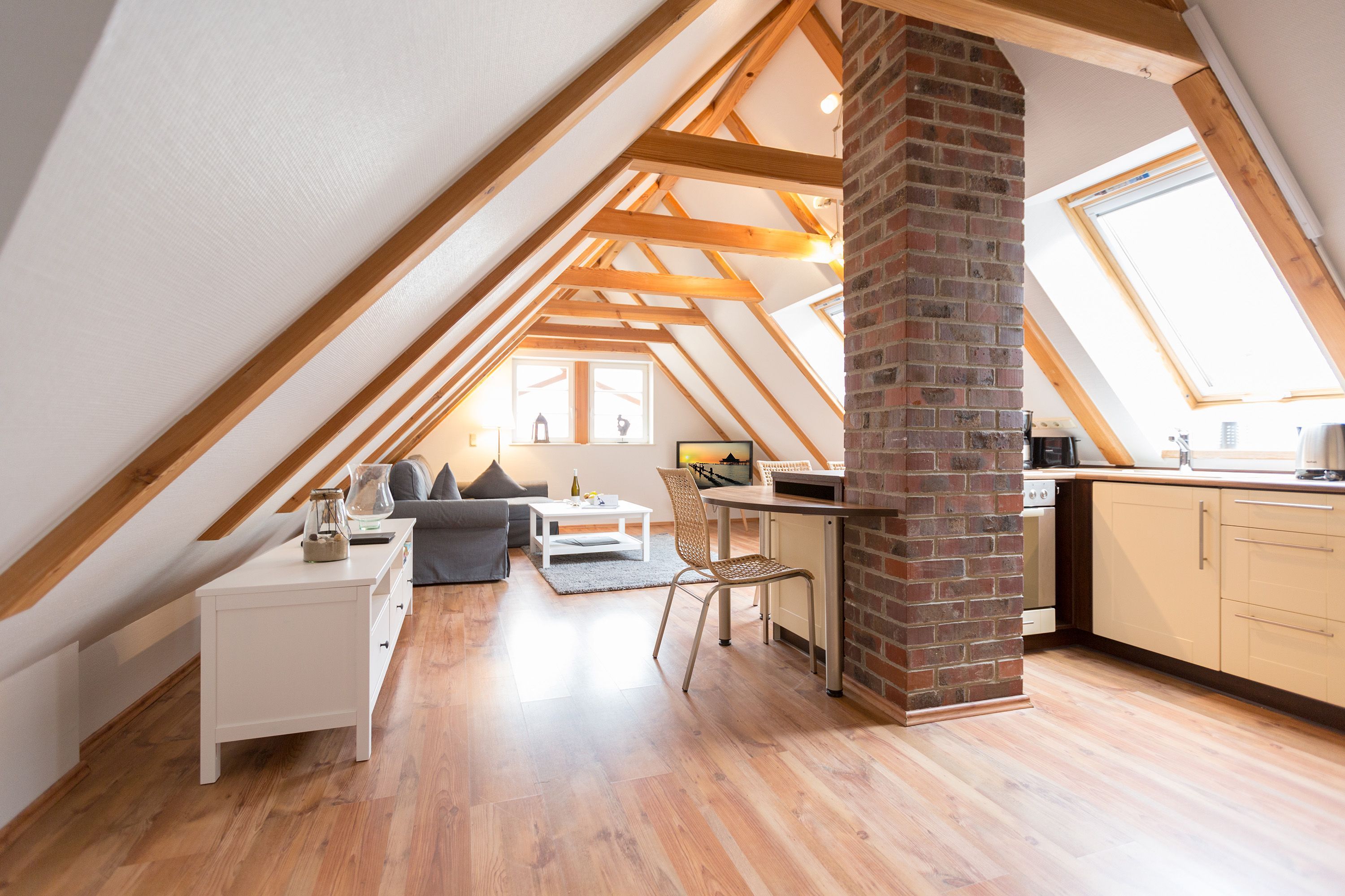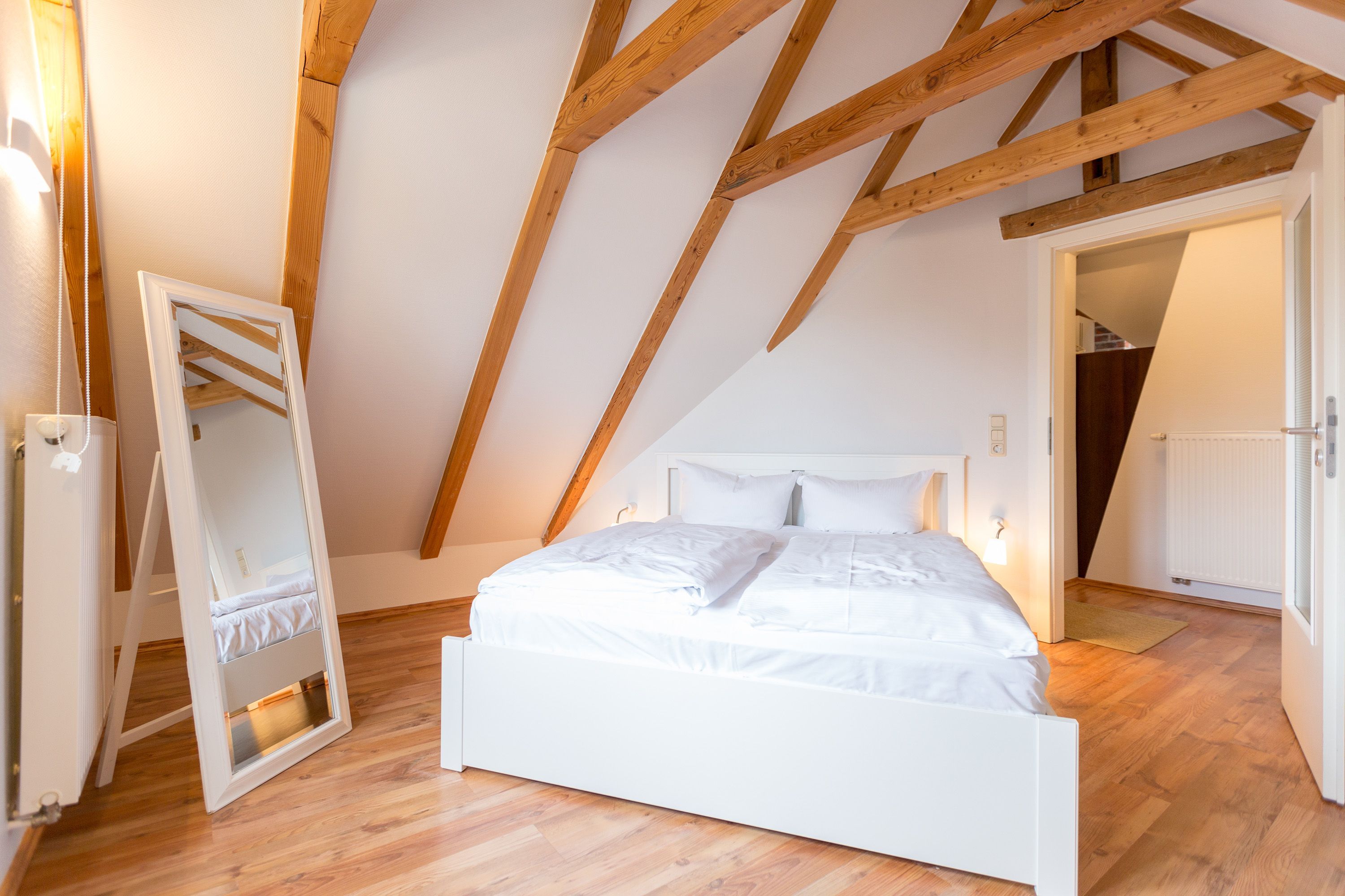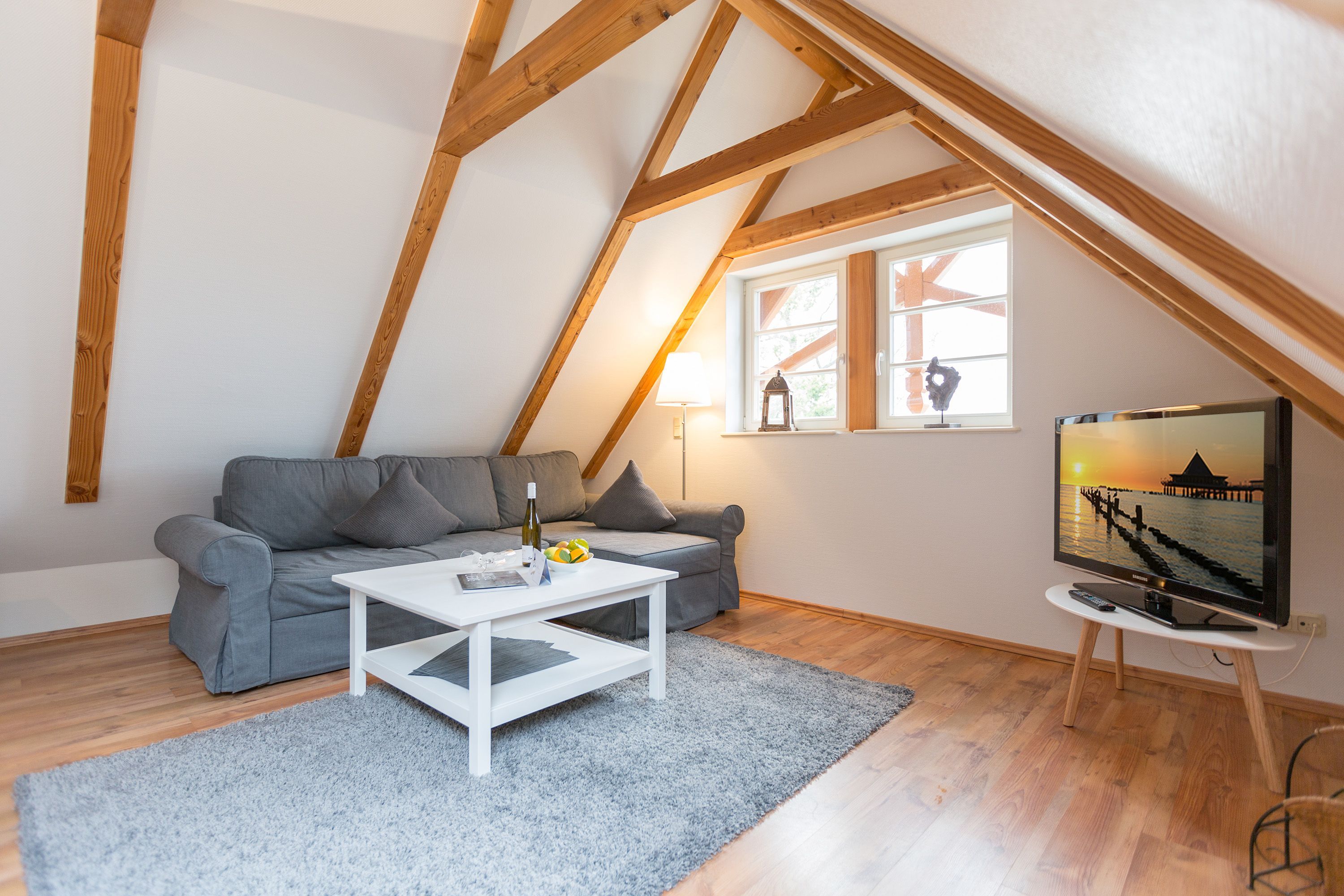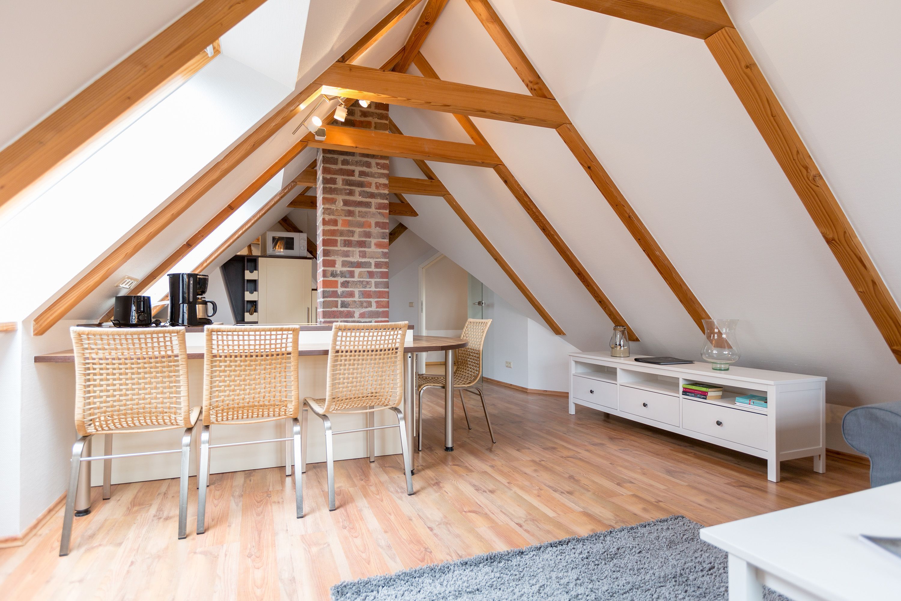 Klein, aber fein und ganz gemütlich unter dem Dach - die helle, freundliche Ferienwohnung im Dachgeschoss der Villa ist 45 qm groß. Baulich bedingt müssen größer gewachsene Gäste im Flurbereich ihren Kopf kurz einziehen weil die ursprüngliche Balkenlage im Dachgeschoss erhalten wurde. Modern, komfortabel und geschmackvoll eingerichtet, bietet es zwei Personen und einem Kleinkind (bis 3 Jahre) Platz zum Wohlfühlen. Das Appartement verfügt über ein Wohnzimmer mit Küchenzeile, ein Schlafzimmer mit Doppelbett und ein Bad mit Dusche und WC. Auf Wunsch stellen wir für unsere kleinen Gäste ein Kinderreisebett (ohne zusätzliche Matratze & Bettzeug) und einen Kinderhochstuhl (gegen einen Aufpreis) zur Verfügung.
