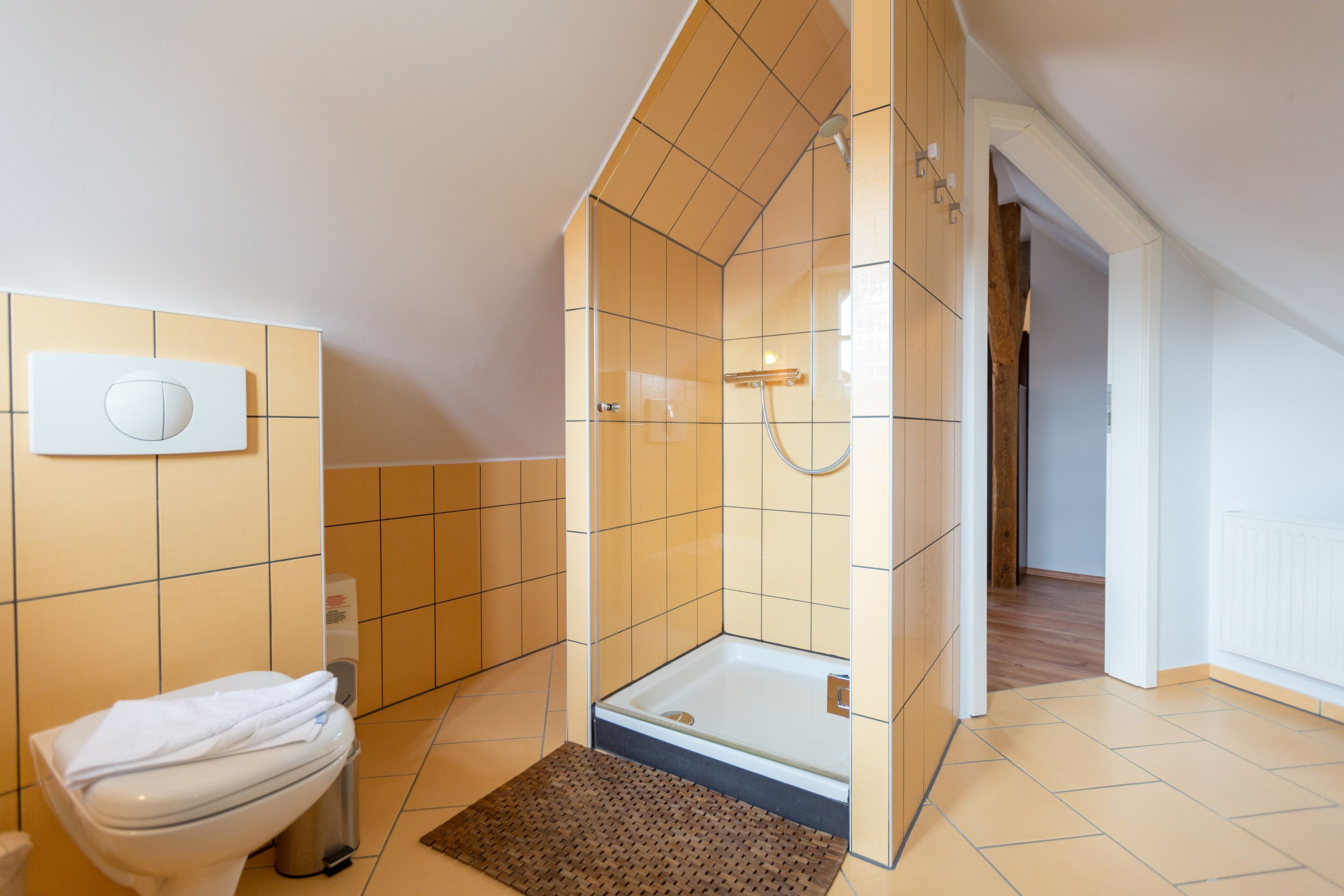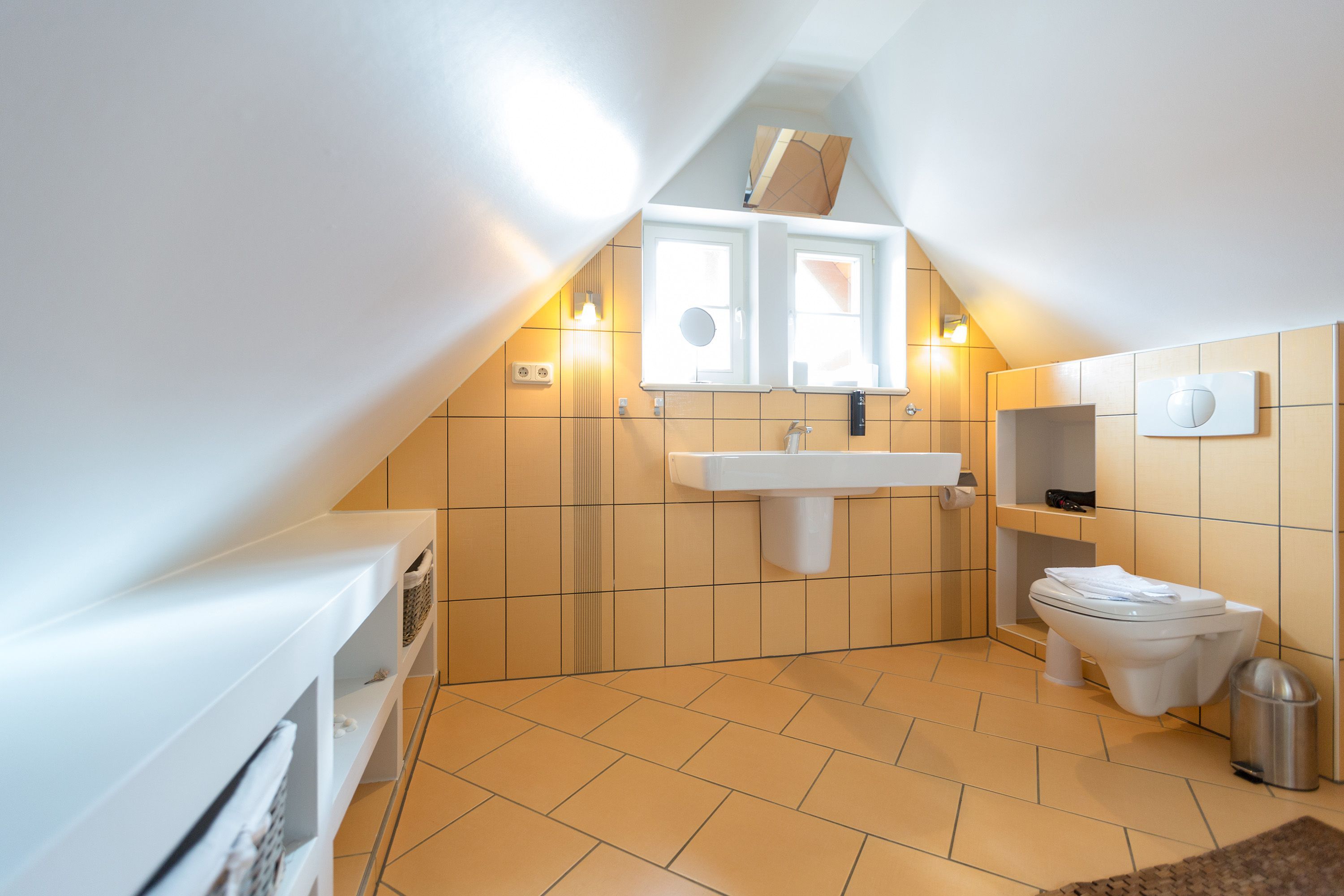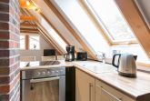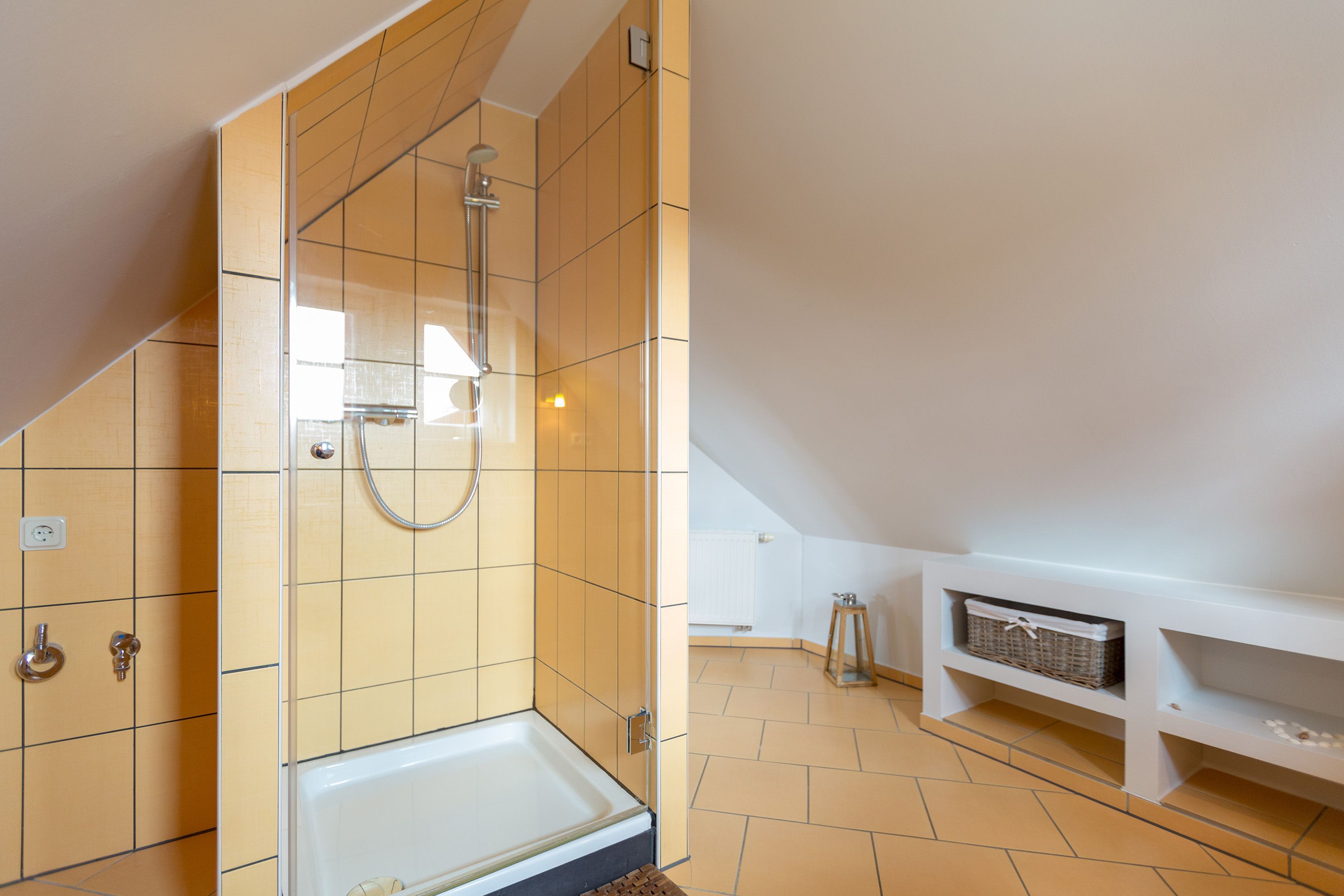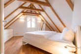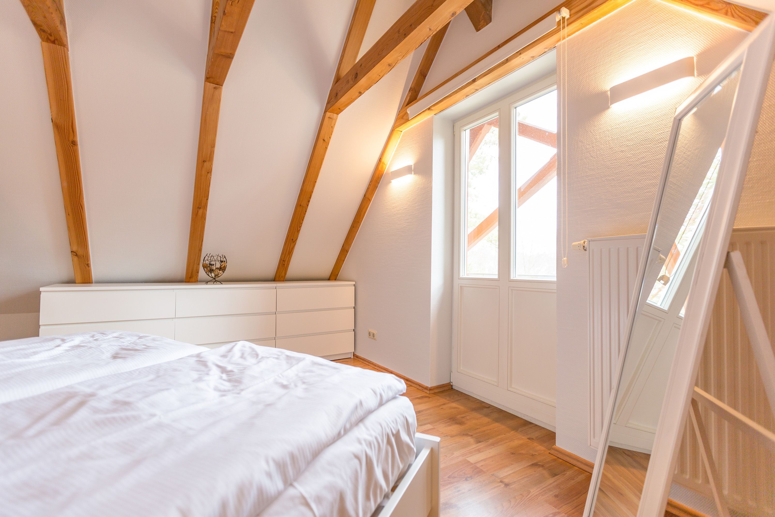 Klein, aber fein und ganz gemütlich unter dem Dach - die helle, freundliche Ferienwohnung im Dachgeschoss der Villa ist 45 qm groß. Baulich bedingt müssen größer gewachsene Gäste im Flurbereich ihren Kopf kurz einziehen weil die ursprüngliche Balkenlage im Dachgeschoss erhalten wurde. Modern, komfortabel und geschmackvoll eingerichtet, bietet es zwei Personen und einem Kleinkind (bis 3 Jahre) Platz zum Wohlfühlen. Das Appartement verfügt über ein Wohnzimmer mit Küchenzeile, ein Schlafzimmer mit Doppelbett und ein Bad mit Dusche und WC. Auf Wunsch stellen wir für unsere kleinen Gäste ein Kinderreisebett (ohne zusätzliche Matratze & Bettzeug) und einen Kinderhochstuhl (gegen einen Aufpreis) zur Verfügung.
