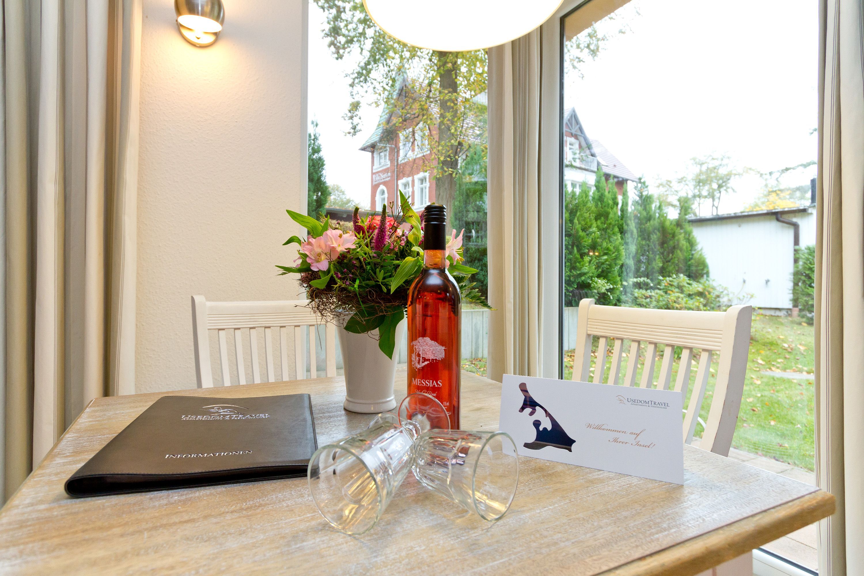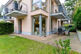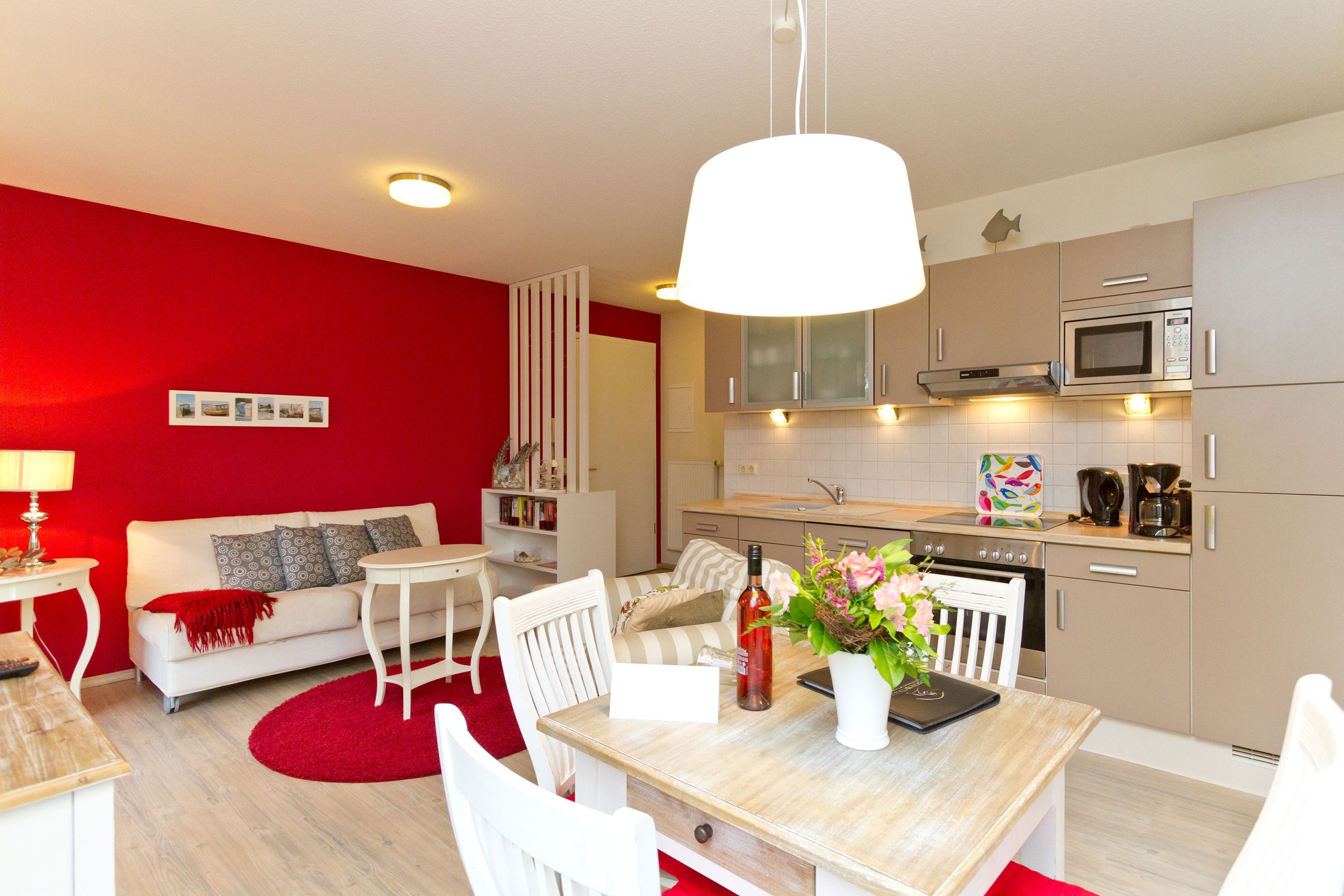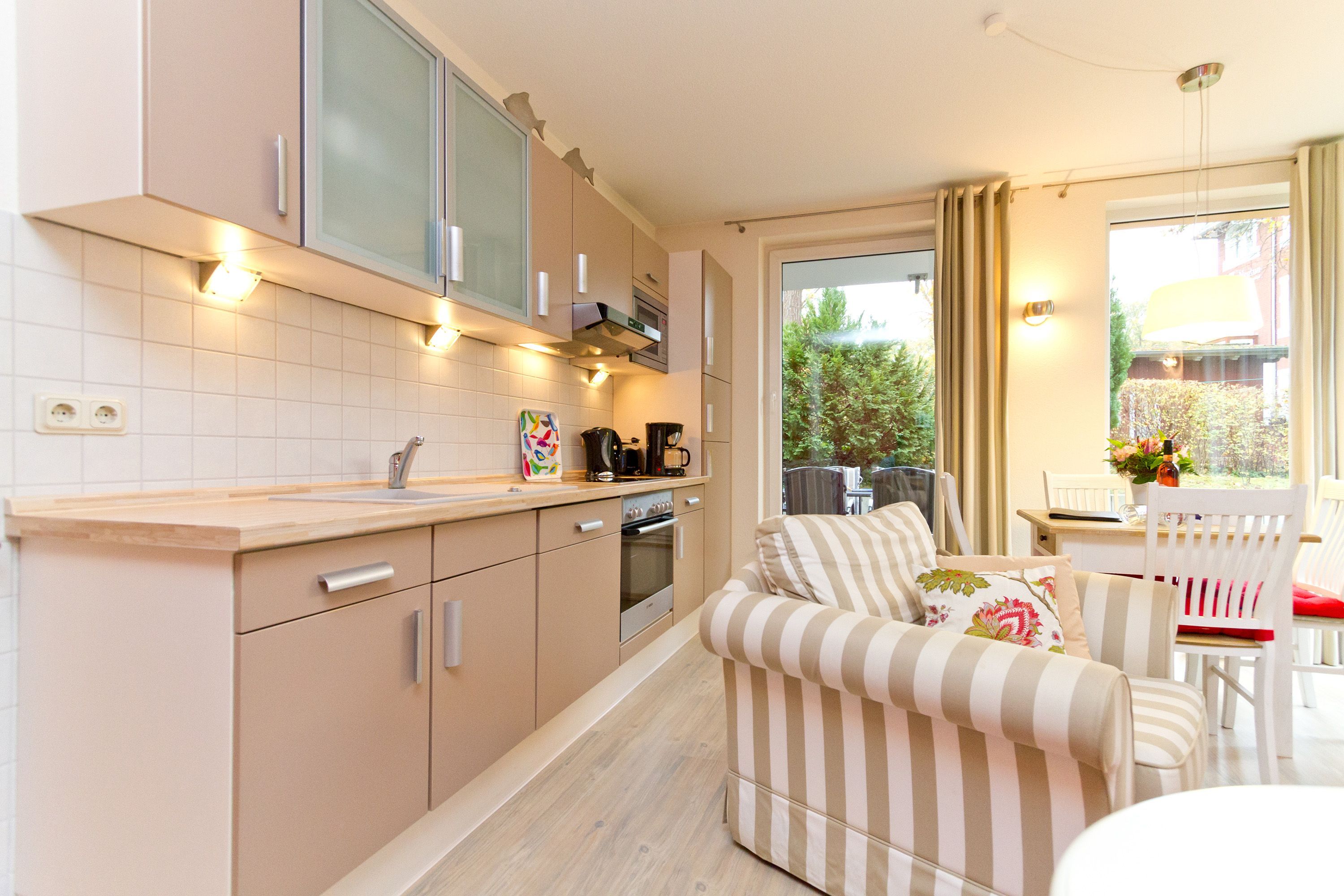 Diese 2-Raum-Ferienwohnung besticht durch eine zeitlos elegante Einrichtung und harmonierende Stoffe und Farben. Das helle Wohnzimmer mit Flachbild-TV und die komplett ausgestattete Küchenzeile eignen sich für einen komfortablen Urlaub. Im stylischen Schlafzimmer mit Doppelbett (1,80m x 2,00m) findet auch ein Babyreisebett Platz. Auf der umlaufenden Terrasse genießen sie die Morgen- und Nachmittagssonne und als besonderes Bonbon steht Ihnen noch ein kleines Teehäuschen vor Ihrer Terrasse zur Verfügung. Auf Wunsch stellen wir für unsere kleinen Gäste ein Kinderreisebett (ohne zusätzliche Matratze & Bettzeug) und einen Kinderhochstuhl ( gegen einen Aufpreis) zur Verfügung. Für Ihren Komfort sind die Betten bei der Anreise bezogen und Handtücher liegen bereit. Ein tolles Domizil für zwei Erwachsene und ein Kleinkind.