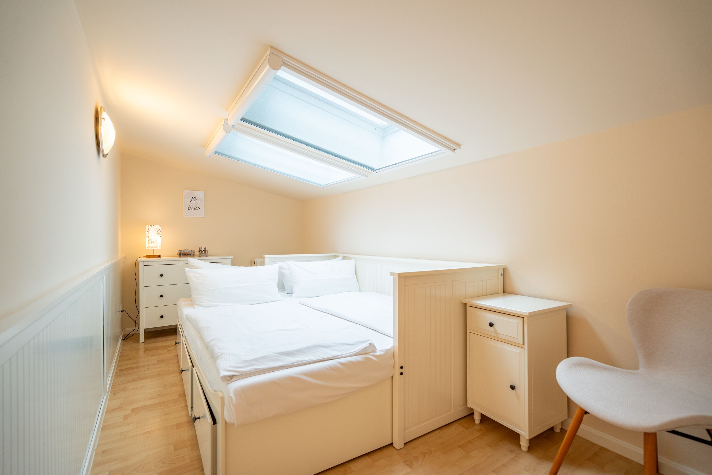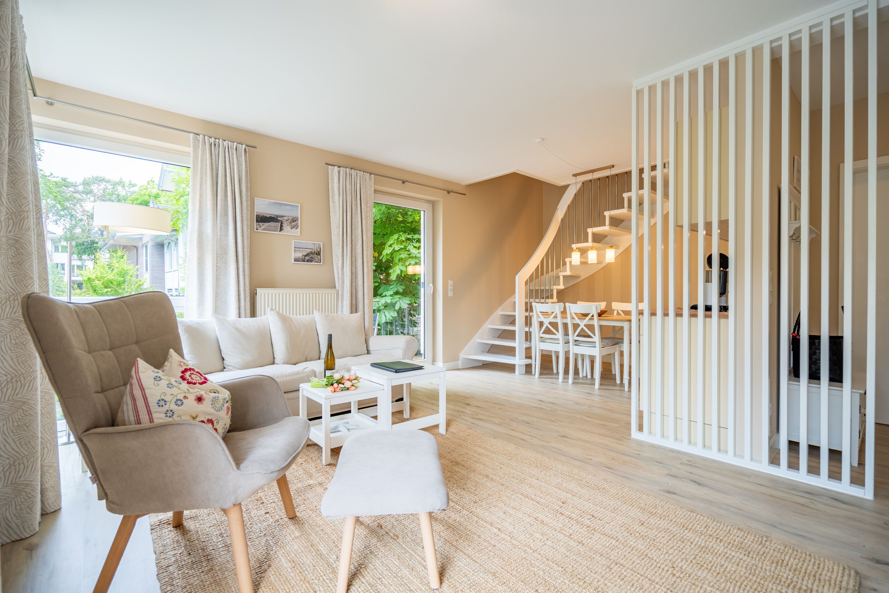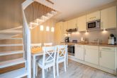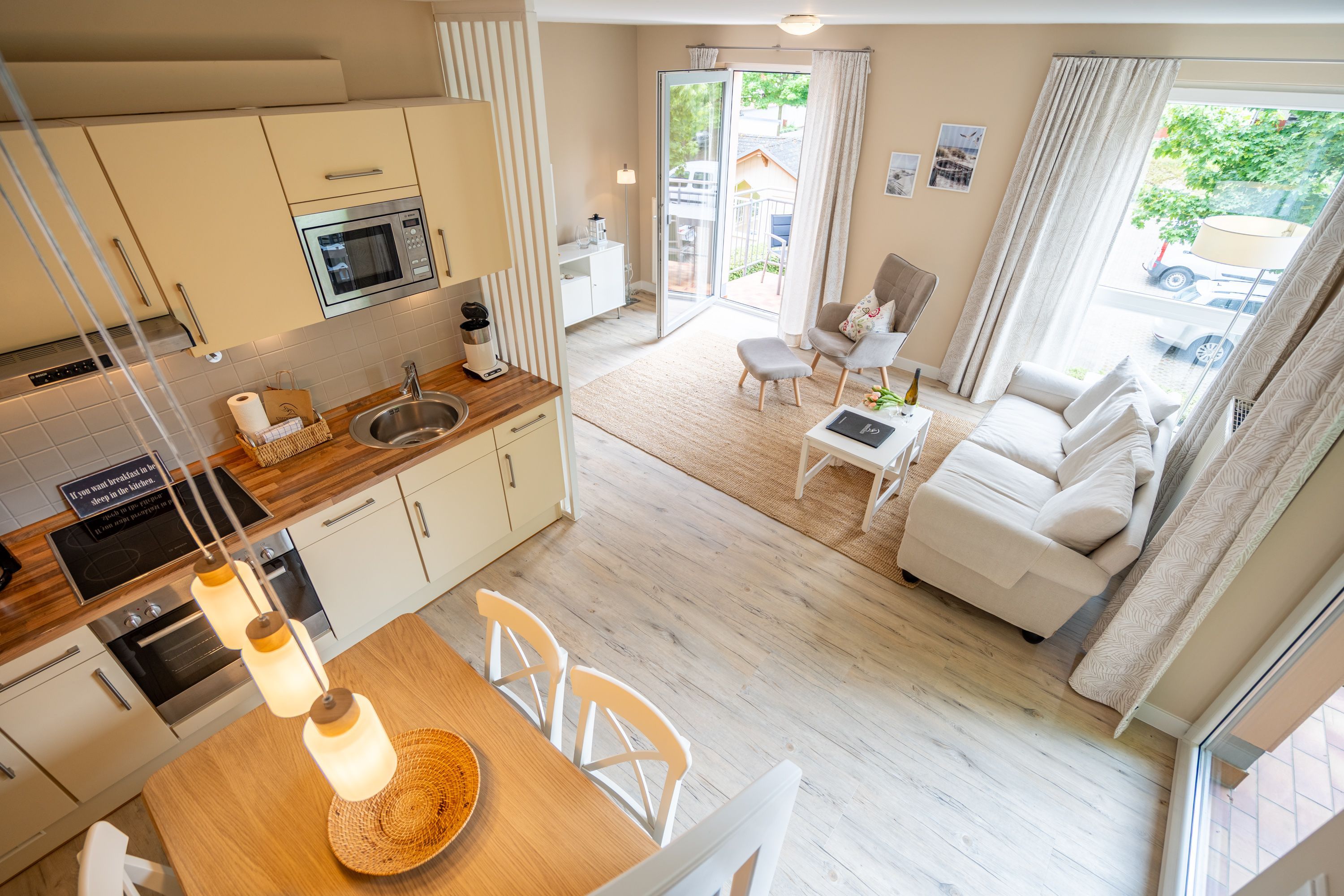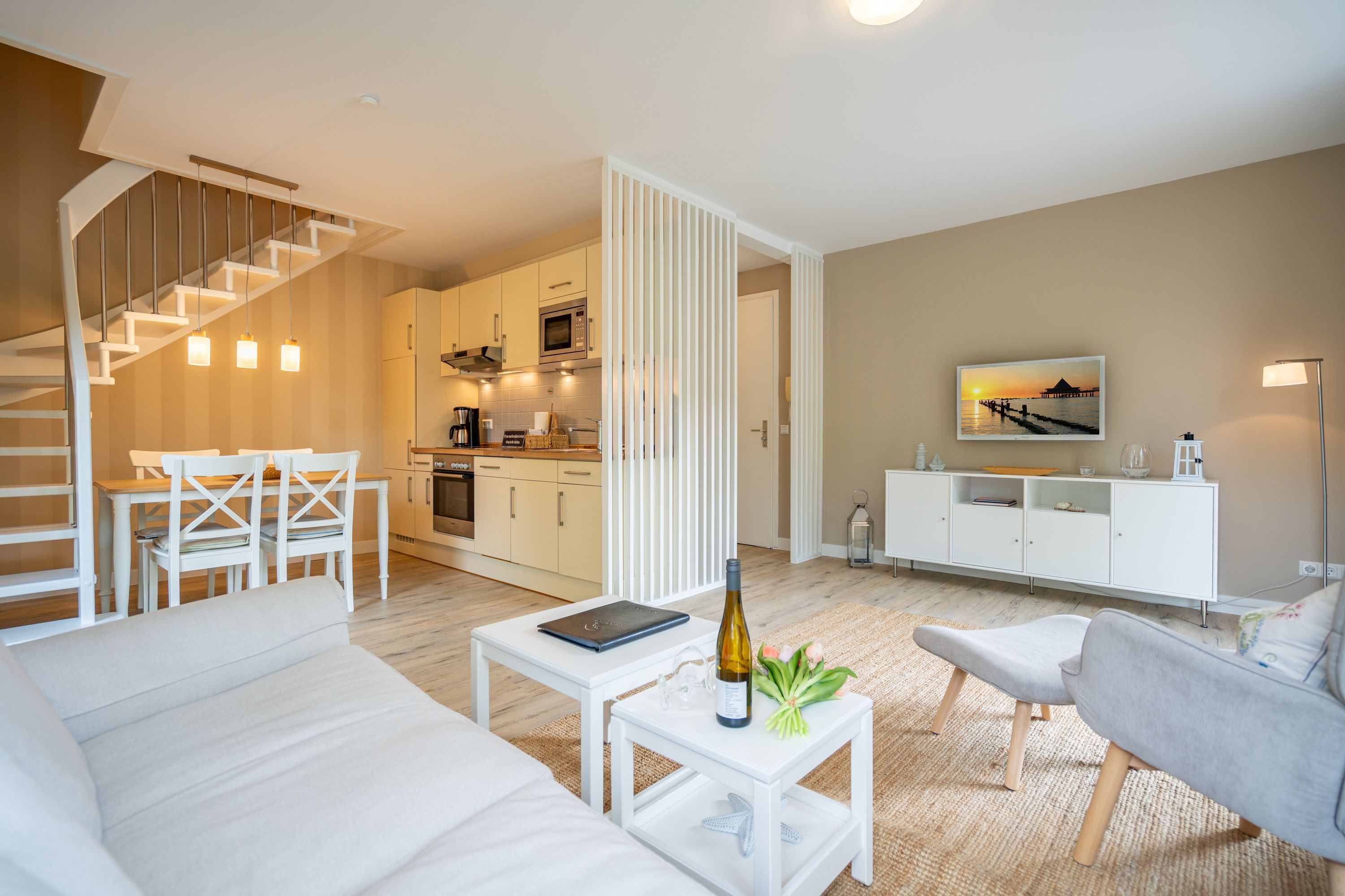 Die helle und freundlich eingerichtete 3-Raum-Ferienwohnung erstreckt sich über 2 Etagen und bietet Ihnen Platz zum Wohlfühlen und Entspannen. In der unteren Etage lässt der lichtdurchflutete Wohnbereich mit offener, komplett ausgestatteter Küchenzeile, 2 großen Südbalkonen und dem Gäste-WC keine Wünsche offen. Eine moderne, hochwertige Ausstattung und liebevolle Details versprechen einen traumhaften Urlaub. Das Schlafzimmer mit Doppelbett, ein Kinderzimmer mit einem ausziehbaren Tages/Doppelbett, sowie das Bad mit Dusche erwarten Sie im Obergeschoss. Auf Wunsch stellen wir für unsere kleinen Gäste ein Kinderreisebett (ohne zusätzliche Matratze & Bettzeug) und einen Kinderhochstuhl ( gegen einen Aufpreis) zur Verfügung. Für Ihren Komfort sind die Betten bei der Anreise bezogen und Handtücher liegen bereit.