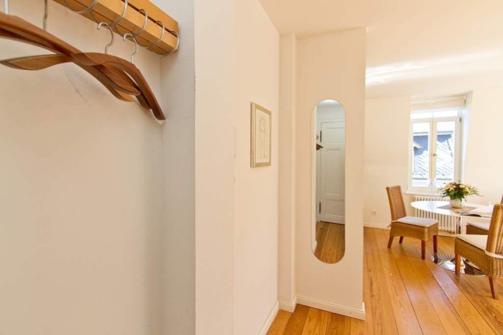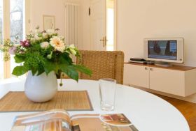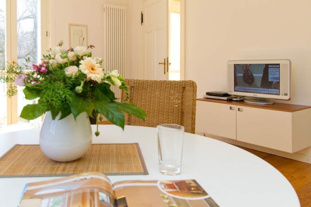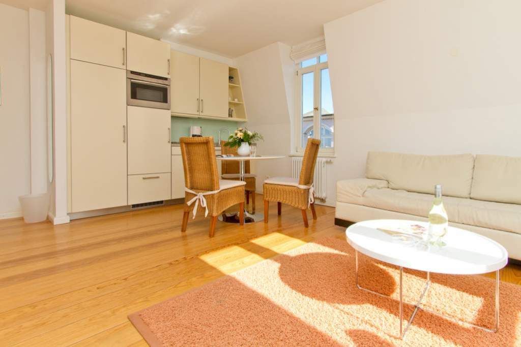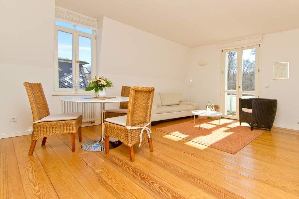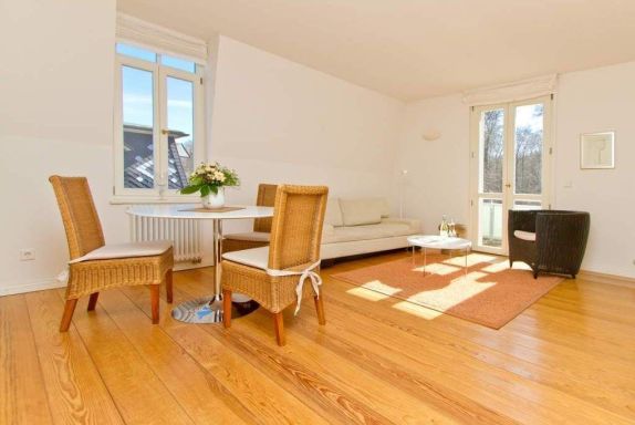 Die Ferienwohnung Korinth in der Villa Artemis befindet sich im zweiten Obergeschoss des Hauses und ist zur Südseite mit Blick auf den Buchenpark ausgerichtet. Die Wohnung überzeugt durch klare Linien, moderne Möblierung und hohe helle Räume. Vom Wohnbereich und Schlafzimmer aus gelangen Sie auf ihren großzügigen Balkon. Hochwertige Materialien, wie Granit Arbeitsplatten auf der Küchenzeile und als Waschtische im Bad, sowie helle Pitchpine Böden unterstreichen den klaren Stil dieser Wohnung. Ein DVD-Player kann Ihnen auf Anfrage zur Verfügung gestellt werden.