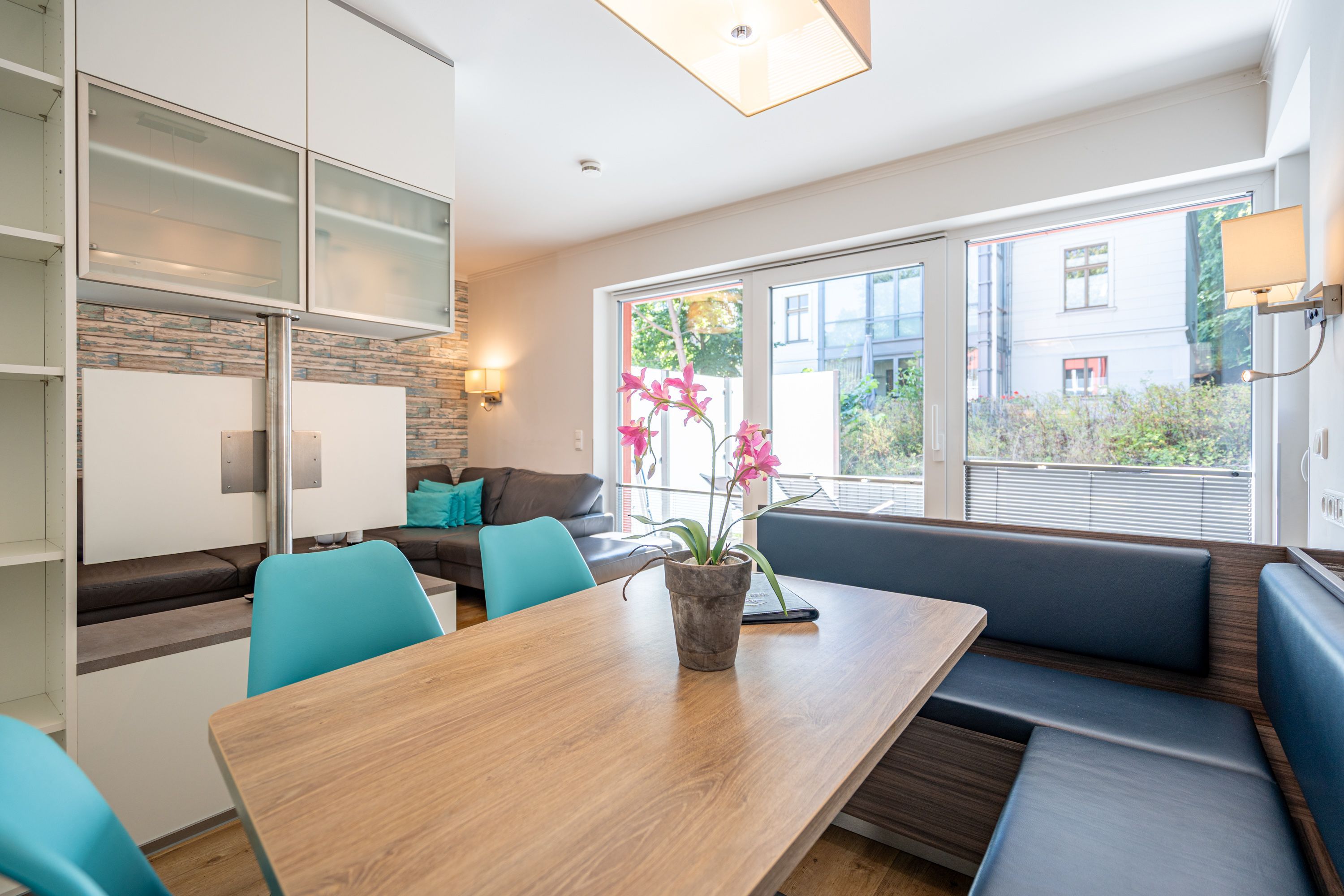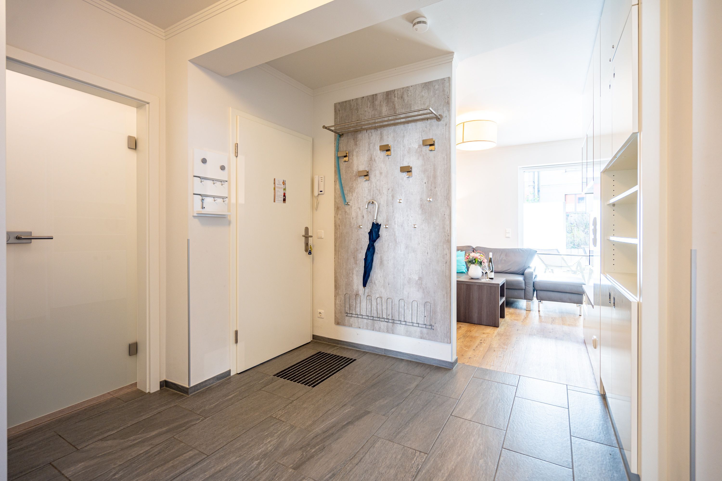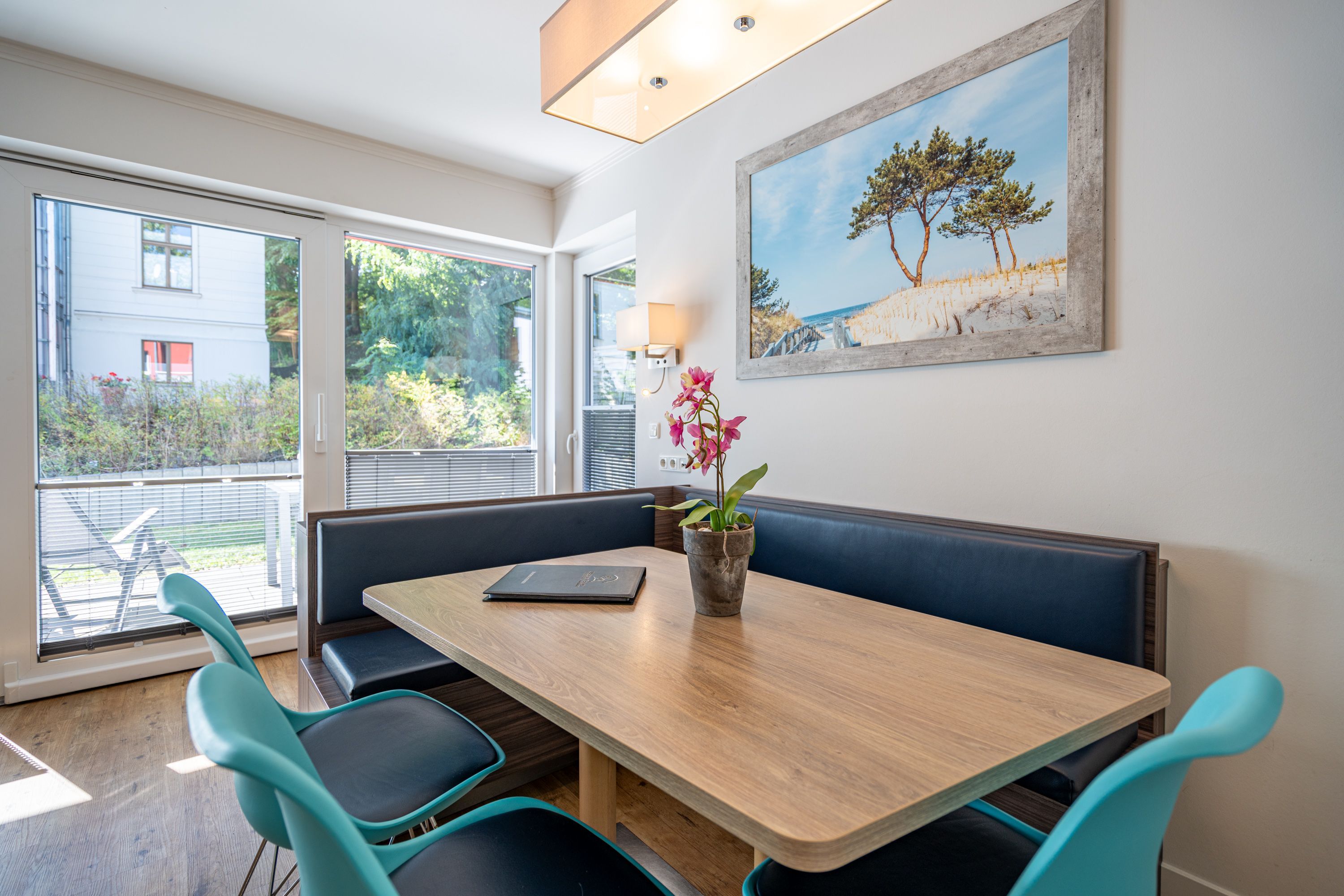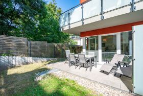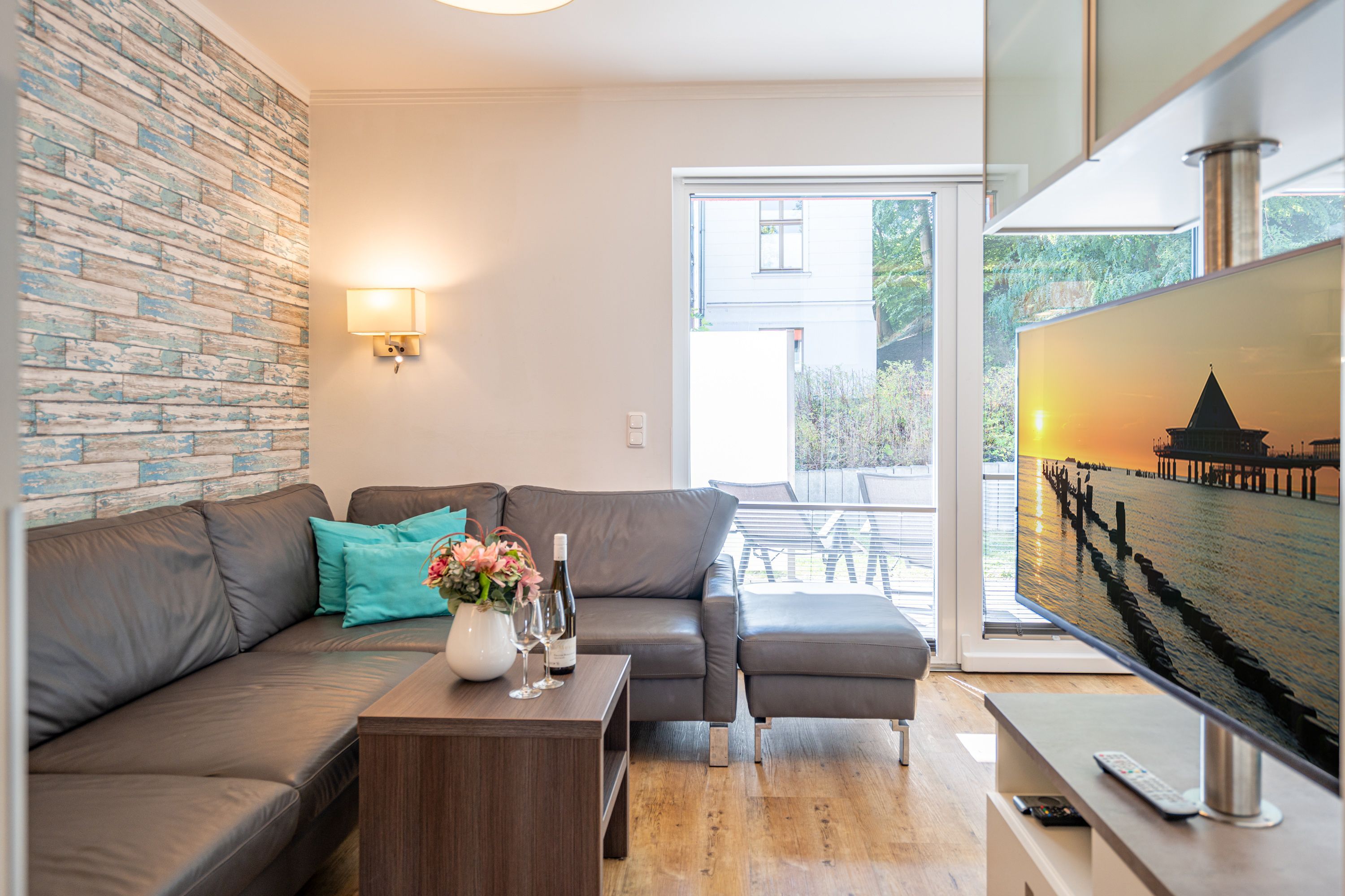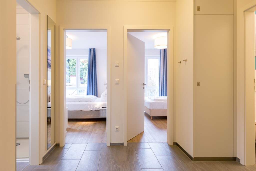 Freuen sie sich auf einen schönen Urlaub in dieser neuen 3-Raum-Ferienwohnung ( 64 qm) im Erdgeschoss der Villa Limora. Helle Farben, modernes Design und Interior wurden kombiniert mit perfekten Einbauten und schaffen so den idealen Urlaubsrahmen für 4 Personen und ein Kleinkind bis 3 Jahre (im Babyreisebett).Der helle Wohnbereich mit großer Ledercouch und Flat-TV schließt sich an die offene, komplett ausgestattete Küche (Cerankochfeld, Geschirrspüler, Mikrowellenkombigerät) mit schönem Essplatz an. Von hier hat man auch Zugang zur großzügigen Südterrasse, die mit Gartenmöbeln ausgestattet ist. Zwei Schlafzimmer mit Doppelbetten (1x 1,80m x2,00m und 1x 1,60m x 2,00m) und jeweils separatem Flat-TV sorgen für erholsamen Schlaf. Die Wohnung wird ergänzt durch ein modernes Duschbad mit ebenerdiger Glasdusche und ein kleines Gäste-WC. In der Tiefgarage (Stellplatz 2) steht ein Pkw-Stellplatz zur Verfügung. Das WLAN-Netz in der Wohnung kann kostenfrei genutzt werden.