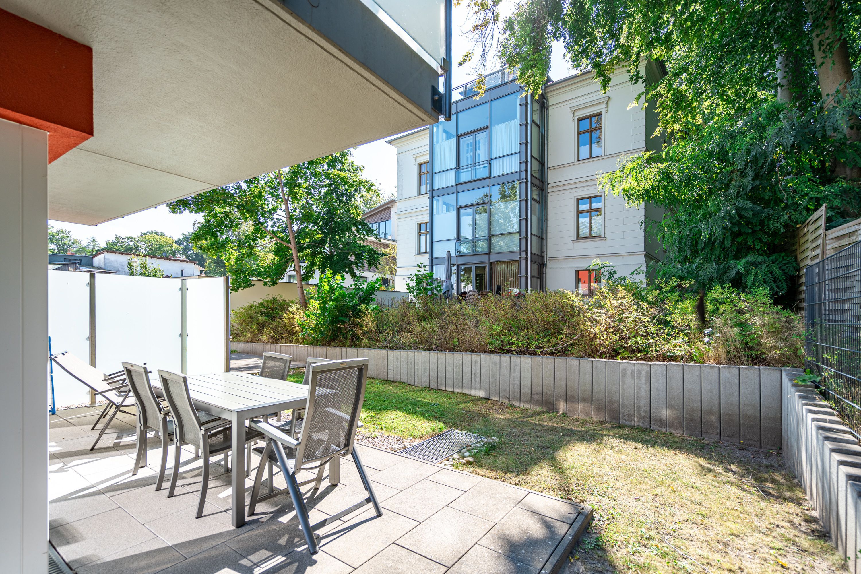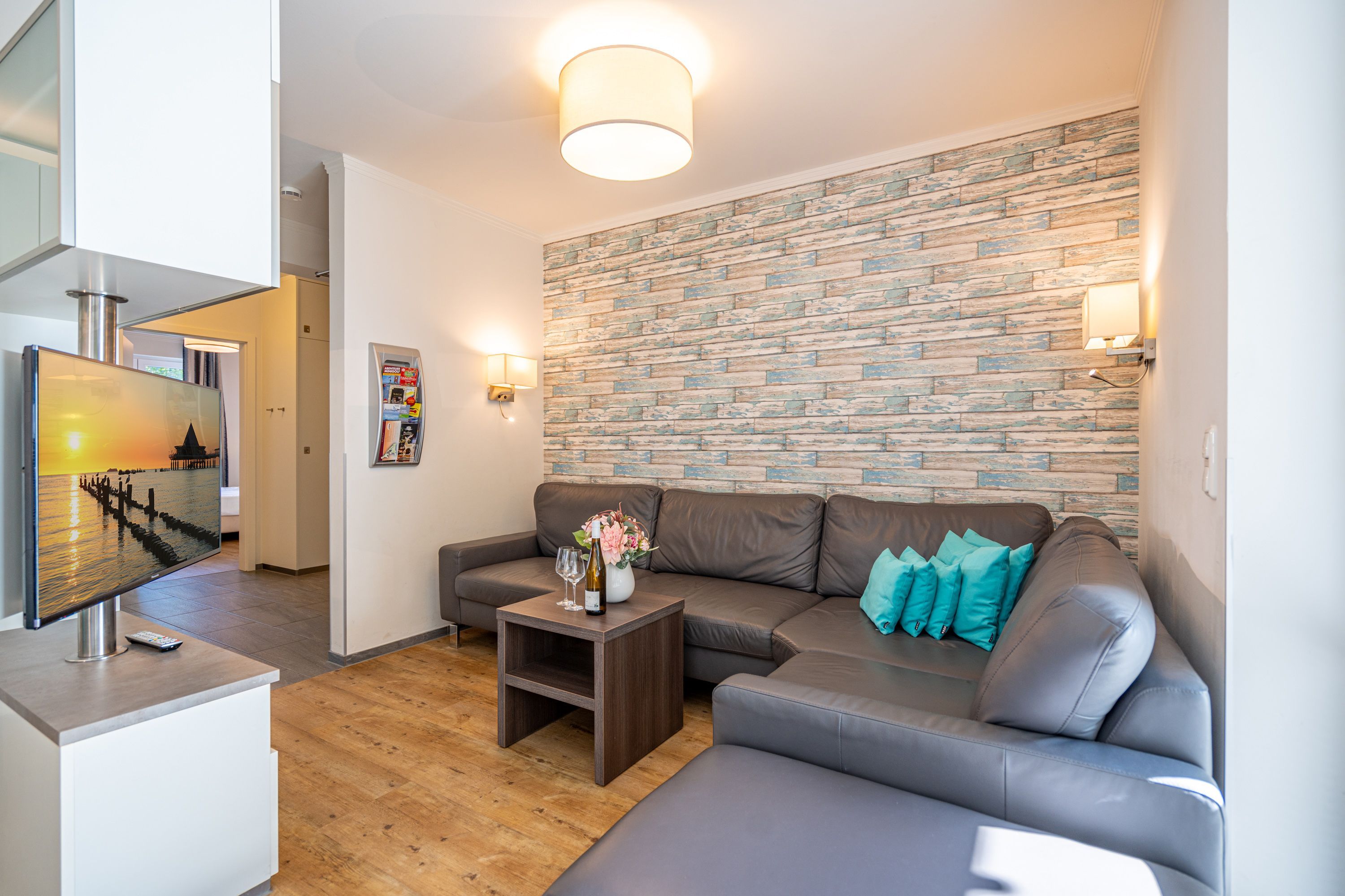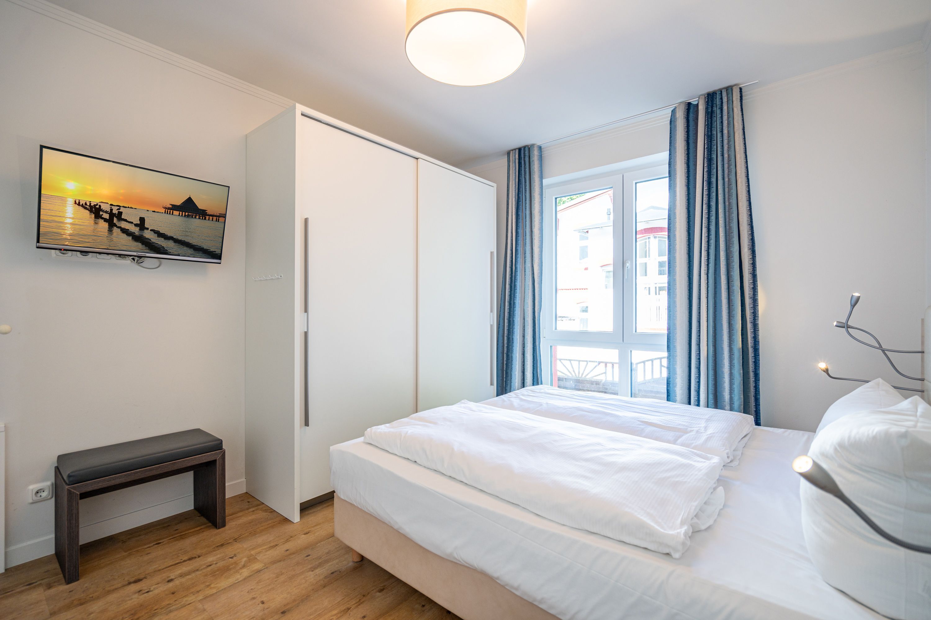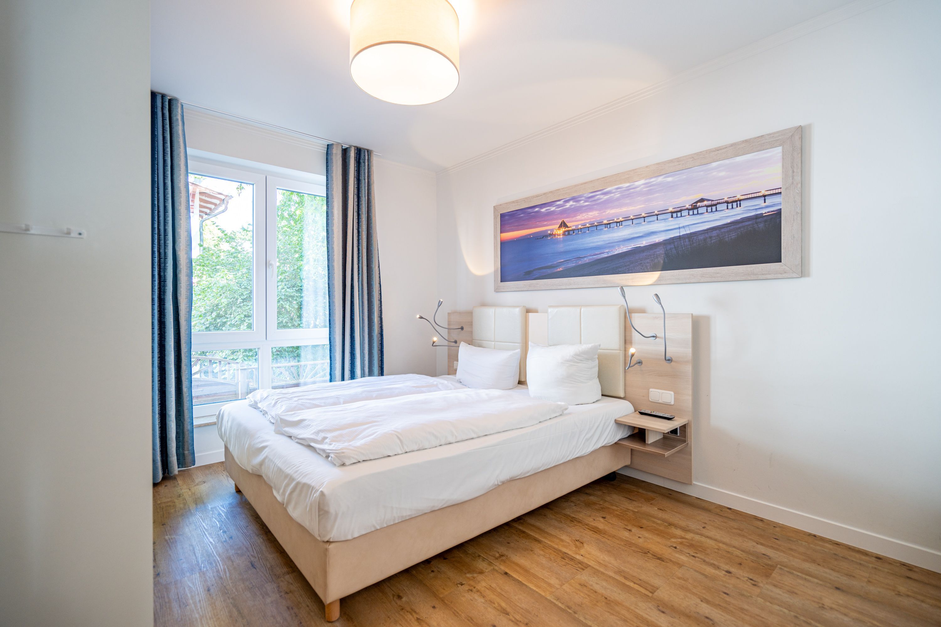 Freuen sie sich auf einen schönen Urlaub in dieser neuen 3-Raum-Ferienwohnung ( 64 qm) im Erdgeschoss der Villa Limora. Helle Farben, modernes Design und Interior wurden kombiniert mit perfekten Einbauten und schaffen so den idealen Urlaubsrahmen für 4 Personen und ein Kleinkind bis 3 Jahre (im Babyreisebett).Der helle Wohnbereich mit großer Ledercouch und Flat-TV schließt sich an die offene, komplett ausgestattete Küche (Cerankochfeld, Geschirrspüler, Mikrowellenkombigerät) mit schönem Essplatz an. Von hier hat man auch Zugang zur großzügigen Südterrasse, die mit Gartenmöbeln ausgestattet ist. Zwei Schlafzimmer mit Doppelbetten (1x 1,80m x2,00m und 1x 1,60m x 2,00m) und jeweils separatem Flat-TV sorgen für erholsamen Schlaf. Die Wohnung wird ergänzt durch ein modernes Duschbad mit ebenerdiger Glasdusche und ein kleines Gäste-WC. In der Tiefgarage (Stellplatz 2) steht ein Pkw-Stellplatz zur Verfügung. Das WLAN-Netz in der Wohnung kann kostenfrei genutzt werden.