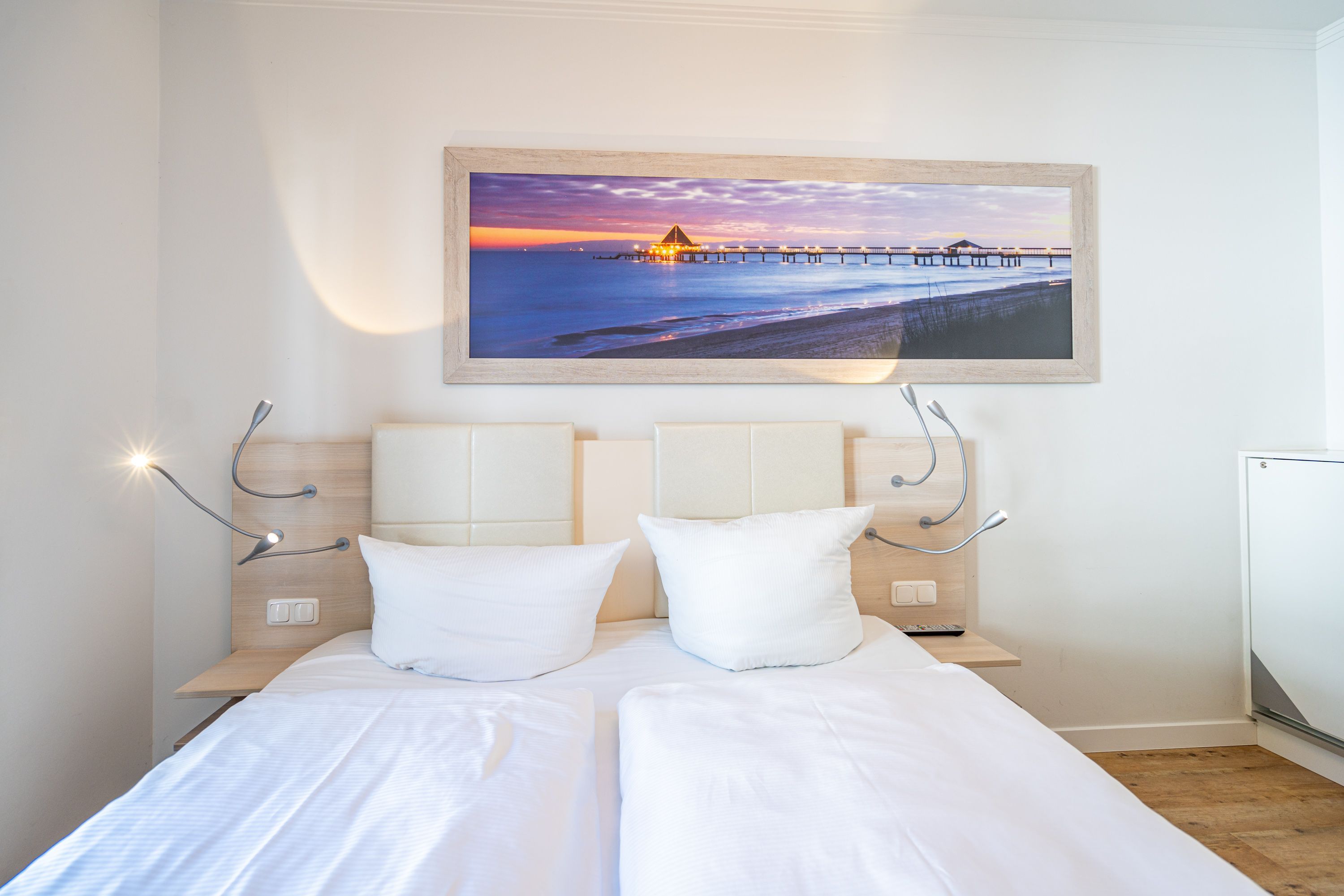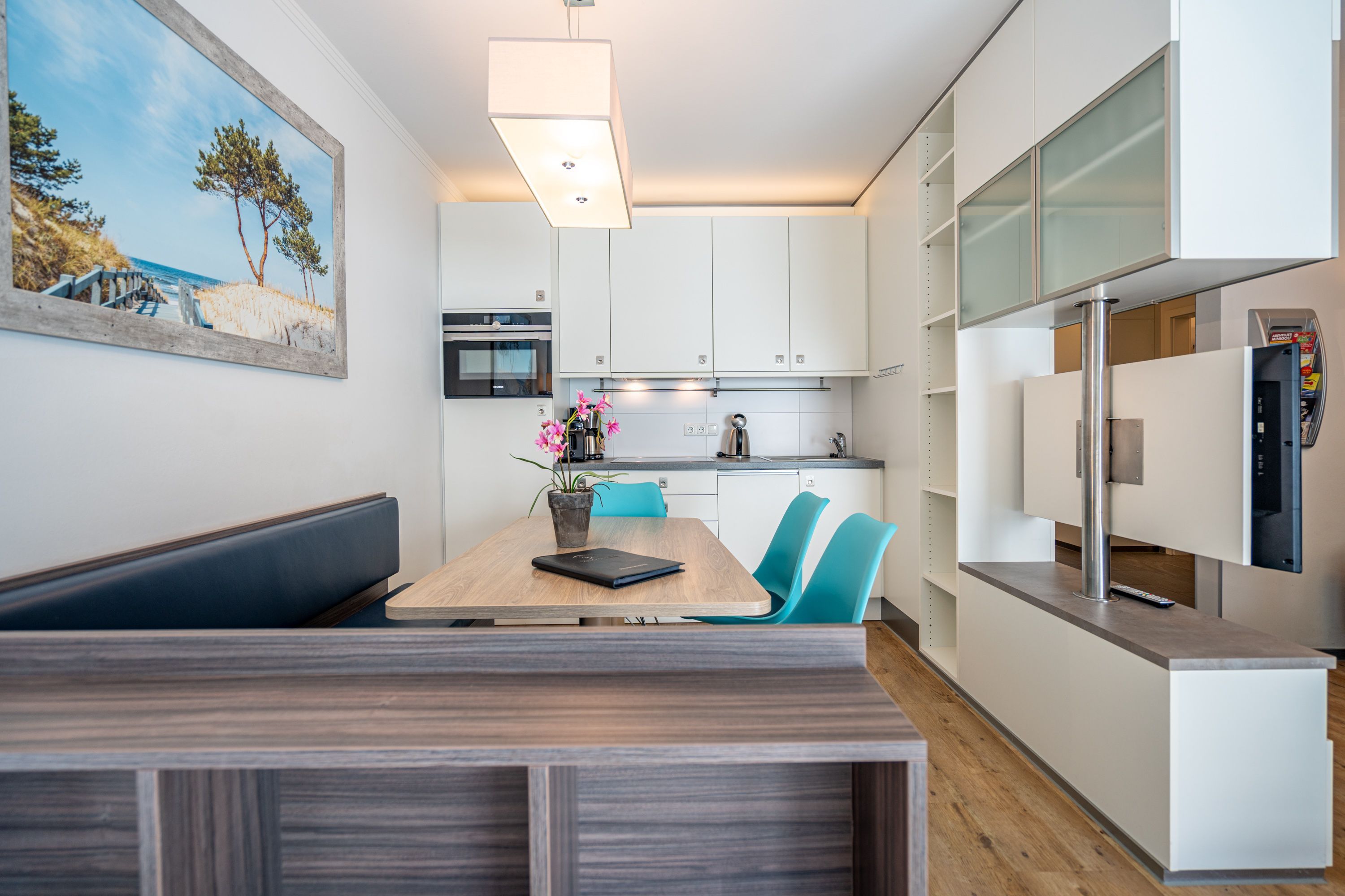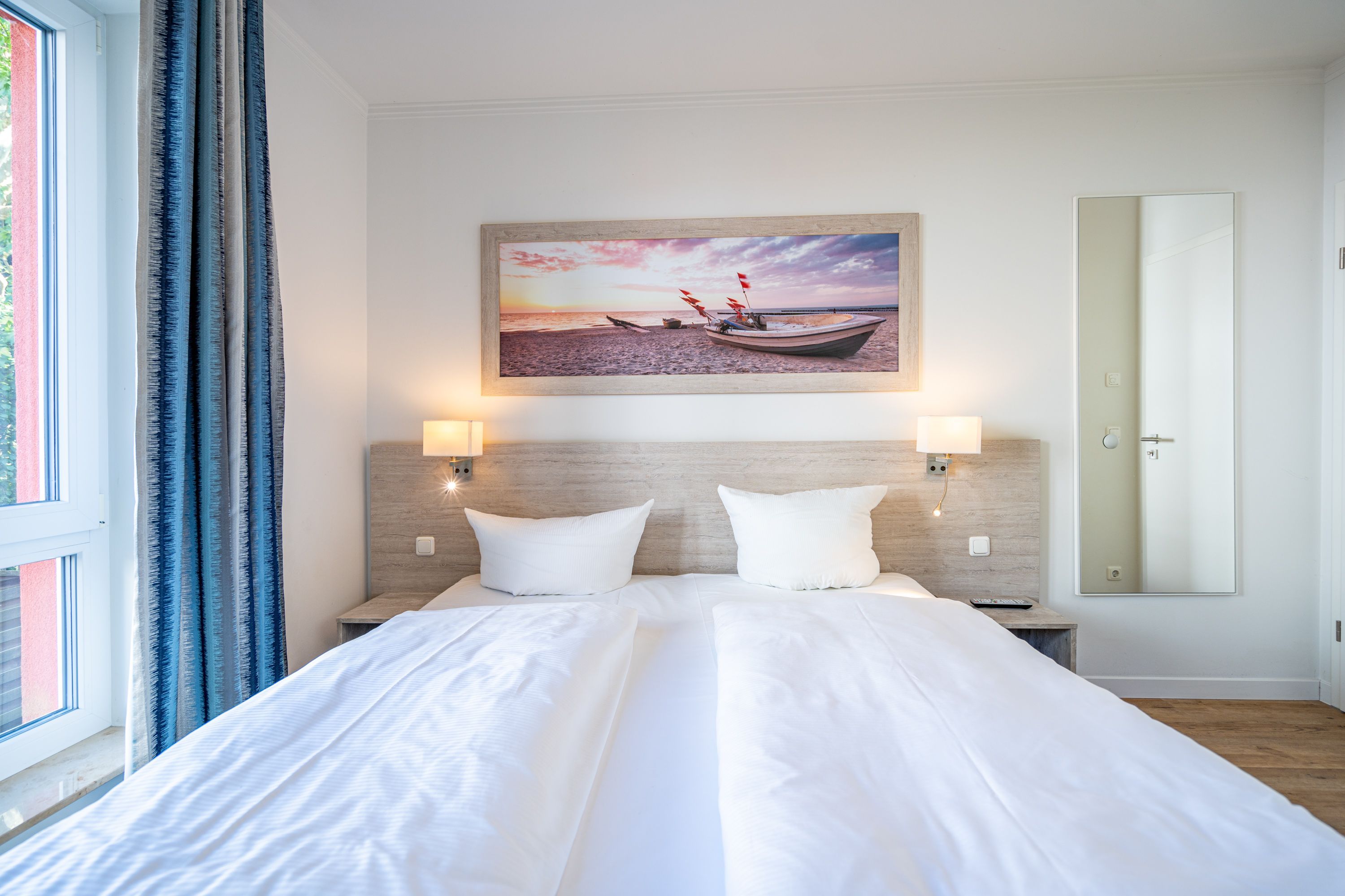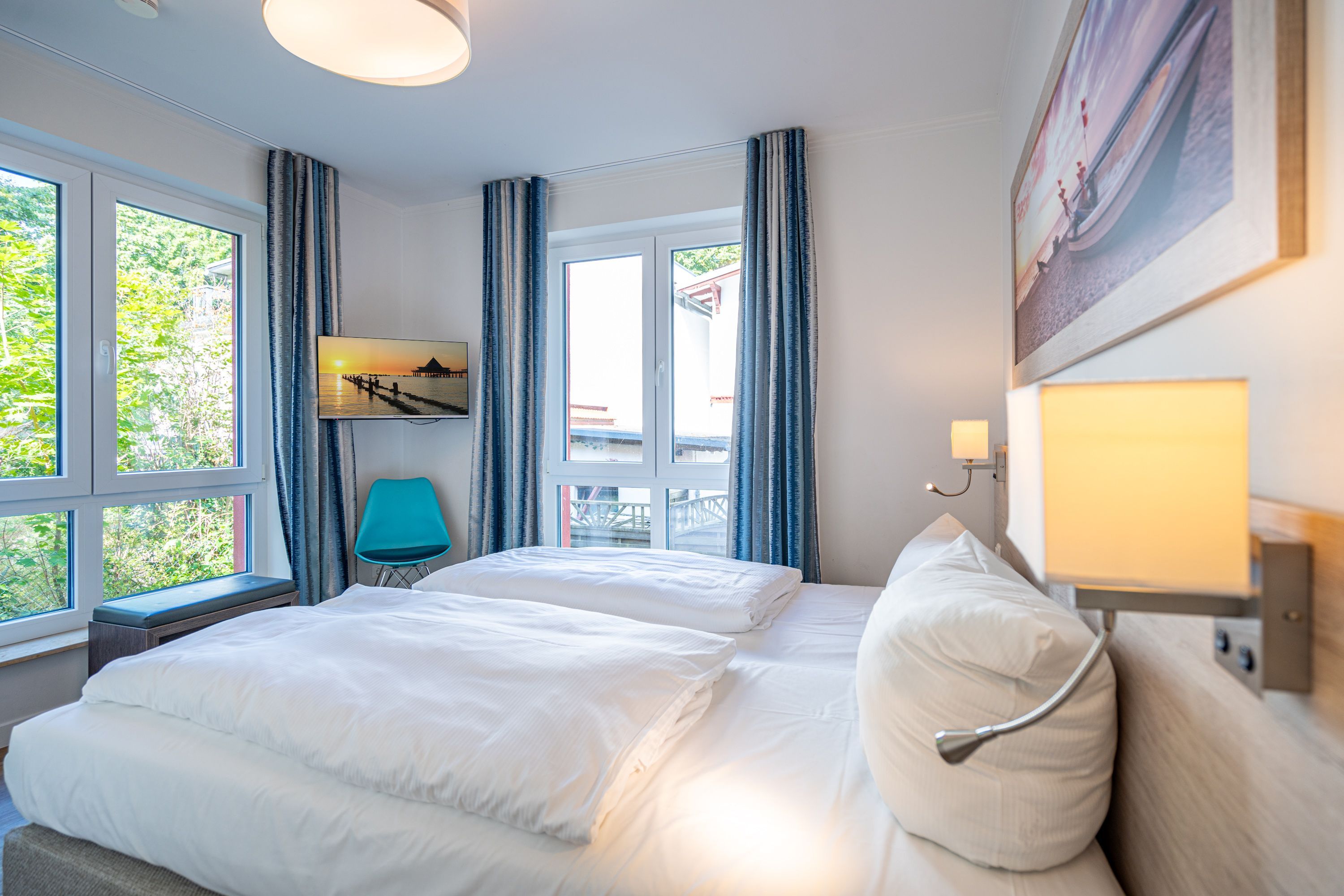 Freuen sie sich auf einen schönen Urlaub in dieser neuen 3-Raum-Ferienwohnung ( 64 qm) im Erdgeschoss der Villa Limora. Helle Farben, modernes Design und Interior wurden kombiniert mit perfekten Einbauten und schaffen so den idealen Urlaubsrahmen für 4 Personen und ein Kleinkind bis 3 Jahre (im Babyreisebett).Der helle Wohnbereich mit großer Ledercouch und Flat-TV schließt sich an die offene, komplett ausgestattete Küche (Cerankochfeld, Geschirrspüler, Mikrowellenkombigerät) mit schönem Essplatz an. Von hier hat man auch Zugang zur großzügigen Südterrasse, die mit Gartenmöbeln ausgestattet ist. Zwei Schlafzimmer mit Doppelbetten (1x 1,80m x2,00m und 1x 1,60m x 2,00m) und jeweils separatem Flat-TV sorgen für erholsamen Schlaf. Die Wohnung wird ergänzt durch ein modernes Duschbad mit ebenerdiger Glasdusche und ein kleines Gäste-WC. In der Tiefgarage (Stellplatz 2) steht ein Pkw-Stellplatz zur Verfügung. Das WLAN-Netz in der Wohnung kann kostenfrei genutzt werden.