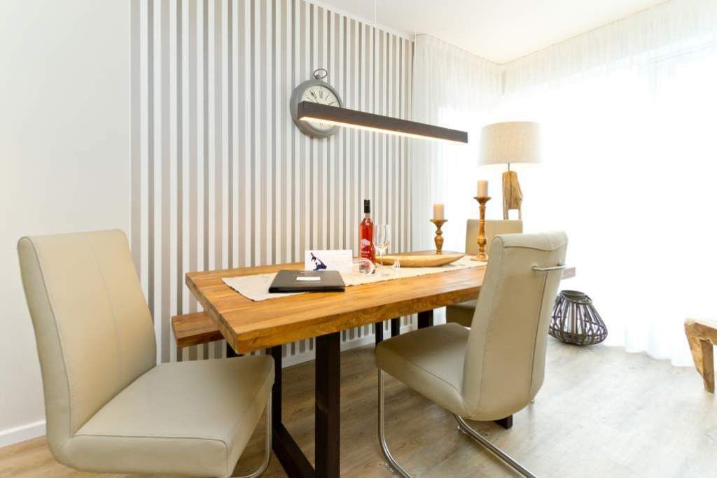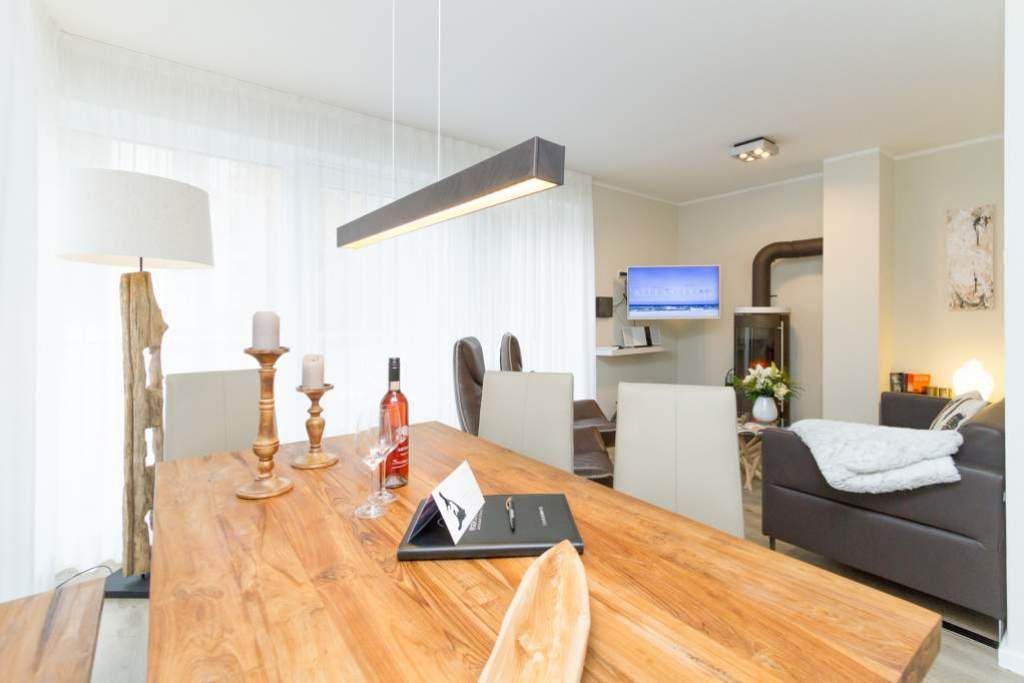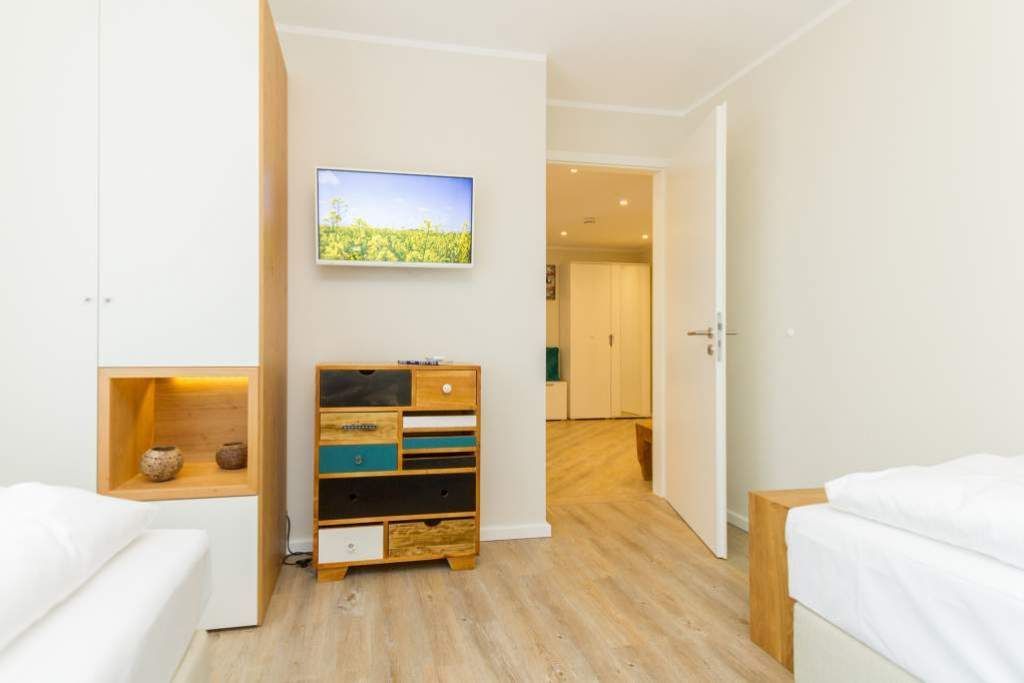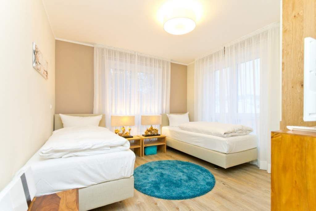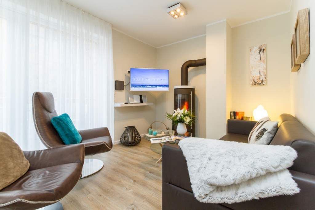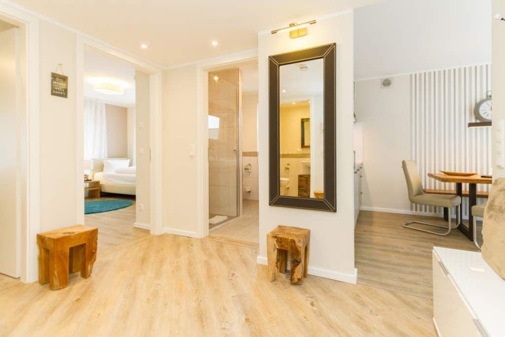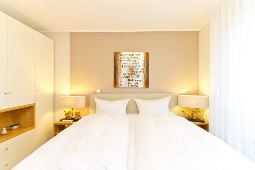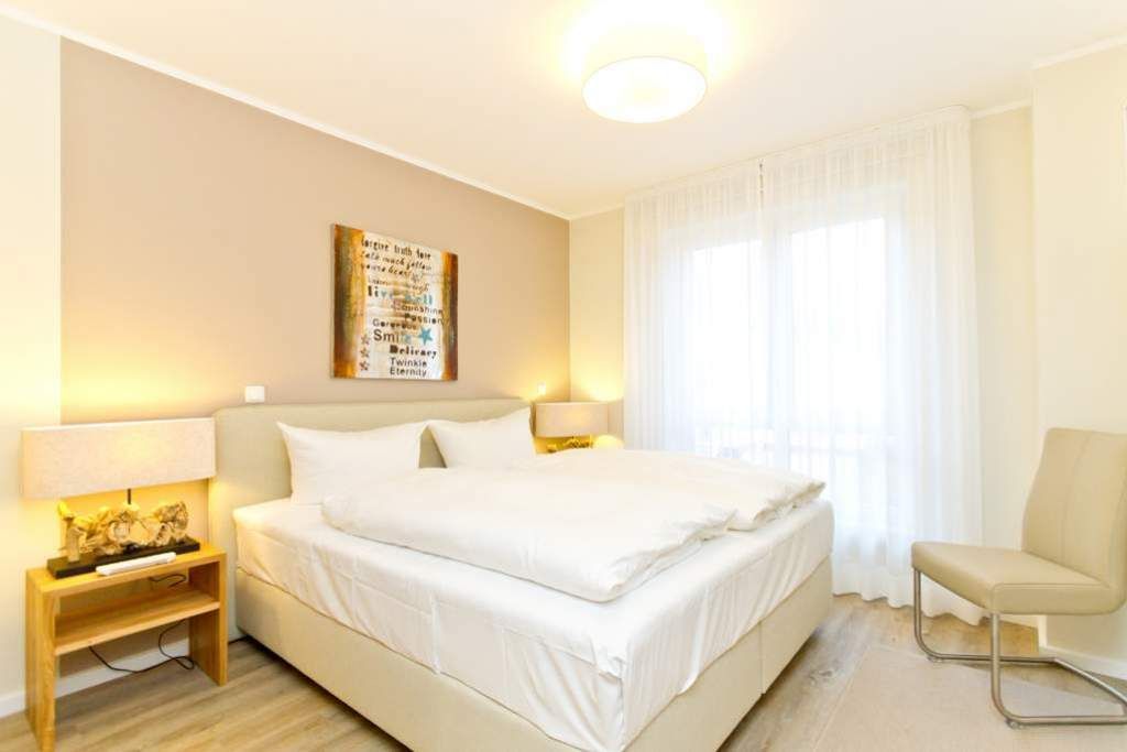 Im ersten Obergeschoss der neuen Villa Limora erwartet Sie eine wunderschön gestaltete 3-Raum-Ferienwohnung (65 qm) für bis zu 4 Personen (inkl. Kleinkind). Harmonisch abgestimmte Farben und Stoffe und hochwertige Möblierung gepaart mit stilvollen Details lassen hier die Arbeit der Innenarchitektin erkennen. Der Wohnbereich mit bequemer Sitzgruppe, Flat-TV und Kaminofen schließt sich an die komplett ausgestattete Küchenzeile mit Essplatz an. Zwei Schlafzimmer mit Boxspringbetten (1.SZ: Doppelbett 1,80x 2,00m/ 2. SZ: zwei Einzelbetten je 0,9x2,00m, hier passt auch ein Babyreisebett) und jeweils Flat-TV sorgen für erholsame Nächte. Das schöne Bad mit Glasdusche und WC wird durch ein zusätzliches Gäste-WC ergänzt. Auch der schöne, großzügige Süd- Balkon mit Gartenmöbel lädt zum Relaxen ein. In der Tiefgarage (Stellplatz 3) steht ein Pkw-Stellplatz zur Verfügung. Das WLAN- Netz in der Wohnung ist kostenfrei nutzbar.